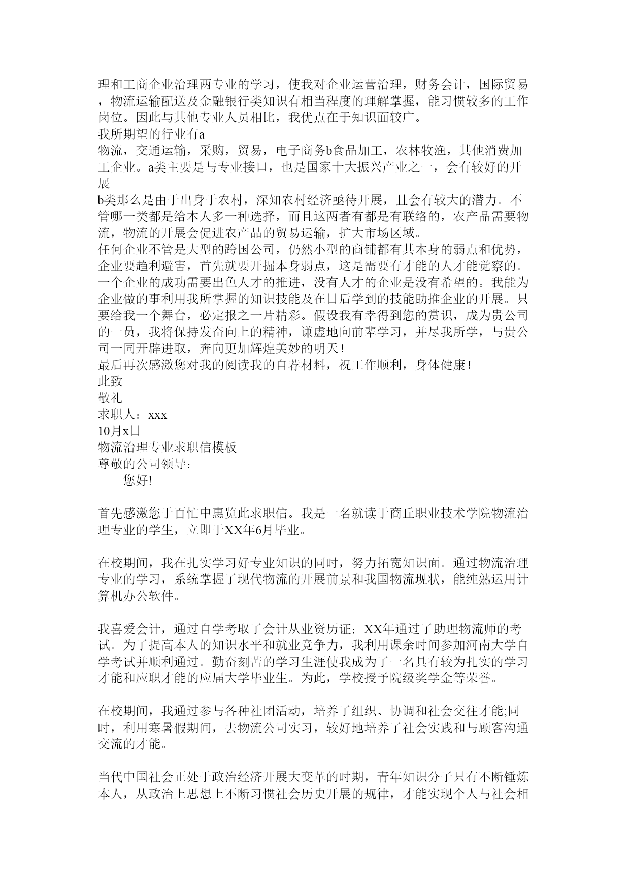 2019物流治理专业求职信3篇尊敬的领导:您好!我陕西工业职业技术学院物流治理专业的一名应届毕业生。近期获知贵公司正在招聘人才,我自信能胜任这一职位,因此专门写了这封信。感激您能在百忙中翻阅我的求职信。通过三年物流专业的学习。我纯熟掌握与现代物流相关的知识。并于国家物流师职业资历证书。三年的大学校园和社会实践生活使我不断地挑战自我、开辟创新,为实现本身价值打下了坚实的根底。在校期间得到了教师和同学们的一致确信。作为一名物流治理专业应届毕业生,我期望从一线职位做起,把所学到的专业知识,与实际工作情况相结合,快速积累最根底的工作经历。本人在校成绩最好的是物流市场营销,这是由于本人的爱好所决定的,物流治理与市场营销都是我最喜爱的专业,因此我期望从事二者的结合体----物流市场营销。在大学期间,我参加过屡次社会实践活动,并曾在西安咸阳国际机场湛蓝书店做过兼职工作。正由于此,使我积累了丰富的实践经历,而且更加注重团队合作精神和集体观念,更加明确了我的人生目的。我深信,生活需要本人来勾画,不一样的方式就有不一样的人生。今后的事业更要靠本人去探究和拼搏。请您相信我对工作认真负责的态度,假设能得到您的欣赏,我将会用实际行动来报答您的信任。感激。我特别期望能进入贵公司,并为公司的开展奉献本人的一份力量。祝您工作顺利。身体健康。此致敬礼!求职者:惠绒物流治理专业毕业生求职信尊敬的企业领导:您好!首先感激您的启阅,让我有时机向您呈上我的个人材料.我是xx财经职业学院经济治理系物流治理专业届毕业生.与众多莘莘学子一样,毕业在即,收获在望,等待社会的检验,期待您的选择.我出生于农村,就读于城市,因此中国农民淳朴宽厚的传统美德与城市人的坚强自信的个性在我身上得到完满结合,这也让我具有良好的社会习惯才能.大学三年的磨练更使我阅历大增,综合才能加强,个人素养得到质的飞跃.宝剑锋从磨砺出,梅花香自苦寒来,回首往事,寒窗苦读十几载,吾劈风斩浪于浩瀚学海,上下求索于知识之山.追求学业之精深,追求理想抱负的实现,追求个人价值的表达.学习生涯里,我力求在德智体各方面全面开展.辛勤的汗水让我浇灌出丰富的成果.大学三里,我每年的专业成绩都十分优良,并获得三等奖学金.不仅如此,还屡次被评”学院优秀干部’’,个人的文学作品也屡次在学院的各种大赛中获奖.同时在求知之余我不忘对本人人品的塑造,老实守信,团结有善是我一贯的作风,积极进取,努力刻苦是我独特的个性.为陪养本人的综合素养,我积极参加校内外各种有意义的活动;除了专业课,我还在课余选修了其它课程,包括文学,心理学,会计学,治理学等,借以拓宽本人的知识面.平时不管是学习仍然生活,我都努力苛求本人,我也会把这种性格带到工作当中,努力提高本人的工作才能,让本人随着企业的壮大而逐步成长.“十年磨一剑,霜刃未曾试’’,我真诚的希望成为贵单位的一员.我定会以饱满的热情和坚韧的性格努力勤奋工作,与同事精诚合作,为单位奉献积蓄多年的智慧和才能.恳请接纳,回函是盼,我恭候您的佳音!我相信本人才能,更相信您的正确选择!给我一个时机,我将还您一个奇观!此致敬礼物流治理专业毕业生公司求职信尊敬的贵公司领导:您好!首先感激您对我个人信息的阅览。我叫xxx,是xx学院物流治理专业xx年应届专科毕业生。我们学校的物流专业开设课程较多知识面广,除了主干课程物流运输与配送,物流信息治理,国际集装箱多式联运,物流本钱治理,采购与供给治理,国际贸易理论与实务,物流治理数据库原理及应用,运筹学b等外,还开设了会计学根底,市场营销,治理学根底,经济法概论,电子商务等诸多相关的课程,使学生专业知识精,相关知识通培养综合型人才。我深知父母从小到大对我的抚养之不易,且疼爱有佳,虽家庭贫困,亦不断支持我上学。我在学校,学习刻苦,工作认真,获得了特别好的学习成绩,未辜负父母希望,教师栽培。多年的学习是我认识到,本人不仅要对本人的今后负责,更要对父母的期望负责。在大学我先后获得优秀新生入学奖学金,助学金,四次一般奖学金,一次国家励志奖学金,在特别大程度上减轻了家里的负担,同时获得优秀学生干部,优秀共青团员等荣誉。自大学伊始,我便担任班内学习委员职务,后任班长至今,积极主动为同学效劳,辅助教师工作,传达学校通知事项,与同学欢乐相处,共度大学美妙光阴。在大一和大二暑假期间我曾去广东的电子厂和玩具厂做暑期工,本人已通过英语四级和国家计算机二级考试,现正预备英语六级和计算机三级的考试,有望毕业前通过。我也拿到了助理物流师职业资历证,是由中国物流与采购结合会颁发的。关于办公软件甚是纯熟,能够较快的完成某些文件的设计打印。另外我参加了自学考试,工商企业治理专业独立本科,主要课程有财务治理学,金融理论与实务,企业运营战略,企