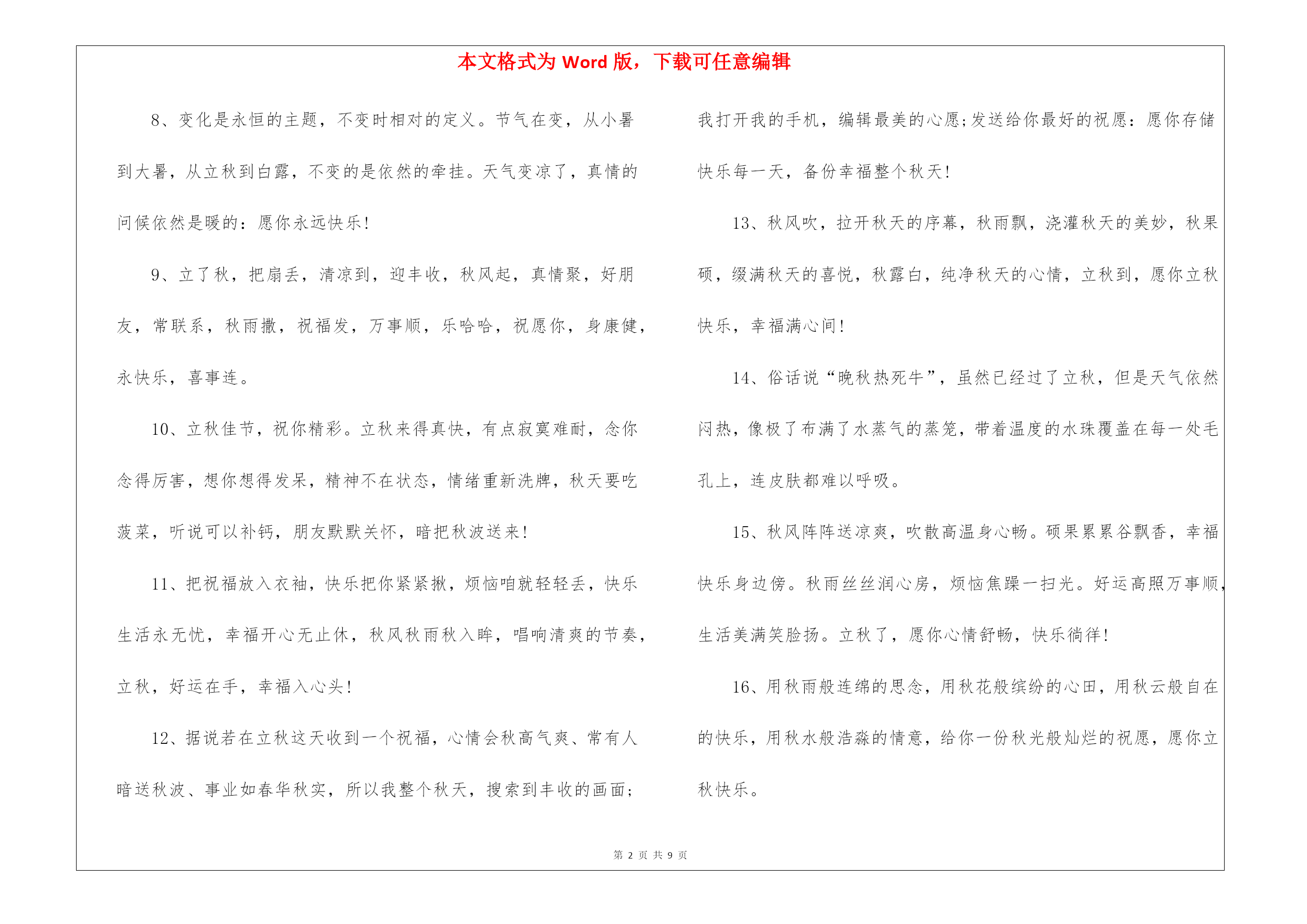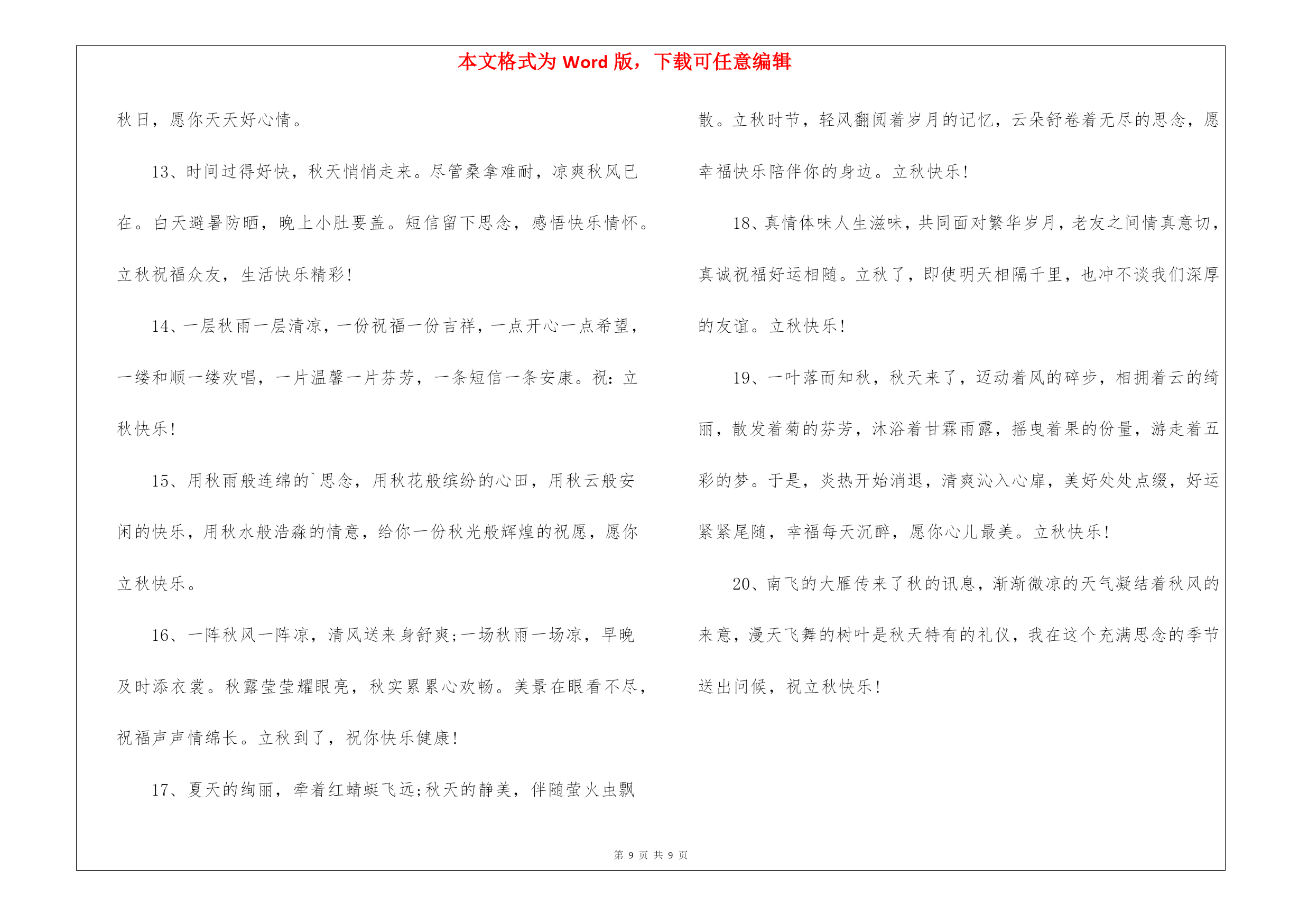 本文格式为Word版,下载可任意编辑第PAGE\*MERGEFORMAT9页共NUMPAGES\*MERGEFORMAT9页2021立秋文案短句最新80句对于立秋,是24节气中的第13个节气,也是秋季第一个节气,这一年的立秋马上就要到了,知道立秋文案写什么吗?下面是我给大家带来的2021立秋文案短句最新80句,以供大家参考,我们一起来看看吧!立秋文案短句最新1、秋风吹去了祝福,愿你健康相伴,秋雨浇灌了问候,愿你幸福围绕,秋天载满了心愿,愿你吉祥如意,立秋到了默默祈祷,愿你立秋快乐!2、立秋节气大搜索,寻寻觅觅找幸福。健康躲在身体中,吃好喝好休息好。平安藏在你身旁,左贴右靠日日伴。快乐就在你眼前,想见就见天天见。3、秋风起,缕缕清爽,秋蝉诉衷肠,梧桐叶落,秋韵荡漾,秋虫唱繁忙,枫叶红,菊花黄,秋雨润古巷,立秋节美赛春光,愿朋友事业灿烂辉煌,收获满仓。4、立秋了,我想提醒你:不管是忙是闲,都要爱惜身体,不管是胖是瘦,营养都是要加的。没有时间?我帮你;喜欢什么牌子的饲料?我买给你,千万别客气!5、立秋天渐凉,请您及时添衣裳,身体健康万事都会如意,生活才会幸福,爱情才会甜蜜,愿你立秋节气过得快乐,还有一句忘说了,遇到“秋老虎”千万不要忘了脱衣服,小心捂出热痱子。6、炎热夹着尾巴逃跑了,清凉拍着胸脯上岗了,烦恼带着无奈蒸发了,快乐顶着开心来到了,惆怅卷着铺盖开溜了,秋天伴着清爽到来了。愿你立秋惬意哦!7、秋阳的温柔洒满大地,轻抚万物;凉爽的秋风频频而至,扫去余热;秋雨的疯狂掠过高空,飞流直下;秋季的果实充满希望,风采洋溢;立秋到,心情爽,收获忙,收获真情,收获希望!8、变化是永恒的主题,不变时相对的定义。节气在变,从小暑到大暑,从立秋到白露,不变的是依然的牵挂。天气变凉了,真情的问候依然是暖的:愿你永远快乐!9、立了秋,把扇丢,清凉到,迎丰收,秋风起,真情聚,好朋友,常联系,秋雨撒,祝福发,万事顺,乐哈哈,祝愿你,身康健,永快乐,喜事连。10、立秋佳节,祝你精彩。立秋来得真快,有点寂寞难耐,念你念得厉害,想你想得发呆,精神不在状态,情绪重新洗牌,秋天要吃菠菜,听说可以补钙,朋友默默关怀,暗把秋波送来!11、把祝福放入衣袖,快乐把你紧紧揪,烦恼咱就轻轻丢,快乐生活永无忧,幸福开心无止休,秋风秋雨秋入眸,唱响清爽的节奏,立秋,好运在手,幸福入心头!12、据说若在立秋这天收到一个祝福,心情会秋高气爽、常有人暗送秋波、事业如春华秋实,所以我整个秋天,搜索到丰收的画面;我打开我的手机,编辑最美的心愿;发送给你最好的祝愿:愿你存储快乐每一天,备份幸福整个秋天!13、秋风吹,拉开秋天的序幕,秋雨飘,浇灌秋天的美妙,秋果硕,缀满秋天的喜悦,秋露白,纯净秋天的心情,立秋到,愿你立秋快乐,幸福满心间!14、俗话说“晚秋热死牛”,虽然已经过了立秋,但是天气依然闷热,像极了布满了水蒸气的蒸笼,带着温度的水珠覆盖在每一处毛孔上,连皮肤都难以呼吸。15、秋风阵阵送凉爽,吹散高温身心畅。硕果累累谷飘香,幸福快乐身边傍。秋雨丝丝润心房,烦恼焦躁一扫光。好运高照万事顺,生活美满笑脸扬。立秋了,愿你心情舒畅,快乐徜徉!16、用秋雨般连绵的思念,用秋花般缤纷的心田,用秋云般自在的快乐,用秋水般浩淼的情意,给你一份秋光般灿烂的祝愿,愿你立秋快乐。17、一份立秋的祝福,传于你我之间,带着未退的热情,吸引四方视线,无论移动的电波,还是联通电信,只知道不管间隔多远,我们彼此心相连。立秋快乐!18、炎热慢慢远行,清凉缓缓而来,天空渐渐变蓝,心情慢慢变好,祝福我的哥们:朋友越来越多,烦恼越来越少,挣钱越来越多,啤酒肚越来越小!立秋快乐!19、虽然说当今社会以瘦为美,可你也瘦得太骨感了吧,我看到你瘦弱的身材我心里难受啊,今天立秋了,你也多吃点补品贴贴秋膘,等你肥了,我好吃你,螃蟹!20、立秋到,暑气消,丝丝凉意渐涨高;问候传,祝福送,贴心关怀摆上前;莫贪凉,莫急躁,心平气和健康伴;朋友情,记心间,闲暇之余多联系。立秋快乐!21、秋风秋雨秋老虎,终日奔波真辛苦;天气变化要记住,莫丢健康然后补;要有不快向我诉,我用祝福伴你度;祝你立秋快乐!22、抗暑革命即将胜利,清凉秋季即将开启;早晚凉袭注意添衣,温水洗脚比较适宜;合理膳食牢记心里,晚饭前后锻炼身体;联络情谊发条信息,幸福吉祥愿你如意。23、春分我是你的鲜花,献你芬芳;夏至我是你的风扇,送你清凉;立秋我是你的月饼,祝你团圆;严冬我是你的围巾,许你温暖。而朋友你,是我四季的牵挂!24、秋风秋雨如约来,令人不禁喜开怀。炎炎夏日被赶走,身心舒畅笑颜开。烦恼焦躁瞬间逝,万事顺利好运来。立秋美景看不够,硕果累累丰收节。祝立秋快乐!25、立秋到了,秋天携着清凉的秋风,带着绵绵的秋雨翩翩而来;秋天穿着黄色的衣裙,带着丰收的祝福翩翩而来
