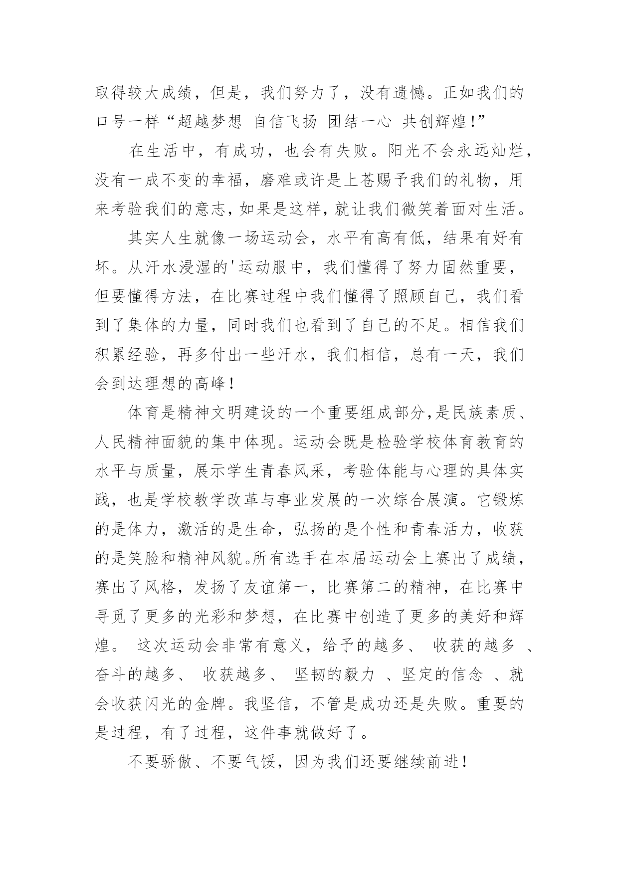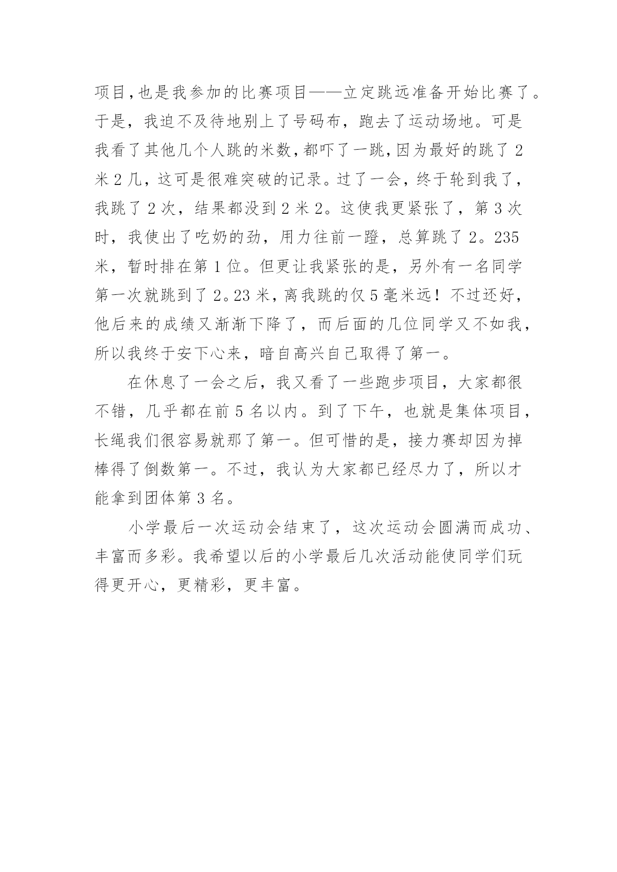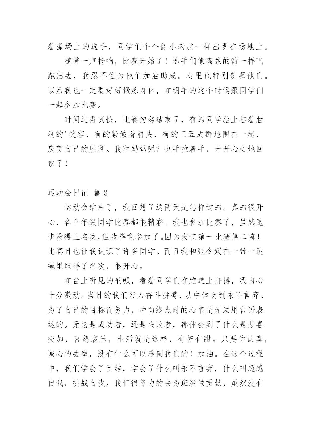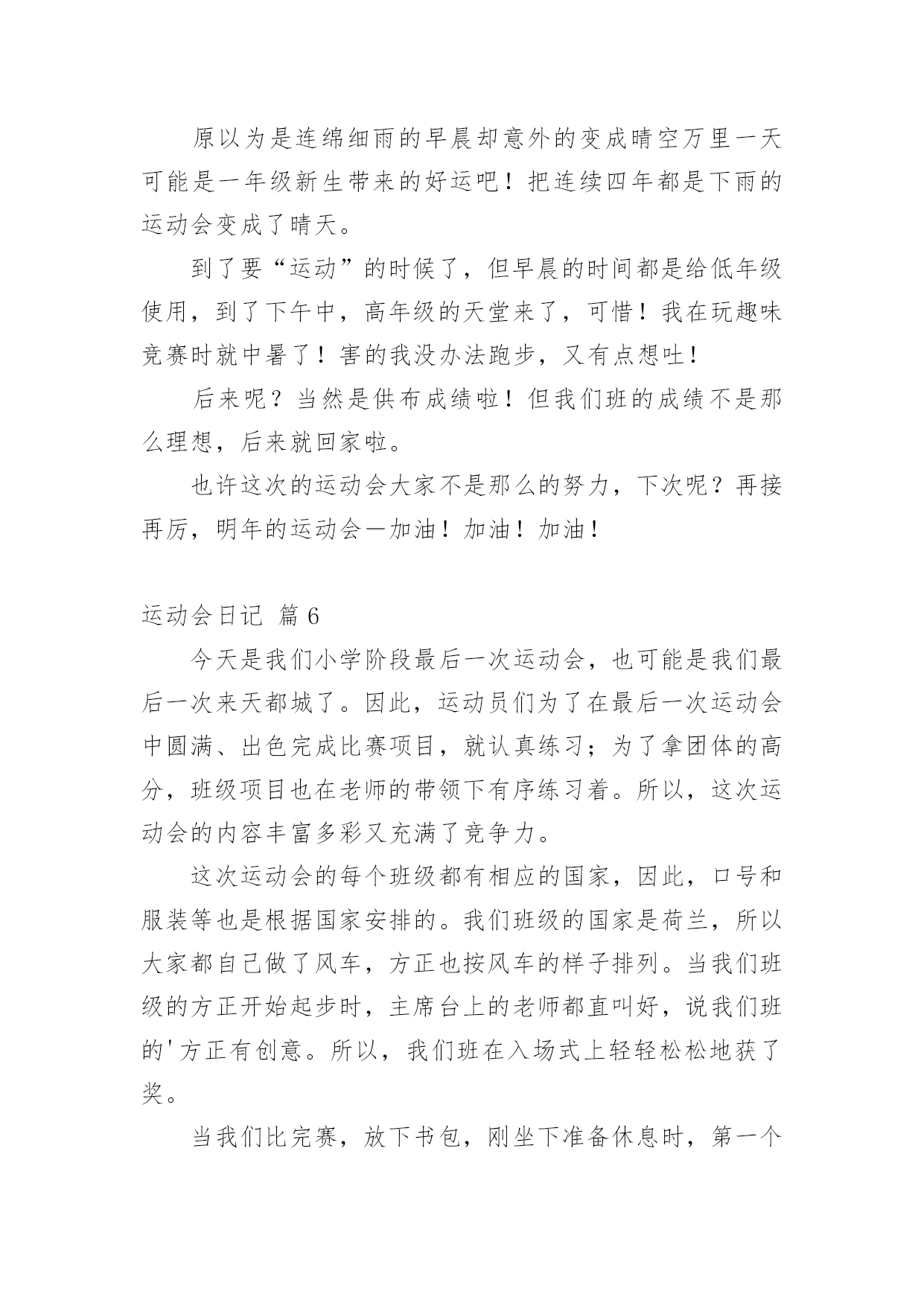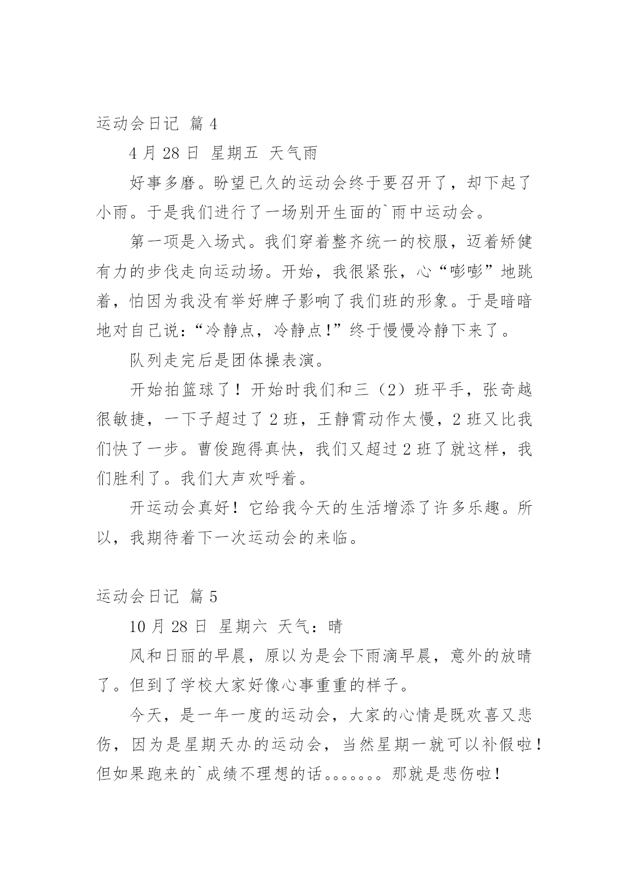 运动会日记精选运动会日记汇总六篇时间过得真快,一天又将结束了,相信你有很多感悟吧,这也意味着,又要开始写日记了。你所见过的日记应该是什么样的?以下是小编为大家收集的运动会日记6篇,欢迎阅读,希望大家能够喜欢。运动会日记篇1秋天来了,秋高气爽。小动物们开始了热火朝天的运动会。主持人大熊猫兴高采烈的宣布动物园运动会现在开始。小动物们各个摩拳擦掌,非常激动。大象参加了举重比赛;袋鼠参加了跳远比赛;小老虎和小熊参加了拔河比赛;小鸭子参加了游泳比赛;小兔子子和小乌龟参加了跑步比赛。小乌龟获得了优秀运动员称号,可气的'小兔子子又睡着了。哈哈!瞧!动物园运动会多热闹呀!运动会日记篇2今天天气真好,太阳公公好象也知道我们华舍实验学校要举行运动会,赶着来凑热闹了。紧张的比赛马上要开始了!我的眼睛一眨也不眨地盯着操场上的选手,同学们个个像小老虎一样出现在场地上。随着一声枪响,比赛开始了!选手们像离弦的箭一样飞跑出去,我忍不住为他们加油助威。心里也特别羡慕他们。以后我也一定要好好锻炼身体,在明年的这个时候跟同学们一起参加比赛。时间过得真快,比赛匆匆结束了,有的同学脸上挂着胜利的'笑容,有的紧皱着眉头,有的三五成群地围在一起,庆贺自己的胜利。我和妈妈呢?也手拉着手,开开心心地回家了!运动会日记篇3运动会结束了,我回想了这两天是怎样过的。真的很开心,各个年级同学比赛都很精彩。我也参加比赛了,虽然跑步没得上名次,但我毕竟参加了。因为友谊第一比赛第二嘛!比赛时也让我认识了许多同学。而且我和张令媛在一带一跳绳里取得了名次,很开心。在台上听见的呐喊,看着同学们在跑道上拼搏,我内心十分激动。当时的我们努力奋斗拼搏,从中体会到永不言弃。为了自己的目标而努力,冲向终点时的心情是无法用言语表达的。无论是成功者,还是失败者,都体会到了什么是悲喜交加,喜怒哀乐,生活就是这样,有苦有甜。只要你认真,诚心的去做,没有什么可以难倒我们的!加油。在这个过程中,我们学会了团结,学会了什么叫永不言弃,什么叫超越自我,挑战自我。我们很努力的去为班级做贡献,虽然没有取得较大成绩,但是,我们努力了,没有遗憾。正如我们的口号一样“超越梦想自信飞扬团结一心共创辉煌!”在生活中,有成功,也会有失败。阳光不会永远灿烂,没有一成不变的幸福,磨难或许是上苍赐予我们的礼物,用来考验我们的意志,如果是这样,就让我们微笑着面对生活。其实人生就像一场运动会,水平有高有低,结果有好有坏。从汗水浸湿的'运动服中,我们懂得了努力固然重要,但要懂得方法,在比赛过程中我们懂得了照顾自己,我们看到了集体的力量,同时我们也看到了自己的不足。相信我们积累经验,再多付出一些汗水,我们相信,总有一天,我们会到达理想的高峰!体育是精神文明建设的一个重要组成部分,是民族素质、人民精神面貌的集中体现。运动会既是检验学校体育教育的水平与质量,展示学生青春风采,考验体能与心理的具体实践,也是学校教学改革与事业发展的一次综合展演。它锻炼的是体力,激活的是生命,弘扬的是个性和青春活力,收获的是笑脸和精神风貌。所有选手在本届运动会上赛出了成绩,赛出了风格,发扬了友谊第一,比赛第二的精神,在比赛中寻觅了更多的光彩和梦想,在比赛中创造了更多的美好和辉煌。这次运动会非常有意义,给予的越多、收获的越多、奋斗的越多、收获越多、坚韧的毅力、坚定的信念、就会收获闪光的金牌。我坚信,不管是成功还是失败。重要的是过程,有了过程,这件事就做好了。不要骄傲、不要气馁,因为我们还要继续前进!运动会日记篇44月28日星期五天气雨好事多磨。盼望已久的运动会终于要召开了,却下起了小雨。于是我们进行了一场别开生面的`雨中运动会。第一项是入场式。我们穿着整齐统一的校服,迈着矫健有力的步伐走向运动场。开始,我很紧张,心“嘭嘭”地跳着,怕因为我没有举好牌子影响了我们班的形象。于是暗暗地对自己说:“冷静点,冷静点!”终于慢慢冷静下来了。队列走完后是团体操表演。开始拍篮球了!开始时我们和三(2)班平手,张奇越很敏捷,一下子超过了2班,王静霄动作太慢,2班又比我们快了一步。曹俊跑得真快,我们又超过2班了就这样,我们胜利了。我们大声欢呼着。开运动会真好!它给我今天的生活增添了许多乐趣。所以,我期待着下一次运动会的来临。运动会日记篇510月28日星期六天气:晴风和日丽的早晨,原以为是会下雨滴早晨,意外的放晴了。但到了学校大家好像心事重重的样子。今天,是一年一度的运动会,大家的心情是既欢喜又悲伤,因为是星期天办的运动会,当然星期一就可以补假啦!但如果跑来的`成绩不理想的话。。。。。。。那就是悲伤啦!原以为是连绵细雨的早晨却意外的变成晴空万里一天可能是一年级新生带来的好运吧!把连续四年都是下雨的运动会变成了晴天。到了要“运动”的时候了,但早晨的时间都是给低年级使用,到了下午中,高年级的天堂来