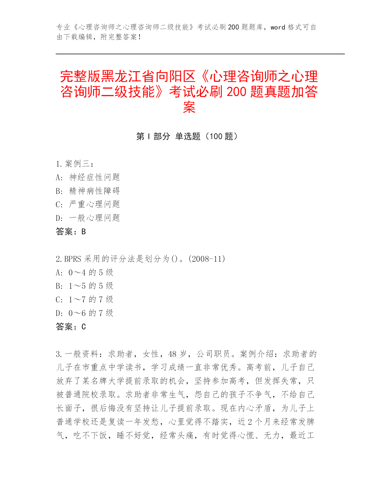 完整版黑龙江省向阳区《心理咨询师之心理咨询师二级技能》考试必刷200题真题加答案
