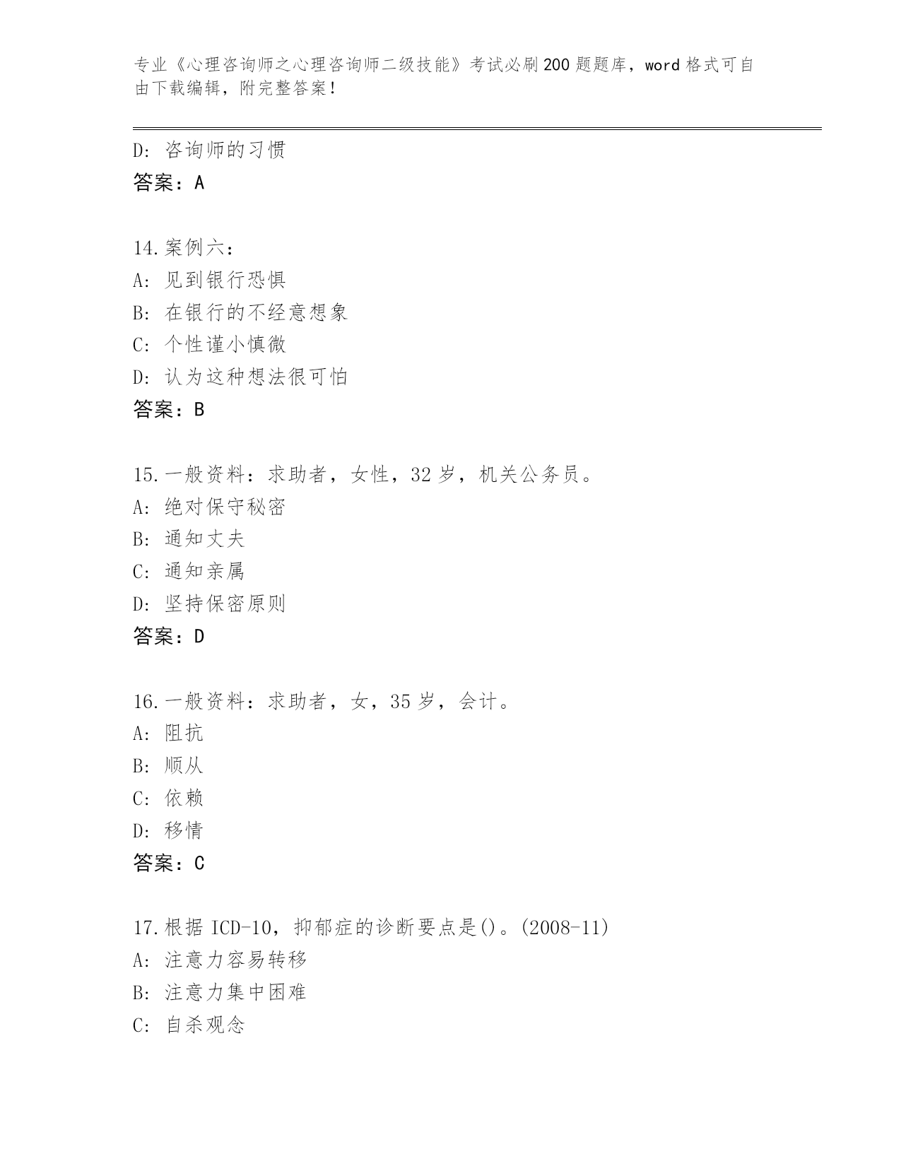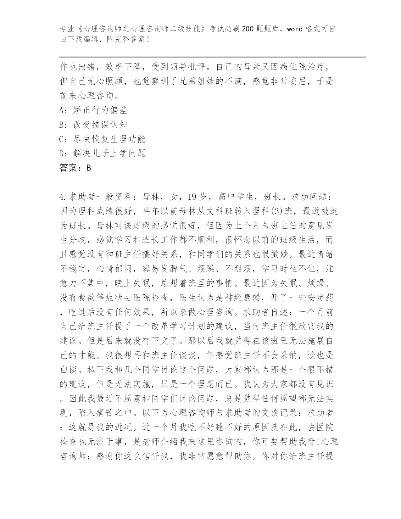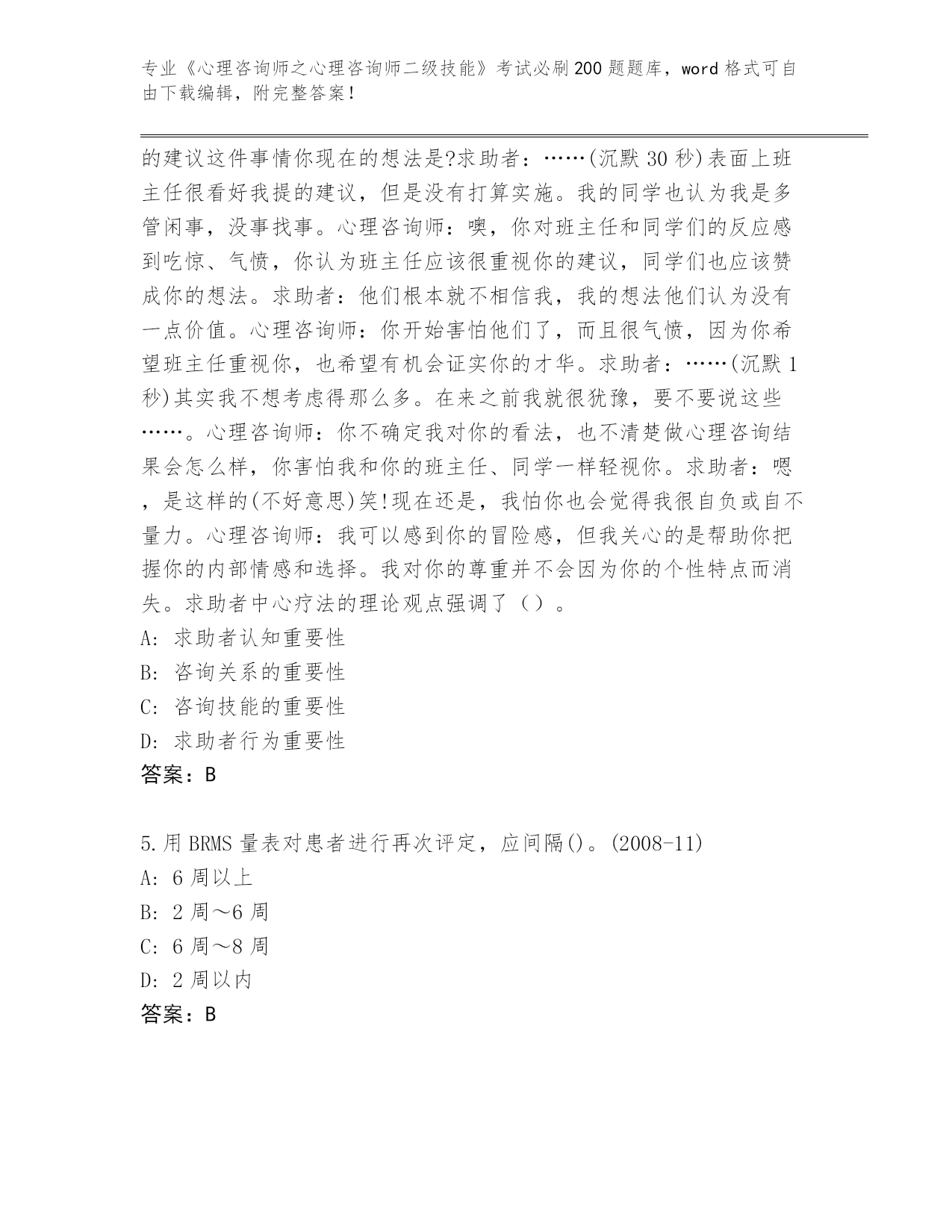 完整版重庆市沙坪坝区《心理咨询师之心理咨询师二级技能》考试必刷200题真题加答案