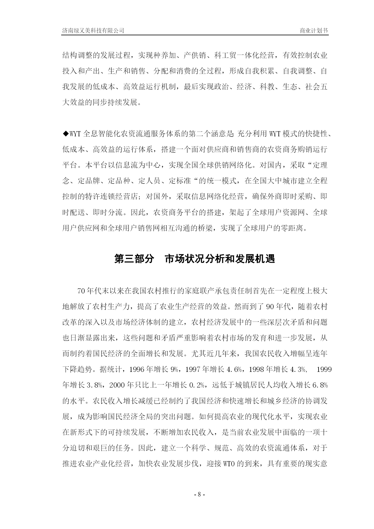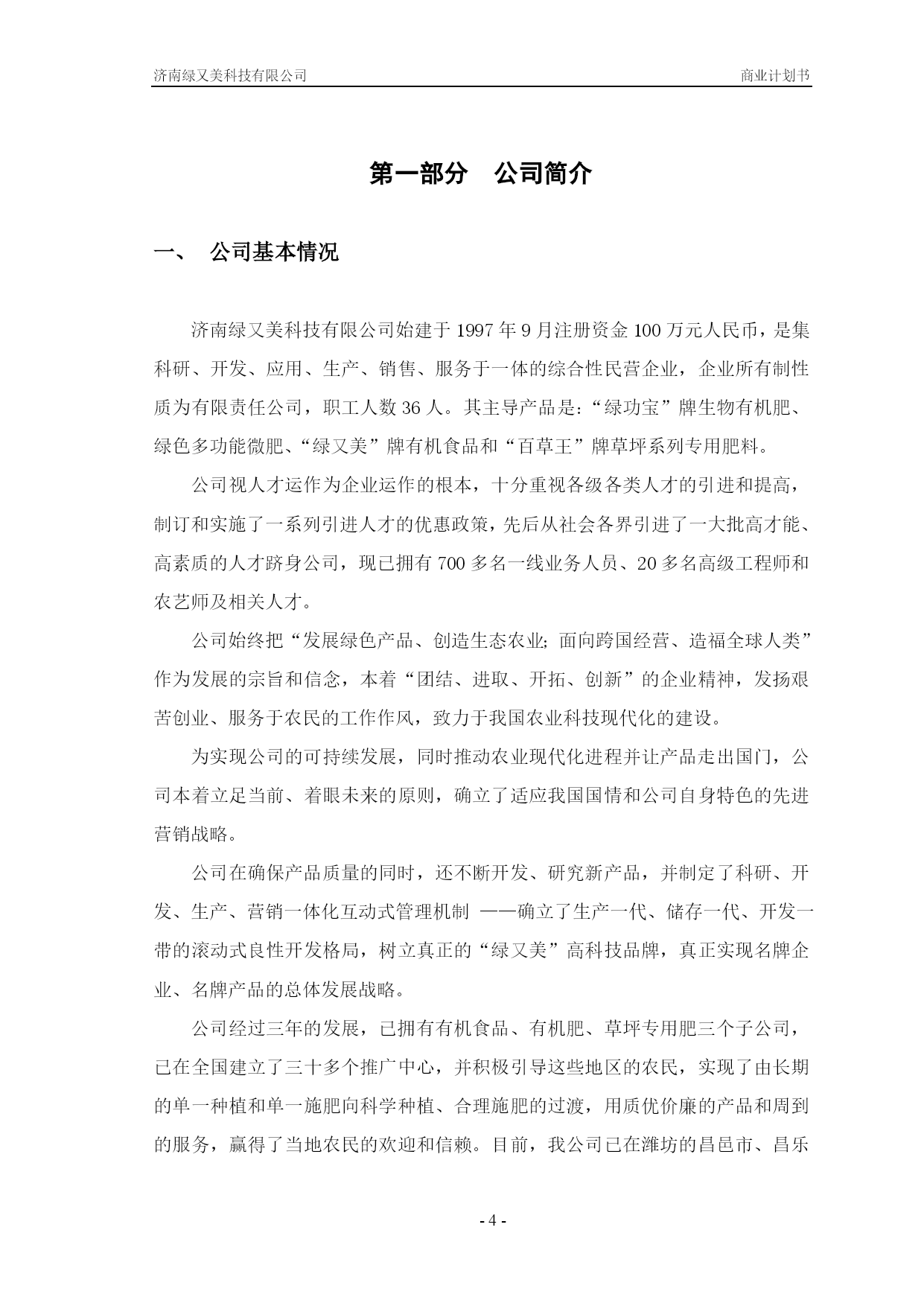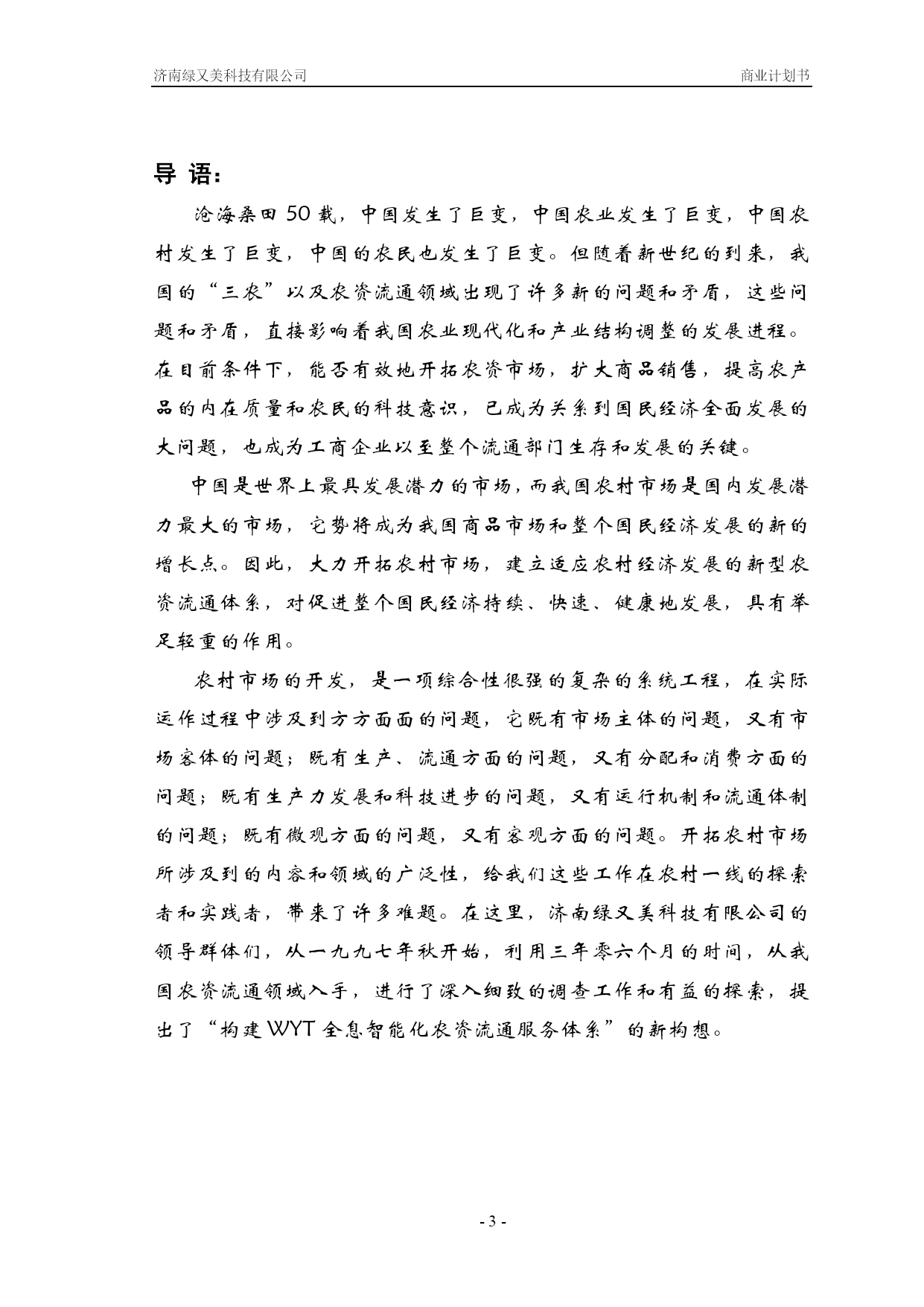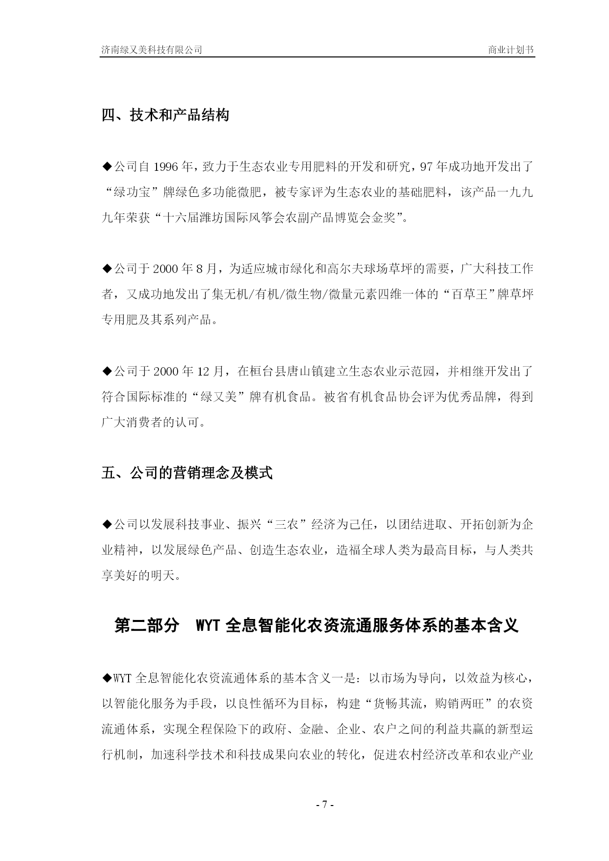 济南绿又美科技有限公司商业计划书-PAGE31-目录第一部分公司简介………………………………………………4第二部分WYT全息智能化农资物流服务体系的基本含义……7第三部分市场背景分析与发展机遇……………………………8第四部分基本优势与竞争分析………………………………11第五部分公司战略与实施方案………………………………14第六部分管理团队……………………………………………19第七部分风险与对策…………………………………………23第八部分财务分析……………………………………………26第九部分投资退出规划………………………………………30【编制说明】本商业计划书属商业机密,所有权属于济南绿又美科技有限公司。其所涉及的内容和资料只限于已签署投资意向的投资者和战略企划咨询合作者使用。收到计划书后,收件人应即刻确认,并遵守以下的规定:1)若收件人不希望涉足本计划书所述项目,请按公司地址尽快将本计划书完整退回;2)在没有济南绿又美科技有限公司的书面同意前,收件人不得将本计划书全部或部分的复制、影印、泄露或散布给他人;3)应该象对待贵公司的机密资料一样的态度对待本计划书所提供的所有机密资料。导语:沧海桑田50载,中国发生了巨变,中国农业发生了巨变,中国农村发生了巨变,中国的农民也发生了巨变。但随着新世纪的到来,我国的“三农”以及农资流通领域出现了许多新的问题和矛盾,这些问题和矛盾,直接影响着我国农业现代化和产业结构调整的发展进程。在目前条件下,能否有效地开拓农资市场,扩大商品销售,提高农产品的内在质量和农民的科技意识,已成为关系到国民经济全面发展的大问题,也成为工商企业以至整个流通部门生存和发展的关键。中国是世界上最具发展潜力的市场,而我国农村市场是国内发展潜力最大的市场,它势将成为我国商品市场和整个国民经济发展的新的增长点。因此,大力开拓农村市场,建立适应农村经济发展的新型农资流通体系,对促进整个国民经济持续、快速、健康地发展,具有举足轻重的作用。农村市场的开发,是一项综合性很强的复杂的系统工程,在实际运作过程中涉及到方方面面的问题,它既有市场主体的问题,又有市场客体的问题;既有生产、流通方面的问题,又有分配和消费方面的问题;既有生产力发展和科技进步的问题,又有运行机制和流通体制的问题;既有微观方面的问题,又有客观方面的问题。开拓农村市场所涉及到的内容和领域的广泛性,给我们这些工作在农村一线的探索者和实践者,带来了许多难题。在这里,济南绿又美科技有限公司的领导群体们,从一九九七年秋开始,利用三年零六个月的时间,从我国农资流通领域入手,进行了深入细致的调查工作和有益的探索,提出了“构建WYT全息智能化农资流通服务体系”的新构想。第一部分公司简介公司基本情况济南绿又美科技有限公司始建于1997年9月注册资金100万元人民币,是集科研、开发、应用、生产、销售、服务于一体的综合性民营企业,企业所有制性质为有限责任公司,职工人数36人。其主导产品是:“绿功宝”牌生物有机肥、绿色多功能微肥、“绿又美”牌有机食品和“百草王”牌草坪系列专用肥料。公司视人才运作为企业运作的根本,十分重视各级各类人才的引进和提高,制订和实施了一系列引进人才的优惠政策,先后从社会各界引进了一大批高才能、高素质的人才跻身公司,现已拥有700多名一线业务人员、20多名高级工程师和农艺师及相关人才。公司始终把“发展绿色产品、创造生态农业;面向跨国经营、造福全球人类”作为发展的宗旨和信念,本着“团结、进取、开拓、创新”的企业精神,发扬艰苦创业、服务于农民的工作作风,致力于我国农业科技现代化的建设。为实现公司的可持续发展,同时推动农业现代化进程并让产品走出国门,公司本着立足当前、着眼未来的原则,确立了适应我国国情和公司自身特色的先进营销战略。公司在确保产品质量的同时,还不断开发、研究新产品,并制定了科研、开发、生产、营销一体化互动式管理机制——确立了生产一代、储存一代、开发一带的滚动式良性开发格局,树立真正的“绿又美”高科技品牌,真正实现名牌企业、名牌产品的总体发展战略。公司经过三年的发展,已拥有有机食品、有机肥、草坪专用肥三个子公司,已在全国建立了三十多个推广中心,并积极引导这些地区的农民,实现了由长期的单一种植和单一施肥向科学种植、合理施肥的过渡,用质优价廉的产品和周到的服务,赢得了当地农民的欢迎和信赖。目前,我公司已在潍坊的昌邑市、昌乐县、寒亭区、淄博的桓台县、日照的莒县、莱州市的珍珠镇等地区,开展大面积的测土配方施肥活动,针对不同地区不同作物提供测土配方施肥方案,受到广大农民的普遍欢迎。随着公司的发展与市场的开拓,将向更多地区送科技下乡,提供测土配方施肥方案,让更多的农民从中受益,从而为我国高效农业的