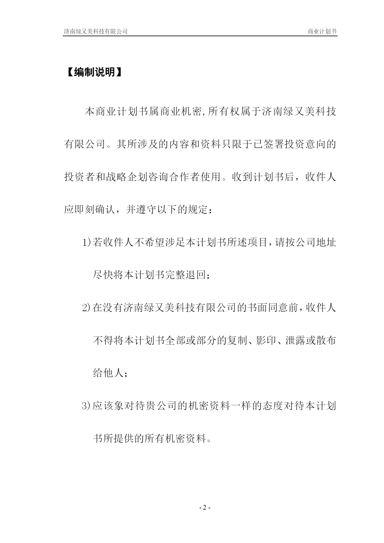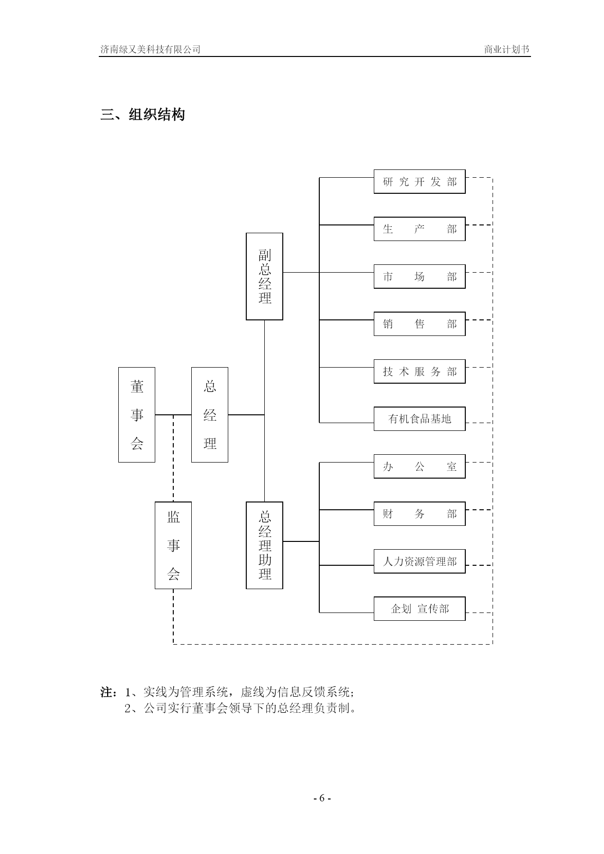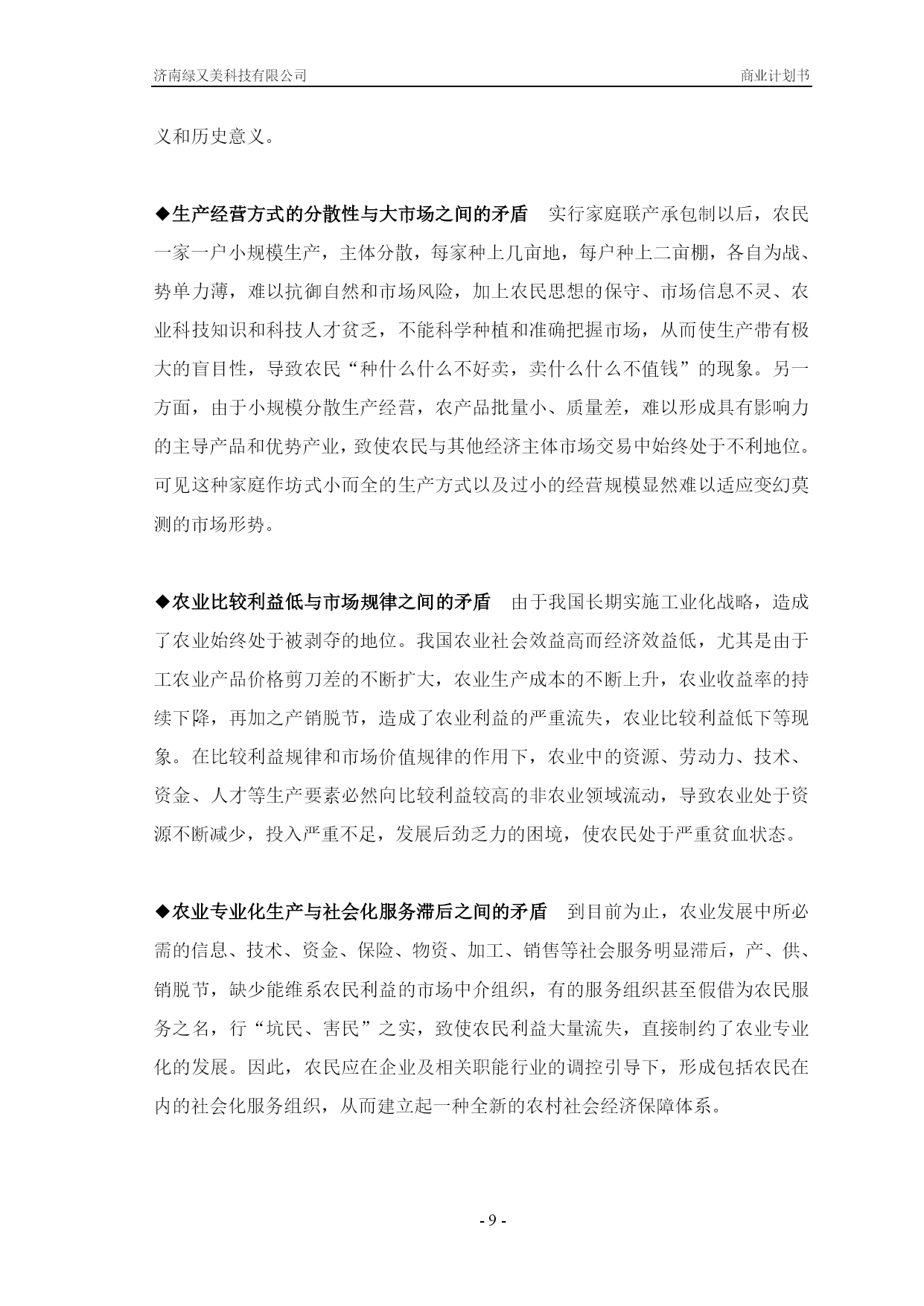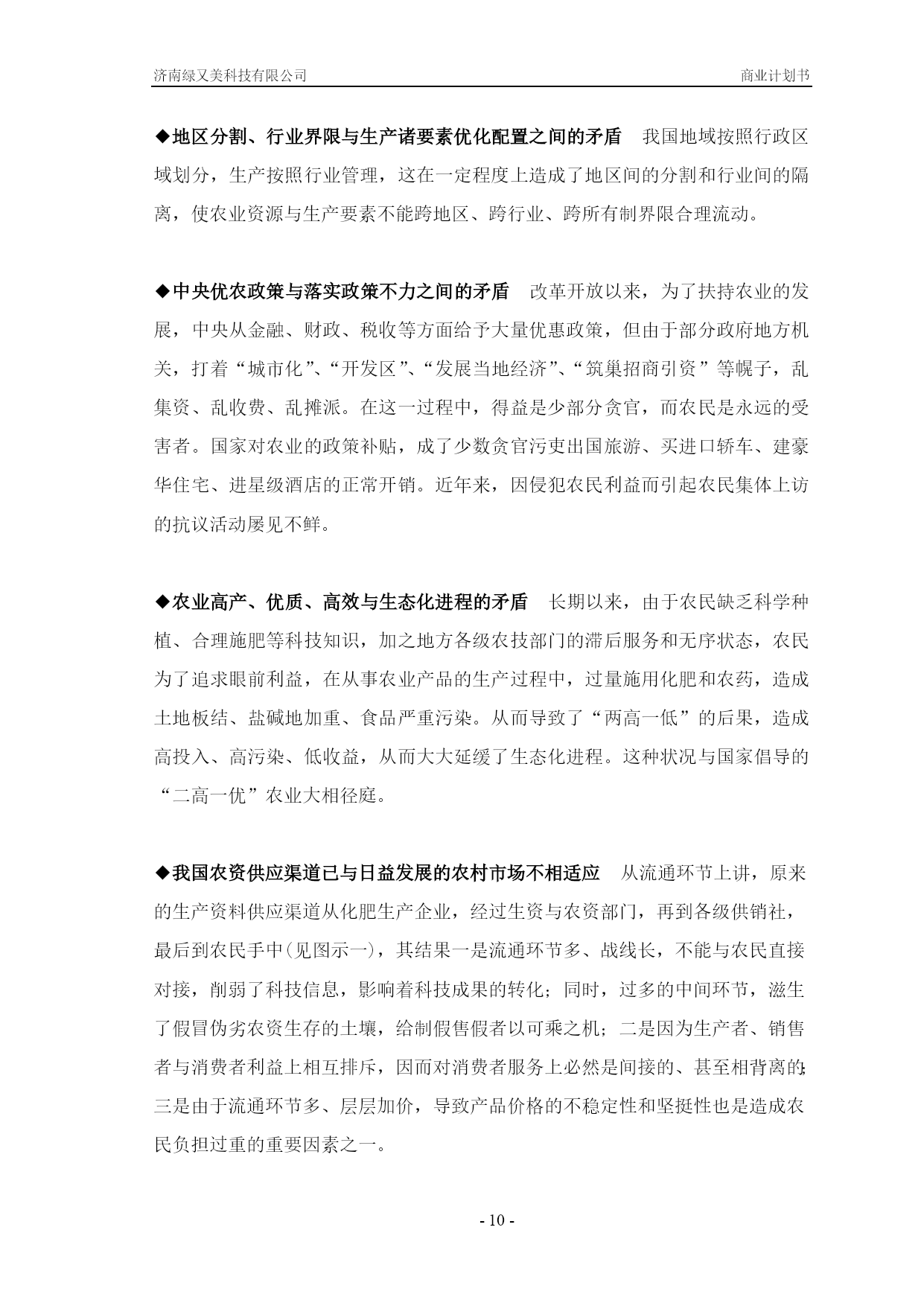 济南绿又美科技有限公司商业计划书-PAGE31-目录第一部分公司简介………………………………………………4第二部分WYT全息智能化农资物流服务体系的基本含义……7第三部分市场背景分析与发展机遇……………………………8第四部分基本优势与竞争分析………………………………11第五部分公司战略与实施方案………………………………14第六部分管理团队……………………………………………19第七部分风险与对策…………………………………………23第八部分财务分析……………………………………………26第九部分投资退出规划………………………………………30【编制说明】本商业计划书属商业机密,所有权属于济南绿又美科技有限公司。其所涉及的内容和资料只限于已签署投资意向的投资者和战略企划咨询合作者使用。收到计划书后,收件人应即刻确认,并遵守以下的规定:1)若收件人不希望涉足本计划书所述项目,请按公司地址尽快将本计划书完整退回;2)在没有济南绿又美科技有限公司的书面同意前,收件人不得将本计划书全部或部分的复制、影印、泄露或散布给他人;3)应该象对待贵公司的机密资料一样的态度对待本计划书所提供的所有机密资料。导语:沧海桑田50载,中国发生了巨变,中国农业发生了巨变,中国农村发生了巨变,中国的农民也发生了巨变。但随着新世纪的到来,我国的“三农”以及农资流通领域出现了许多新的问题和矛盾,这些问题和矛盾,直接影响着我国农业现代化和产业结构调整的发展进程。在目前条件下,能否有效地开拓农资市场,扩大商品销售,提高农产品的内在质量和农民的科技意识,已成为关系到国民经济全面发展的大问题,也成为工商企业以至整个流通部门生存和发展的关键。中国是世界上最具发展潜力的市场,而我国农村市场是国内发展潜力最大的市场,它势将成为我国商品市场和整个国民经济发展的新的增长点。因此,大力开拓农村市场,建立适应农村经济发展的新型农资流通体系,对促进整个国民经济持续、快速、健康地发展,具有举足轻重的作用。农村市场的开发,是一项综合性很强的复杂的系统工程,在实际运作过程中涉及到方方面面的问题,它既有市场主体的问题,又有市场客体的问题;既有生产、流通方面的问题,又有分配和消费方面的问题;既有生产力发展和科技进步的问题,又有运行机制和流通体制的问题;既有微观方面的问题,又有客观方面的问题。开拓农村市场所涉及到的内容和领域的广泛性,给我们这些工作在农村一线的探索者和实践者,带来了许多难题。在这里,济南绿又美科技有限公司的领导群体们,从一九九七年秋开始,利用三年零六个月的时间,从我国农资流通领域入手,进行了深入细致的调查工作和有益的探索,提出了“构建WYT全息智能化农资流通服务体系”的新构想。第一部分公司简介公司基本情况济南绿又美科技有限公司始建于1997年9月注册资金100万元人民币,是集科研、开发、应用、生产、销售、服务于一体的综合性民营企业,企业所有制性质为有限责任公司,职工人数36人。其主导产品是:“绿功宝”牌生物有机肥、绿色多功能微肥、“绿又美”牌有机食品和“百草王”牌草坪系列专用肥料。公司视人才运作为企业运作的根本,十分重视各级各类人才的引进和提高,制订和实施了一系列引进人才的优惠政策,先后从社会各界引进了一大批高才能、高素质的人才跻身公司,现已拥有700多名一线业务人员、20多名高级工程师和农艺师及相关人才。公司始终把“发展绿色产品、创造生态农业;面向跨国经营、造福全球人类”作为发展的宗旨和信念,本着“团结、进取、开拓、创新”的企业精神,发扬艰苦创业、服务于农民的工作作风,致力于我国农业科技现代化的建设。为实现公司的可持续发展,同时推动农业现代化进程并让产品走出国门,公司本着立足当前、着眼未来的原则,确立了适应我国国情和公司自身特色的先进营销战略。公司在确保产品质量的同时,还不断开发、研究新产品,并制定了科研、开发、生产、营销一体化互动式管理机制——确立了生产一代、储存一代、开发一带的滚动式良性开发格局,树立真正的“绿又美”高科技品牌,真正实现名牌企业、名牌产品的总体发展战略。公司经过三年的发展,已拥有有机食品、有机肥、草坪专用肥三个子公司,已在全国建立了三十多个推广中心,并积极引导这些地区的农民,实现了由长期的单一种植和单一施肥向科学种植、合理施肥的过渡,用质优价廉的产品和周到的服务,赢得了当地农民的欢迎和信赖。目前,我公司已在潍坊的昌邑市、昌乐县、寒亭区、淄博的桓台县、日照的莒县、莱州市的珍珠镇等地区,开展大面积的测土配方施肥活动,针对不同地区不同作物提供测土配方施肥方案,受到广大农民的普遍欢迎。随着公司的发展与市场的开拓,将向更多地区送科技下乡,提供测土配方施肥方案,让更多的农民从中受益,从而为我国高效农业的