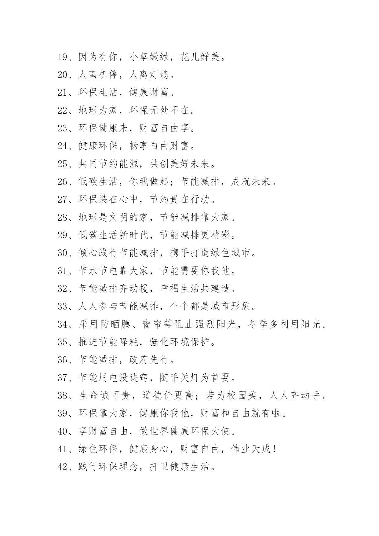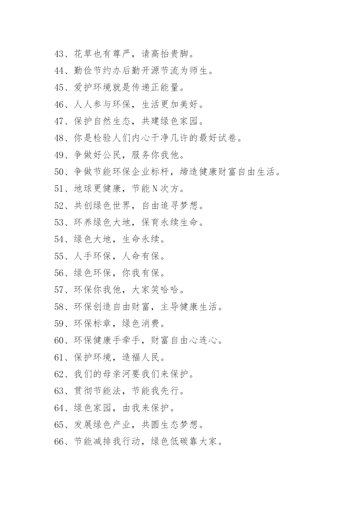 有特色的环保标语2020年有特色的环保标语锦集71条减少了垃圾,就减少了生命的危机;增加了绿色,就增加了生命的活力。以下是小编给各位读者分享的有特色的环保标语71条,欢迎阅读,希望能够对大家有所帮助。1、种一棵树,就像给校园一份礼物。2、没有节约,就没有未来。3、保护环境,始于手上,止于嘴上。4、垃圾带走,美丽存留。5、关掉显示器比任何屏幕保护都省电。6、爱护花草树木,人人有责。7、天更蓝、草更绿、花更艳。8、你栽一棵树,我栽一棵树,我们共同为校园添绿。9、需求无限,资源有限;善用有限,发展无限。10、享受低碳生活,不再被OUT。11、树木拥有了绿色,地球才能有脉搏。12、节能低碳大舞台,企业有你更精彩。13、美丽商洛是我家,节能低碳靠大家。14、争做环保使者共创绿色礼貌。15、男女老少齐动员,保护绿色好家园。16、美好家园,需要我们共同建设。17、菜场整洁,大家开心。18、多一份绿色,少一份遗憾。19、因为有你,小草嫩绿,花儿鲜美。20、人离机停,人离灯熄。21、环保生活,健康财富。22、地球为家,环保无处不在。23、环保健康来,财富自由享。24、健康环保,畅享自由财富。25、共同节约能源,共创美好未来。26、低碳生活,你我做起;节能减排,成就未来。27、环保装在心中,节约贵在行动。28、地球是文明的家,节能减排靠大家。29、低碳生活新时代,节能减排更精彩。30、倾心践行节能减排,携手打造绿色城市。31、节水节电靠大家,节能需要你我他。32、节能减排齐动援,幸福生活共建造。33、人人参与节能减排,个个都是城市形象。34、采用防晒膜、窗帘等阻止强烈阳光,冬季多利用阳光。35、推进节能降耗,强化环境保护。36、节能减排,政府先行。37、节能用电没诀窍,随手关灯为首要。38、生命诚可贵,道德价更高;若为校园美,人人齐动手。39、环保靠大家,健康你我他,财富和自由就有啦。40、享财富自由,做世界健康环保大使。41、绿色环保,健康身心,财富自由,伟业天成!42、践行环保理念,扞卫健康生活。43、花草也有尊严,请高抬贵脚。44、勤俭节约办后勤开源节流为师生。45、爱护环境就是传递正能量。46、人人参与环保,生活更加美好。47、保护自然生态,共建绿色家园。48、你是检验人们内心干净几许的最好试卷。49、争做好公民,服务你我他。50、争做节能环保企业标杆,缔造健康财富自由生活。51、地球更健康,节能N次方。52、共创绿色世界,自由追寻梦想。53、环养绿色大地,保育永续生命。54、绿色大地,生命永续。55、人手环保,人命有保。56、绿色环保,你我有保。57、环保你我他,大家笑哈哈。58、环保创造自由财富,主导健康生活。59、环保标章,绿色消费。60、环保健康手牵手,财富自由心连心。61、保护环境,造福人民。62、我们的母亲河要我们来保护。63、贯彻节能法,节能我先行。64、绿色家园,由我来保护。65、发展绿色产业,共圆生态梦想。66、节能减排我行动,绿色低碳靠大家。67、我们需要和平更需要象征和平的绿色世界。68、让环保,成为一种修行——力皇。69、托起家的温馨——托爱。70、节能减排,利国利民。71、开展环境连片整治,改善农村生活环境。