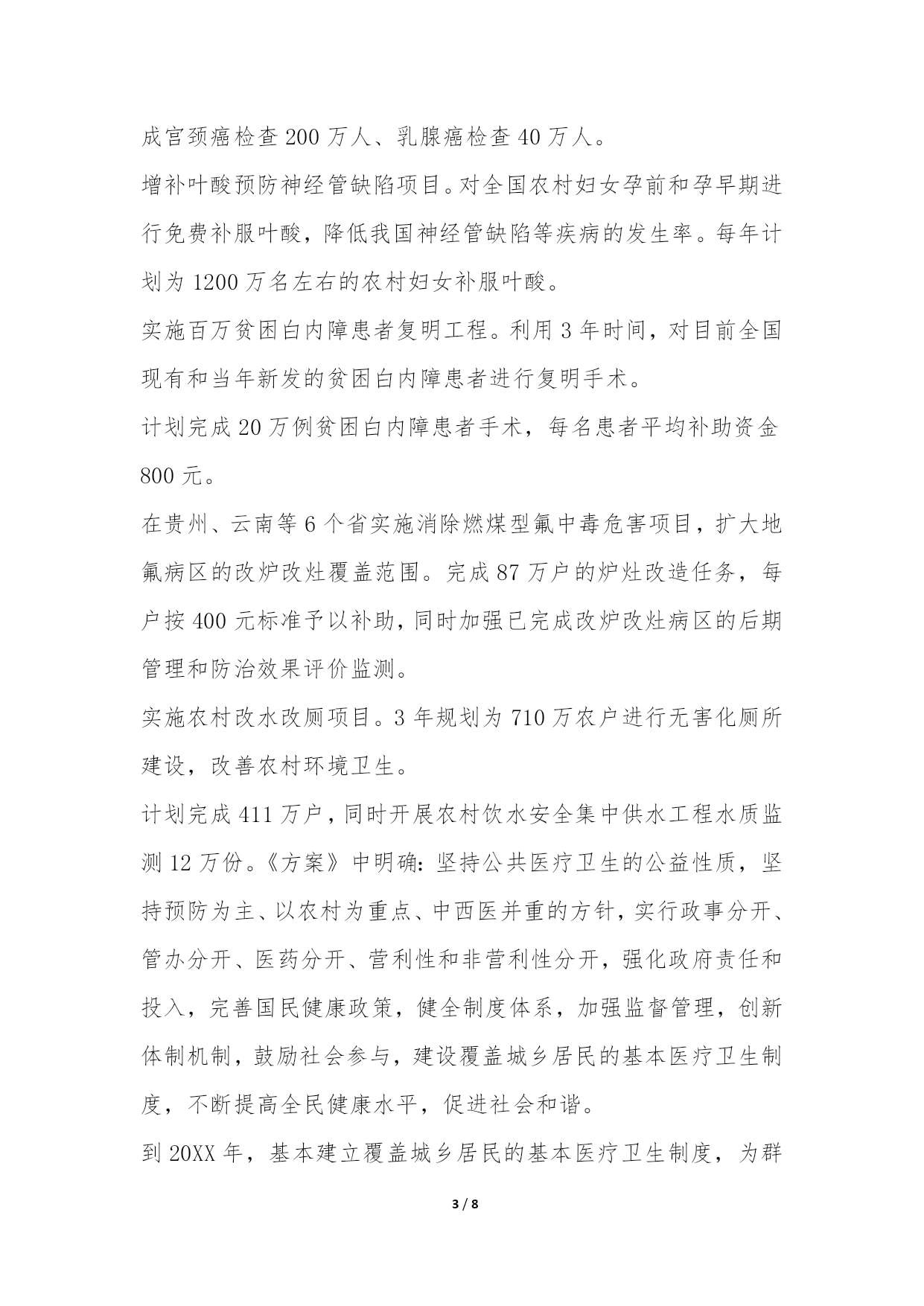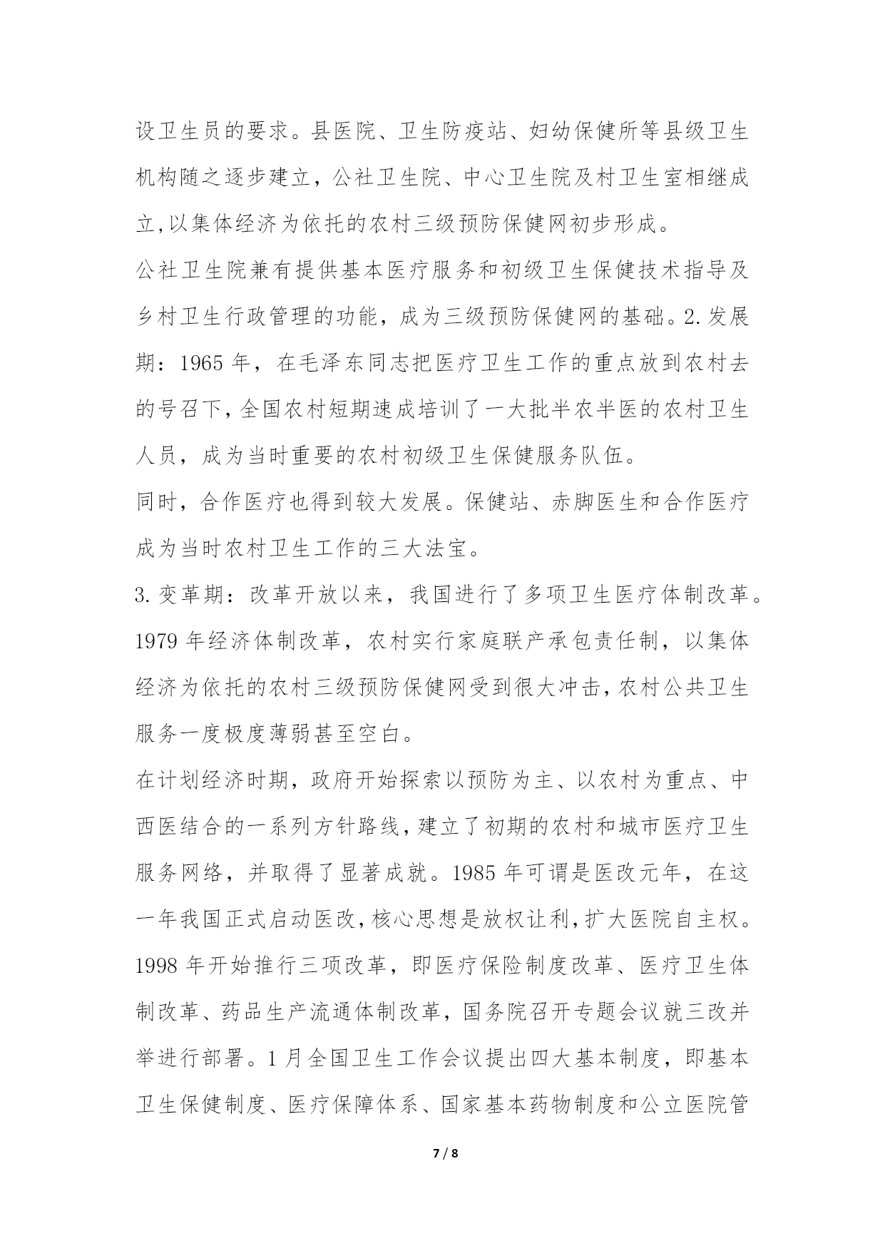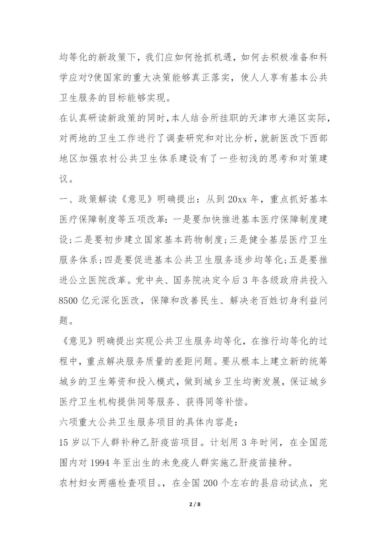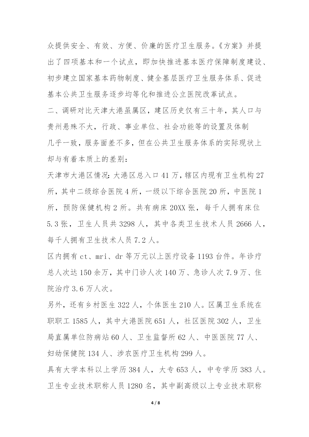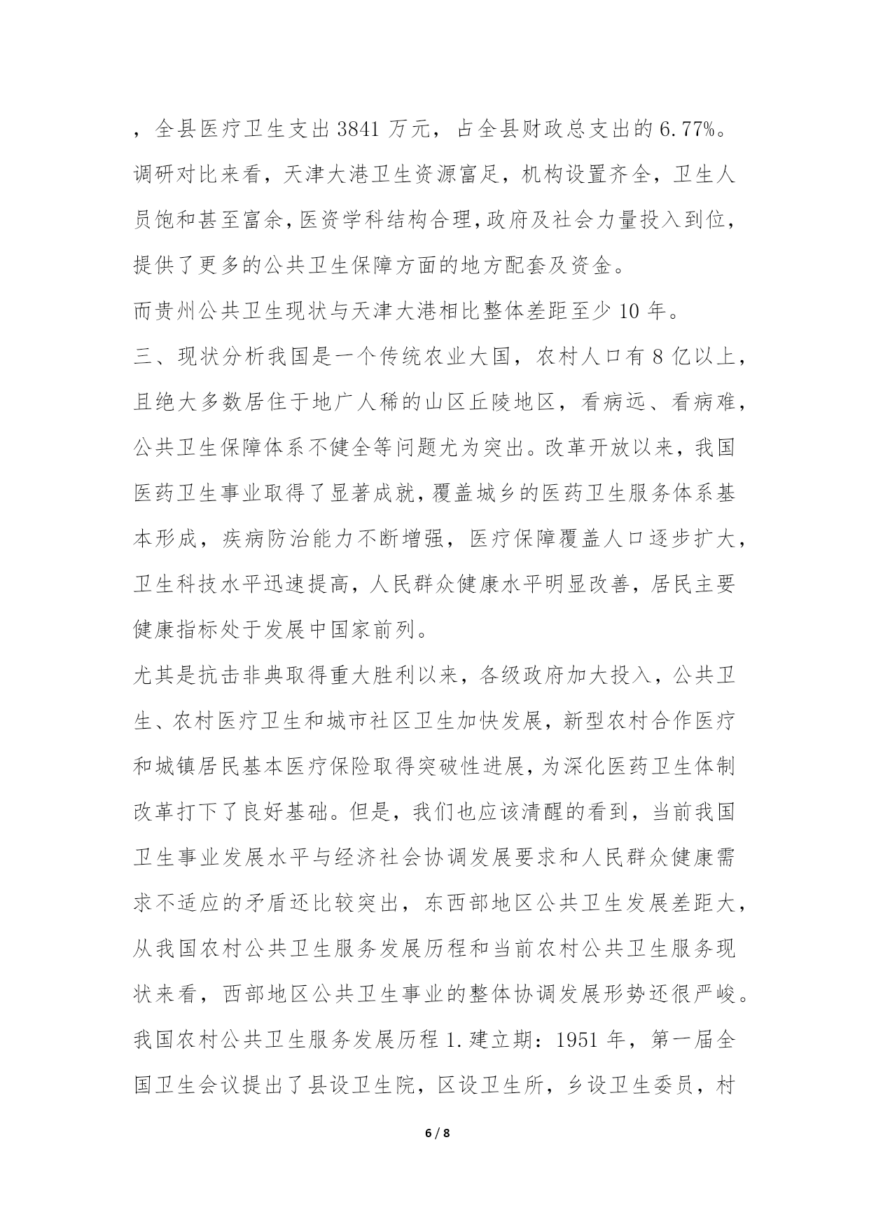 PAGE8/NUMPAGES8农村公共卫生体系建设调研报告一场突出其来的sars疫情、近年来多个地区发生的儿童手足口病、世界各地均有蔓延趋势的艾滋病毒、重大灾害所产生的次生灾害以及目前全球正在爆发的甲型h1n1流感等疫情给我们的卫生防疫体系带来了前所未有的严峻考验,让我们更加清醒地认识到加强卫生防疫体系建设的重要性,并反思公共卫生建设中存在的突出问题,特别是农村公共卫生体系中存在的诸多刻不容缓的问题。应如何采取有效的措施来建立和完善农村医疗保障体系,不断提高人们的健康水平,最大限度减少各种疫病对人类的危害,维护公共安全,构建和谐社会,有效建立覆盖全国,特别是农村地区的公共卫生防疫网络等问题,是当前各级政府及为公共卫生提供管理与服务的各界管理者和服务者都应认真做出的科学思考和决策行动。面对当前公共卫生所面临的严峻形势,中共中央、国务院审时度势,在多年深入调研、试点的基础上,经过5个多月公开征求意见和修订,4月6日正式公布了《中共中央国务院关于深化医药卫生体制改革的意见》,4月7日,国务院出台了《医药卫生体制改革近期重点实施方案》。而地处西部地区贵州省南缘中部的县,一个国家新阶段贫困开发重点县,资源匮乏、财力薄弱、灾害频繁、公共卫生资源严重不足,在国家扩大内需,加大对西部贫困地区建设投入、新医改政策重点促进基本公共卫生服务逐步均等化的新政策下,我们应如何抢抓机遇,如何去积极准备和科学应对?使国家的重大决策能够真正落实,使人人享有基本公共卫生服务的目标能够实现。在认真研读新政策的同时,本人结合所挂职的天津市大港区实际,对两地的卫生工作进行了调查研究和对比分析,就新医改下西部地区加强农村公共卫生体系建设有了一些初浅的思考和对策建议。一、政策解读《意见》明确提出:从到20xx年,重点抓好基本医疗保障制度等五项改革:一是要加快推进基本医疗保障制度建设;二是要初步建立国家基本药物制度;三是健全基层医疗卫生服务体系;四是要促进基本公共卫生服务逐步均等化;五是要推进公立医院改革。党中央、国务院决定今后3年各级政府共投入8500亿元深化医改,保障和改善民生、解决老百姓切身利益问题。《意见》明确提出实现公共卫生服务均等化,在推行均等化的过程中,重点解决服务质量的差距问题。要从根本上建立新的统筹城乡的卫生筹资和投入模式,做到城乡卫生均衡发展,保证城乡医疗卫生机构提供同等服务、获得同等补偿。六项重大公共卫生服务项目的具体内容是:15岁以下人群补种乙肝疫苗项目。计划用3年时间,在全国范围内对1994年至出生的未免疫人群实施乙肝疫苗接种。农村妇女两癌检查项目。,在全国200个左右的县启动试点,完成宫颈癌检查200万人、乳腺癌检查40万人。增补叶酸预防神经管缺陷项目。对全国农村妇女孕前和孕早期进行免费补服叶酸,降低我国神经管缺陷等疾病的发生率。每年计划为1200万名左右的农村妇女补服叶酸。实施百万贫困白内障患者复明工程。利用3年时间,对目前全国现有和当年新发的贫困白内障患者进行复明手术。计划完成20万例贫困白内障患者手术,每名患者平均补助资金800元。在贵州、云南等6个省实施消除燃煤型氟中毒危害项目,扩大地氟病区的改炉改灶覆盖范围。完成87万户的炉灶改造任务,每户按400元标准予以补助,同时加强已完成改炉改灶病区的后期管理和防治效果评价监测。实施农村改水改厕项目。3年规划为710万农户进行无害化厕所建设,改善农村环境卫生。计划完成411万户,同时开展农村饮水安全集中供水工程水质监测12万份。《方案》中明确:坚持公共医疗卫生的公益性质,坚持预防为主、以农村为重点、中西医并重的方针,实行政事分开、管办分开、医药分开、营利性和非营利性分开,强化政府责任和投入,完善国民健康政策,健全制度体系,加强监督管理,创新体制机制,鼓励社会参与,建设覆盖城乡居民的基本医疗卫生制度,不断提高全民健康水平,促进社会和谐。到20XX年,基本建立覆盖城乡居民的基本医疗卫生制度,为群众提供安全、有效、方便、价廉的医疗卫生服务。《方案》并提出了四项基本和一个试点,即加快推进基本医疗保障制度建设、初步建立国家基本药物制度、健全基层医疗卫生服务体系、促进基本公共卫生服务逐步均等化和推进公立医院改革试点。二、调研对比天津大港虽属区,建区历史仅有三十年,其人口与贵州悬殊不大,行政、事业单位、社会功能等的设置及体制几乎一致,服务面差不多,但在公共卫生服务体系的实际现状上却与有着本质上的差别:天津市大港区情况:大港区总入口41万,辖区内现有卫生机构27所,其中二级综合医院4所,一级以下综合医院20所,中医院1所,预防保健机构2所。共有病床20XX张,每千人拥有床位5.3张,卫生人员共3298人,其中各类卫生技术人员2666人,每千人拥有卫生技术人员7.2人。区内拥有ct、mri、d