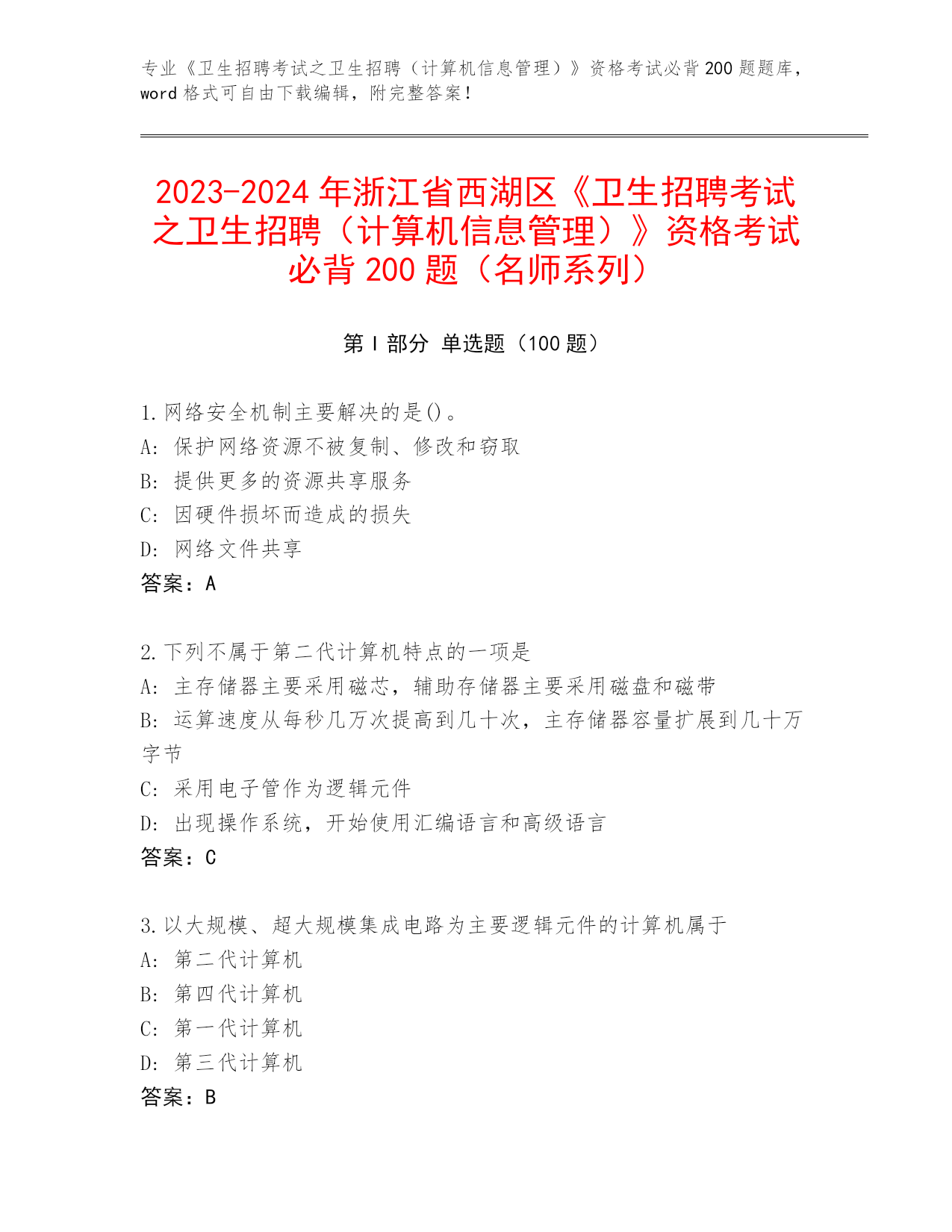 2023-2024年浙江省西湖区《卫生招聘考试之卫生招聘(计算机信息管理)》资格考试必背200题(名师系列)