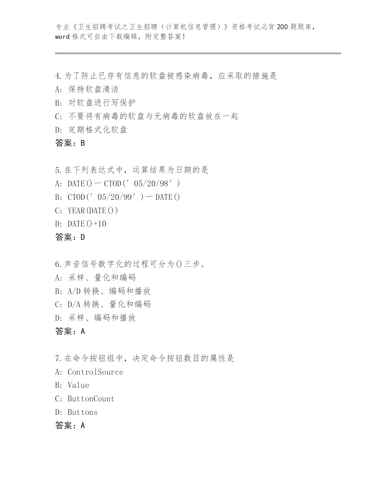 2024浙江省建德市《卫生招聘考试之卫生招聘(计算机信息管理)》资格考试必背200题内部题库【名师系列】