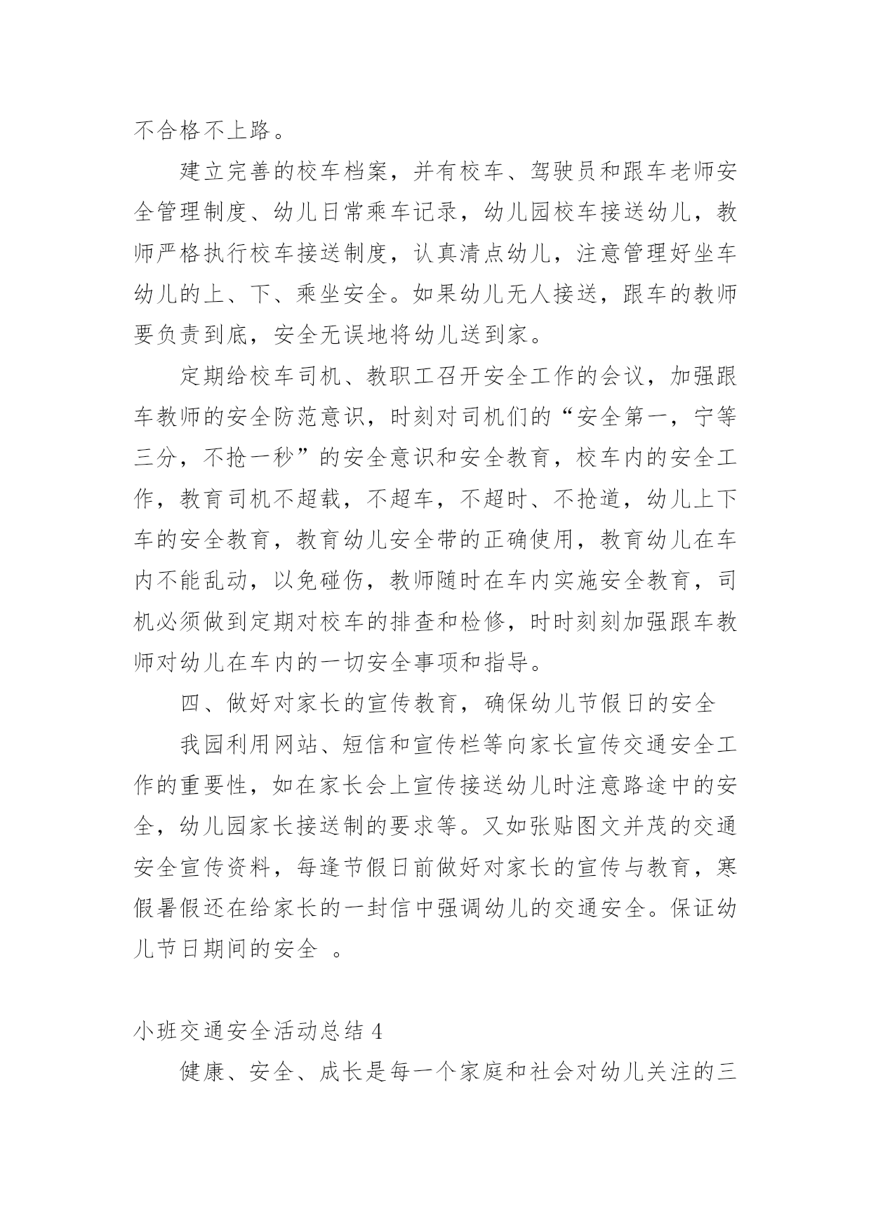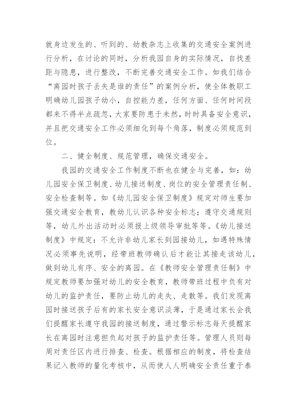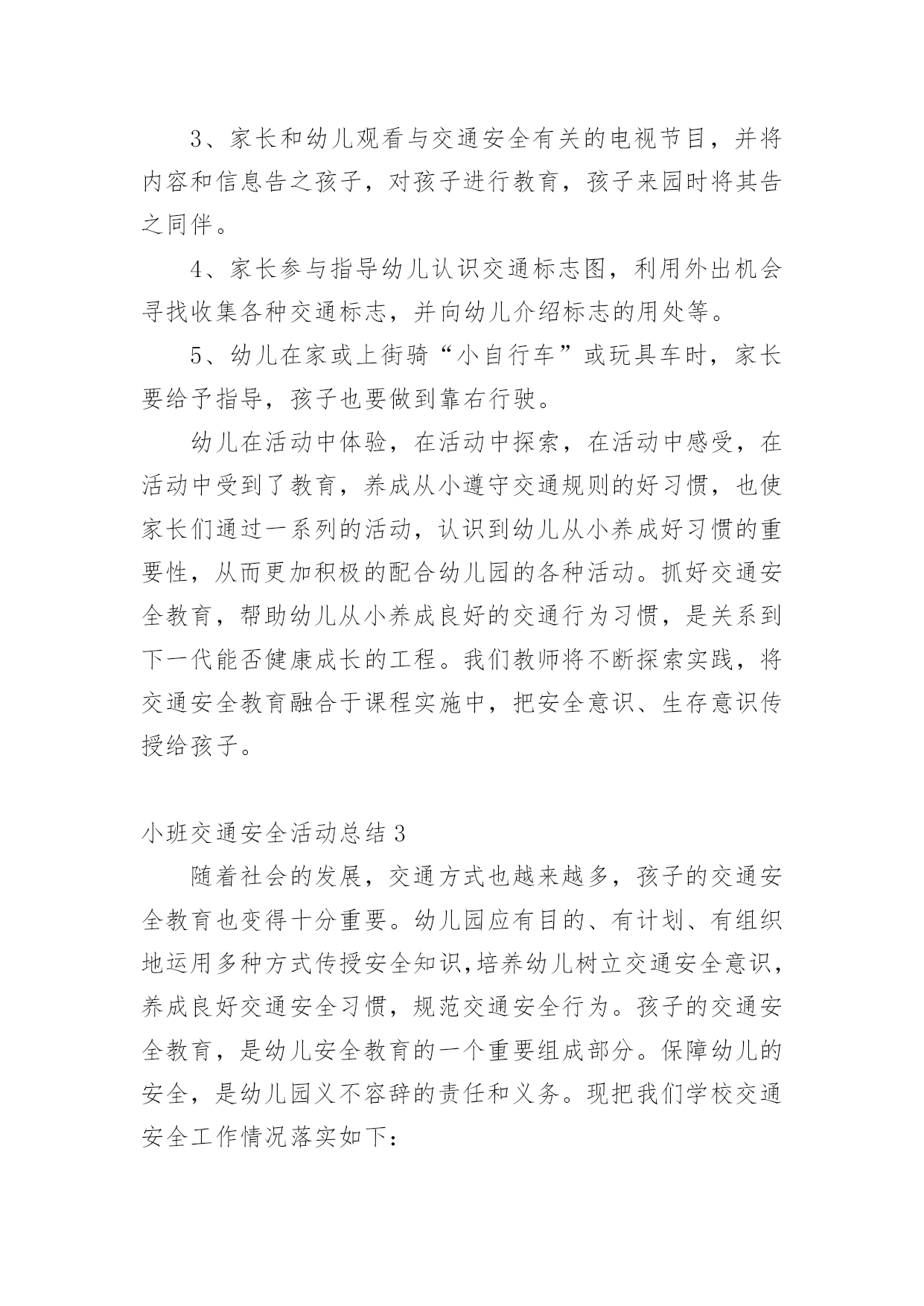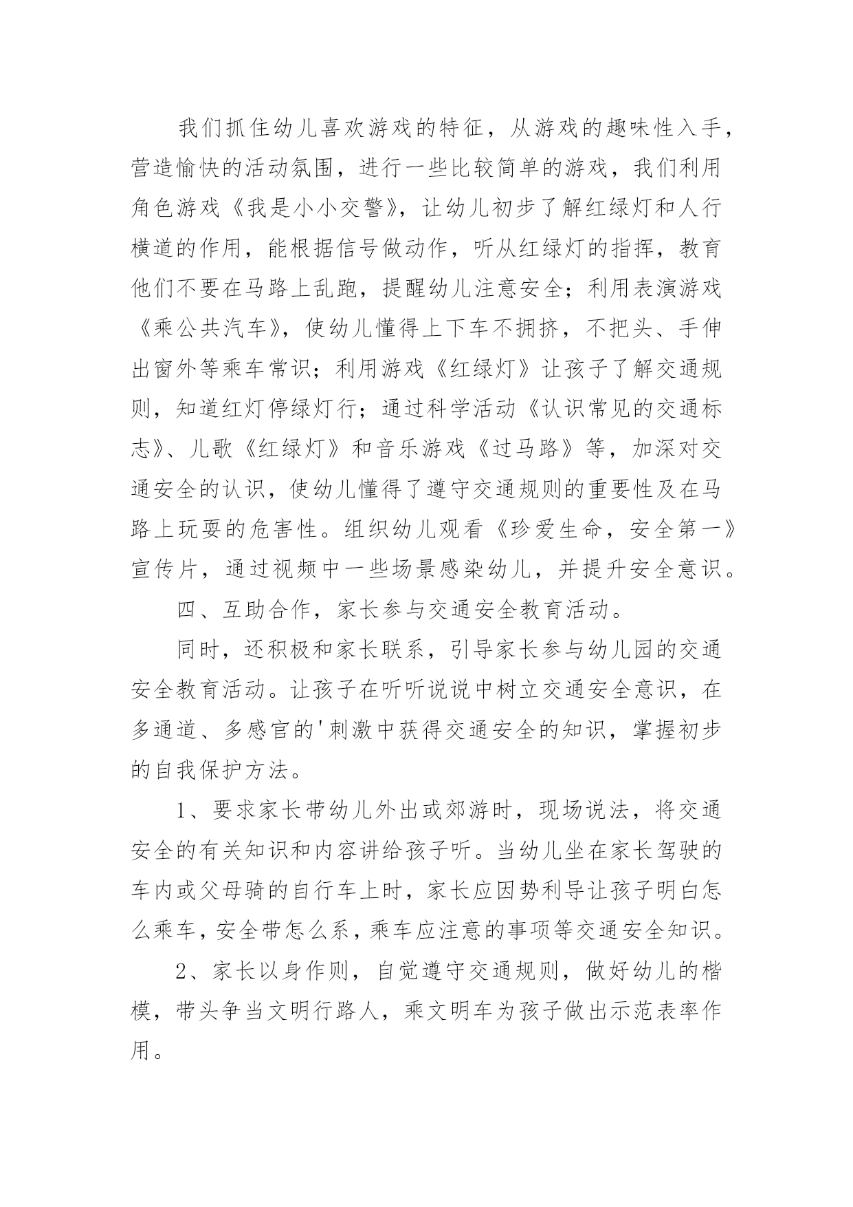 小班交通安全活动总结总结是对某一阶段的工作、学习或思想中的经验或情况进行分析研究的书面材料,它是增长才干的一种好办法,快快来写一份总结吧。但是总结有什么要求呢?下面是小编为大家收集的小班交通安全活动总结,欢迎大家借鉴与参考,希望对大家有所帮助。小班交通安全活动总结1安全第一,责任重于泰山,保证和促进幼儿的健康和安全是幼儿园的首要任务。因此,我园非常此项工作,尤其交通安全工作。为了全面贯彻落实市委关于交通安全的文件精神,我们把“交通安全”摆在幼儿园工作的重要议事日程,认真贯彻学习各级有关交通安全工作的会议精神,仔细考虑全园师生方方面面的交通安全,排查隐患,进一步规范工作,不断提高交通安全管理工作。一、领导重视,加强学习,交通安全工作常抓不懈。为把安全工作落到实处,我园成立了安全领导小组,并针对交通安全工作签定安全责任书,即:单位与主管部门签定了安全责任书;分管领导与教师签定了安全责任书;教师与家长签定了安全责任书;做到各司其职、各负其责、密切配合、齐抓共管。除此外,我们要求全体教职工自觉学习交通安全知识,通过网上看资料、案例分析、光盘等对《交通安全法》有了深入的了解。同时我们还组织教职工一起讨论,就身边发生的、听到的、幼教杂志上收集的交通安全案例进行分析,在讨论的同时,分析我园自身的实际情况,自找差距与隐患,进行整改,不断完善交通安全工作。如我们结合“离园时孩子丢失是谁的责任”的案例分析,使全体教职工明确幼儿园孩子幼小,自控能力差,任何方面、任何时间段都来不得半点疏忽,大家要防患于未然,时时具备安全意识,并且把交通安全工作必须细化到每个角落,制度必须规范到位。二、健全制度、规范管理,确保交通安全。我园的交通安全工作制度不断也在健全与完善,如:幼儿园安全保卫制度、幼儿接送制度、岗位的安全管理责任制、安全检查制等。如《幼儿园安全保卫制度》规定对师生要加强交通安全教育,教幼儿认识各种安全标志;遵守交通规则等,幼儿外出活动时必须报上级领导审批等等。《幼儿接送制度》中规定:不允许非幼儿家长到园接幼儿,如遇特殊情况必须事先说明,经带班教师确认后才能让其接走该幼儿,做到幼儿有序、安全的离园。在《教师安全管理责任制》中规定教师要加强对幼儿的安全教育,教师带班过程中负有对幼儿的监护责任,要防止幼儿的走失、走散等。我们发现离园时接送孩子后有的家长安全意识淡薄,于是通过家长会我们提醒家长遵守我园的接送制度,通过警示标志每天提醒家长在离园时注意担负起对孩子的监护责任等。管理人员则每周对责任区内进行排查、检查。根据相应的制度,将检查结果记入教师的量化考核中,从而使人人明确安全责任重于泰山,保证安全措施的时时落实。三、深入实践,细化工作,探索交通安全管理有效策略为了保证幼儿的接送安全,每天清晨与傍晚,我园分管此项工作的教师在幼儿来园、离园时督促检查,提示家长注意安全,号召教职工们做遵守交通规则的模范。校门口接送孩子时停车较多,我们指导家长将车按区域、有秩序停放,不停在校门口要道,通过在校门外设置警示标语,提醒家长在离园时监护好自己的孩子,以免孩子出现交通意外,保证出入要道的畅通。四、注重引导教育,幼儿从小树立交通安全意识。安全工作,教育为先。幼儿园的孩子年龄小,自我保护能力差,交通安全教育更要注重具体、形象,要抓细、抓实对幼儿的安全教育。我园教师根据幼儿的年龄特点由浅入深分别安排了交通安全的主题教育活动,如:小班户外游戏的安全教育,中班认识交通安全标志的主题教育等,让幼儿明确行走路时如何遵守交通规则。此外,我们还发挥家长作用,请家长带幼儿去十字路口看交警指挥交通,观察行人遵守交通规则的.情况,看一看机动车道、非机动车道上的车子,提醒幼儿走人行道,走“斑马线”——人行横道线,教幼儿会看红绿灯,使幼儿将“红灯行、绿灯停”等交通规则深植心中。五、做好对家长的宣传教育,确保幼儿节假日的安全。我园利用家长会向家长宣传交通安全工作的重要性,以及接送幼儿时注意路途中的安全、幼儿园家长接送制的要求等,特别是节假日前加强对幼儿的交通安全教育工作,以保证幼儿节日期间的出行安全。可以说我园的交通安全工作从规范管理入手,加强制度保障、检查等,对幼儿的教育能够做到从细微处着眼,同时我们也想到随着园所环境的不断变化,幼儿园规模的扩大,方方面面的工作应做得更细更实,我们有信心把这项工作做得更好。小班交通安全活动总结2为了让我们的孩子能够:“高高兴兴上学,平平安安回家”,为了强化幼儿交通法规和安全意识,提高幼儿自我防护能力。根据武教办[20xx]134号《关于开展全国中小学生交通安全宣传月活动的通知》精神,并结合幼儿园实际,开展了交通安全宣传教育活动,现把活动开展情况总结如下:一、全方位管理,完善幼儿接送安全制度。为保证活动长期有序地开展,我园成立了“交通安全领导小组”,园长亲自主持