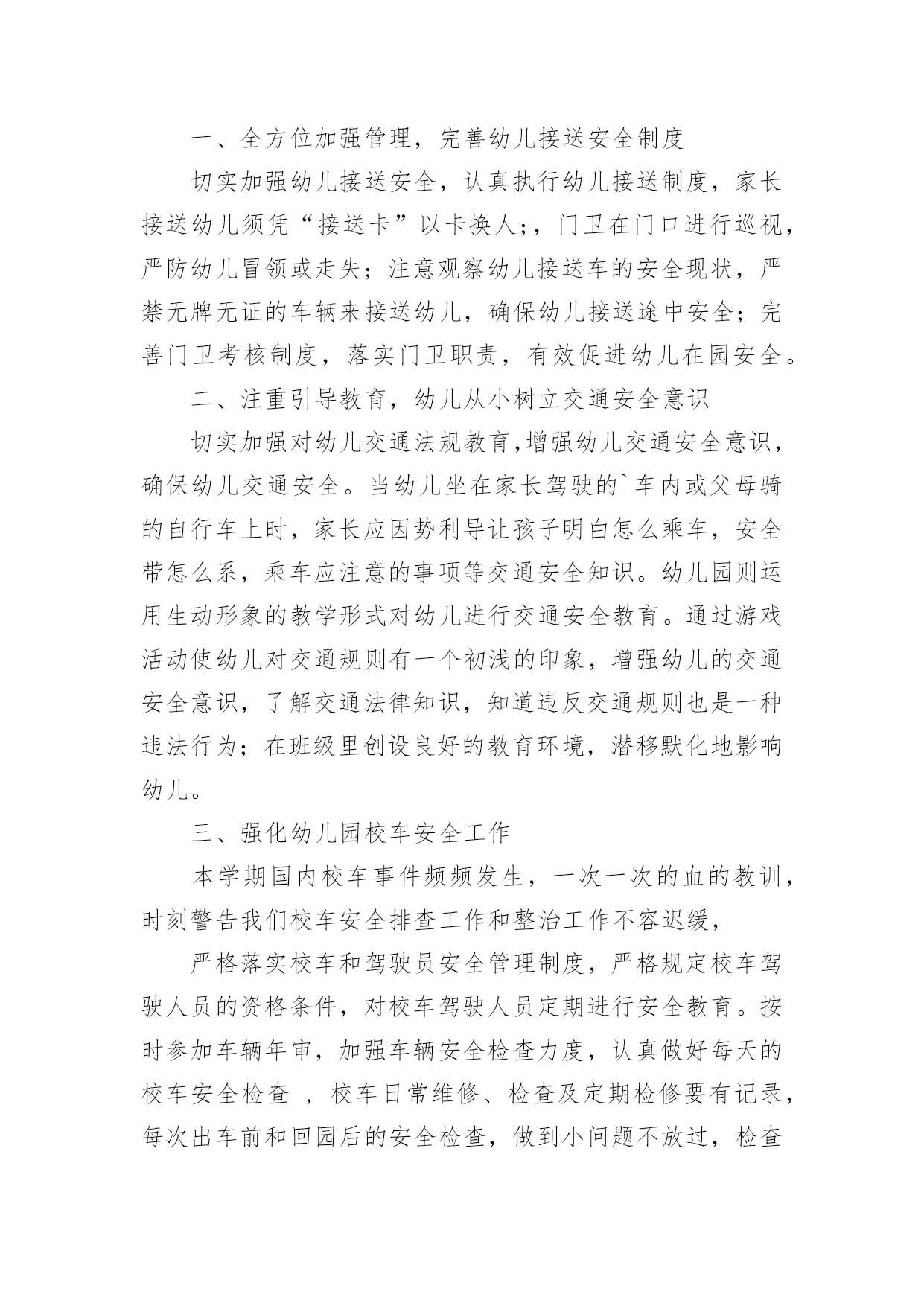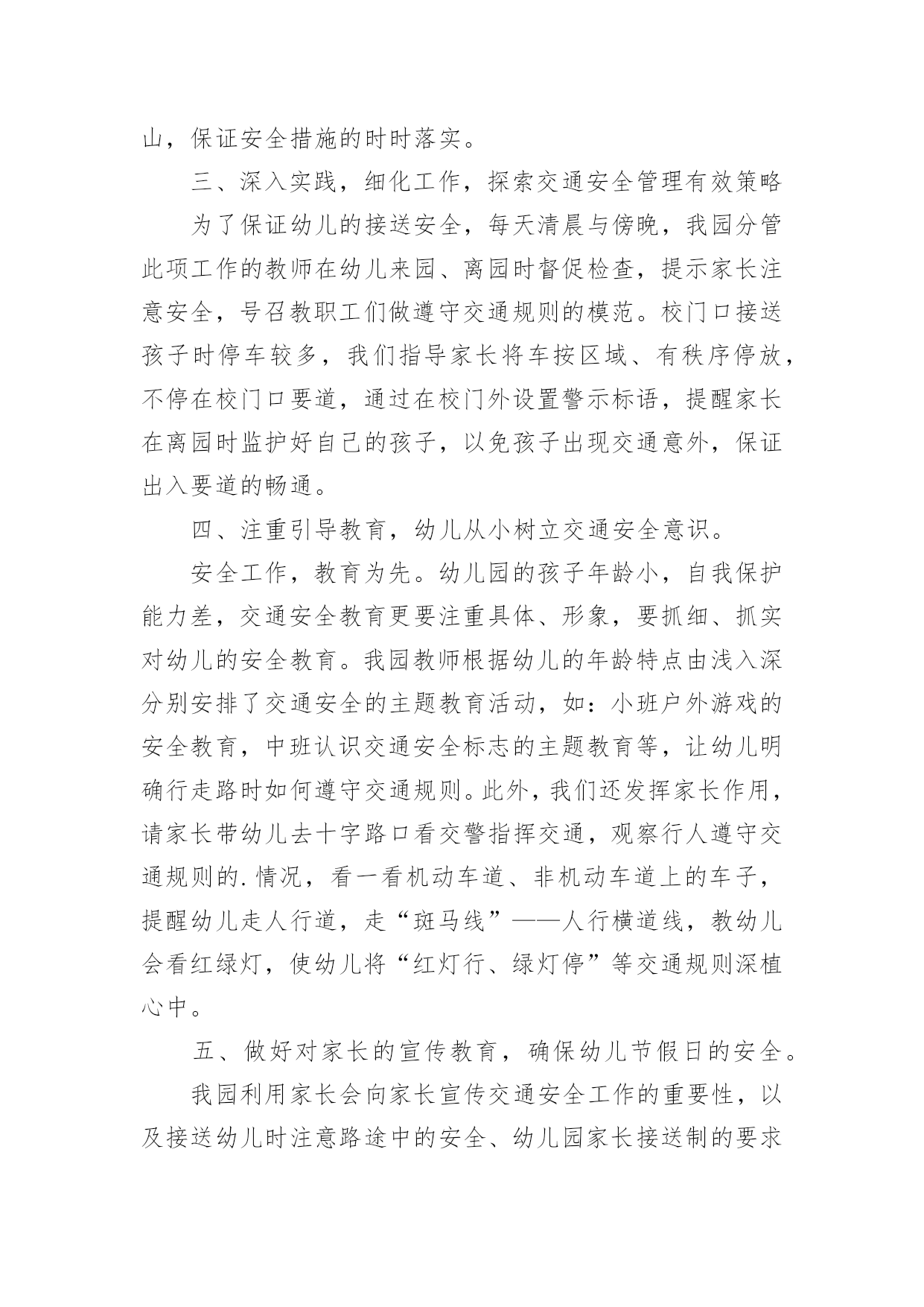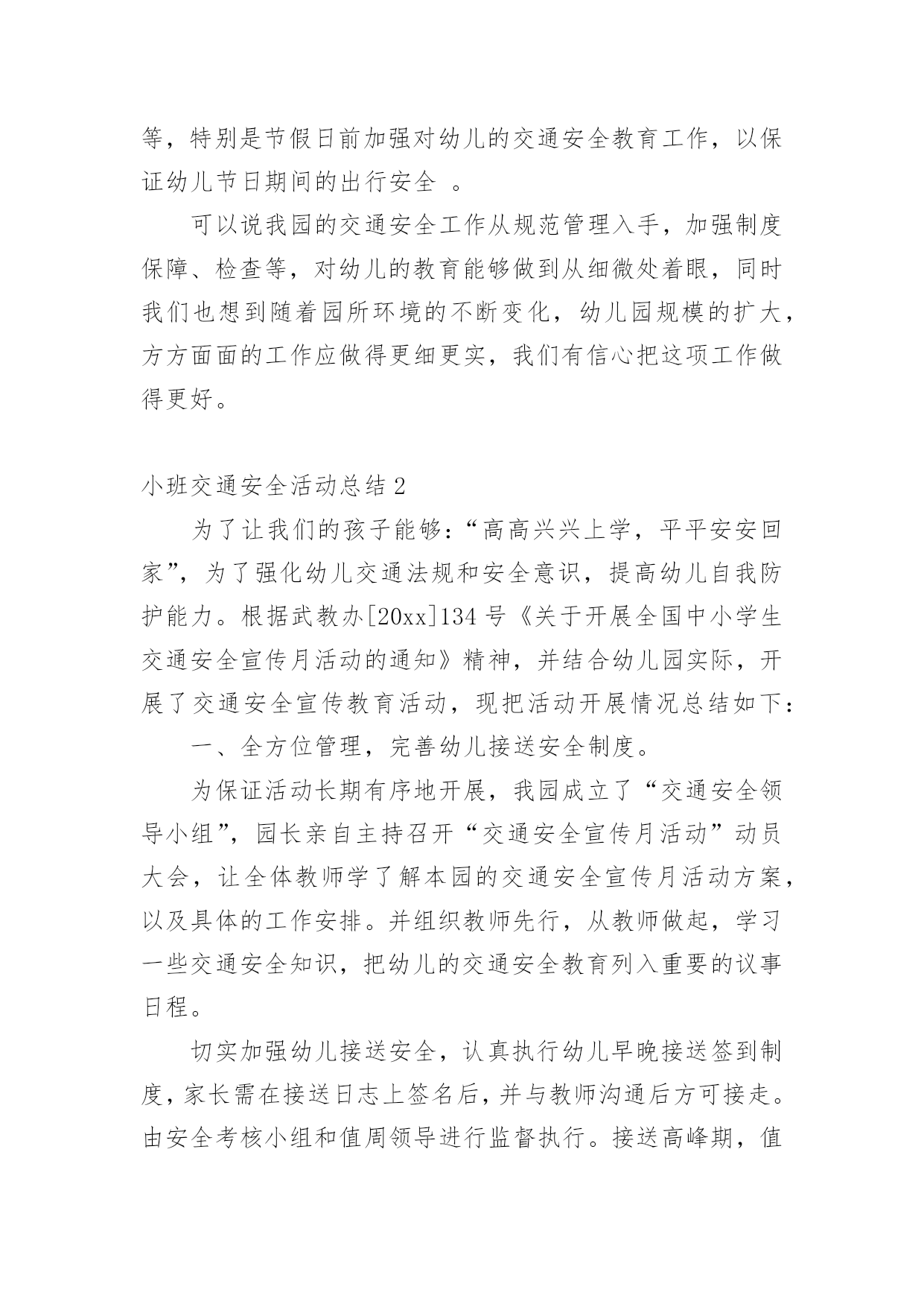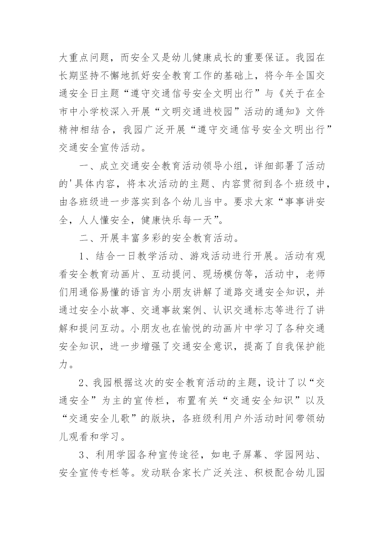 小班交通安全活动总结总结是对某一阶段的工作、学习或思想中的经验或情况进行分析研究的书面材料,它是增长才干的一种好办法,快快来写一份总结吧。但是总结有什么要求呢?下面是小编为大家收集的小班交通安全活动总结,欢迎大家借鉴与参考,希望对大家有所帮助。小班交通安全活动总结1安全第一,责任重于泰山,保证和促进幼儿的健康和安全是幼儿园的首要任务。因此,我园非常此项工作,尤其交通安全工作。为了全面贯彻落实市委关于交通安全的文件精神,我们把“交通安全”摆在幼儿园工作的重要议事日程,认真贯彻学习各级有关交通安全工作的会议精神,仔细考虑全园师生方方面面的交通安全,排查隐患,进一步规范工作,不断提高交通安全管理工作。一、领导重视,加强学习,交通安全工作常抓不懈。为把安全工作落到实处,我园成立了安全领导小组,并针对交通安全工作签定安全责任书,即:单位与主管部门签定了安全责任书;分管领导与教师签定了安全责任书;教师与家长签定了安全责任书;做到各司其职、各负其责、密切配合、齐抓共管。除此外,我们要求全体教职工自觉学习交通安全知识,通过网上看资料、案例分析、光盘等对《交通安全法》有了深入的了解。同时我们还组织教职工一起讨论,就身边发生的、听到的、幼教杂志上收集的交通安全案例进行分析,在讨论的同时,分析我园自身的实际情况,自找差距与隐患,进行整改,不断完善交通安全工作。如我们结合“离园时孩子丢失是谁的责任”的案例分析,使全体教职工明确幼儿园孩子幼小,自控能力差,任何方面、任何时间段都来不得半点疏忽,大家要防患于未然,时时具备安全意识,并且把交通安全工作必须细化到每个角落,制度必须规范到位。二、健全制度、规范管理,确保交通安全。我园的交通安全工作制度不断也在健全与完善,如:幼儿园安全保卫制度、幼儿接送制度、岗位的安全管理责任制、安全检查制等。如《幼儿园安全保卫制度》规定对师生要加强交通安全教育,教幼儿认识各种安全标志;遵守交通规则等,幼儿外出活动时必须报上级领导审批等等。《幼儿接送制度》中规定:不允许非幼儿家长到园接幼儿,如遇特殊情况必须事先说明,经带班教师确认后才能让其接走该幼儿,做到幼儿有序、安全的离园。在《教师安全管理责任制》中规定教师要加强对幼儿的安全教育,教师带班过程中负有对幼儿的监护责任,要防止幼儿的走失、走散等。我们发现离园时接送孩子后有的家长安全意识淡薄,于是通过家长会我们提醒家长遵守我园的接送制度,通过警示标志每天提醒家长在离园时注意担负起对孩子的监护责任等。管理人员则每周对责任区内进行排查、检查。根据相应的制度,将检查结果记入教师的量化考核中,从而使人人明确安全责任重于泰山,保证安全措施的时时落实。三、深入实践,细化工作,探索交通安全管理有效策略为了保证幼儿的接送安全,每天清晨与傍晚,我园分管此项工作的教师在幼儿来园、离园时督促检查,提示家长注意安全,号召教职工们做遵守交通规则的模范。校门口接送孩子时停车较多,我们指导家长将车按区域、有秩序停放,不停在校门口要道,通过在校门外设置警示标语,提醒家长在离园时监护好自己的孩子,以免孩子出现交通意外,保证出入要道的畅通。四、注重引导教育,幼儿从小树立交通安全意识。安全工作,教育为先。幼儿园的孩子年龄小,自我保护能力差,交通安全教育更要注重具体、形象,要抓细、抓实对幼儿的安全教育。我园教师根据幼儿的年龄特点由浅入深分别安排了交通安全的主题教育活动,如:小班户外游戏的安全教育,中班认识交通安全标志的主题教育等,让幼儿明确行走路时如何遵守交通规则。此外,我们还发挥家长作用,请家长带幼儿去十字路口看交警指挥交通,观察行人遵守交通规则的.情况,看一看机动车道、非机动车道上的车子,提醒幼儿走人行道,走“斑马线”——人行横道线,教幼儿会看红绿灯,使幼儿将“红灯行、绿灯停”等交通规则深植心中。五、做好对家长的宣传教育,确保幼儿节假日的安全。我园利用家长会向家长宣传交通安全工作的重要性,以及接送幼儿时注意路途中的安全、幼儿园家长接送制的要求等,特别是节假日前加强对幼儿的交通安全教育工作,以保证幼儿节日期间的出行安全。可以说我园的交通安全工作从规范管理入手,加强制度保障、检查等,对幼儿的教育能够做到从细微处着眼,同时我们也想到随着园所环境的不断变化,幼儿园规模的扩大,方方面面的工作应做得更细更实,我们有信心把这项工作做得更好。小班交通安全活动总结2为了让我们的孩子能够:“高高兴兴上学,平平安安回家”,为了强化幼儿交通法规和安全意识,提高幼儿自我防护能力。根据武教办[20xx]134号《关于开展全国中小学生交通安全宣传月活动的通知》精神,并结合幼儿园实际,开展了交通安全宣传教育活动,现把活动开展情况总结如下:一、全方位管理,完善幼儿接送安全制度。为保证活动长期有序地开展,我园成立了“交通安全领导小组”,园长亲自主持
