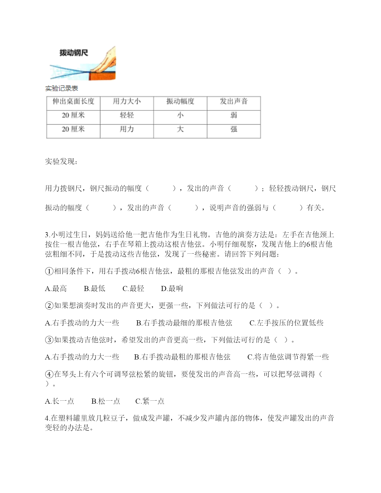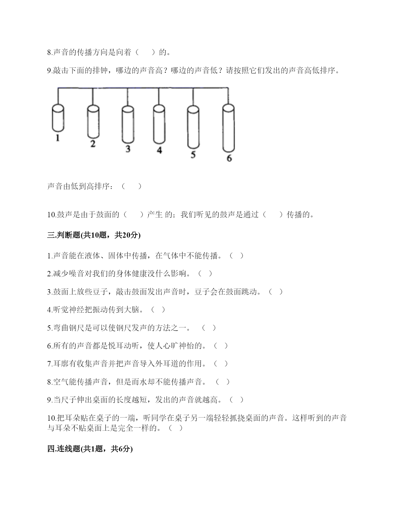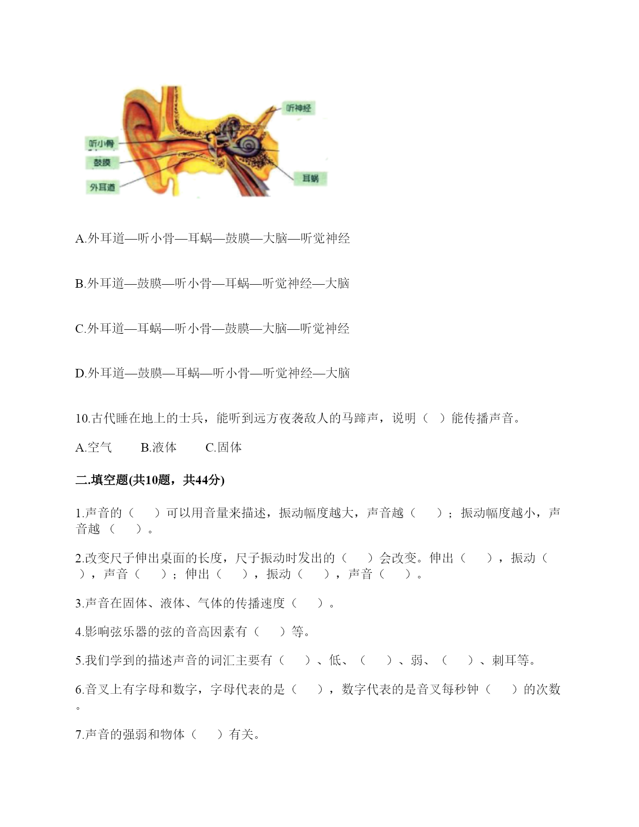 小学科学《声音》练习题一.选择题(共10题,共22分)1.声音的高低是由物体振动的()决定的。A.快慢B.幅度C.是否振动2.在弹奏吉他时,若想要使它发出的声音响一些,可以()。A.调节弦的松紧度B.用的力气大一点C.用的力气小一点3.我们耳朵里的()即使是轻微的声音,它都会产生振动。A.听小骨B.鼓膜C.耳蜗4.下列物体中,声音在()中传播的速度最快。A.钢铁B.水C.空气5.向暖水瓶中倒水时,声音会随水位的上升()。A.越来越高B.越来越低C.不会改变6.下面声音听上去能使人心情愉悦的是()。A.车辆发动机的轰鸣声B.演奏乐器的声音C.集贸市场的喧哗声7.手指轻轻接触到桌面,并在桌面上滑动一段距离,当耳贴在桌子一角上,再这样让手指滑动时,()。A.耳朵听到一样清晰的声音B.它们几乎没有声音C.贴在桌角上听得更清晰8.尺子伸出桌面的长度越长,振动的频率越(),发出的声音越()。A.高B.低C.快D.慢9.如图所示,外界声音传到大脑的路径正确的是()。A.外耳道—听小骨—耳蜗—鼓膜—大脑—听觉神经B.外耳道—鼓膜—听小骨—耳蜗—听觉神经—大脑C.外耳道—耳蜗—听小骨—鼓膜—大脑—听觉神经D.外耳道—鼓膜—耳蜗—听小骨—听觉神经—大脑10.古代睡在地上的士兵,能听到远方夜袭敌人的马蹄声,说明()能传播声音。A.空气B.液体C.固体二.填空题(共10题,共44分)1.声音的()可以用音量来描述,振动幅度越大,声音越();振动幅度越小,声音越()。2.改变尺子伸出桌面的长度,尺子振动时发出的()会改变。伸出(),振动(),声音();伸出(),振动(),声音()。3.声音在固体、液体、气体的传播速度()。4.影响弦乐器的弦的音高因素有()等。5.我们学到的描述声音的词汇主要有()、低、()、弱、()、刺耳等。6.音叉上有字母和数字,字母代表的是(),数字代表的是音叉每秒钟()的次数。7.声音的强弱和物体()有关。8.声音的传播方向是向着()的。9.敲击下面的排钟,哪边的声音高?哪边的声音低?请按照它们发出的声音高低排序。声音由低到高排序:()10.鼓声是由于鼓面的()产生的;我们听见的鼓声是通过()传播的。三.判断题(共10题,共20分)1.声音能在液体、固体中传播,在气体中不能传播。()2.减少噪音对我们的身体健康没什么影响。()3.鼓面上放些豆子,敲击鼓面发出声音时,豆子会在鼓面跳动。()4.听觉神经把振动传到大脑。()5.弯曲钢尺是可以使钢尺发声的方法之一。()6.所有的声音都是悦耳动听,使人心旷神怡的。()7.耳廓有收集声音并把声音导入外耳道的作用。()8.空气能传播声音,但是而水却不能传播声音。()9.当尺子伸出桌面的长度越短,发出的声音就越高。()10.把耳朵贴在桌子的一端,听同学在桌子另一端轻轻抓挠桌面的声音。这样听到的声音与耳朵不贴桌面上是完全一样的。()四.连线题(共1题,共6分)1.把下面器官和主要的功能用线连起来。鼓膜收集声音外耳道把声音信号传递给大脑听小骨把振动转化成声音信号听觉神经传递振动耳郭传送声波耳蜗产生振动五.填表题(共2题,共24分)1.猜想:声音强弱与物体振动幅度有关,振幅越大,声音越();物体振幅越小,声音越()。实验器材:钢尺,桌子改变的条件:()不改变的条件:()填写表格。实验结论是什么?2.完成声音强弱与振动物体的关系记录表。六.简答题(共5题,共27分)1.声音在传播的过程中借助了什么物质?2.自制小乐器分为几个步骤?依次是什么?3.用手拍桌子时,我们可以听到声音,却看不到桌子的振动,你能想一个好方法让我们感受桌子的振动吗?4.编钟上悬挂的是铜器。用木槌击打铜器。请你判断铜器发出的声音有什么不同?5.想一想,上课时坐在教室里能听到哪些声音?坐在教室里能听到的声音有?七.材料题(共3题,共20分)1.写出下图各部分的名称。2.唐朝著名诗人白居易在《琵琶行》中有“大弦嘈嘈如急雨,小弦切切如私语”的诗句。意思是粗弦嘈嘈,好像是疾风骤雨,细弦切切,好像是儿女私语。根据所学的知识,说一说弦的粗细对音高有什么影响?还有哪些因素能影响音高?3.用三个塑料袋分别装上沙子、水和空气封口,将三个塑料袋分别放在桌子上,一只耳朵轻轻地贴在塑料袋上,捂住另一只耳朵。在距离一臂远处,用铅笔上的橡皮轻轻敲击桌面。请分析隔着哪个塑料袋听到的声音效果好,并试着排序。八.综合题(共5题,共40分)1.实验设计:(1)如图所示,在桌子上固定一小块平面镜,让太阳光(或手电筒、激光笔)照射在平面镜上,经平面镜反射后,在墙壁上出现一个小光斑。(2)轻轻地敲击桌面,观察
