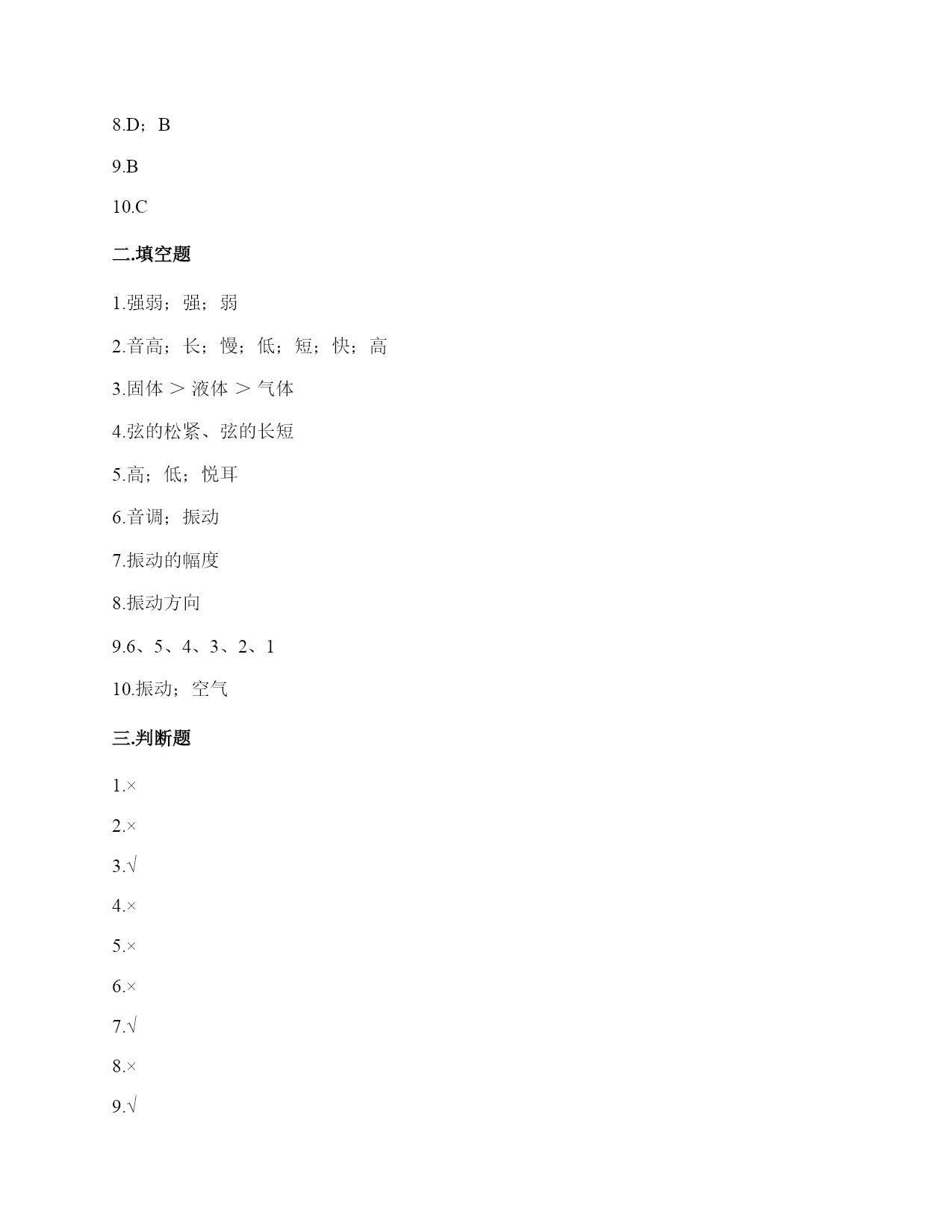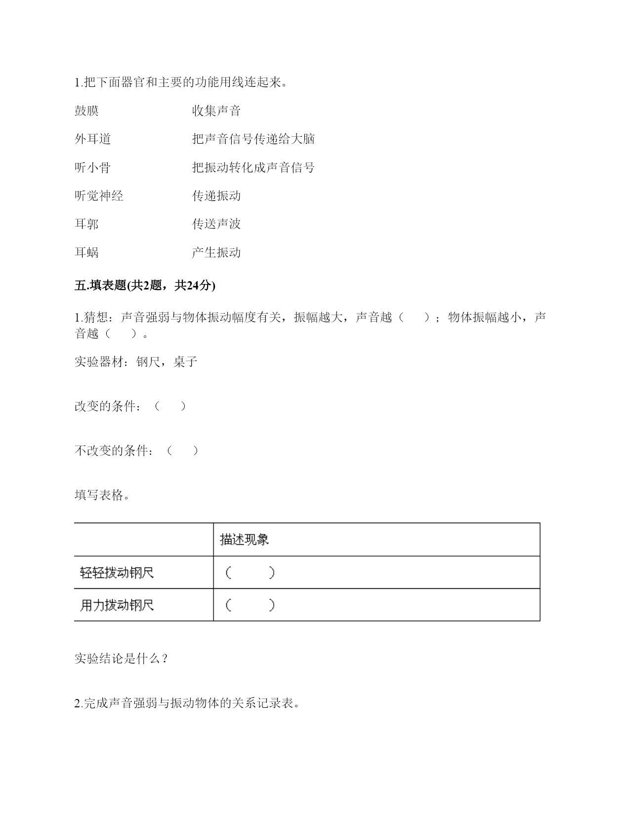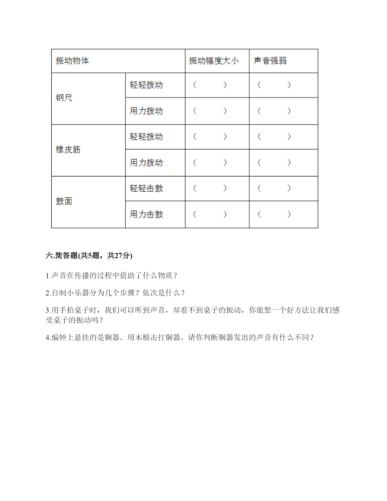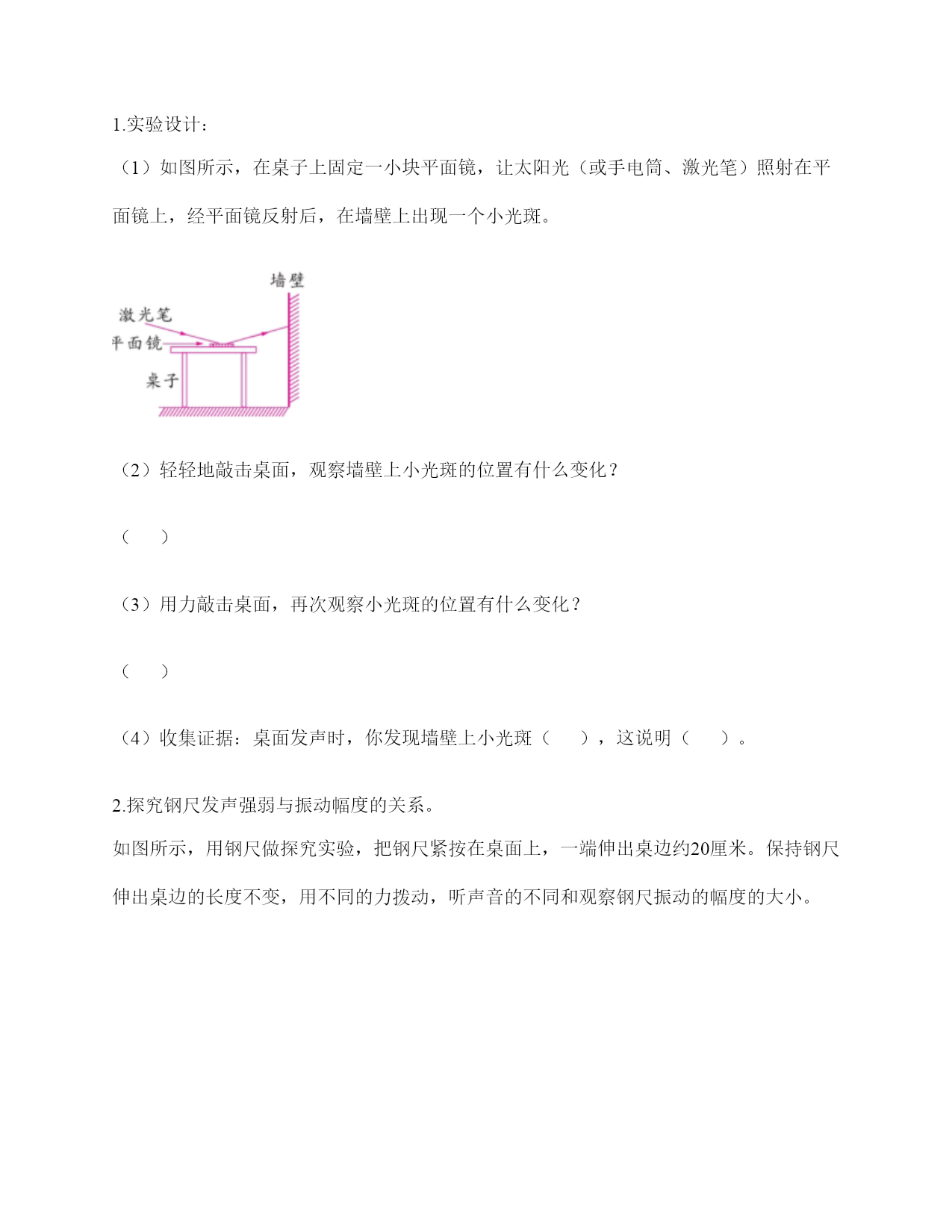 小学科学《声音》练习题一.选择题(共10题,共22分)1.声音的高低是由物体振动的()决定的。A.快慢B.幅度C.是否振动2.在弹奏吉他时,若想要使它发出的声音响一些,可以()。A.调节弦的松紧度B.用的力气大一点C.用的力气小一点3.我们耳朵里的()即使是轻微的声音,它都会产生振动。A.听小骨B.鼓膜C.耳蜗4.下列物体中,声音在()中传播的速度最快。A.钢铁B.水C.空气5.向暖水瓶中倒水时,声音会随水位的上升()。A.越来越高B.越来越低C.不会改变6.下面声音听上去能使人心情愉悦的是()。A.车辆发动机的轰鸣声B.演奏乐器的声音C.集贸市场的喧哗声7.手指轻轻接触到桌面,并在桌面上滑动一段距离,当耳贴在桌子一角上,再这样让手指滑动时,()。A.耳朵听到一样清晰的声音B.它们几乎没有声音C.贴在桌角上听得更清晰8.尺子伸出桌面的长度越长,振动的频率越(),发出的声音越()。A.高B.低C.快D.慢9.如图所示,外界声音传到大脑的路径正确的是()。A.外耳道—听小骨—耳蜗—鼓膜—大脑—听觉神经B.外耳道—鼓膜—听小骨—耳蜗—听觉神经—大脑C.外耳道—耳蜗—听小骨—鼓膜—大脑—听觉神经D.外耳道—鼓膜—耳蜗—听小骨—听觉神经—大脑10.古代睡在地上的士兵,能听到远方夜袭敌人的马蹄声,说明()能传播声音。A.空气B.液体C.固体二.填空题(共10题,共44分)1.声音的()可以用音量来描述,振动幅度越大,声音越();振动幅度越小,声音越()。2.改变尺子伸出桌面的长度,尺子振动时发出的()会改变。伸出(),振动(),声音();伸出(),振动(),声音()。3.声音在固体、液体、气体的传播速度()。4.影响弦乐器的弦的音高因素有()等。5.我们学到的描述声音的词汇主要有()、低、()、弱、()、刺耳等。6.音叉上有字母和数字,字母代表的是(),数字代表的是音叉每秒钟()的次数。7.声音的强弱和物体()有关。8.声音的传播方向是向着()的。9.敲击下面的排钟,哪边的声音高?哪边的声音低?请按照它们发出的声音高低排序。声音由低到高排序:()10.鼓声是由于鼓面的()产生的;我们听见的鼓声是通过()传播的。三.判断题(共10题,共20分)1.声音能在液体、固体中传播,在气体中不能传播。()2.减少噪音对我们的身体健康没什么影响。()3.鼓面上放些豆子,敲击鼓面发出声音时,豆子会在鼓面跳动。()4.听觉神经把振动传到大脑。()5.弯曲钢尺是可以使钢尺发声的方法之一。()6.所有的声音都是悦耳动听,使人心旷神怡的。()7.耳廓有收集声音并把声音导入外耳道的作用。()8.空气能传播声音,但是而水却不能传播声音。()9.当尺子伸出桌面的长度越短,发出的声音就越高。()10.把耳朵贴在桌子的一端,听同学在桌子另一端轻轻抓挠桌面的声音。这样听到的声音与耳朵不贴桌面上是完全一样的。()四.连线题(共1题,共6分)1.把下面器官和主要的功能用线连起来。鼓膜收集声音外耳道把声音信号传递给大脑听小骨把振动转化成声音信号听觉神经传递振动耳郭传送声波耳蜗产生振动五.填表题(共2题,共24分)1.猜想:声音强弱与物体振动幅度有关,振幅越大,声音越();物体振幅越小,声音越()。实验器材:钢尺,桌子改变的条件:()不改变的条件:()填写表格。实验结论是什么?2.完成声音强弱与振动物体的关系记录表。六.简答题(共5题,共27分)1.声音在传播的过程中借助了什么物质?2.自制小乐器分为几个步骤?依次是什么?3.用手拍桌子时,我们可以听到声音,却看不到桌子的振动,你能想一个好方法让我们感受桌子的振动吗?4.编钟上悬挂的是铜器。用木槌击打铜器。请你判断铜器发出的声音有什么不同?5.想一想,上课时坐在教室里能听到哪些声音?坐在教室里能听到的声音有?七.材料题(共3题,共20分)1.写出下图各部分的名称。2.唐朝著名诗人白居易在《琵琶行》中有“大弦嘈嘈如急雨,小弦切切如私语”的诗句。意思是粗弦嘈嘈,好像是疾风骤雨,细弦切切,好像是儿女私语。根据所学的知识,说一说弦的粗细对音高有什么影响?还有哪些因素能影响音高?3.用三个塑料袋分别装上沙子、水和空气封口,将三个塑料袋分别放在桌子上,一只耳朵轻轻地贴在塑料袋上,捂住另一只耳朵。在距离一臂远处,用铅笔上的橡皮轻轻敲击桌面。请分析隔着哪个塑料袋听到的声音效果好,并试着排序。八.综合题(共5题,共40分)1.实验设计:(1)如图所示,在桌子上固定一小块平面镜,让太阳光(或手电筒、激光笔)照射在平面镜上,经平面镜反射后,在墙壁上出现一个小光斑。(2)轻轻地敲击桌面,观察