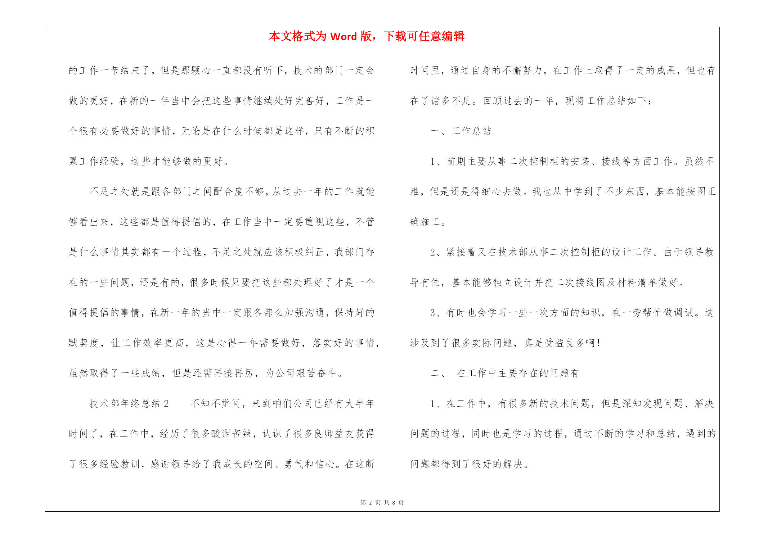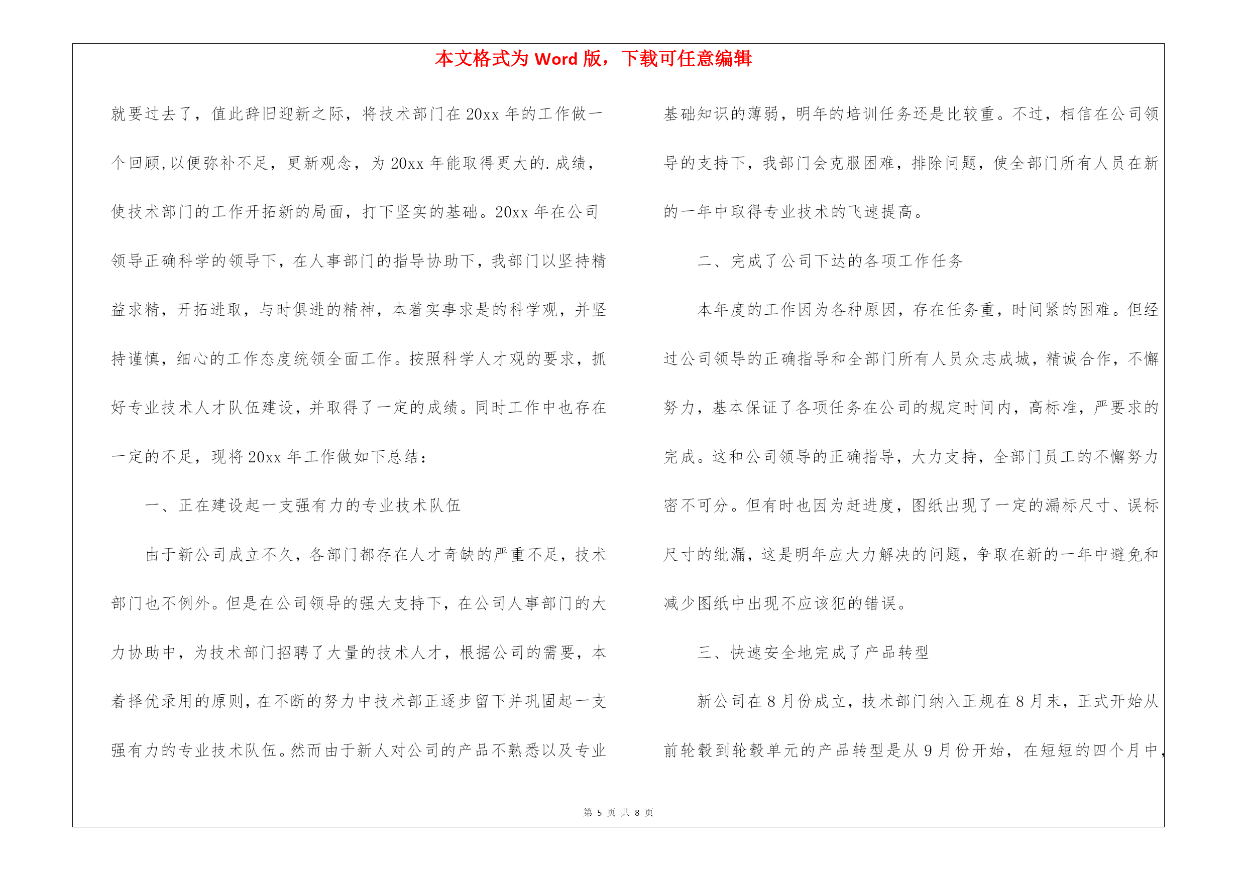 本文格式为Word版,下载可任意编辑第PAGE\*MERGEFORMAT8页共NUMPAGES\*MERGEFORMAT8页2021技术部年终总结(通用5篇)2021技术部年终总结(通用5篇)日子如同白驹过隙,不经意间,一年的工作即将收尾,回顾过去一年的工作,一定有很多需要梳理的事情,不能光会埋头苦干哦,写一份年终总结,为来年工作做准备吧!想必许多人都在为如何写好年终总结而烦恼吧,以下是我为大家整理的2021技术部年终总结(通用5篇),欢迎阅读与收藏。技术部年终总结1一年来的工作结束了,感激这一年来遇到的所有事情,我部门在过去一年来的工作当中也是取得去不错的成绩我感激公司给我们部门的机会,过去的一年到处都是充满着挑战,我感觉有很多事情都应该要保持好的态度才是,在工作当中不断的积累工作经验,把细节的事情处理好,这些都有必要的,我们技术部门的工作的非常的忙,这一点让所有人都有在认真的踏实的做好的相关的工作,过去的一年虽然已经结束了,但是在工作当中应该时刻保持着好端正的态度,我部门依然是整装待发,就过去一年的工作也来总结一下。首先我们严格执行公司的各项规定,不违反的工作制度,按照上级的指示做好每一件事情,技术部门虽然日常的工作很多但是我们每一个人都对自己的工作很上心,这一点是没有任何质疑的,虽然一年的工作结束,但是那颗积极的心态一直都没有舍弃,在工作上面我知道大家都是非常用心的,我也一直都在努力着,做好本职的事情,踏踏实实的去工作,在工作当中不走捷径,技术工作的是需要时间思考的,这一年来大家都非常的努力,我也相信大家会在下一阶段的工作当中做到更好,这是一定的。回顾一年来的工作技术部门都是矜矜业业,做好自己的本职工作,不敢忘记了自己的职责所在,现在包括未来都是这样,在工作面前需要有一个好的习惯,这是我们每一个员工应该去想的事情,虽然一年的工作一节结束了,但是那颗心一直都没有听下,技术的部门一定会做的更好,在新的一年当中会把这些事情继续处好完善好,工作是一个很有必要做好的事情,无论是在什么时候都是这样,只有不断的积累工作经验,这些才能够做的更好。不足之处就是跟各部门之间配合度不够,从过去一年的工作就能够看出来,这些都是值得提倡的,在工作当中一定要重视这些,不管是什么事情其实都有一个过程,不足之处就应该积极纠正,我部门存在的一些问题,还是有的,很多时候只要把这些都处理好了才是一个值得提倡的事情,在新一年的当中一定跟各部么加强沟通,保持好的默契度,让工作效率更高,这是心得一年需要做好,落实好的事情,虽然取得了一些成绩,但是还需再接再厉,为公司艰苦奋斗。技术部年终总结2不知不觉间,来到咱们公司已经有大半年时间了,在工作中,经历了很多酸甜苦辣,认识了很多良师益友获得了很多经验教训,感谢领导给了我成长的空间、勇气和信心。在这断时间里,通过自身的不懈努力,在工作上取得了一定的成果,但也存在了诸多不足。回顾过去的一年,现将工作总结如下:一、工作总结1、前期主要从事二次控制柜的安装、接线等方面工作。虽然不难,但是还是得细心去做。我也从中学到了不少东西,基本能按图正确施工。2、紧接着又在技术部从事二次控制柜的设计工作。由于领导教导有佳,基本能够独立设计并把二次接线图及材料清单做好。3、有时也会学习一些一次方面的知识,在一旁帮忙做调试。这涉及到了很多实际问题,真是受益良多啊!二、在工作中主要存在的问题有1、在工作中,有很多新的技术问题,但是深知发现问题、解决问题的过程,同时也是学习的过程,通过不断的学习和总结,遇到的问题都得到了很好的解决。2、有时候对工作认识不够,缺乏全局观念。不过我相信,在以后的工作中,我会不断的学习和思考,把工作做到多、快、好省。三、工作心得工作的每一步都要精准细致,力求精细化,在这种心态的指导下,我在平时工作中取得了令自己满意的成绩。能够积极自信的行动起来是这段时间我在心态方面最大的进步现在的我经常冷静的分析自己,认清自己的位置,问问自己付出了多少;时刻记得工作内容要精细化精确化,个人得失要模糊计算。在工作中,经过实际的教训,深刻理解了时间的滞延是对公司很大的伤害,这就需要我们在工作前,一定要对技术流程很了解,在工作之前,多辛苦一下,减少因为自己对工作流程不能很好的表达的原因,耽误公司的生产。四、工作教训经过这段时间的工作学习,我也发现了自己离一个职业化的人才还有差距,主要体现在工作技能、工作习惯和工作思维的不成熟,也是我以后要在工作中不断磨练和提高自己的地方。仔细总结一下,自己在大半年的工作中主要有以下方面做得不够好。在工作时间很仓促的情况下,事情多了,就一定要有详实而主次分明的计划,哪些需要立即完成,哪些可以缓缓加班完成,今年在计划上自己进步很大,但在这方面还有很大的优化空间。技术部年终总结3新的一年已经开始
