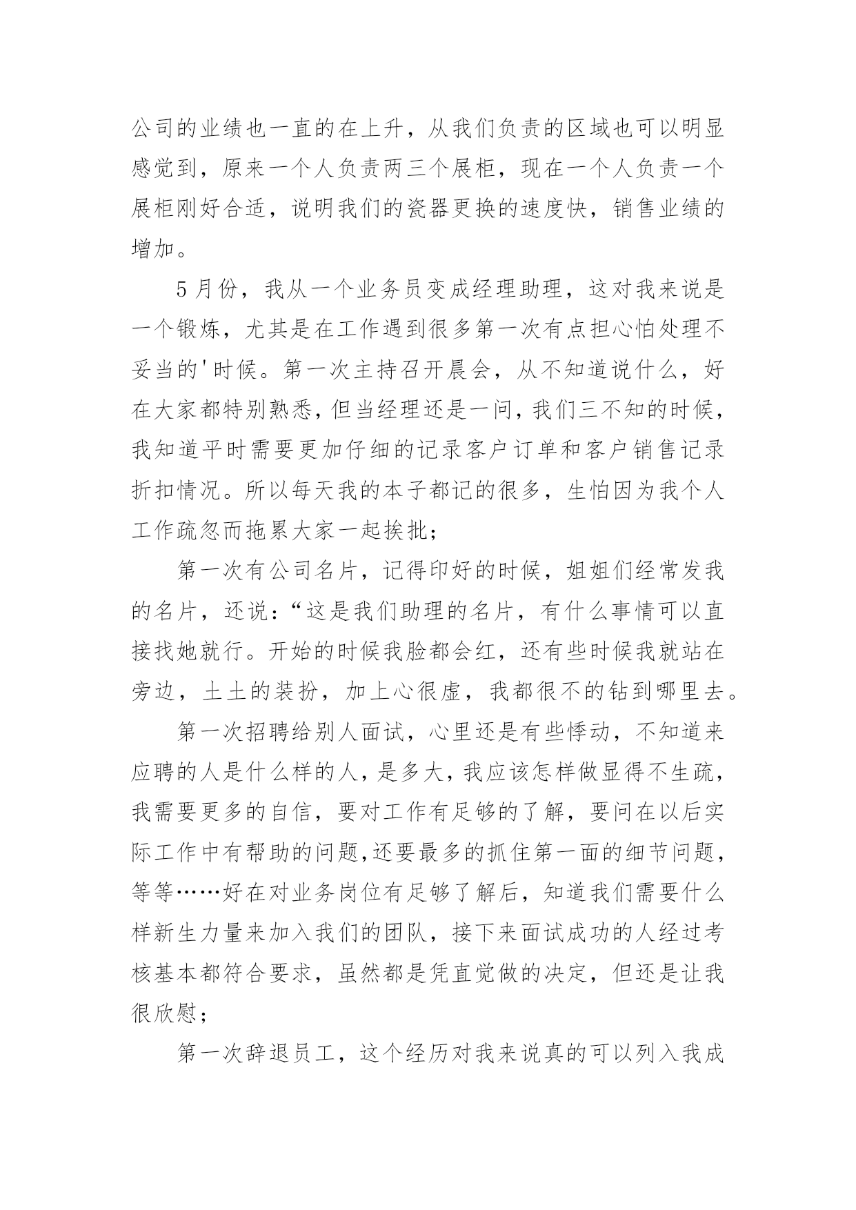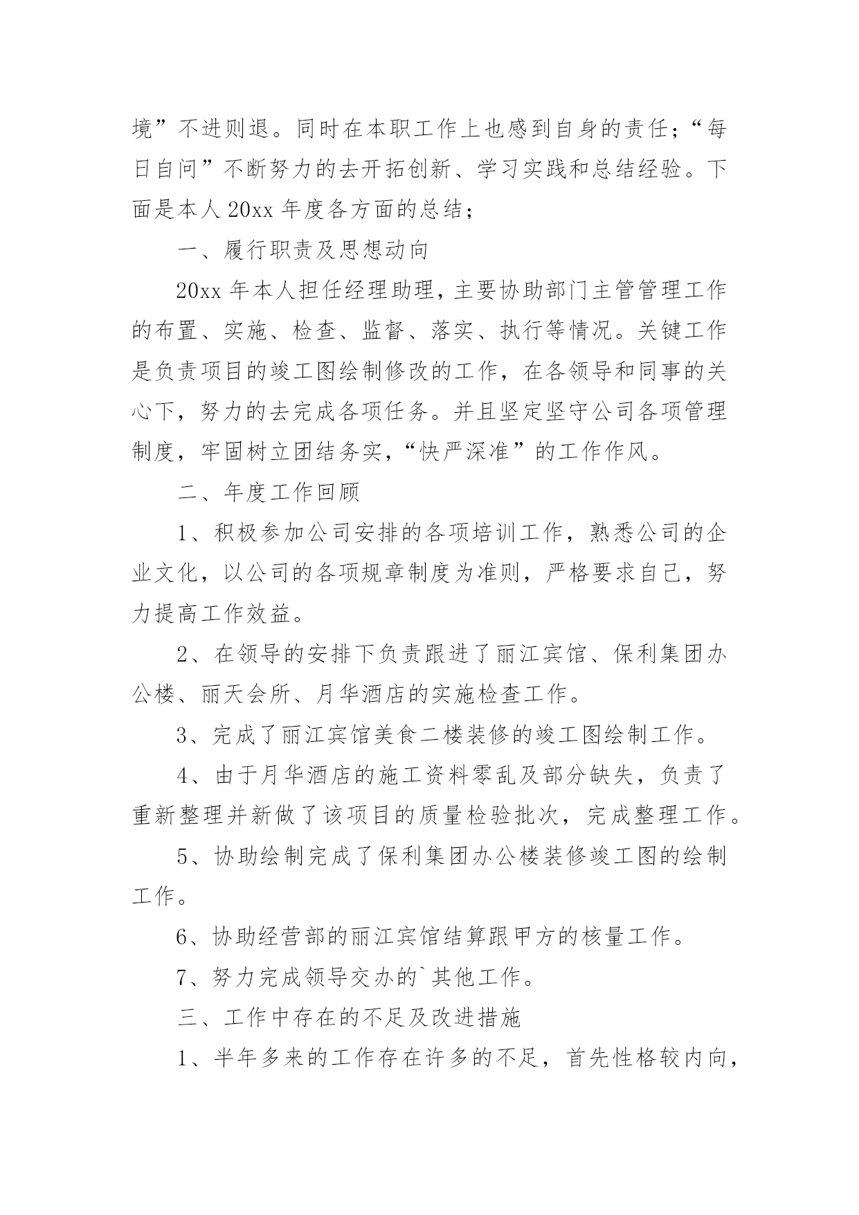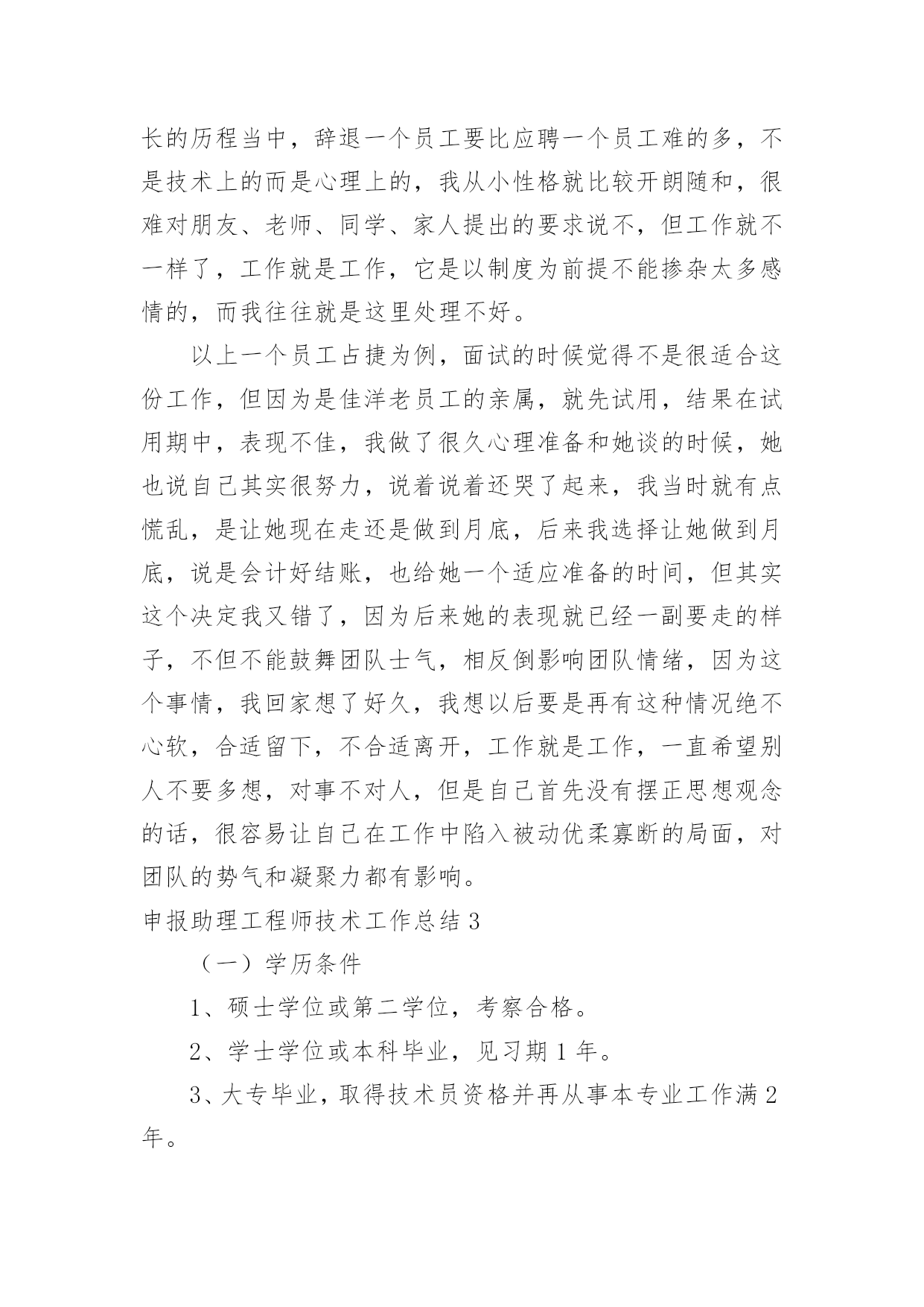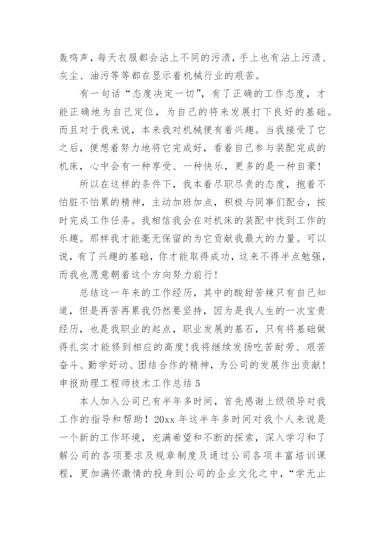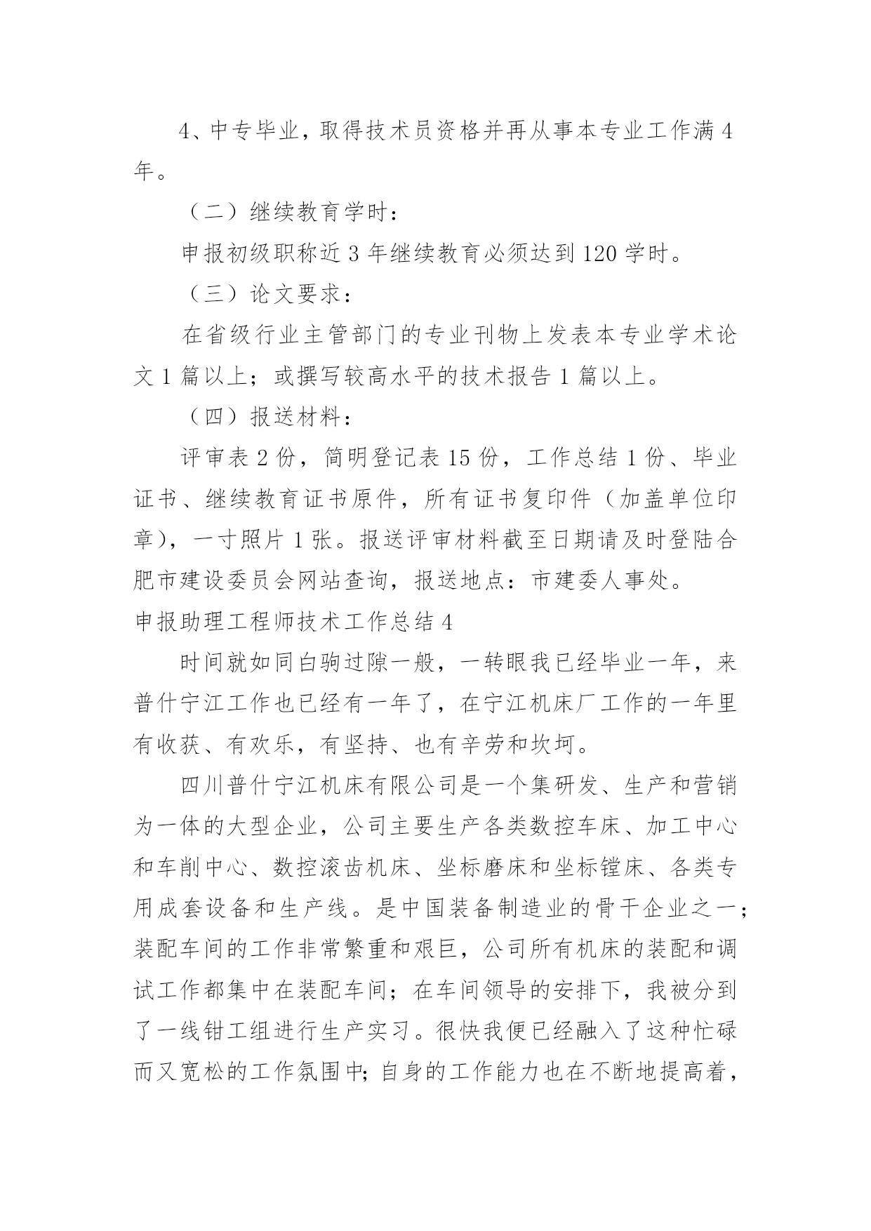申报助理工程师技术工作总结申报助理工程师技术工作总结11篇总结是事后对某一阶段的学习或工作情况作加以回顾检查并分析评价的书面材料,它是增长才干的一种好办法,快快来写一份总结吧。总结怎么写才能发挥它的作用呢?以下是小编整理的申报助理工程师技术工作总结,欢迎大家借鉴与参考,希望对大家有所帮助。申报助理工程师技术工作总结1时不我待,转眼就毕业一年了,回首过去一年,从找工作到现在要感谢的人很多,有很多收获,也有很多遗憾,"往者不可谏,来者犹可追",对收获还是得感谢那些有声和无声的老师,对遗憾只能在今后的工作中进一步学习,争取做到智明而行无过。下面是在去年一年经历两个工地的一些体会:毕业后第一个工地是昆明市第八污水处理厂,从20xx年7月23日开工到20xx年12月28日通水剪裁,是列入国家五年规划的国家重点项目,滇池治理的工程之一,该工程日处理量10万吨,采用AAO工艺,工程主要包括桩长螺旋钻空灌注桩基础,深4.5~5米基坑开挖,主体土建施工,设备安装,绿化种植,试通车。作为毕业后第一个工程,很幸运能跟一个实战经验丰富,协调能力很强,真心体谅我们下属的"老师"。污水处理厂作为水工工程之一,标高控制,抗渗防漏是该工程的`重点和难点,特别是伸缩缝位置的橡胶止水带的施工,因为在施工缝位置只有一条橡胶止水带,是盛水构筑物的薄弱点。对此,监理部根据事前预控的原则,通过发监理工作联系单和对施工单位工程部进行技术交底方式,提高施工单位对该部位的重视,在施工过程中通过巡视,旁站及时纠正不规范的止水带安装,在工序报验时重点检查伸缩缝位置,在混凝土浇筑时通过旁站措施控制伸缩缝位置的混凝土浇筑质量。因为工程地处滇池旁边,基底标高地层主要是粉砂层,在钢管预埋施工时,因工作面窄,粉砂层泡水导致基底承载力降低,给管道基底硬化带来难度,开挖面窄也给基坑安全带来隐患,对此,采取开挖短,快的策略,频,基坑开挖后及时进行基底处理和管道吊装安装,基坑两侧采用钢板桩加固保证安全。因为厂区工作面安排紧凑,平行,交叉施工同步进行,施工单位众多,工序间的干扰非常大,施工单位之间的资源争夺纠纷大,为此监理部组织土建,设备安装,绿化施工单位开会,根据实际进度错开各施工单位的施工位置,集中力量优先解决影响施工便道的施工,要求绿化施工单位待平面布置施工完后再进场施工。在各参建单位协同努力下,昆明市第八污水处理厂在157天就完工试通水。第二个工地也是滇池治理项目之一的昆明市滇池环湖南岸截污干渠施工,开工日期为20xx年11月至今,工程拟投资4。7亿,主体为规格3xx3m与1xx3m的雨污分流箱涵,全长8公里,是BT融资形式,参建方达9家,分别有产权业主,建设期业主,项目管理公司,投资监理,工程监理,四家施工单位。因为参建单位众多,特别是受金融危机冲击,BT方融资受阻的情况下抢工期,参建各方矛盾突出,给监理的协调工作带来极大的挑战。施工技术难点为主要是深基坑的开挖和支护,局部基坑深度达到9米,对此基坑安全成为工作重点之一,基坑支护分为钻孔灌注桩和拉森钢板桩形式,在业主聘请第三方基坑监测情况下,结合第三方检测结果,在现场及时处理变形较大的位置,每日巡视基坑变形情况。经历这两个工程,了解到监理工作实际很大部分在现场,内业和协调上,项目监理部不是施工单位的技术部,程序管理是监理工作重点之一,要管理好一个项目首要工作是管理好施工单位的几个带头人,要以理服人和以德服人,给业主提供优质服务的同时也要帮助最需要帮助的施工单位,把工程作为自己的工程来管。申报助理工程师技术工作总结2进佳洋公司已经有一年多了。虽然有时候做的比较累,但是我觉得生活得特别充实,更重要的是,对经商之道,生产管理和生产流程也有了很深的了解。回首在佳洋工作的这一年,无论是公司还是我自己,感觉变化真的是特别大。还记得20xx年12月份我来公司的时候,业务员里大学生只有小唐、邓皓和我,现在80%都是大学毕业生,这说明公司注重员工素质培养,我们对公司的前景未来抱有希望。公司的业绩也一直的在上升,从我们负责的区域也可以明显感觉到,原来一个人负责两三个展柜,现在一个人负责一个展柜刚好合适,说明我们的瓷器更换的速度快,销售业绩的增加。5月份,我从一个业务员变成经理助理,这对我来说是一个锻炼,尤其是在工作遇到很多第一次有点担心怕处理不妥当的'时候。第一次主持召开晨会,从不知道说什么,好在大家都特别熟悉,但当经理还是一问,我们三不知的时候,我知道平时需要更加仔细的记录客户订单和客户销售记录折扣情况。所以每天我的本子都记的很多,生怕因为我个人工作疏忽而拖累大家一起挨批;第一次有公司名片,记得印好的时候,姐姐们经常发我的名片,还说:“这是我们助理的名片,有什么事情可以直接找她就行。开始的时候我脸都会红,还有些时候我就站在旁边,土土的装扮,加上心很虚,我