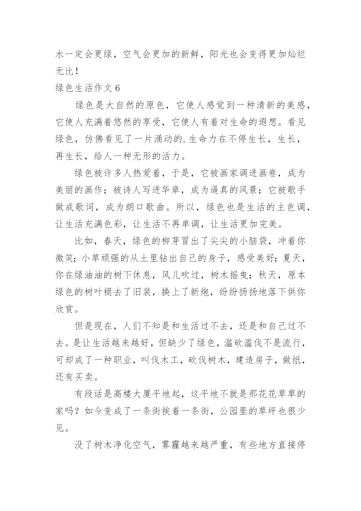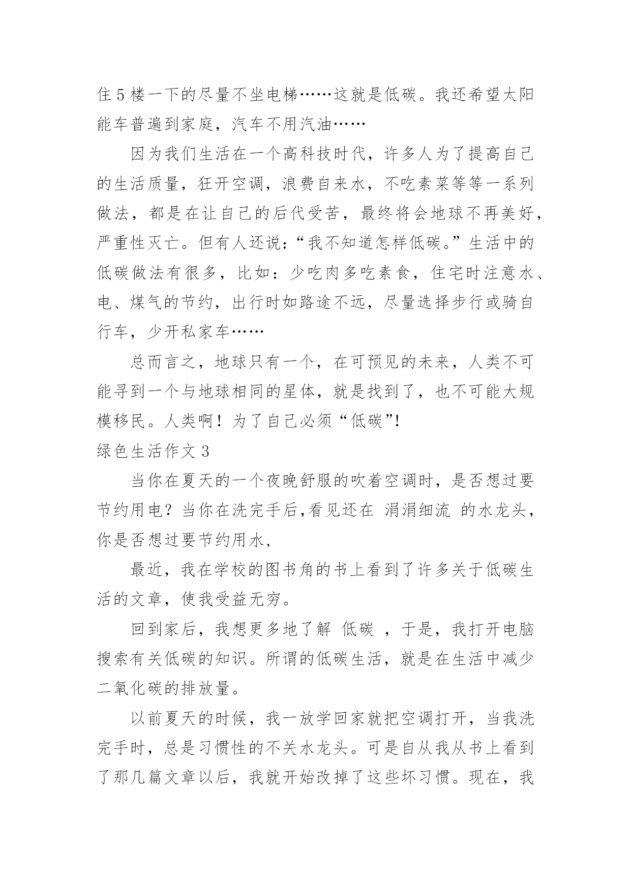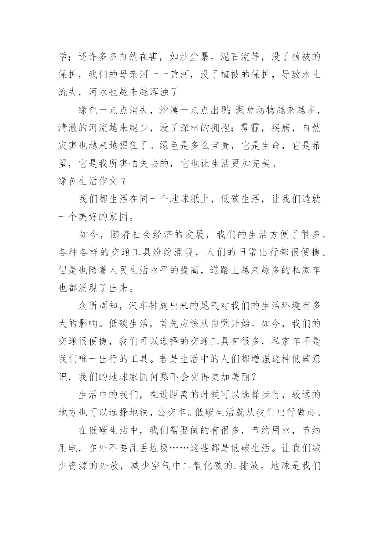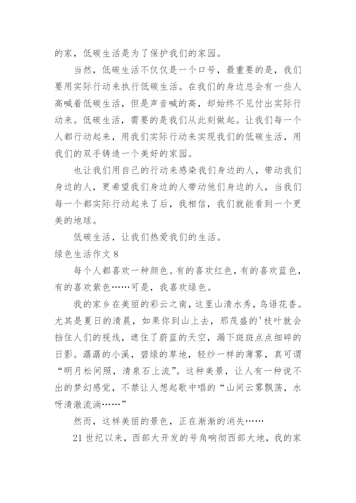绿色生活作文绿色生活作文(集锦15篇)在平凡的学习、工作、生活中,大家都经常接触到作文吧,通过作文可以把我们那些零零散散的思想,聚集在一块。怎么写作文才能避免踩雷呢?下面是小编精心整理的绿色生活作文,供大家参考借鉴,希望可以帮助到有需要的朋友。绿色生活作文1绿色代表着活力,象征着生命力。这种“绿色”正是自然界、一个民族乃至个人所应具备的。说到绿色,大家想到的一定是森林或草原充满绿色的地方。但现在不是了,由于过分的砍伐,导致很多地方没有树的“保护”常常“惹来”沙尘暴、泥石流……此时然我想起了《大话西游》里的唐僧,当孙悟空把“月光宝盒”扔在一边,想要跟观音姐姐决斗时,唐僧赶忙叫孙悟空不要乱扔它,以免伤到花花草草……你看在那情况危急,就要发生一场格斗时,唐僧仍不忘徒弟要保护好花草。这难道不能引起破坏植被者的反思吗?这难道不能引起环境局的重视吗?个人需要“绿色”,国家也需要“绿色”,这“绿色”就是代表着一个国家生命力。如果国家没有这种“绿色”,那将是无法面对的现实,回顾中国近现代史,那便是中国缺乏这种“绿色”的历史,以至于受尽帝国主义的'压迫和剥削。很长一段时间中国似乎都没有展现出自己所应拥有的“绿色”。于是中国便得到了“东亚病夫”这块招牌。可见这种“绿色”,对于一个国家的生存和发展是何等的重要。绿色是何等的重要,国家可以因为绿色而成功,国家也可以因为绿色而受其它国家的压迫和剥削。所以请你们要保护环境,让我们祖国成为一个绿色的家园,从而甩掉“东亚病夫”的这块耻辱的招牌,让咱们的子孙走出国门时,不会被其它的国家笑话为“这个人的国家没有一点绿色,跟没有生机似的。”吧!绿色生活作文2人人都知道,我们共同有一个家园——地球。地球是我们人类赖以生存的地方,而现在地球的现状,真是令人担忧。我通过相关资料知道:回收24万吨废铁,可以再建36座埃菲尔铁塔,回收6000吨废铝,可以生产74架空中飞机,回收120万吨玻璃,可建造254个罗浮宫金字塔。这个数字大的惊人吧!那么请你想一想,你浪费了多少资源和可利用的废品啊!或许有人认为,即使自己十分注意“节约”“低碳”,可以挡不住一些工矿、化学企业的违规排放,所以自己就不注意了。我的`朋友还说:“你在节约,在低碳,可是还跟不上工厂违规排放呢!没事找事。”但是我现在要告诉他的是如果全世界每人都低碳就能让地球美化。如果有关部门对这些工厂进行处理,那问题不是全都解决了!其实,我们也并不是不开汽车,不住高楼,不享受空调。只是在生活中少用一个塑料袋,少个用一双一次性木筷,家住5楼一下的尽量不坐电梯……这就是低碳。我还希望太阳能车普遍到家庭,汽车不用汽油……因为我们生活在一个高科技时代,许多人为了提高自己的生活质量,狂开空调,浪费自来水,不吃素菜等等一系列做法,都是在让自己的后代受苦,最终将会地球不再美好,严重性灭亡。但有人还说:“我不知道怎样低碳。”生活中的低碳做法有很多,比如:少吃肉多吃素食,住宅时注意水、电、煤气的节约,出行时如路途不远,尽量选择步行或骑自行车,少开私家车……总而言之,地球只有一个,在可预见的未来,人类不可能寻到一个与地球相同的星体,就是找到了,也不可能大规模移民。人类啊!为了自己必须“低碳”!绿色生活作文3当你在夏天的一个夜晚舒服的吹着空调时,是否想过要节约用电?当你在洗完手后,看见还在涓涓细流的水龙头,你是否想过要节约用水,最近,我在学校的图书角的书上看到了许多关于低碳生活的文章,使我受益无穷。回到家后,我想更多地了解低碳,于是,我打开电脑搜索有关低碳的知识。所谓的低碳生活,就是在生活中减少二氧化碳的排放量。以前夏天的时候,我一放学回家就把空调打开,当我洗完手时,总是习惯性的不关水龙头。可是自从我从书上看到了那几篇文章以后,我就开始改掉了这些坏习惯。现在,我热的时候都用电风扇代替空调,当我洗完手时,都随手关掉了水龙头,水龙头被我拧得紧紧的,生怕会有一滴水从里面漏出来。有一次,我妈妈去菜市场买菜,而我家离菜市场有点远,但她从来都不开车去。当她回来后,我奇怪地问她:妈妈,你为什么不开车去?又快又方便!她笑着对我说:走路有益身心嘛!而且减少废气排放了!我现在知道,原来我的妈妈非常地低碳。关于低碳还不止这些。还有很多,比如:尽量避免使用一次性塑料袋、纸盒、筷子等;少乘坐电梯,多爬楼梯,又省电又锻炼身体我的爸爸以前喜欢抽烟,但他自从知道了每天少抽一根烟,可以降低二氧化碳的'排放时,他就开始戒烟了,他每次看到别人抽烟时,总会笑着说:吸烟有害健康,还会升高二氧化碳的排放量呢!我觉得这一点爸爸做的非常好。现在的生活环境越来越糟,周围的空气越来越不新鲜。难道你们忍心生活在这样的环境下吗?所以,让我们倡导低碳生活,呵护绿色家园吧!绿色生活作文4近年来,一系列自然灾害频频发生,这不得不引起我们的注意20xx年底,