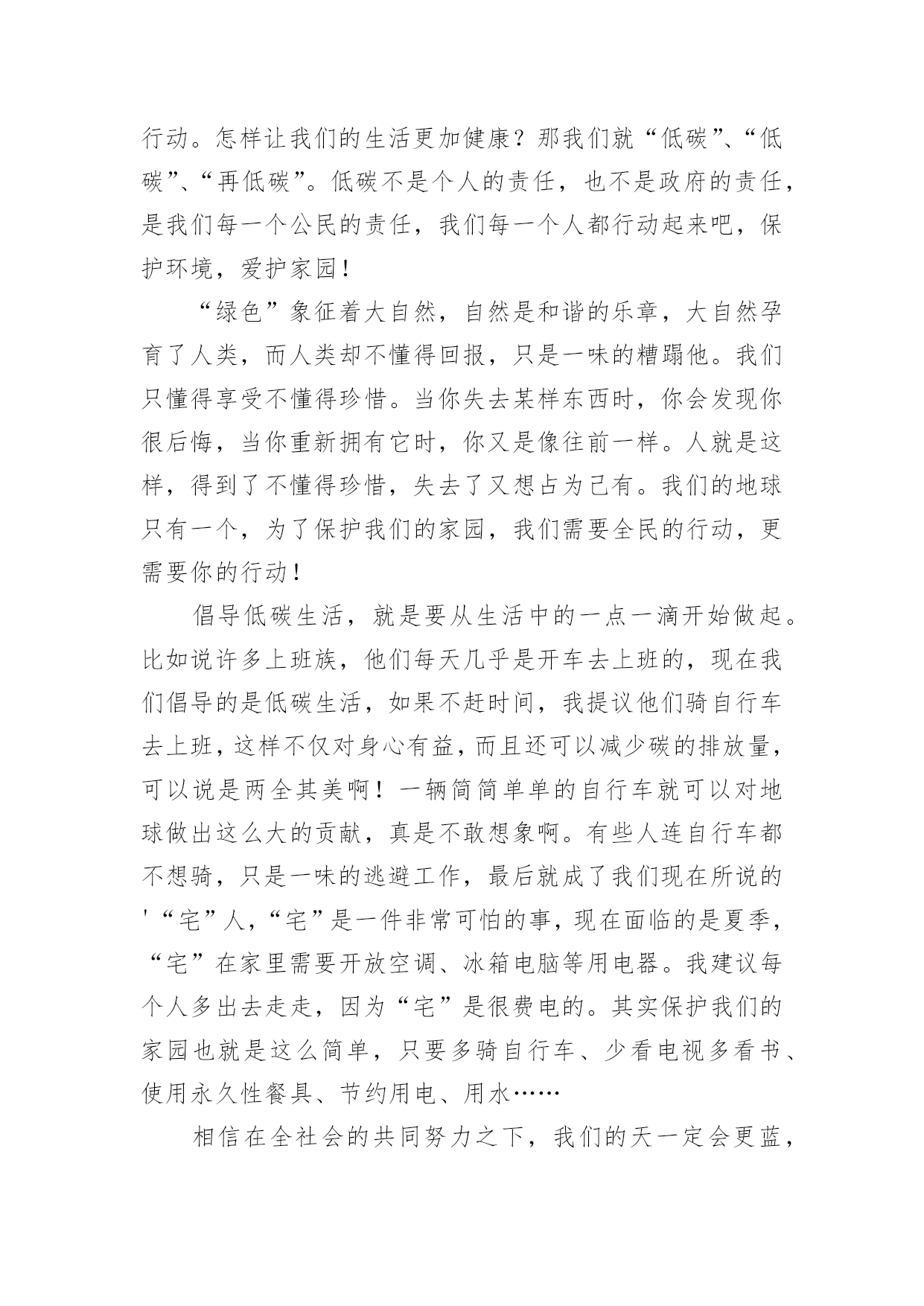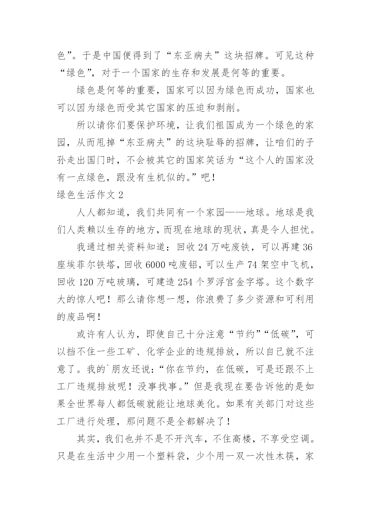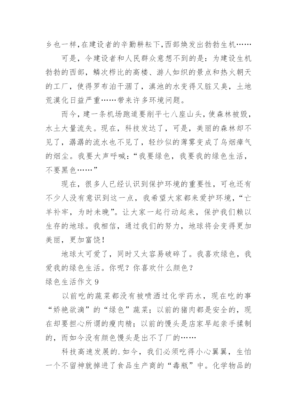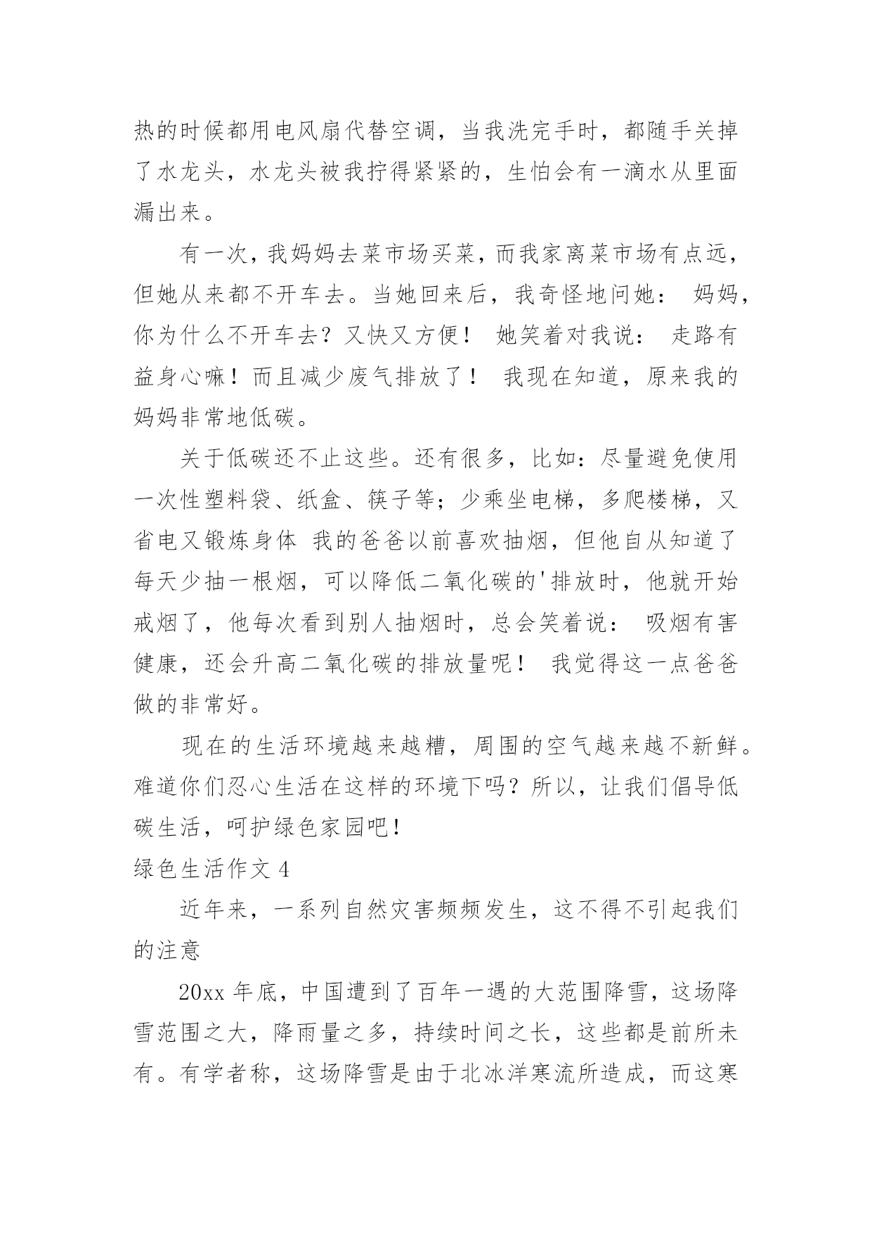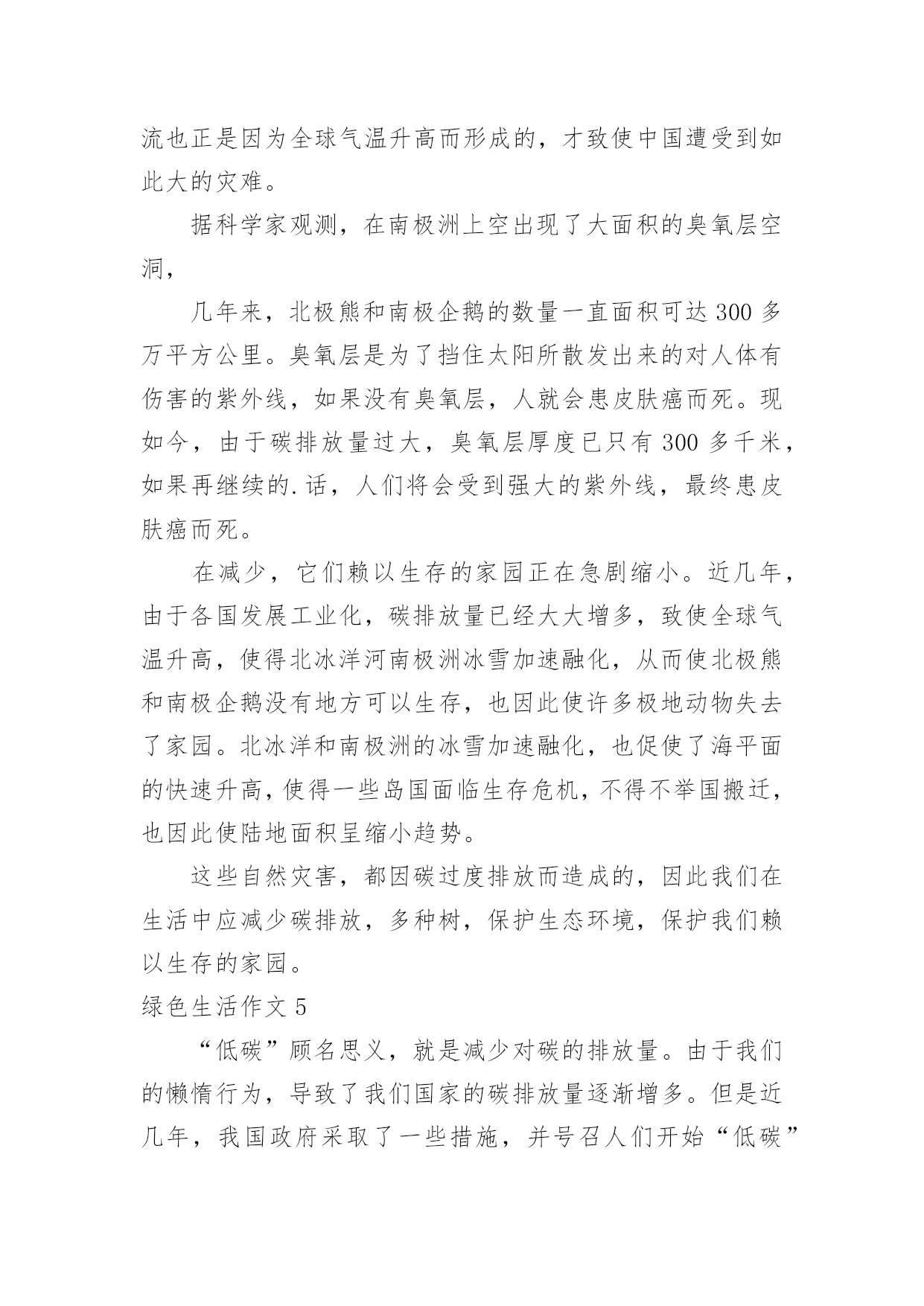 绿色生活作文绿色生活作文(集锦15篇)在平凡的学习、工作、生活中,大家都经常接触到作文吧,通过作文可以把我们那些零零散散的思想,聚集在一块。怎么写作文才能避免踩雷呢?下面是小编精心整理的绿色生活作文,供大家参考借鉴,希望可以帮助到有需要的朋友。绿色生活作文1绿色代表着活力,象征着生命力。这种“绿色”正是自然界、一个民族乃至个人所应具备的。说到绿色,大家想到的一定是森林或草原充满绿色的地方。但现在不是了,由于过分的砍伐,导致很多地方没有树的“保护”常常“惹来”沙尘暴、泥石流……此时然我想起了《大话西游》里的唐僧,当孙悟空把“月光宝盒”扔在一边,想要跟观音姐姐决斗时,唐僧赶忙叫孙悟空不要乱扔它,以免伤到花花草草……你看在那情况危急,就要发生一场格斗时,唐僧仍不忘徒弟要保护好花草。这难道不能引起破坏植被者的反思吗?这难道不能引起环境局的重视吗?个人需要“绿色”,国家也需要“绿色”,这“绿色”就是代表着一个国家生命力。如果国家没有这种“绿色”,那将是无法面对的现实,回顾中国近现代史,那便是中国缺乏这种“绿色”的历史,以至于受尽帝国主义的'压迫和剥削。很长一段时间中国似乎都没有展现出自己所应拥有的“绿色”。于是中国便得到了“东亚病夫”这块招牌。可见这种“绿色”,对于一个国家的生存和发展是何等的重要。绿色是何等的重要,国家可以因为绿色而成功,国家也可以因为绿色而受其它国家的压迫和剥削。所以请你们要保护环境,让我们祖国成为一个绿色的家园,从而甩掉“东亚病夫”的这块耻辱的招牌,让咱们的子孙走出国门时,不会被其它的国家笑话为“这个人的国家没有一点绿色,跟没有生机似的。”吧!绿色生活作文2人人都知道,我们共同有一个家园——地球。地球是我们人类赖以生存的地方,而现在地球的现状,真是令人担忧。我通过相关资料知道:回收24万吨废铁,可以再建36座埃菲尔铁塔,回收6000吨废铝,可以生产74架空中飞机,回收120万吨玻璃,可建造254个罗浮宫金字塔。这个数字大的惊人吧!那么请你想一想,你浪费了多少资源和可利用的废品啊!或许有人认为,即使自己十分注意“节约”“低碳”,可以挡不住一些工矿、化学企业的违规排放,所以自己就不注意了。我的`朋友还说:“你在节约,在低碳,可是还跟不上工厂违规排放呢!没事找事。”但是我现在要告诉他的是如果全世界每人都低碳就能让地球美化。如果有关部门对这些工厂进行处理,那问题不是全都解决了!其实,我们也并不是不开汽车,不住高楼,不享受空调。只是在生活中少用一个塑料袋,少个用一双一次性木筷,家住5楼一下的尽量不坐电梯……这就是低碳。我还希望太阳能车普遍到家庭,汽车不用汽油……因为我们生活在一个高科技时代,许多人为了提高自己的生活质量,狂开空调,浪费自来水,不吃素菜等等一系列做法,都是在让自己的后代受苦,最终将会地球不再美好,严重性灭亡。但有人还说:“我不知道怎样低碳。”生活中的低碳做法有很多,比如:少吃肉多吃素食,住宅时注意水、电、煤气的节约,出行时如路途不远,尽量选择步行或骑自行车,少开私家车……总而言之,地球只有一个,在可预见的未来,人类不可能寻到一个与地球相同的星体,就是找到了,也不可能大规模移民。人类啊!为了自己必须“低碳”!绿色生活作文3当你在夏天的一个夜晚舒服的吹着空调时,是否想过要节约用电?当你在洗完手后,看见还在涓涓细流的水龙头,你是否想过要节约用水,最近,我在学校的图书角的书上看到了许多关于低碳生活的文章,使我受益无穷。回到家后,我想更多地了解低碳,于是,我打开电脑搜索有关低碳的知识。所谓的低碳生活,就是在生活中减少二氧化碳的排放量。以前夏天的时候,我一放学回家就把空调打开,当我洗完手时,总是习惯性的不关水龙头。可是自从我从书上看到了那几篇文章以后,我就开始改掉了这些坏习惯。现在,我热的时候都用电风扇代替空调,当我洗完手时,都随手关掉了水龙头,水龙头被我拧得紧紧的,生怕会有一滴水从里面漏出来。有一次,我妈妈去菜市场买菜,而我家离菜市场有点远,但她从来都不开车去。当她回来后,我奇怪地问她:妈妈,你为什么不开车去?又快又方便!她笑着对我说:走路有益身心嘛!而且减少废气排放了!我现在知道,原来我的妈妈非常地低碳。关于低碳还不止这些。还有很多,比如:尽量避免使用一次性塑料袋、纸盒、筷子等;少乘坐电梯,多爬楼梯,又省电又锻炼身体我的爸爸以前喜欢抽烟,但他自从知道了每天少抽一根烟,可以降低二氧化碳的'排放时,他就开始戒烟了,他每次看到别人抽烟时,总会笑着说:吸烟有害健康,还会升高二氧化碳的排放量呢!我觉得这一点爸爸做的非常好。现在的生活环境越来越糟,周围的空气越来越不新鲜。难道你们忍心生活在这样的环境下吗?所以,让我们倡导低碳生活,呵护绿色家园吧!绿色生活作文4近年来,一系列自然灾害频频发生,这不得不引起我们的注意20xx年底,
