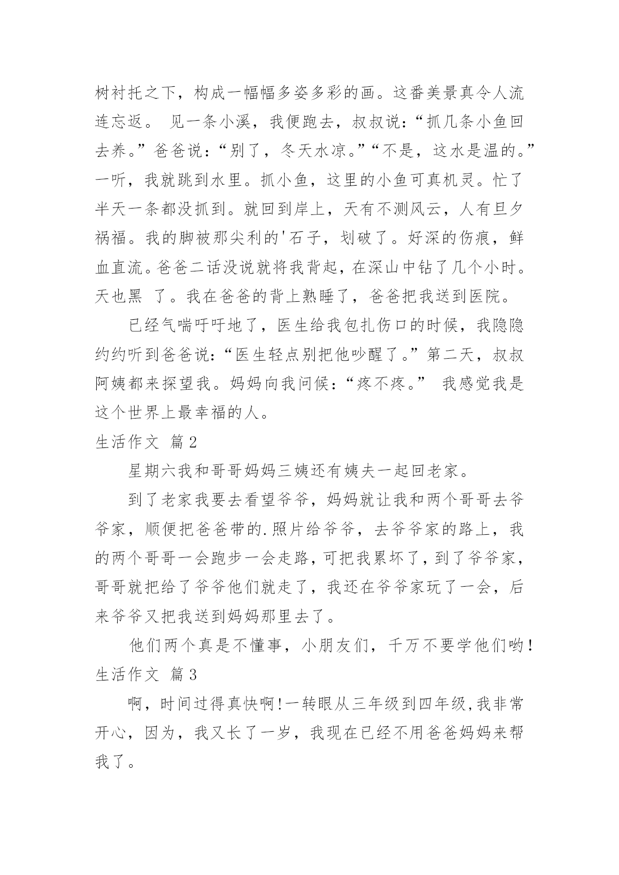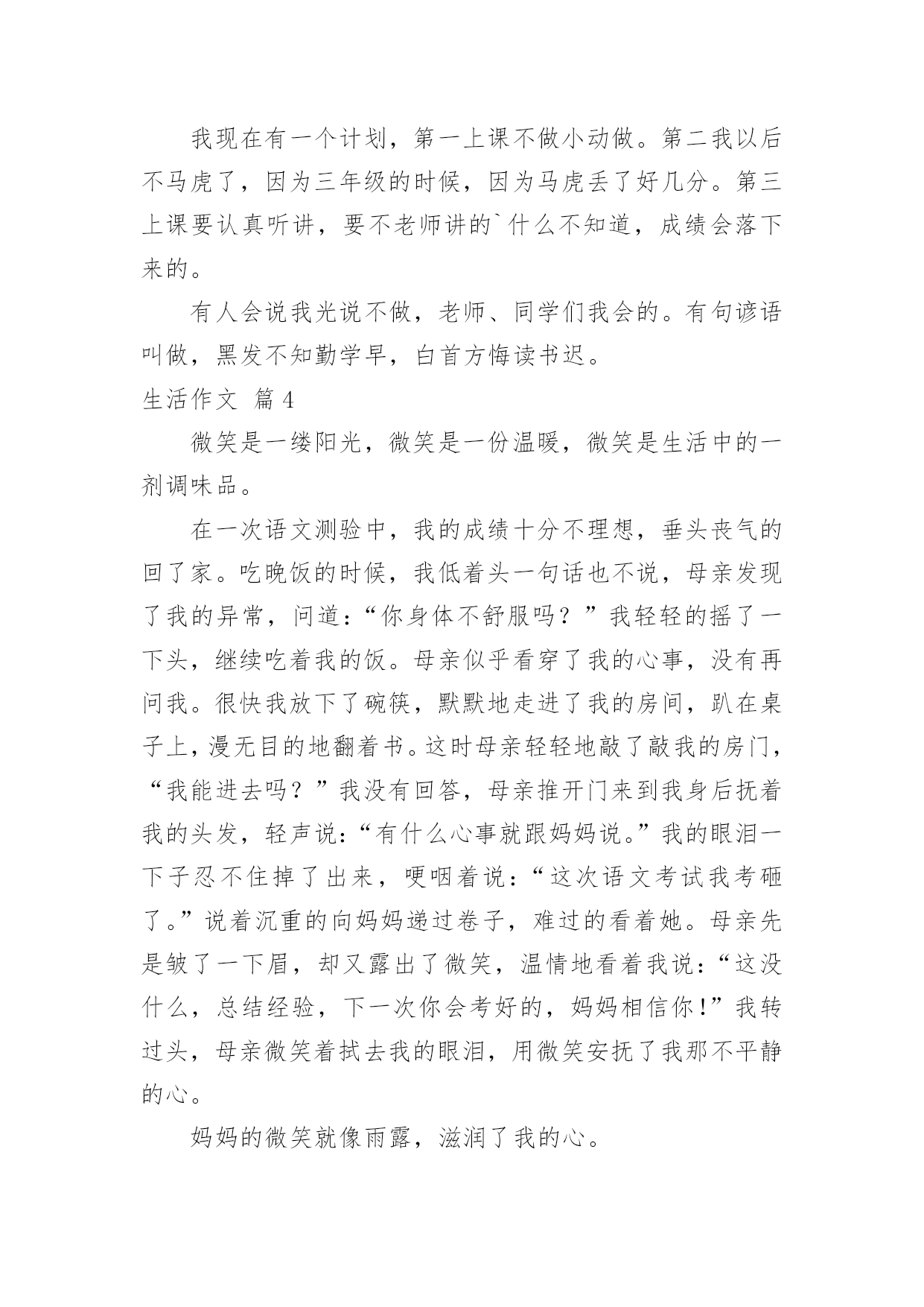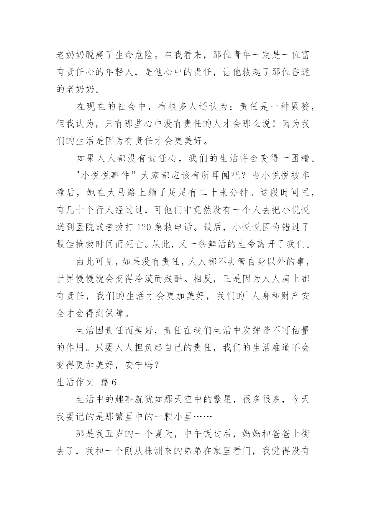 生活作文实用的生活作文六篇在日复一日的学习、工作或生活中,大家都写过作文吧,作文是从内部言语向外部言语的过渡,即从经过压缩的简要的、自己能明白的语言,向开展的、具有规范语法结构的、能为他人所理解的外部语言形式的转化。你写作文时总是无从下笔?下面是小编帮大家整理的生活作文6篇,仅供参考,希望能够帮助到大家。生活作文篇1幸福就像一位无形无影的神秘人,他虽无形无影却时刻缭绕在我们身旁;幸福就像夏天的清风,给人清爽甘甜;幸福更像一块美味的糖果,使人感觉甜蜜蜜的;一天,爸爸对我和妈妈说:“今年,我们去我们韶关的丹霞山里过年,我的同事们也去。”“好呀,好些年没去了。”我太高兴了,一夜未入眠,至车上才呼呼大睡。不知不觉的时间就悄悄地匆匆的从我的脸颊上溜去。到了丹霞山,爸爸将我叫醒。魏叔叔说:“你似乎错过了一路美景。”不一会儿就到了宾馆,二话未说就拉着叔叔们去。丹霞山的山峰均由悬崖峭壁构成,拔起于平川或河岸之上,危崖劲露,气势磅礴。山峦不论大小,异彩纷呈,有的雄风大气,阳刚十足,有的温婉秀丽,妩媚动人,更有赤壁倒悬,险峻无比,石景奇特,鬼斧神工;山间高峡幽谷,葱郁神秘。赤壁丹崖在多年的水流,加上几片青藻,在蓝天白云,碧水绿树衬托之下,构成一幅幅多姿多彩的画。这番美景真令人流连忘返。见一条小溪,我便跑去,叔叔说:“抓几条小鱼回去养。”爸爸说:“别了,冬天水凉。”“不是,这水是温的。”一听,我就跳到水里。抓小鱼,这里的小鱼可真机灵。忙了半天一条都没抓到。就回到岸上,天有不测风云,人有旦夕祸福。我的脚被那尖利的'石子,划破了。好深的伤痕,鲜血直流。爸爸二话没说就将我背起,在深山中钻了几个小时。天也黑了。我在爸爸的背上熟睡了,爸爸把我送到医院。已经气喘吁吁地了,医生给我包扎伤口的时候,我隐隐约约听到爸爸说:“医生轻点别把他吵醒了。”第二天,叔叔阿姨都来探望我。妈妈向我问候:“疼不疼。”我感觉我是这个世界上最幸福的人。生活作文篇2星期六我和哥哥妈妈三姨还有姨夫一起回老家。到了老家我要去看望爷爷,妈妈就让我和两个哥哥去爷爷家,顺便把爸爸带的.照片给爷爷,去爷爷家的路上,我的两个哥哥一会跑步一会走路,可把我累坏了,到了爷爷家,哥哥就把给了爷爷他们就走了,我还在爷爷家玩了一会,后来爷爷又把我送到妈妈那里去了。他们两个真是不懂事,小朋友们,千万不要学他们哟!生活作文篇3啊,时间过得真快啊!一转眼从三年级到四年级,我非常开心,因为,我又长了一岁,我现在已经不用爸爸妈妈来帮我了。我现在有一个计划,第一上课不做小动做。第二我以后不马虎了,因为三年级的时候,因为马虎丢了好几分。第三上课要认真听讲,要不老师讲的`什么不知道,成绩会落下来的。有人会说我光说不做,老师、同学们我会的。有句谚语叫做,黑发不知勤学早,白首方悔读书迟。生活作文篇4微笑是一缕阳光,微笑是一份温暖,微笑是生活中的一剂调味品。在一次语文测验中,我的成绩十分不理想,垂头丧气的回了家。吃晚饭的时候,我低着头一句话也不说,母亲发现了我的异常,问道:“你身体不舒服吗?”我轻轻的摇了一下头,继续吃着我的饭。母亲似乎看穿了我的心事,没有再问我。很快我放下了碗筷,默默地走进了我的房间,趴在桌子上,漫无目的地翻着书。这时母亲轻轻地敲了敲我的房门,“我能进去吗?”我没有回答,母亲推开门来到我身后抚着我的头发,轻声说:“有什么心事就跟妈妈说。”我的眼泪一下子忍不住掉了出来,哽咽着说:“这次语文考试我考砸了。”说着沉重的向妈妈递过卷子,难过的看着她。母亲先是皱了一下眉,却又露出了微笑,温情地看着我说:“这没什么,总结经验,下一次你会考好的,妈妈相信你!”我转过头,母亲微笑着拭去我的眼泪,用微笑安抚了我那不平静的心。妈妈的微笑就像雨露,滋润了我的心。一次,要画画时,突然发现我忘记带彩铅了。正好,我想到我最要好的朋友丽丽带了,但她现在不在教室里,可是我想:她是我最要好的'朋友,一定会借给我用的。我看见彩铅就在她的桌子上,于是我从她的桌子上拿走了彩铅。正在这时,一个男孩子从我身边猛的跑过,把彩铅撞得满地都是,彩色的笔头纷纷从笔上断落。正在我不知所措的时候,丽丽回来了,看到满地断落的彩铅顿时大声的责备道:“你怎么把我的彩铅都摔断了,这可是我新买的!”听到她不分清红皂白的冤枉我,我也生气的对她吼道:“大不了我再给你买一盒!”第二天,我把一盒崭新的彩铅随意的放在她的面前,“我才不要呢!”她用力的把彩铅推到我的面前。“不要就不要!”我生气的拿着彩铅转身就走了。事后,我渐渐发现,这件事我也有错,但我一直不敢向她坦白。过了几天,在上学路上,我偶然碰到了她,这一次我们并没有吵架,而是她先向我微笑着道招呼,我也开心地跟她交谈。我们又像以前那样,开开心心的一起玩了。我的心里有一种被释放的感觉。朋友的微笑就像春风,吹拂着我的心。在今年母亲节,我在