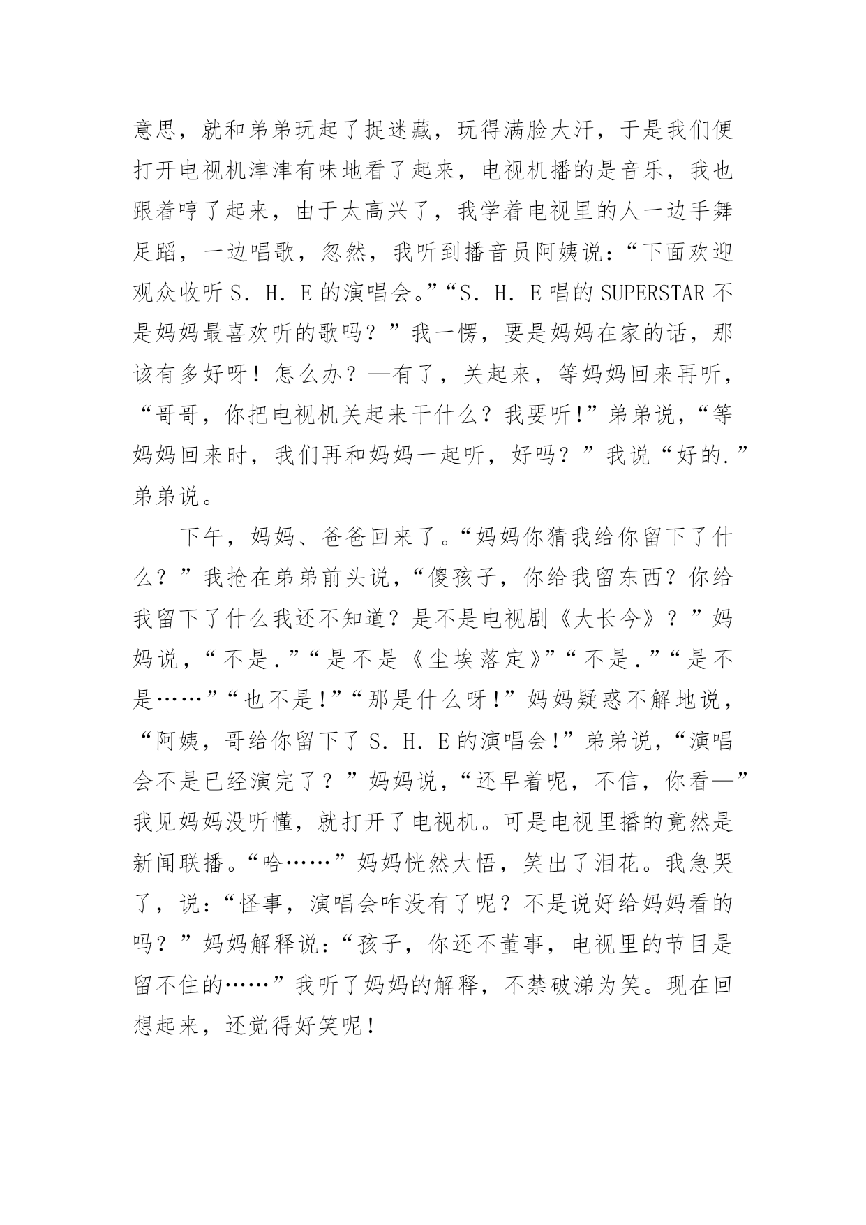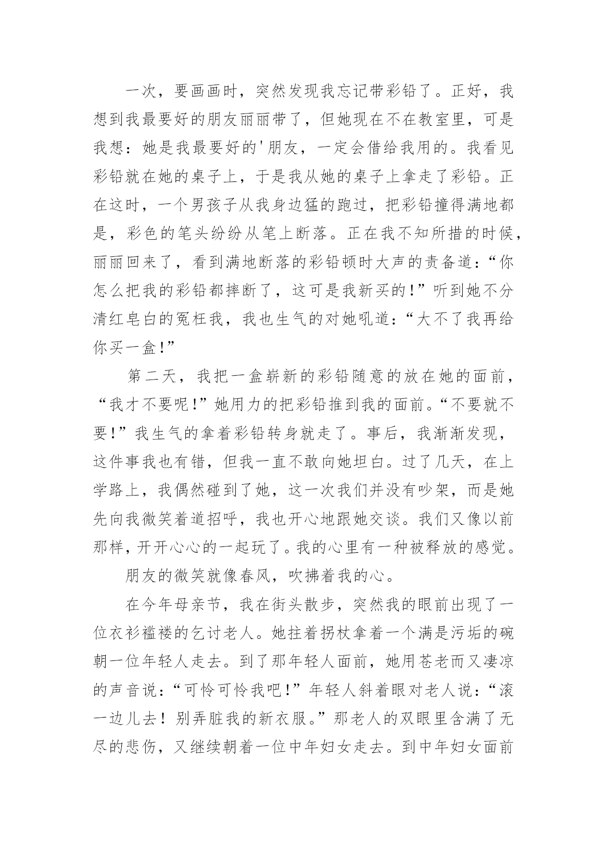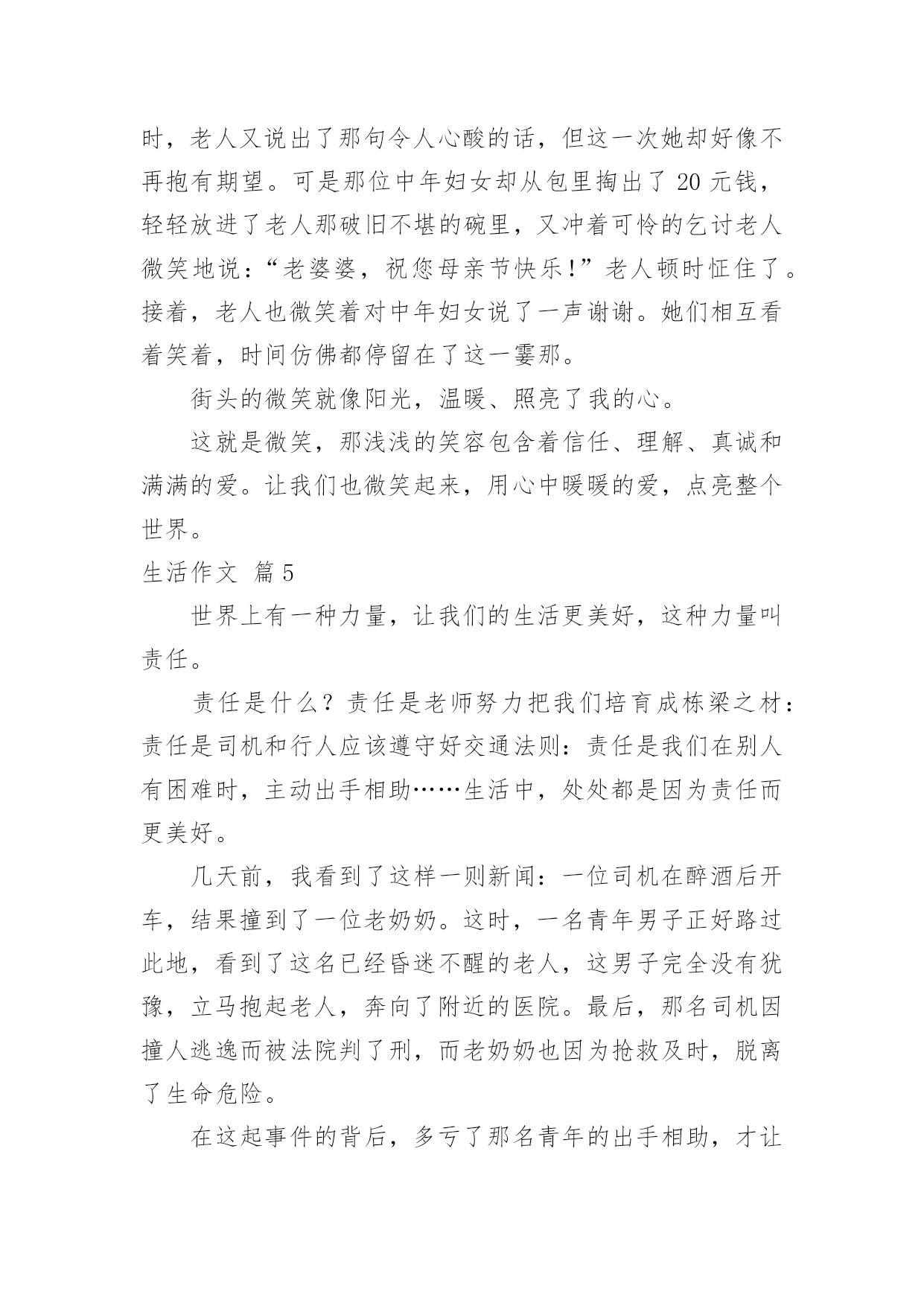 生活作文实用的生活作文六篇在日复一日的学习、工作或生活中,大家都写过作文吧,作文是从内部言语向外部言语的过渡,即从经过压缩的简要的、自己能明白的语言,向开展的、具有规范语法结构的、能为他人所理解的外部语言形式的转化。你写作文时总是无从下笔?下面是小编帮大家整理的生活作文6篇,仅供参考,希望能够帮助到大家。生活作文篇1幸福就像一位无形无影的神秘人,他虽无形无影却时刻缭绕在我们身旁;幸福就像夏天的清风,给人清爽甘甜;幸福更像一块美味的糖果,使人感觉甜蜜蜜的;一天,爸爸对我和妈妈说:“今年,我们去我们韶关的丹霞山里过年,我的同事们也去。”“好呀,好些年没去了。”我太高兴了,一夜未入眠,至车上才呼呼大睡。不知不觉的时间就悄悄地匆匆的从我的脸颊上溜去。到了丹霞山,爸爸将我叫醒。魏叔叔说:“你似乎错过了一路美景。”不一会儿就到了宾馆,二话未说就拉着叔叔们去。丹霞山的山峰均由悬崖峭壁构成,拔起于平川或河岸之上,危崖劲露,气势磅礴。山峦不论大小,异彩纷呈,有的雄风大气,阳刚十足,有的温婉秀丽,妩媚动人,更有赤壁倒悬,险峻无比,石景奇特,鬼斧神工;山间高峡幽谷,葱郁神秘。赤壁丹崖在多年的水流,加上几片青藻,在蓝天白云,碧水绿树衬托之下,构成一幅幅多姿多彩的画。这番美景真令人流连忘返。见一条小溪,我便跑去,叔叔说:“抓几条小鱼回去养。”爸爸说:“别了,冬天水凉。”“不是,这水是温的。”一听,我就跳到水里。抓小鱼,这里的小鱼可真机灵。忙了半天一条都没抓到。就回到岸上,天有不测风云,人有旦夕祸福。我的脚被那尖利的'石子,划破了。好深的伤痕,鲜血直流。爸爸二话没说就将我背起,在深山中钻了几个小时。天也黑了。我在爸爸的背上熟睡了,爸爸把我送到医院。已经气喘吁吁地了,医生给我包扎伤口的时候,我隐隐约约听到爸爸说:“医生轻点别把他吵醒了。”第二天,叔叔阿姨都来探望我。妈妈向我问候:“疼不疼。”我感觉我是这个世界上最幸福的人。生活作文篇2星期六我和哥哥妈妈三姨还有姨夫一起回老家。到了老家我要去看望爷爷,妈妈就让我和两个哥哥去爷爷家,顺便把爸爸带的.照片给爷爷,去爷爷家的路上,我的两个哥哥一会跑步一会走路,可把我累坏了,到了爷爷家,哥哥就把给了爷爷他们就走了,我还在爷爷家玩了一会,后来爷爷又把我送到妈妈那里去了。他们两个真是不懂事,小朋友们,千万不要学他们哟!生活作文篇3啊,时间过得真快啊!一转眼从三年级到四年级,我非常开心,因为,我又长了一岁,我现在已经不用爸爸妈妈来帮我了。我现在有一个计划,第一上课不做小动做。第二我以后不马虎了,因为三年级的时候,因为马虎丢了好几分。第三上课要认真听讲,要不老师讲的`什么不知道,成绩会落下来的。有人会说我光说不做,老师、同学们我会的。有句谚语叫做,黑发不知勤学早,白首方悔读书迟。生活作文篇4微笑是一缕阳光,微笑是一份温暖,微笑是生活中的一剂调味品。在一次语文测验中,我的成绩十分不理想,垂头丧气的回了家。吃晚饭的时候,我低着头一句话也不说,母亲发现了我的异常,问道:“你身体不舒服吗?”我轻轻的摇了一下头,继续吃着我的饭。母亲似乎看穿了我的心事,没有再问我。很快我放下了碗筷,默默地走进了我的房间,趴在桌子上,漫无目的地翻着书。这时母亲轻轻地敲了敲我的房门,“我能进去吗?”我没有回答,母亲推开门来到我身后抚着我的头发,轻声说:“有什么心事就跟妈妈说。”我的眼泪一下子忍不住掉了出来,哽咽着说:“这次语文考试我考砸了。”说着沉重的向妈妈递过卷子,难过的看着她。母亲先是皱了一下眉,却又露出了微笑,温情地看着我说:“这没什么,总结经验,下一次你会考好的,妈妈相信你!”我转过头,母亲微笑着拭去我的眼泪,用微笑安抚了我那不平静的心。妈妈的微笑就像雨露,滋润了我的心。一次,要画画时,突然发现我忘记带彩铅了。正好,我想到我最要好的朋友丽丽带了,但她现在不在教室里,可是我想:她是我最要好的'朋友,一定会借给我用的。我看见彩铅就在她的桌子上,于是我从她的桌子上拿走了彩铅。正在这时,一个男孩子从我身边猛的跑过,把彩铅撞得满地都是,彩色的笔头纷纷从笔上断落。正在我不知所措的时候,丽丽回来了,看到满地断落的彩铅顿时大声的责备道:“你怎么把我的彩铅都摔断了,这可是我新买的!”听到她不分清红皂白的冤枉我,我也生气的对她吼道:“大不了我再给你买一盒!”第二天,我把一盒崭新的彩铅随意的放在她的面前,“我才不要呢!”她用力的把彩铅推到我的面前。“不要就不要!”我生气的拿着彩铅转身就走了。事后,我渐渐发现,这件事我也有错,但我一直不敢向她坦白。过了几天,在上学路上,我偶然碰到了她,这一次我们并没有吵架,而是她先向我微笑着道招呼,我也开心地跟她交谈。我们又像以前那样,开开心心的一起玩了。我的心里有一种被释放的感觉。朋友的微笑就像春风,吹拂着我的心。在今年母亲节,我在