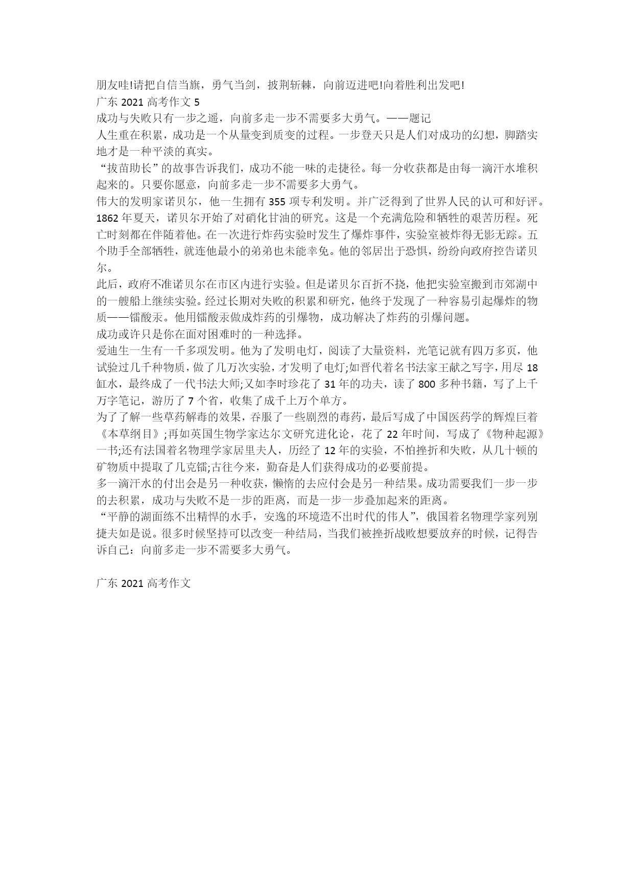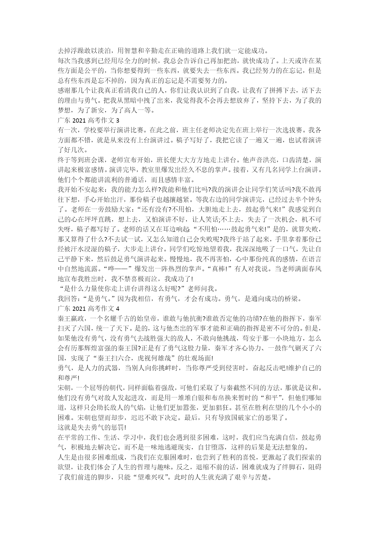 广东2021高考作文考场作文写作的问题是缺少深度,突破这一瓶颈的一大关键是提高素材运用的准确性,而你知道高考作文是什么样的吗?下面xx给大家分享广东2021高考作文的内容,希望能够帮助大家,欢迎阅读!广东2021高考作文1生活中我们需要成功的喜悦,需要挫折痛苦,需要欢声笑语,更需要奔向前方的勇气。勇气就是敢想敢做,毫不畏惧得气势。生活中需要的勇气有很多很多,在种.种条件下都可以证明一具个人是拥有勇气还是懦弱。成功者拥有什么?智慧?才华?不,是他们百折不挠的勇气。一个人如果没有了勇气,就会丧失战斗力,也就没有了精神支柱,没有了一个人原有自信。有一句话是这样说的:我们都需要勇气,来面对流言蜚语。是啊!人人都需要勇气来面对一切成功与失败,需要它来面对一切是与非,需要它来面对一切的一切。古往今来,有多少事不是有勇气才去做的?当一个人做出自己的选择时,是什么让他这样做?是勇气,是自信。人类是世界是最高等的动物,像海伦凯勒,居里夫人,张海迪……他们为什么能够功成名就?是因为他们有战胜困难的勇气,促使他们挑战生活,挑战未来。我们曾经学过一篇课文:一只刚出生的小麻雀不小心掉出了巢外,被一只猎狗发现了。就在这时候,老麻雀飞下来挡在了小麻雀旁边,猎狗受了惊吓,竟然被老麻雀吓跑了。这个就是勇气,如果老麻雀不飞下来保护幼鸟,幼鸟可能早被猎狗吃了。是勇气促使它在危情中挺身而出来保护自己的孩子。想一想,小草为什么能够顽强的破土而出,是因为它有生的勇气。临近死亡的小鸟可以用自己的努力来改变命运,那是因为它有生的意念。小鸟想飞过天空,飞过大海,它就一定能成功吗?它还是需要尝试,需要勇气和胆量。比起这些来,我简直太懦弱了,遇到一点挫折就打退堂鼓,不愿相信事实。每一件事当你决定要做时,那就已经成功了一半,因为你有勇气去面对它。在困难面前拿出勇气吧,把你的勇气,你的胆识和信心拿出来吧!拥有了这些,你就已经站在比别人远的起跑线上了。生活中我们需要成功的喜悦,需要挫折痛苦,需要欢声笑语,更需要奔向前方的勇气。勇气就是敢想敢做,毫不畏惧得气势。生活中需要的勇气有很多很多,在种.种条件下都可以证明一具个人是拥有勇气还是懦弱。成功者拥有什么?智慧?才华?不,是他们百折不挠的勇气。广东2021高考作文2也许是千百次努力挥之一去,无数次的失败让我迷茫。我在每次看着失败的同时也在仰望着这个世界,为什么命运总是那么的不公平,让拥有的多一些的人拥有更多。付出的一切的一切早已他可曾看到,我觉得我的人生活的好失败啊!一直都在追赶,无数次的想放弃,却都没有狠下心。每次想放弃是总问问自己为什么走到这里,我不敢放弃,也没有放弃的权利。好像大海中寻找大陆的船,永远找不到家的方向。每次考试,总看着别人在哪里谈笑风生,只能自己默默为自己揪心。就感觉同样都是人,为什么人与人差别就那么大,为什么我每次的努力都失败。渐渐地,我几乎都变得麻木了,或许那些扎进我心已经太多次了,早已感觉不到疼痛。我觉得不仅仅在学校,在家里,父母总是喋喋不休的谈论别人怎么样,总是故意在提醒我。我也是感觉做父母的太失败了,我也不愿意在一个不理解我的家庭之下生活一辈子,我也不想永远做那个配角。但没办法上天总是在磨难我。经历了一个学期的高中生活,我也明白了些许。学习在很多时候就是一种方向的坚定,方法的坚持,行为的坚守,新鲜过后的持之以恒与反复不断的时间。路很长,走的也许会慢些,去掉浮躁敢以淡泊,用智慧和辛勤走在正确的道路上我们就一定能成功。每次当我感到已经用尽全力的时候,我总会告诉自己再加把劲,就快成功了。上天或许在某些方面是公平的,当你想要得到一些东西,就要失去一些东西。我已经努力的在忘记,但是总有些东西是忘不掉的,因为真正的忘记是不需要努力的。感谢那几个让我真正看清我自己的人,你们让我认识到了自我,让我有了拼搏下去,活下去的理由与勇气。把我从黑暗中拽了出来,我觉得我不会再去想放弃了,坚持下去,为了我的梦想,为了新安,为了高人一等。广东2021高考作文3有一次,学校要举行演讲比赛。在此之前,班主任老师决定先在班上举行一次选拔赛。我各方面都不错,就是从来没有上台演讲过。稿子写好了,我把它读了一遍又一遍,也试着演讲了好几次。终于等到班会课,老师宣布开始,班长便大大方方地走上讲台。他声音洪亮,口齿清楚,演讲起来极富感情。演讲完毕,教室里爆发出经久不息的掌声。接着,又有几名同学上台演讲。他们个个都能讲流利的普通话,而且感情丰富。我开始不安起来:我的能力怎么样?我能和他们比吗?我的演讲会让同学们笑话吗?我不敢再往下想,手心开始出汗,那份稿子也越攘越紧。等我右边的同学演讲完,已经过去半个钟头了。老师在一旁鼓励大家:“还有没有?不用怕,大胆地走上去,鼓起勇气来!”我感觉到自己的心在坪坪直跳,想上去,又