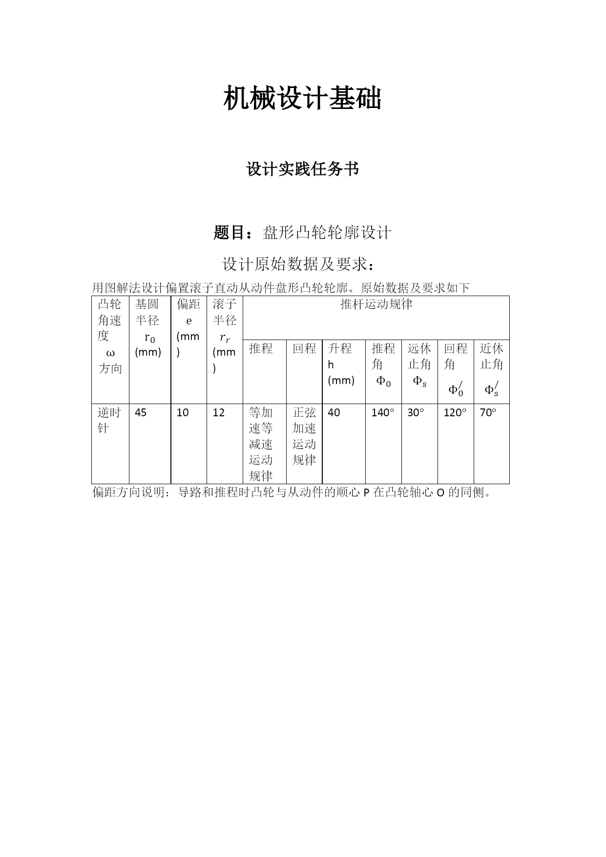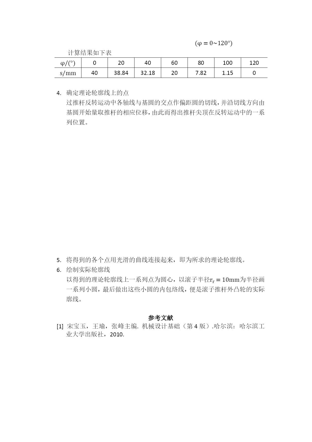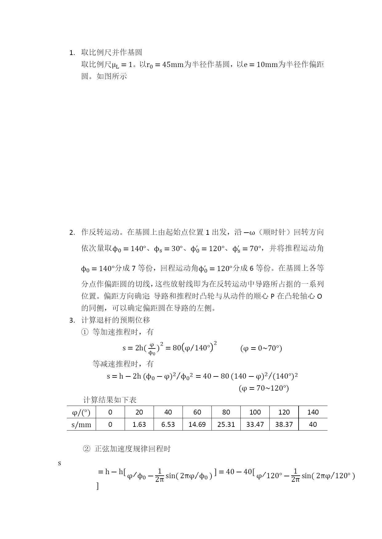 机械设计基础设计实践设计计算说明书题目:盘形凸轮轮廓设计学院:航天学院班号:1018202班学号:1101800224姓名:王宗强日期:2010年9月24日机械设计基础设计实践任务书题目:盘形凸轮轮廓设计设计原始数据及要求:用图解法设计偏置滚子直动从动件盘形凸轮轮廓。原始数据及要求如下凸轮角速度ω方向基圆半径r0(mm)偏距e(mm)滚子半径rr(mm)推杆运动规律推程回程升程h(mm)推程角Φ0远休止角Φs回程角Φ0/近休止角Φs/逆时针451012等加速等减速运动规律正弦加速运动规律40140°30°120°70°偏距方向说明:导路和推程时凸轮与从动件的顺心P在凸轮轴心O的同侧。目录取比例尺并作基圆作反转运动,量取Φ0、Φs、Φ0'、Φs'等分Φ0、Φs计算推杆的预期位移确定理论轮廓线上的点绘制理论轮廓线绘制实际轮廓线取比例尺并作基圆取比例尺μL=1。以r0=45mm为半径作基圆,以e=10mm为半径作偏距圆。如图所示作反转运动。在基圆上由起始点位置1出发,沿-ω(顺时针)回转方向依次量取ϕ0=140°、ϕs=30°、ϕ0'=120°、ϕs'=70°,并将推程运动角ϕ0=140°分成7等份,回程运动角ϕ0'=120°分成6等份。在基圆上各等分点作偏距圆的切线,这些放射线即为在反转运动中导路所占据的一系列位置。偏距方向确定:导路和推程时凸轮与从动件的顺心P在凸轮轴心O的同侧,可以确定偏距圆在导路的左侧。计算退杆的预期位移=1\*GB3①等加速推程时,有s=2h(φϕ0)2=80φ140°2φ=0~70°等减速推程时,有s=h-2hϕ0-φ2ϕ02=40-80140-φ2140°2φ=70~120°计算结果如下表φ/(°)020406080100120140s/mm01.636.5314.6925.3133.4738.3740=2\*GB3②正弦加速度规律回程时s=h-h[φϕ0-12πsin(2πφϕ0)]=40-40[φ120°-12πsin(2πφ120°)]φ=0~120°计算结果如下表φ/(°)020406080100120s/mm4038.8432.18207.821.150确定理论轮廓线上的点过推杆反转运动中各轴线与基圆的交点作偏距圆的切线,并沿切线方向由基圆开始量取推杆的相应位移,由此而得出推杆尖顶在反转运动中的一系列位置。将得到的各个点用光滑的曲线连接起来,即为所求的理论轮廓线。绘制实际轮廓线以得到的理论轮廓线上一系列点为圆心,以滚子半径rr=10mm为半径画一系列小圆,最后做出这些小圆的内包络线,便是滚子推杆外凸轮的实际廓线。参考文献[1]宋宝玉,王瑜,张峰主编.机械设计基础(第4版).哈尔滨:哈尔滨工业大学出版社,2010.