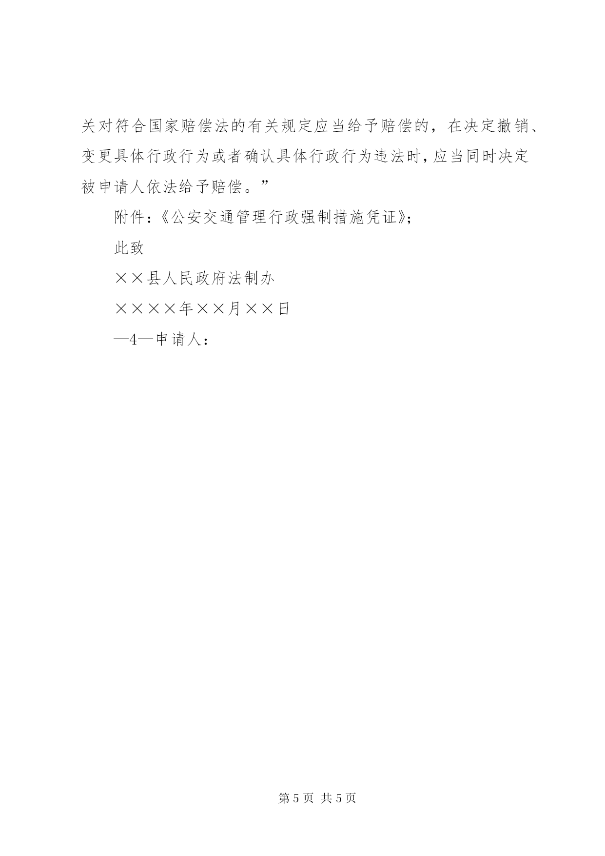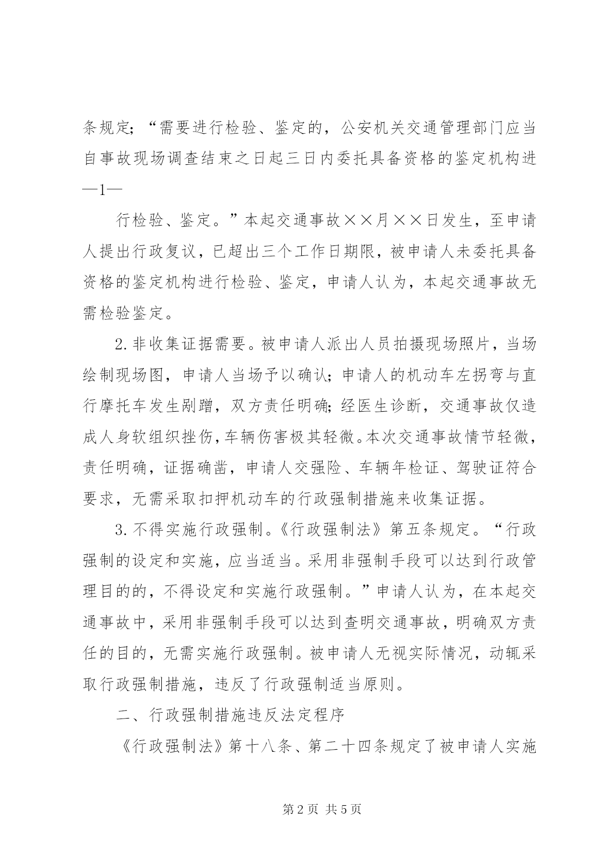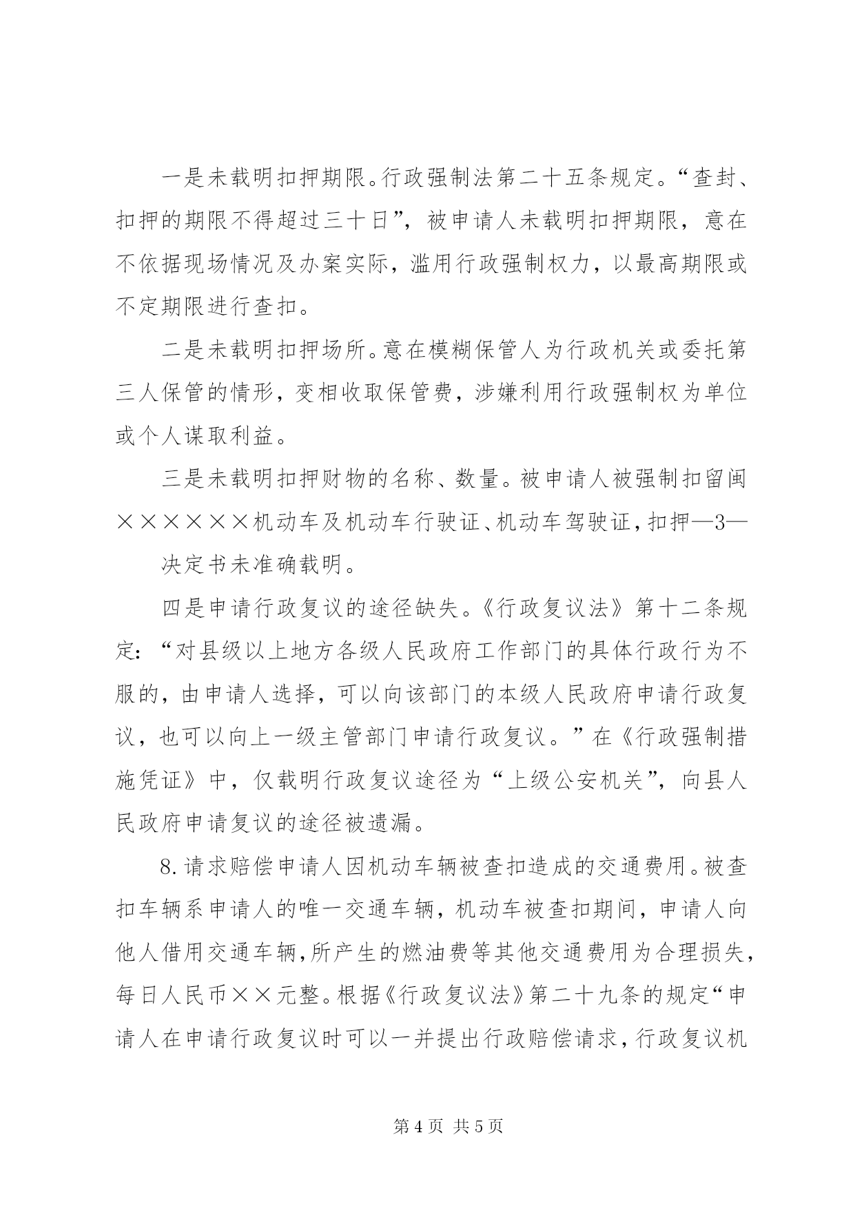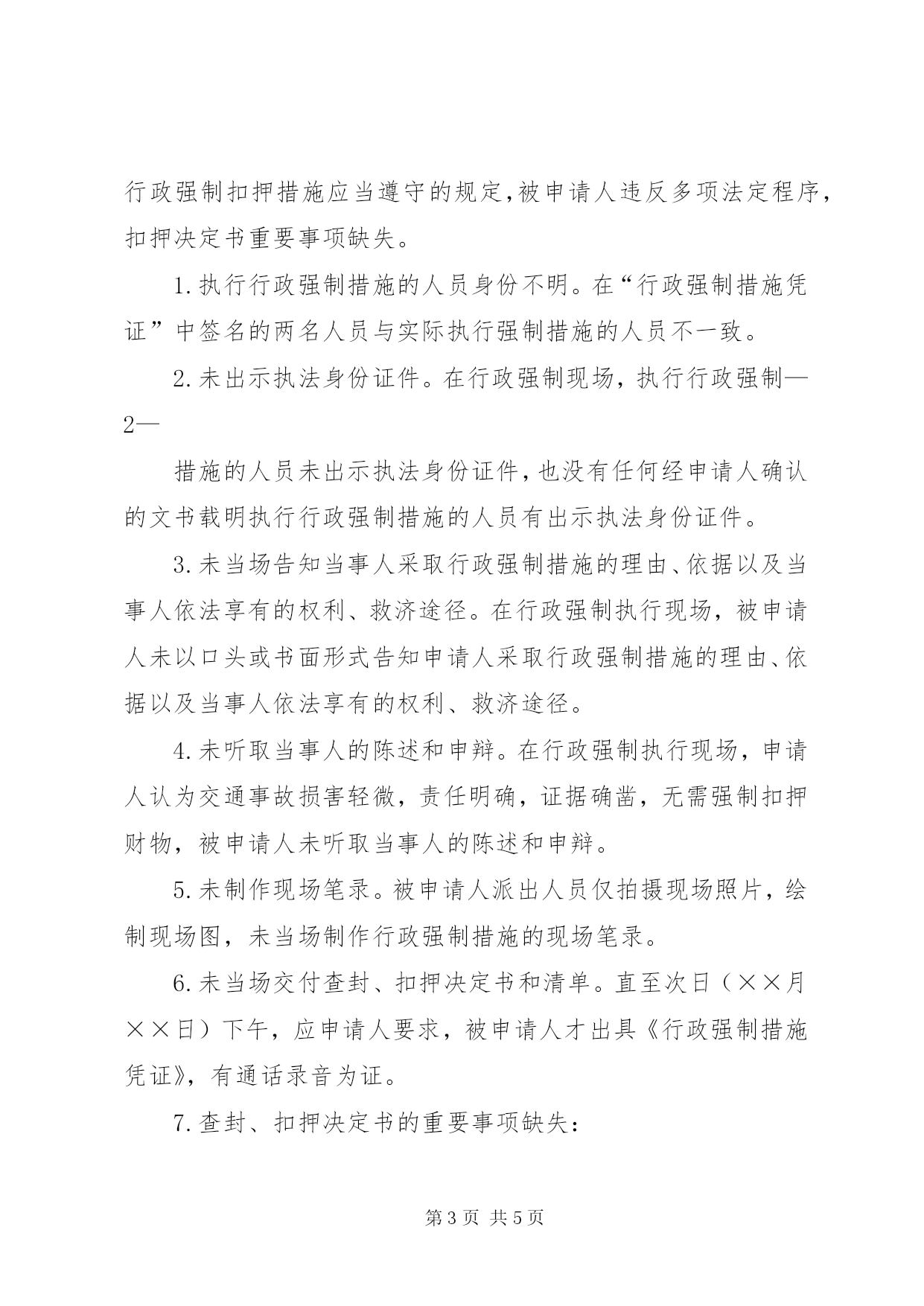 第PAGE\*Arabic\*MERGEFORMAT5页共NUMPAGES\*MERGEFORMAT5页交通违法行政复议申请书行政复议申请书申请人的基本情况姓名:×××,性别:男,年龄:××岁,身份证号码:××××××××,工作单位:××××××××××,住所:××××××××,邮政编码:××××被申请人的名称×××公安局交通管理大队行政复议请求1.依法撤销被申请人作出的第××××××××号《公安交通管理行政强制措施凭证》;2.立即退还申请人被强制扣留的闽×××××机动车、机动车行驶证、机动车驾驶证;3.请求赔偿申请人因机动车辆被查扣造成的交通费用损失。主要事实和理由一、行政强制措施无法定依据被申请人作出的第××××××××号《公安交通管理行政强制措施凭证》中载明,采取行政强制扣押措施的依据是因检验鉴定或者收集证据的需要,被申请人认为法定依据不成立,采取行政强制措施不当,理由如下:1.无需检验鉴定。《道路交通事故处理程序规定》第三十七条规定;“需要进行检验、鉴定的,公安机关交通管理部门应当自事故现场调查结束之日起三日内委托具备资格的鉴定机构进—1—行检验、鉴定。”本起交通事故××月××日发生,至申请人提出行政复议,已超出三个工作日期限,被申请人未委托具备资格的鉴定机构进行检验、鉴定,申请人认为,本起交通事故无需检验鉴定。2.非收集证据需要。被申请人派出人员拍摄现场照片,当场绘制现场图,申请人当场予以确认;申请人的机动车左拐弯与直行摩托车发生剐蹭,双方责任明确;经医生诊断,交通事故仅造成人身软组织挫伤,车辆伤害极其轻微。本次交通事故情节轻微,责任明确,证据确凿,申请人交强险、车辆年检证、驾驶证符合要求,无需采取扣押机动车的行政强制措施来收集证据。3.不得实施行政强制。《行政强制法》第五条规定。“行政强制的设定和实施,应当适当。采用非强制手段可以达到行政管理目的的,不得设定和实施行政强制。”申请人认为,在本起交通事故中,采用非强制手段可以达到查明交通事故,明确双方责任的目的,无需实施行政强制。被申请人无视实际情况,动辄采取行政强制措施,违反了行政强制适当原则。二、行政强制措施违反法定程序《行政强制法》第十八条、第二十四条规定了被申请人实施行政强制扣押措施应当遵守的规定,被申请人违反多项法定程序,扣押决定书重要事项缺失。1.执行行政强制措施的人员身份不明。在“行政强制措施凭证”中签名的两名人员与实际执行强制措施的人员不一致。2.未出示执法身份证件。在行政强制现场,执行行政强制—2—措施的人员未出示执法身份证件,也没有任何经申请人确认的文书载明执行行政强制措施的人员有出示执法身份证件。3.未当场告知当事人采取行政强制措施的理由、依据以及当事人依法享有的权利、救济途径。在行政强制执行现场,被申请人未以口头或书面形式告知申请人采取行政强制措施的理由、依据以及当事人依法享有的权利、救济途径。4.未听取当事人的陈述和申辩。在行政强制执行现场,申请人认为交通事故损害轻微,责任明确,证据确凿,无需强制扣押财物,被申请人未听取当事人的陈述和申辩。5.未制作现场笔录。被申请人派出人员仅拍摄现场照片,绘制现场图,未当场制作行政强制措施的现场笔录。6.未当场交付查封、扣押决定书和清单。直至次日(××月××日)下午,应申请人要求,被申请人才出具《行政强制措施凭证》,有通话录音为证。7.查封、扣押决定书的重要事项缺失:一是未载明扣押期限。行政强制法第二十五条规定。“查封、扣押的期限不得超过三十日”,被申请人未载明扣押期限,意在不依据现场情况及办案实际,滥用行政强制权力,以最高期限或不定期限进行查扣。二是未载明扣押场所。意在模糊保管人为行政机关或委托第三人保管的情形,变相收取保管费,涉嫌利用行政强制权为单位或个人谋取利益。三是未载明扣押财物的名称、数量。被申请人被强制扣留闽××××××机动车及机动车行驶证、机动车驾驶证,扣押—3—决定书未准确载明。四是申请行政复议的途径缺失。《行政复议法》第十二条规定:“对县级以上地方各级人民政府工作部门的具体行政行为不服的,由申请人选择,可以向该部门的本级人民政府申请行政复议,也可以向上一级主管部门申请行政复议。”在《行政强制措施凭证》中,仅载明行政复议途径为“上级公安机关”,向县人民政府申请复议的途径被遗漏。8.请求赔偿申请人因机动车辆被查扣造成的交通费用。被查扣车辆系申请人的唯一交通车辆,机动车被查扣期间,申请人向他人借用交通车辆,所产生的燃油费等其他交通费用为合理损失,每日人民币××元整。根据《行政复议法》第二十九条的规定“申请人在申请行政复议时可以一并提出行政赔偿请求,行政复议机关对符合国家赔偿法的有关规定应当给予赔偿的,在决定撤销、变更具体行政行为或者确认具体行政行为违法时,应当同时决定被