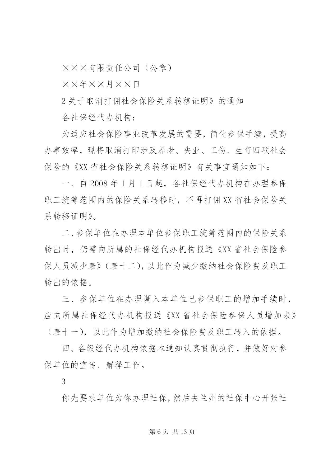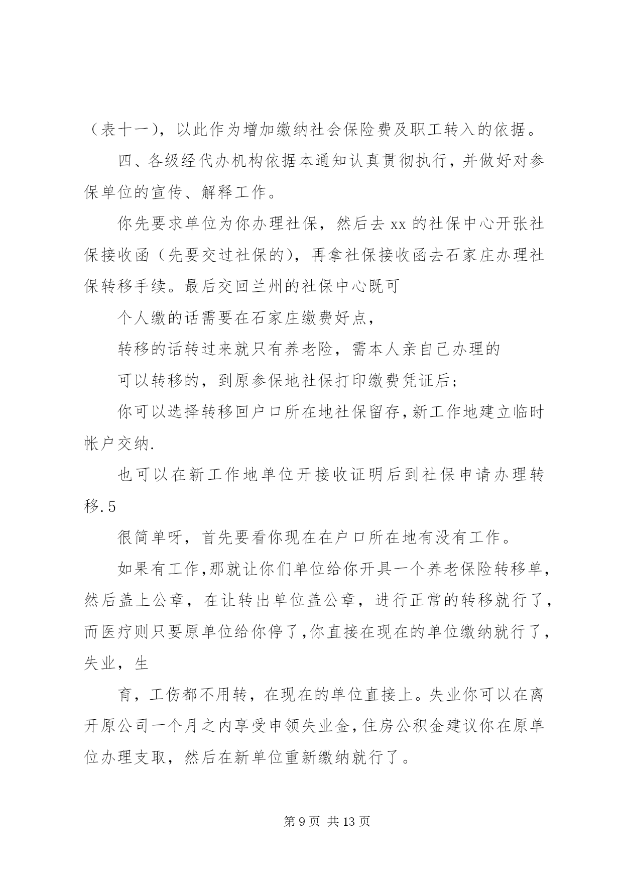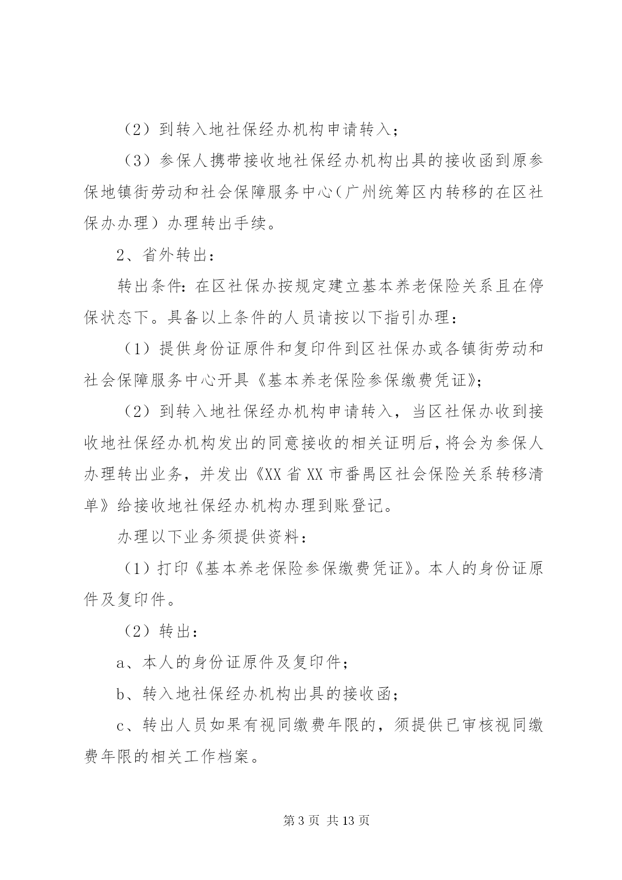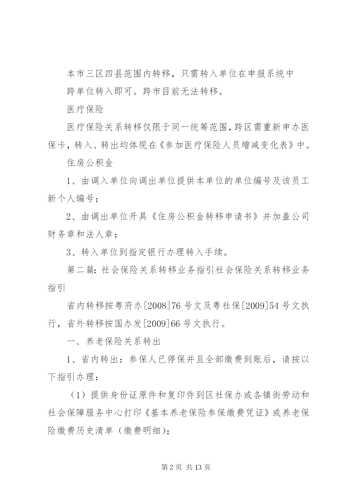 第PAGE\*Arabic\*MERGEFORMAT13页共NUMPAGES\*MERGEFORMAT13页社会保险转移指引本市三区四县范围内转移,只需转入单位在申报系统中跨单位转入即可。(养老以下材料是从手册里找到的,还未与养老处核实,上午打电话一直没人接。现在离职人员都是当月减出,离职人员需要转移时,原单位应该是不用出手续,其本人携带身份证及养老保险手册直接到社保局办理即可)调出管辖范围参保人员业务办理。参保人提供工作调动审批表、养老保险关系转移申请表,养老保险处为其提供《基本养老保险关系转移接续信息表》。跨省转出参保人员业务处理方式为,接到对方保险机构出具的《基本养老保险关系转移接续信息表》并以挂号信的形式邮寄到对方保险机构,同时将《基本养老保险关系转移单》送达到财务办理基金划转手续。调入管辖范围参保人员业务办理。符合条件的跨省转入参保人员由用人单位或参保人员向养老保险处提出转移接续申请并出示对方社保机构出具的《参保缴费凭证》填写《基本养老保险关系转移接续申请表》资料齐全后,养老保险处向对方保险机构发出《基本养老保险关系转移接续联系函》,在收到对方社保机构出具的《基本养老保险关系转移接续信息表》及转移基金额后为其办理接续手续。失业保险本市三区四县范围内转移,只需转入单位在申报系统中跨单位转入即可。跨市目前无法转移。医疗保险医疗保险关系转移仅限于同一统筹范围,跨区需重新申办医保卡,转入、转出均体现在《参加医疗保险人员增减变化表》中。住房公积金1、由调入单位向调出单位提供本单位的单位编号及该员工新个人编号;2、由调出单位开具《住房公积金转移申请书》并加盖公司财务章和法人章;3、转入单位到指定银行办理转入手续。第二篇:社会保险关系转移业务指引社会保险关系转移业务指引省内转移按粤府办[2008]76号文及粤社保[2009]54号文执行,省外转移按国办发[2009]66号文执行。一、养老保险关系转出1、省内转出:参保人已停保并且全部缴费到账后,请按以下指引办理:(1)提供身份证原件和复印件到区社保办或各镇街劳动和社会保障服务中心打印《基本养老保险参保缴费凭证》或养老保险缴费历史清单(缴费明细);(2)到转入地社保经办机构申请转入;(3)参保人携带接收地社保经办机构出具的接收函到原参保地镇街劳动和社会保障服务中心(广州统筹区内转移的在区社保办办理)办理转出手续。2、省外转出:转出条件:在区社保办按规定建立基本养老保险关系且在停保状态下。具备以上条件的人员请按以下指引办理:(1)提供身份证原件和复印件到区社保办或各镇街劳动和社会保障服务中心开具《基本养老保险参保缴费凭证》;(2)到转入地社保经办机构申请转入,当区社保办收到接收地社保经办机构发出的同意接收的相关证明后,将会为参保人办理转出业务,并发出《XX省XX市番禺区社会保险关系转移清单》给接收地社保经办机构办理到账登记。办理以下业务须提供资料:(1)打印《基本养老保险参保缴费凭证》。本人的身份证原件及复印件。(2)转出:a、本人的身份证原件及复印件;b、转入地社保经办机构出具的接收函;c、转出人员如果有视同缴费年限的,须提供已审核视同缴费年限的相关工作档案。二、养老保险关系转入1、省内转入:参保人在区社保办按规定建立基本养老保险关系且正在参保状态下,请按以下指引办理:(1)提供在转出地社保经办机构开具的《基本养老保险参保缴费凭证》或养老保险缴费历史清单(缴费明细)及本人身份证原件和复印件;(2)到区社保办办理申请转入业务,并填写《转入申请书》。对符合转入条件的,区社保办将出具《养老保险关系转入接收函》;(3)由本人到转出地社保经办机构办理转出业务;(4)待转移账户资金到账后,由参保人携带《养老保险关系转移清单》和本人身份证到区社保办办理养老关系转入到账登记手续。2、省外转入:转入条件。参保人男不超过50岁、女不超过40岁(组织人事关系调动的除外),在区社保办按规定建立基本养老保险关系且正在参保状态下。具备以上条件的人员请按以下指引办理:(1)提供在转出地社保经办机构开具的《基本养老保险参保缴费凭证》及本人身份证原件和复印件,到区社保办办理申请转入业务,并填写《转入申请书》(2)对符合转入条件的,区社保办将发出《养老保险关系转入接收函》给转出地社保经办机构,由当地办理转出手续;(3)当区社保办收到转出地社保经办机构出具的养老保险关系转移清单及转移资金到账后,将为参保人办理到账登记确认。办理以下业务须提供资料:(1)保险关系转入申请手续:a、本人身份证原件及复印件;b、转出地社保经办机构出具的《基本养老保险参保缴费凭证》或养老保险缴费历史清单(缴费明细);c、填写《转入申请书》;d、经县级以上组织部门、人力资源社会保障行政部门批准调动的,须提供商调函复印件(并