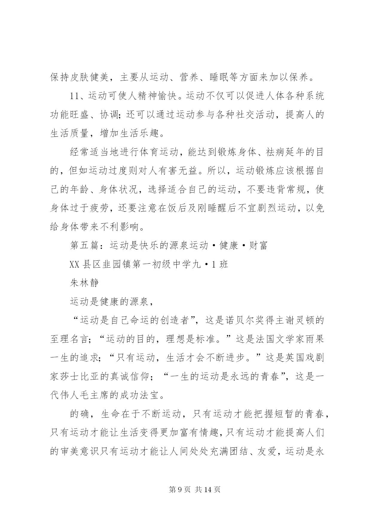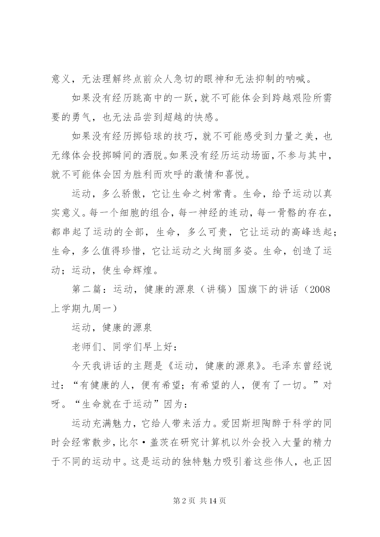 第PAGE\*Arabic\*MERGEFORMAT14页共NUMPAGES\*MERGEFORMAT14页运动健康的源泉演讲稿运动给人带来活力。毛泽东曾说。“有健康的人,便有希望;有希望的人,便有了一切。”众所周知,毛泽东从青少年时期起,就坚持刻苦的学习和顽强的体育锻炼。在刻苦攻读之余,无论做操、跑步、游泳、爬山和野营,毛泽东都积极参加,认真锻炼。解放后,毛泽东曾先后13次横渡长江,并写下了“万里长江横渡,极目楚天舒。不管风吹浪打,胜似闲庭信步”的豪迈诗句。运动,他像容光焕发的使者,向暮年人微笑致意,给年轻人点燃激情。他的作用无以伦比,可使人体运动富有节律,使动作变得优美,柔中有刚毅。他让我们懂得,取得成功的关键,只能是体力和精神融为一体。运动,是培育人类的沃地。他通过最直接的途径,增强民族体质,矫正畸形躯体,防病患与未然,使我们长的茁壮有力。他告诉我们良好的生活习惯,要求我们对过度行为引起警惕。刚刚过去的奥运会,它点燃的激情依然永存。10月底,我校一年一度的体育节即将拉开帷幕。召开运动会,是真正落实增强学生体质的一个重要举措,是发挥我们体育特长和身心特点的舞台。体育运动,重在参与。参与运动,会赋予我们勇敢、果断的精神;参与运动,会赋予我们更快、更高、更强的力量;参与运动,会令我们拥有健康与快乐。如果没有经历跑步中的冲刺,我们就不能深深地懂得坚持的意义,无法理解终点前众人急切的眼神和无法抑制的呐喊。如果没有经历跳高中的一跃,就不可能体会到跨越艰险所需要的勇气,也无法品尝到超越的快感。如果没有经历掷铅球的技巧,就不可能感受到力量之美,也无缘体会投掷瞬间的洒脱。如果没有经历运动场面,不参与其中,就不可能体会因为胜利而欢呼的激情和喜悦。运动,多么骄傲,它让生命之树常青。生命,给予运动以真实意义。每一个细胞的组合,每一神经的连动,每一骨骼的存在,都串起了运动的全部,生命,多么可贵,它让运动的高峰迭起;生命,多么值得珍惜,它让运动之火绚丽多姿。生命,创造了运动;运动,使生命辉煌。第二篇:运动,健康的源泉(讲稿)国旗下的讲话(2008上学期九周一)运动,健康的源泉老师们、同学们早上好:今天我讲话的主题是《运动,健康的源泉》。毛泽东曾经说过:“有健康的人,便有希望;有希望的人,便有了一切。”对呀。“生命就在于运动”因为:运动充满魅力,它给人带来活力。爱因斯坦陶醉于科学的同时会经常散步,比尔·盖茨在研究计算机以外会投入大量的精力于不同的运动中。这是运动的独特魅力吸引着这些伟人,也正因为他们被运动所倾倒,才使爱因斯坦一直保持清醒的头脑,使比尔盖茨年轻充满活力,让更多的人们被他们折服。运动,是培育人类的沃地。它使我们长得茁壮有力。刚刚过去的奥运会,它点燃的激情依然在我们心中回荡。我校一年一度的校运会在这个周举行。体育运动,重在参与。参与运动,会赋予我们勇敢、果断的精神;参与运动,会赋予我们更快、更高、更强的力量;参与运动,会令我们拥有健康与快乐。如果没有经历跑步中的冲刺,我们就不能深深地懂得坚持的意义,无法理解终点前众人急切的眼神和无法抑制的呐喊。如果没有经历跳高中的一跃,就不可能体会到跨越艰险所需要的勇气,也无法品尝到超越的快感。如果没有经历掷铅球的技巧,就不可能感受到力量之美,也无缘体会投掷瞬间的洒脱。如果没有经历运动场面,不参与其中,就不可能体会因为胜利而欢呼的激情和喜悦。运动,多么骄傲,它让生命之树常青。生命,多么值得珍惜,它让运动之火绚丽多姿。生命,创造了运动;运动,使生命辉煌。我的话讲完了。谢谢大家。第三篇。运动与健康演讲稿运动与健康演讲稿当今,随着经济与科技的快速发展,电气化、机械化、自动化逐渐代替了人体的大部分动作,使人体的运动在逐渐的减少。而随着人们生活水平的提高,人体内食用的高脂、高糖、高蛋白又因运动的逐渐减少而积聚增多。因此,以上一少一多,使人体的正常新陈代谢功能下降,患肥胖症、糖尿病、高血压、脑中风、心脏病的发病率在逐渐的增多;心脏的功能也会因一少一多早衰十年以上,癌症发病率要比经常运动的人高7倍;动脉硬化、肾病、胆石症、骨质疏松症、精神抑郁症的发病率也在明显升高。俗话说:生命在于运动,运动是提高人体免疫功能、抵抗疾病入侵、延长寿命的积极手段。根据研究资料表明,经常运动的健康人无论细胞免疫功能还是体液免疫功能都优于一般人,养生之道,常欲小劳。运动是祛病延年、健康长寿的要素,是生命的需要。主要表现在以下几个方面:1、运动可增强体质。健身运动,可增加肺活量,使得气体充分交换,增加血中含氧量,加快新陈代谢;增强大脑皮层的兴奋和抑制过程;使心肌纤维粗壮,加强心肌收缩,改善心肌供氧;还能改善睡眠质量,减轻生活压力,减少沮丧和焦虑;防止胆固醇在血管中的沉淀,可以有效地预防血管硬化、高血压和冠心病的发生。2、
