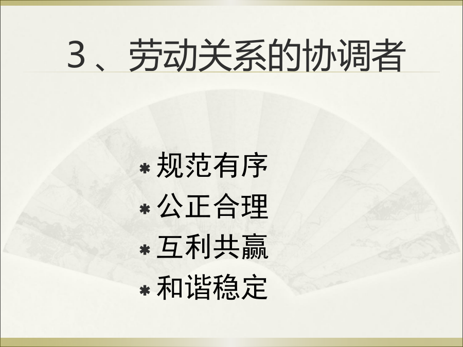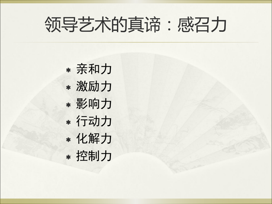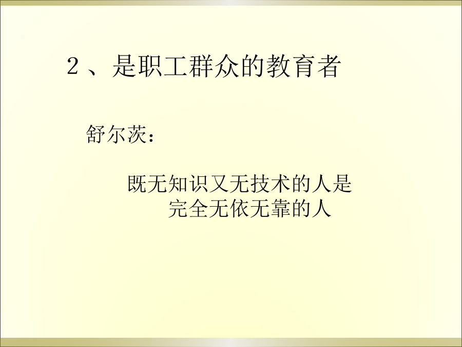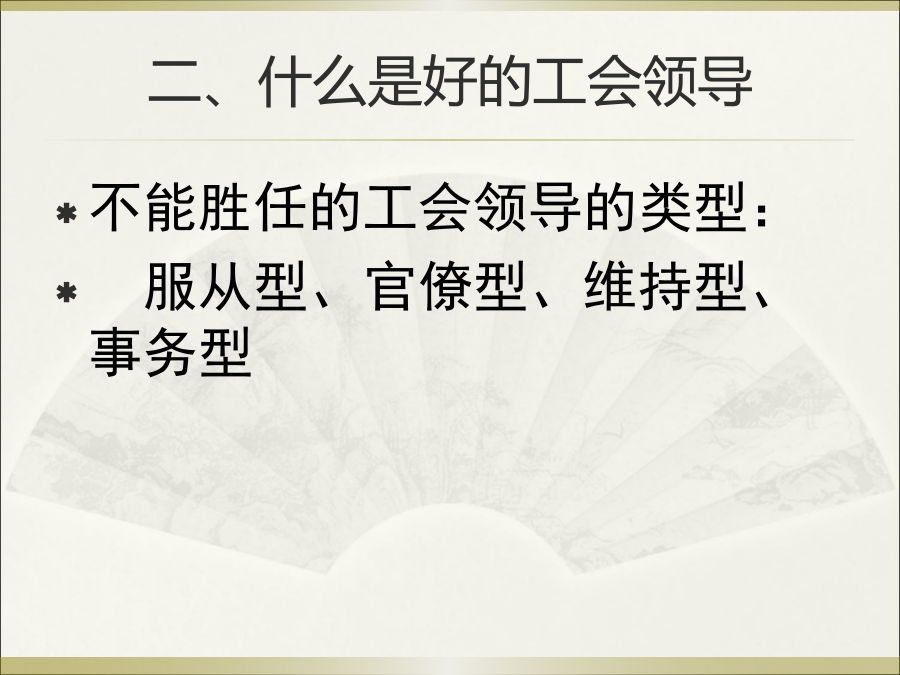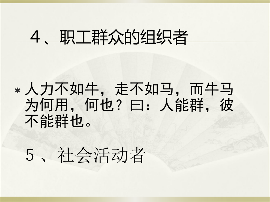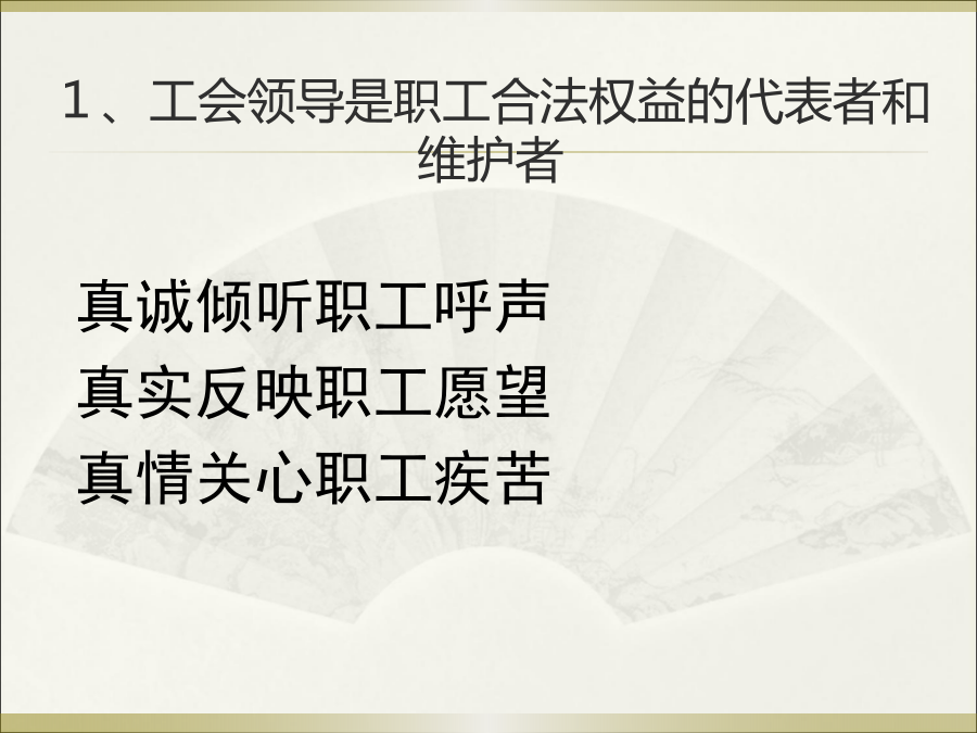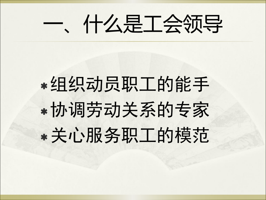 工会领导的方法与艺术一、什么是工会领导1、工会领导是职工合法权益的代表者和维护者2、是职工群众的教育者3、劳动关系的协调者4、职工群众的组织者二、什么是好的工会领导领导者的类型韩非子:上君尽人之能中君尽人之力下君尽已之能领导艺术的真谛:感召力三、怎样当好工会领导爷爷奶奶们后悔什么?“五子到位”:“六有工会”:2、围绕大局,服务中心3、方圆结合,提高艺术力戒三味:4、积极参与,切实维权温州市各级工会按照“追求一个目标、遵循三项原则、采取多种形式”的要求,推进非公企业民主管理:(1)协商谈判的“十要”技巧(2)把握“十谈”火候5、感情沟通,关心职工杭州市总工会:关心职工“八到家”:绍兴市总工会不断深化义乌工会维权经验,推进主动依法科学维权:6、谦虚诚实、尊重他人7、宽以待人,容纳百川8、百折不挠,应对挫折9、尊重首创,鼓励探索10、协调各方,宣传自己