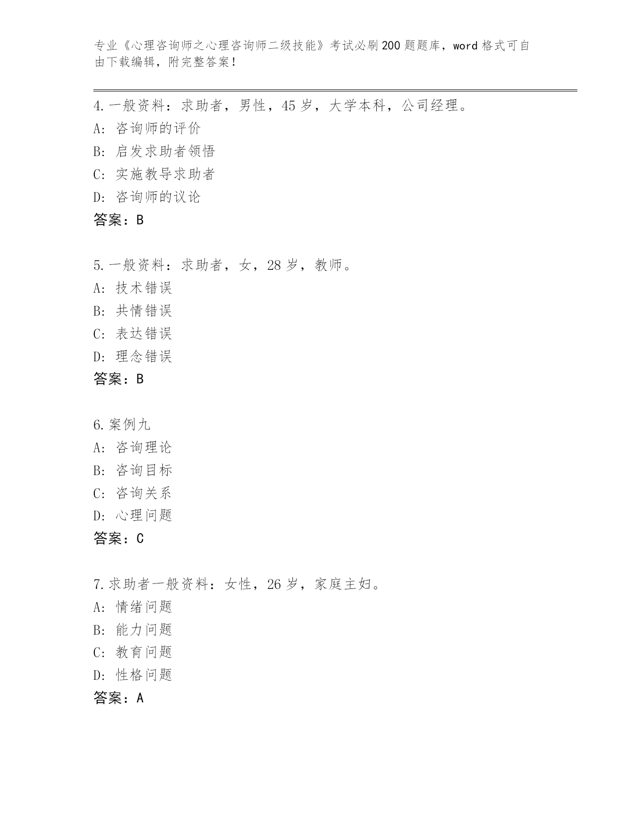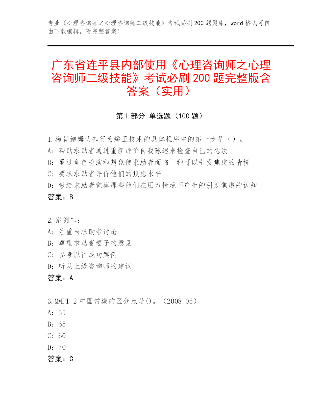 广东省连平县内部使用《心理咨询师之心理咨询师二级技能》考试必刷200题完整版含答案(实用)