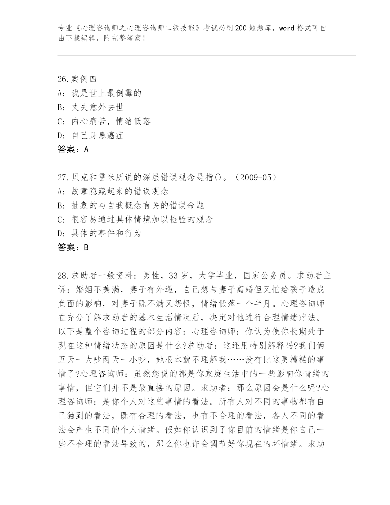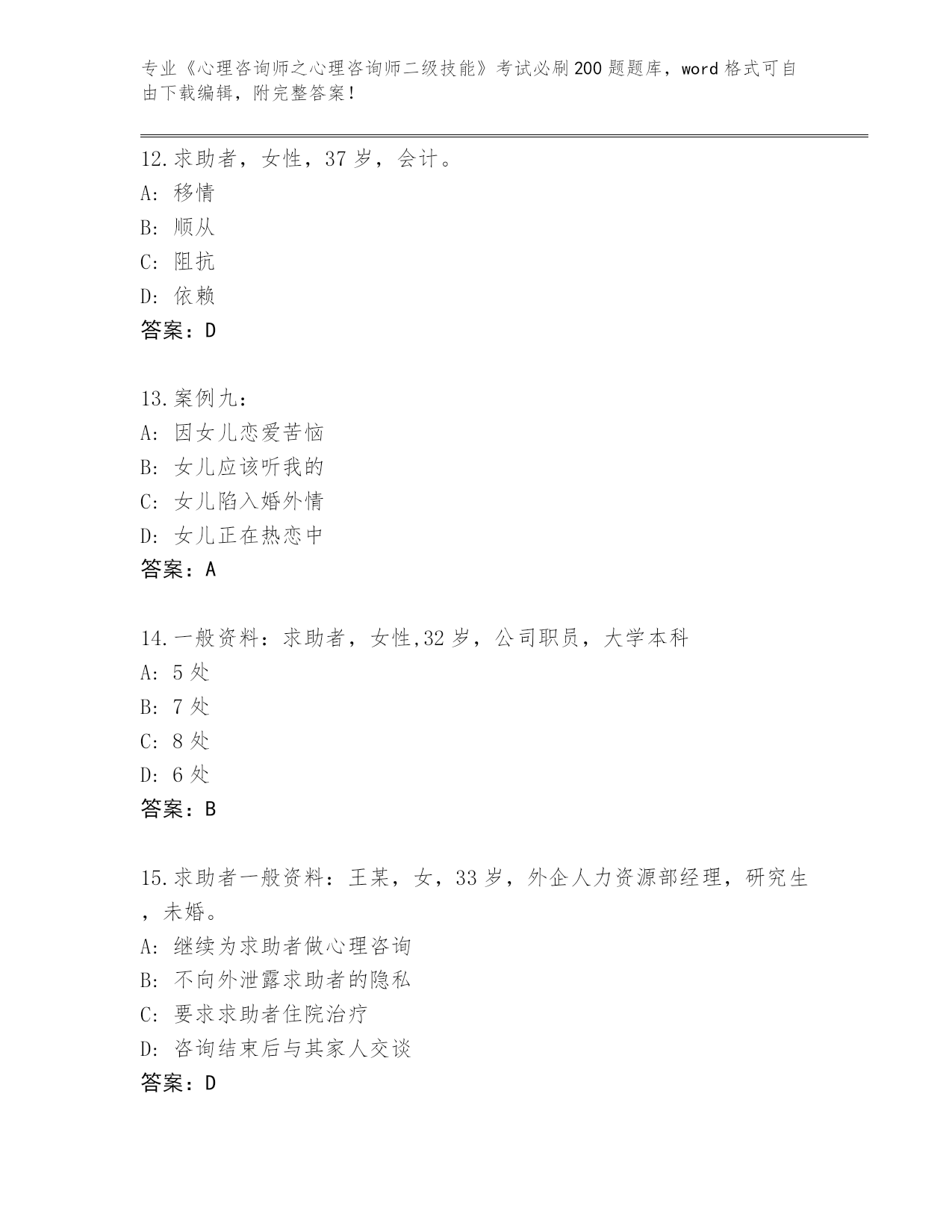 重庆市南岸区内部使用《心理咨询师之心理咨询师二级技能》考试必刷200题内部题库含答案【实用】