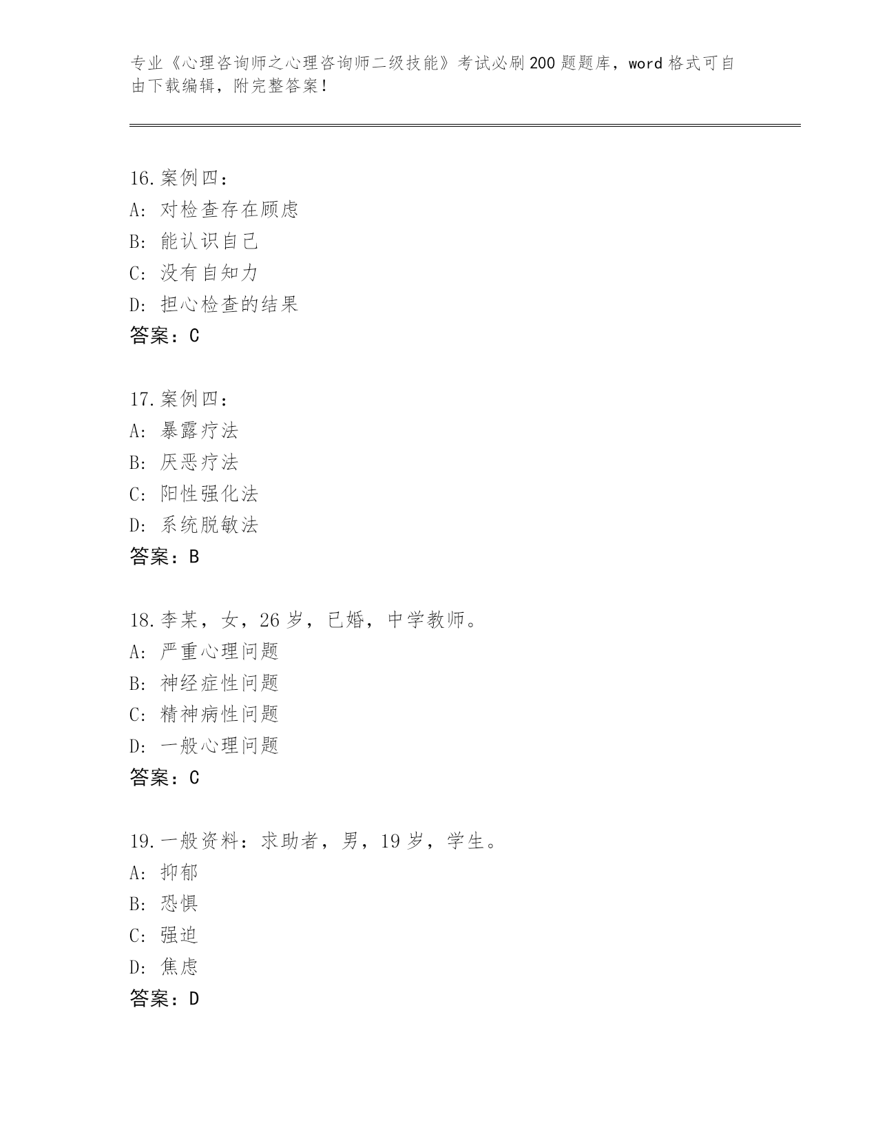 内部使用甘肃省《心理咨询师之心理咨询师二级技能》资格考试必刷200题真题含答案【实用】