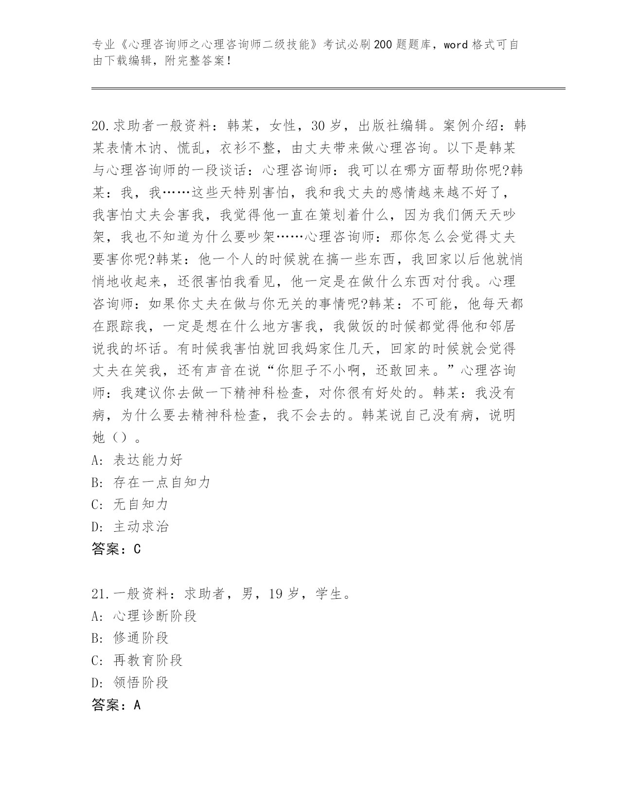陕西省内部使用《心理咨询师之心理咨询师二级技能》考试必刷200题题库含答案(完整版)