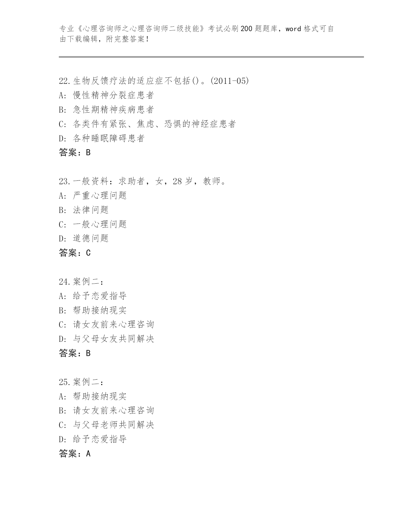 安徽省内部使用《心理咨询师之心理咨询师二级技能》考试必刷200题含答案AB卷