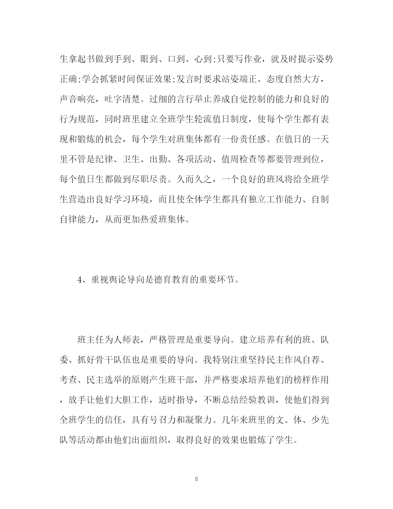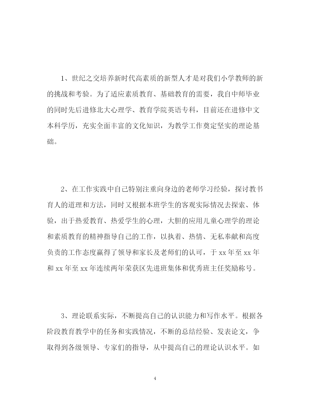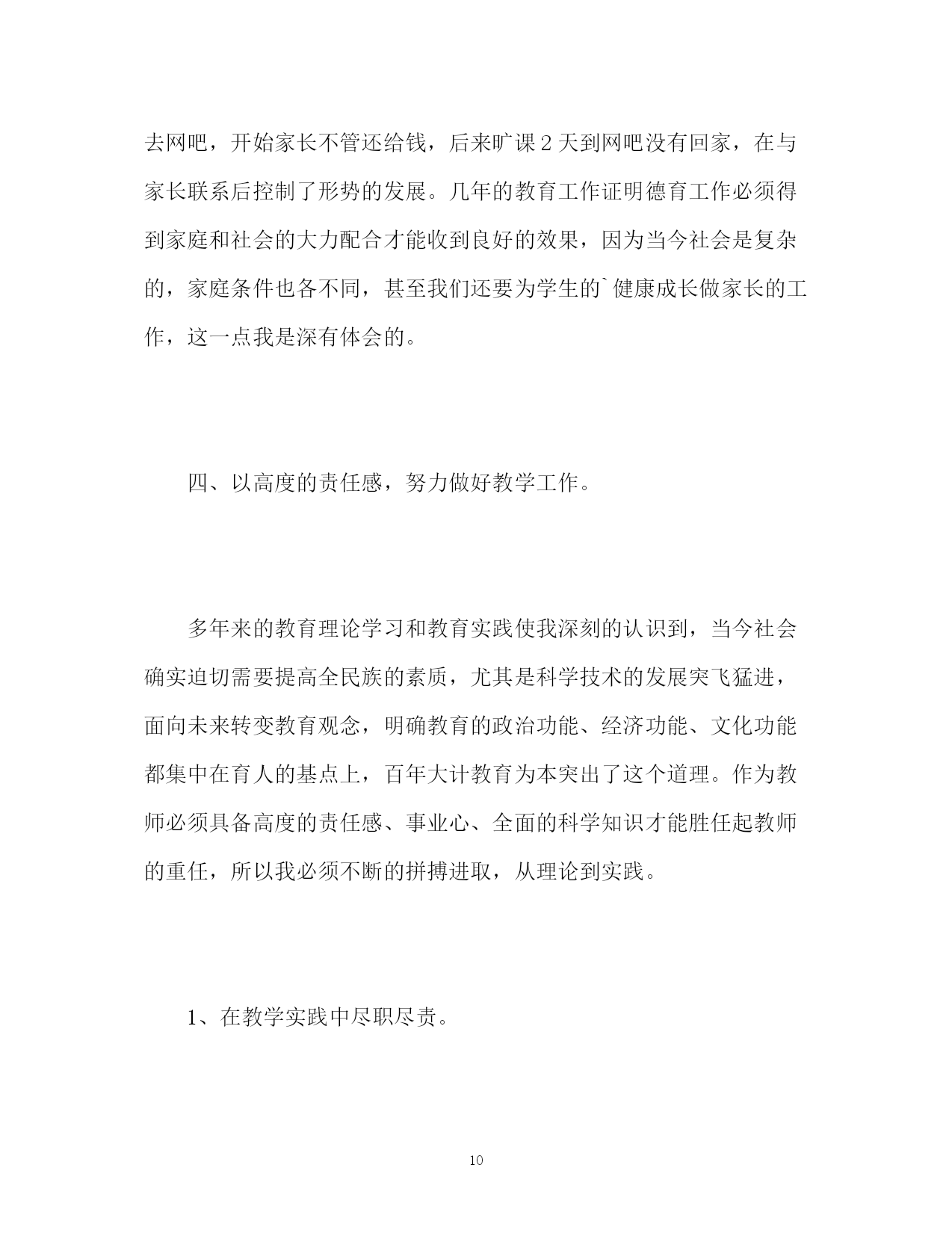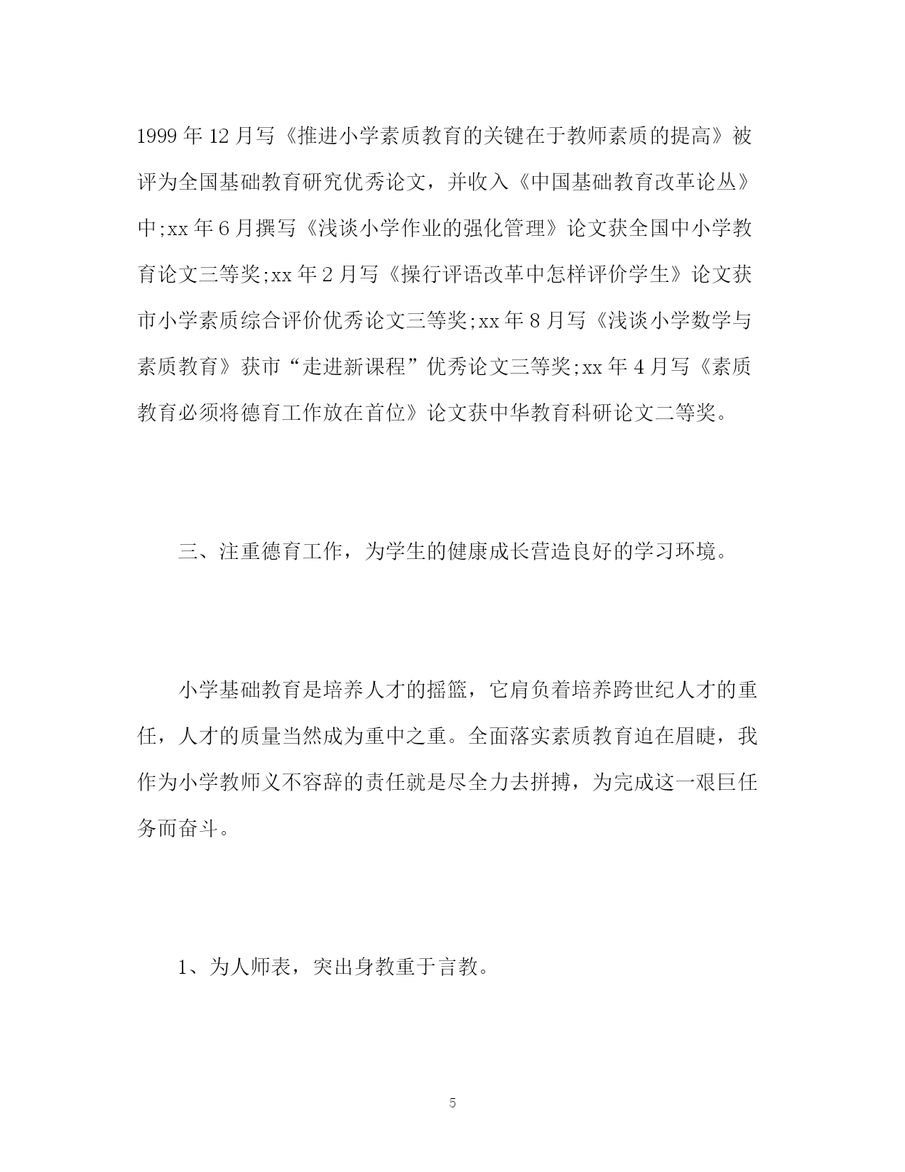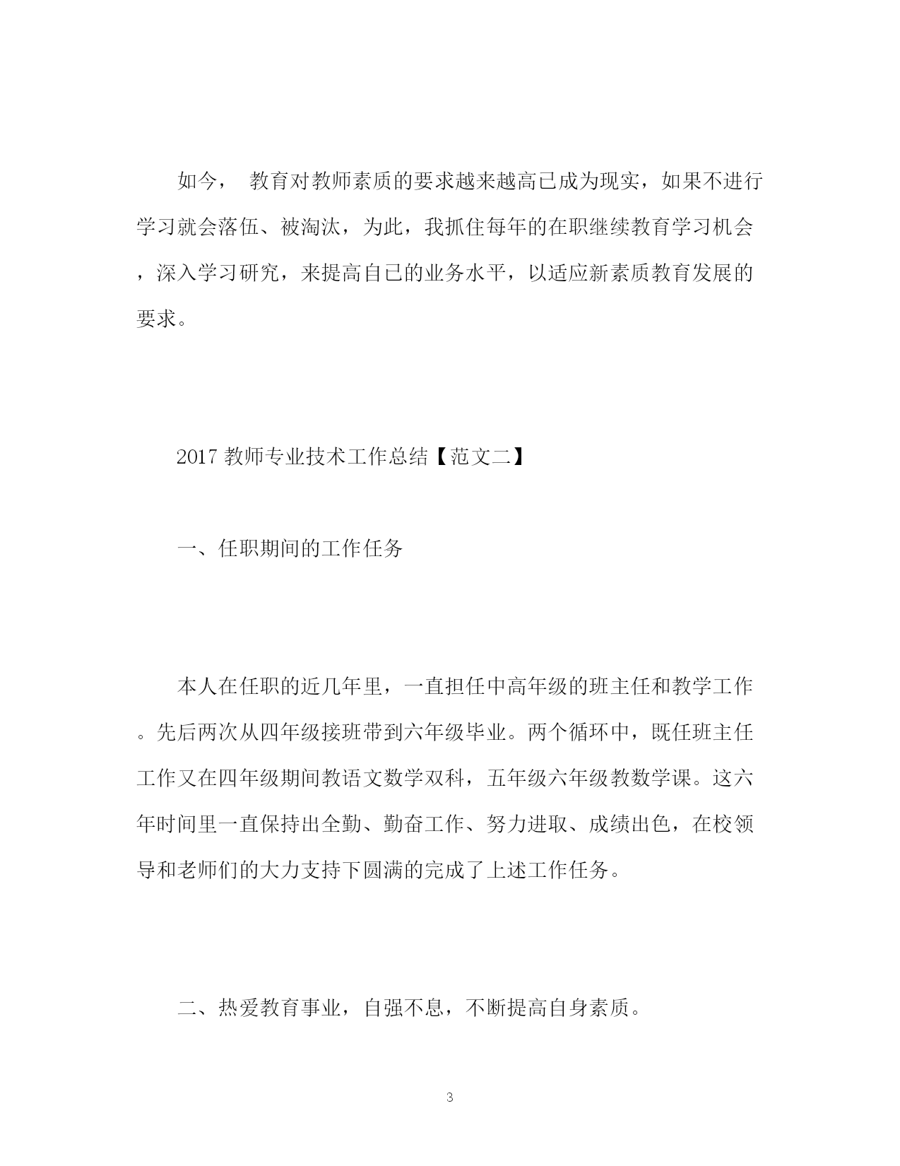 此资料由网络收集而来,如有侵权请告知上传者立即删除。资料共分享,我们负责传递知识。PAGEPAGE13教师专业技术工作总结2017教师专业技术工作总结在工作实践中自己特别注重向身边的老师学习经验,做好总结,以下是小编搜罗的2017教师专业技术工作总结内容,希望对你有帮助。2017教师专业技术工作总结【范文一】本人自任小学一级教师以来,以更加饱满的工作热情,奋发向上的精神,积极完成本职工作。在党和上级领导的关怀和帮助下,思想进步,积极进取,团结同事,遵纪守法,响应学校的号召。能积极执行党的各项方针政策,努力提高自已的政治思想觉悟,不断加强自身品德修养,以适应新形势下教育的需要。在工作中任劳任怨,扎实求进,服从领导,听从学校一切安排,从不计较个人得失,保质保量完成各项工作任务。本人在教学工作和班主任工作中一直尽职尽责。工作中本人能够认真钻研大纲,研究教法,细心备课,不断加强教学理论的学习,为适应教育改革发展的要求,积极吸取先进教师的教学经验,以适应新素质教育的要求。但教学有法,教无定法,工作之余我不断充实自已、丰富自我,为了自已教法的更新,不断加强业务学习,积极听取有丰富经验的教师的讲课,学习新的教学理论,特别注重学生对基础知识的掌握程度,因此近几年我的教学水平大幅度提高,所任课班级学科成绩一直名列榜首。当然,教师不但要教书,更重要的是教给学生怎样做人。为此,我在班主任工作中,本着“树人先正已”的工作作风,来管理班级,影响学生的品行。凡是要求学生做到的,自已首先要做到,同时经常对学生进行耐心细致的思想工作,做到晓之以理、动之以情、导之以行。几年来所担任的班级,班风正,学风浓,成绩优异,受到学校领导和家长的好评,本人也获得了“优秀班主任”的称号。如今,教育对教师素质的要求越来越高已成为现实,如果不进行学习就会落伍、被淘汰,为此,我抓住每年的在职继续教育学习机会,深入学习研究,来提高自已的业务水平,以适应新素质教育发展的要求。2017教师专业技术工作总结【范文二】一、任职期间的工作任务本人在任职的近几年里,一直担任中高年级的班主任和教学工作。先后两次从四年级接班带到六年级毕业。两个循环中,既任班主任工作又在四年级期间教语文数学双科,五年级六年级教数学课。这六年时间里一直保持出全勤、勤奋工作、努力进取、成绩出色,在校领导和老师们的大力支持下圆满的完成了上述工作任务。二、热爱教育事业,自强不息,不断提高自身素质。1、世纪之交培养新时代高素质的新型人才是对我们小学教师的新的挑战和考验。为了适应素质教育、基础教育的需要,我自中师毕业的同时先后进修北大心理学、教育学院英语专科,目前还在进修中文本科学历,充实全面丰富的文化知识,为教学工作奠定坚实的理论基础。2、在工作实践中自己特别注重向身边的老师学习经验,探讨教书育人的道理和方法,同时又根据本班学生的客观实际情况去探索、体验,出于热爱教育、热爱学生的心理,大胆的应用儿童心理学的理论和素质教育的精神指导自己的工作,以执着、热情、无私奉献和高度负责的工作态度赢得了领导和家长及老师们的认可,于xx年至xx年和xx年至xx年连续两年荣获区先进班集体和优秀班主任奖励称号。3、理论联系实际,不断提高自己的认识能力和写作水平。根据各阶段教育教学中的任务和实践情况,不断的总结经验、发表论文,争取得到各级领导、专家们的指导,从中提高自己的理论认识水平。如1999年12月写《推进小学素质教育的关键在于教师素质的提高》被评为全国基础教育研究优秀论文,并收入《中国基础教育改革论丛》中;xx年6月撰写《浅谈小学作业的强化管理》论文获全国中小学教育论文三等奖;xx年2月写《操行评语改革中怎样评价学生》论文获市小学素质综合评价优秀论文三等奖;xx年8月写《浅谈小学数学与素质教育》获市“走进新课程”优秀论文三等奖;xx年4月写《素质教育必须将德育工作放在首位》论文获中华教育科研论文二等奖。三、注重德育工作,为学生的健康成长营造良好的学习环境。小学基础教育是培养人才的摇篮,它肩负着培养跨世纪人才的重任,人才的质量当然成为重中之重。全面落实素质教育迫在眉睫,我作为小学教师义不容辞的责任就是尽全力去拼搏,为完成这一艰巨任务而奋斗。1、为人师表,突出身教重于言教。班主任在学生心目中是一个举足轻重的人物,他的一言一行都起到潜移默化的作用,对学生的道德认知、情感产生具有强烈持久的影响,这是我深有切身感受的体验。不管在生活、学习、工作中,由于学生的认知能力和班主任施教地位这种特殊的关系,足以成为学生效仿的榜样。教师就是一面镜子,一本书。所以我深知要规范学生的行为,首先要规范自己的行为,提高学生的素质首先要提高自己的素