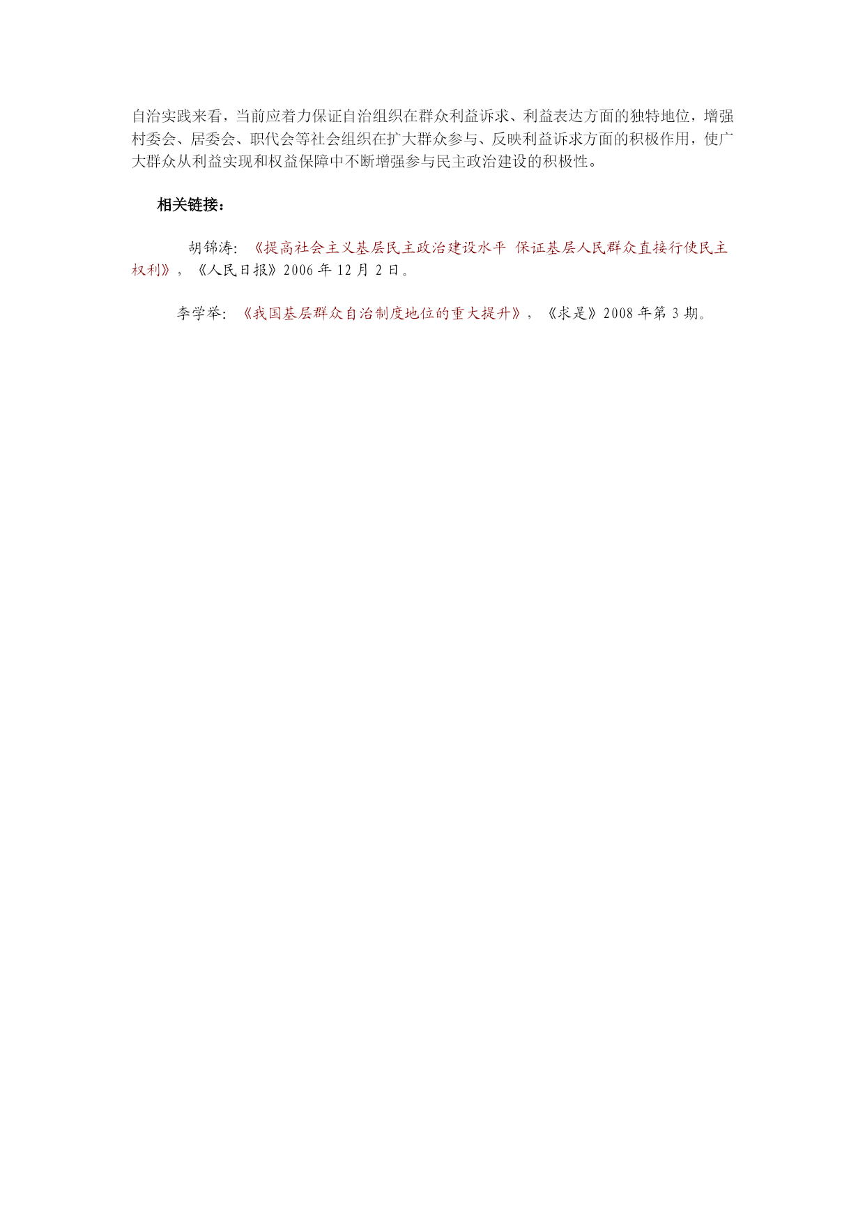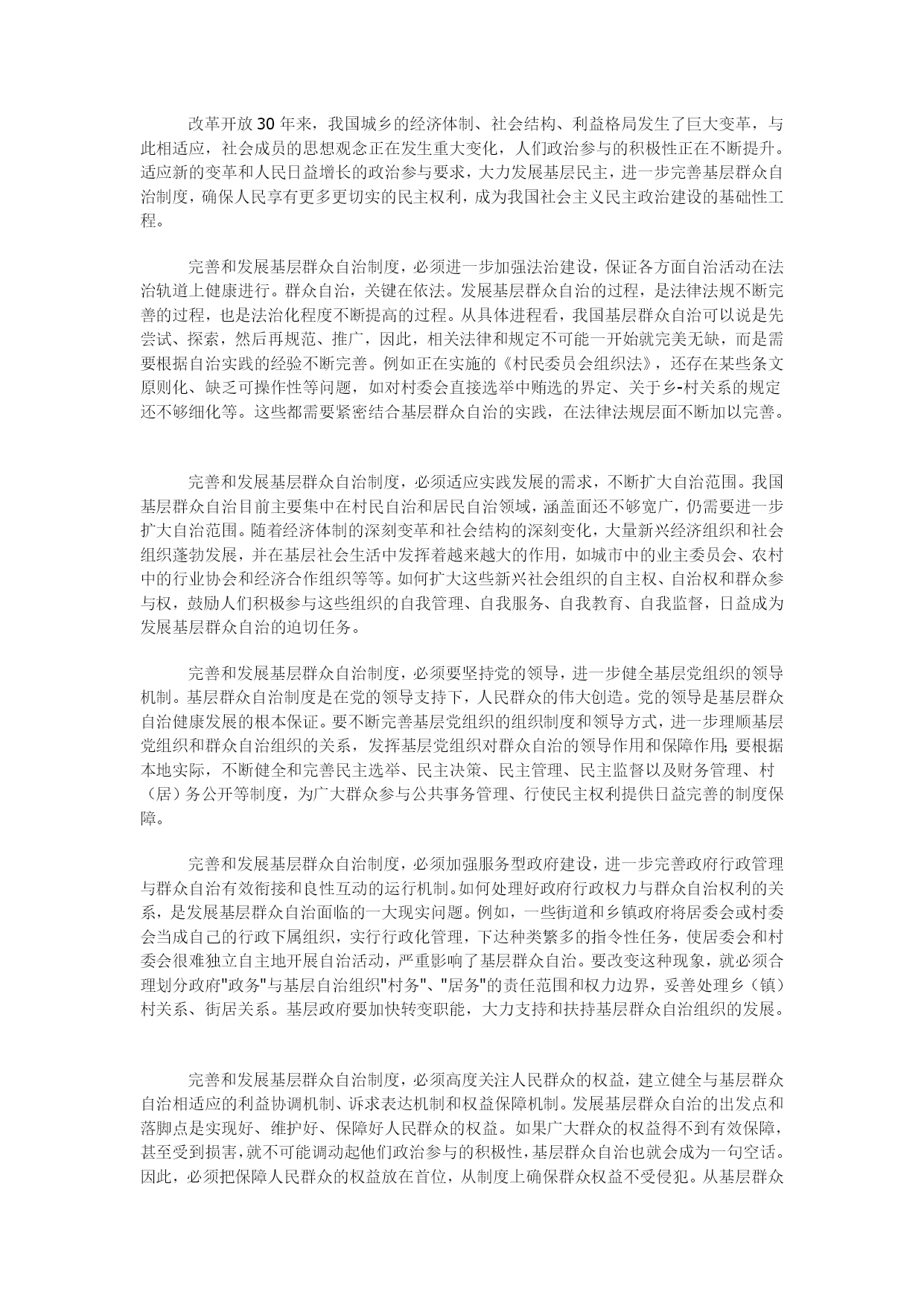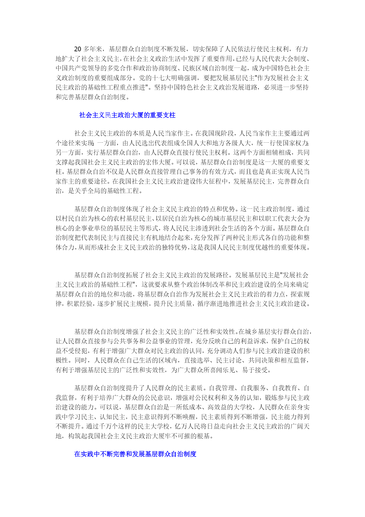 理论热点面对面之十:发展社会主义民主政治的基础性工程发展社会主义民主政治的基础性工程——为什么要坚持和完善基层群众自治制度广西宜州,一个在中国版图上并不引人注目的边远古城,却有两件事足以使当地人备感自豪。其一,宜州是传说中"歌仙"刘三姐的故乡。其二,这里曾开创了中国农村村民自治的先河。1980年2月5日,宜州屏南乡合寨村里一棵五人合抱的大樟树下,85户村民代表分别在一张两指宽的纸条上,以无记名方式投下了自己神圣的一票,选举产生了新的管理组织--村民委员会。当时的村民们并没有意识到,正是他们布满老茧的手,拉开了中国农村村民自治的历史序幕!两年之后,农村村民委员会与城市居民委员会一道作为基层群众性自治组织正式载入我国宪法。如今,合寨村那块写有"村民委员会"字样的木牌,已经成为中国基层民主政治发展的历史见证。基层群众自治制度是人民群众的伟大创造基层群众自治是社会主义民主的直接体现,是人民当家作主最有效、最广泛的实现途径。我们党在准确把握社会主义民主政治发展规律的基础上,把基层群众自治制度提升为我国政治制度的一项基本内容,顺应了时代潮流,符合党心民心,必将对中国政治发展进程产生深远的影响。基层群众自治制度的典型特征是直接民主和自我管理。人民群众直接选举居民委员会和村民委员会,决定与自身利益相关的事务,反映自己的利益诉求,维护自身权益,直接参与基层公共事务和公益事业的管理。这样一种深深扎根于人民群众的民主制度,不仅可以充分调动和发挥广大群众的积极性和创造力,而且有利于人们根据本地实际进行政治建设,用民主的方式化解社会矛盾,融洽人际关系,建设幸福家园,创造美好生活。我国基层群众自治制度最早发源于城市。新中国成立之初,北京、天津、武汉等一些城市出现了由群众自己组织起来的防护队、居委会和居民组等群众性自治组织。20世纪80年代以后,随着社会主义市场经济体制改革的不断推进,社会成员固定从属于某一个党政机关或企事业单位的社会组织管理体制逐步被打破,原来由"单位"承担的教育、医疗、卫生和住房保障等职能逐步转移到社会,这些都迫切要求城市基层管理体制进行相应变革,以加强社会管理和社会服务。正是在这样一种改革的大背景下,城市居民自治组织应运而生,逐步发展成为城市基层群众自治制度。在我国广大农村,村民自治更是农村经济政治体制改革的直接产物,是广大农民群众的伟大创举。党的十一届三中全会后,农村改革蓬勃推进,以"大包干"为主要形式的家庭联产承包责任制取代了"政社合一、集中经营"的人民公社制,并在全国迅速推开。这一伟大变革,一方面使农民群众获得了生产经营自主权,极大地调动了生产积极性;另一方面也催生了农民群众自我管理、自我服务的要求,以改变一些地方出现的基层管理缺位和村庄无序状况。此后,村民委员会等群众自治组织雨后春笋般地发展起来,在加强农村管理、推动农村建设中发挥了重要作用。由此可见,我国基层群众自治制度,适应了城乡经济体制改革和经济社会发展的要求,是人民群众的伟大创造。通过基层群众自治,人民群众自主管理自己的事务,这是我国基层社会组织与治理方式的重大变革和创新。20多年来,基层群众自治制度不断发展,切实保障了人民依法行使民主权利,有力地扩大了社会主义民主,在社会主义政治生活中发挥了重要作用,已经与人民代表大会制度、中国共产党领导的多党合作和政治协商制度、民族区域自治制度一起,成为中国特色社会主义政治制度的重要组成部分。党的十七大明确强调,要把发展基层民主"作为发展社会主义民主政治的基础性工程重点推进"。坚持中国特色社会主义政治发展道路,必须进一步坚持和完善基层群众自治制度。社会主义民主政治大厦的重要支柱社会主义民主政治的本质是人民当家作主。在我国现阶段,人民当家作主主要通过两个途径来实现:一方面,由人民选出代表组成全国人大和地方各级人大,统一行使国家权力;另一方面,实行基层群众自治,由人民群众直接行使民主权利。这两个方面相辅相成,共同支撑起我国社会主义民主政治的宏伟大厦。可以说,基层群众自治制度是这一大厦的重要支柱。基层群众自治不仅是人民群众直接管理自己事务的有效方式,而且也是真正实现人民当家作主的重要途径。在我国社会主义民主政治建设伟大征程中,发展基层民主,完善群众自治,是关乎全局的基础性工程。基层群众自治制度体现了社会主义民主政治的特点和优势。这一民主政治制度,通过以村民自治为核心的农村基层民主、以居民自治为核心的城市基层民主和以职工代表大会为核心的企事业单位的基层民主等形式,将人民民主渗透到社会生活的各个方面。基层群众自治制度把代表制民主与直接民主有机地结合起来,充分发挥了两种民主形式各自的功能和整体合力,从而形成社会主义民主政治的独特优势,这是我国人民民主制度优越性的重要体现。基层群众自治制度拓展了社会主义民主政治的发展路径