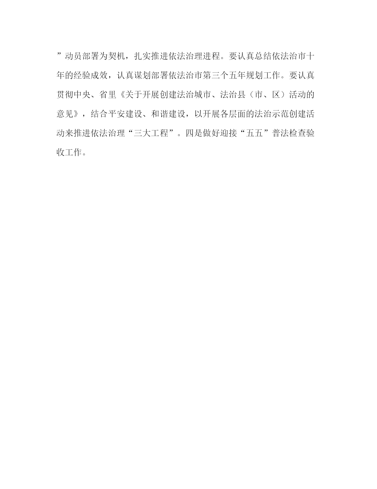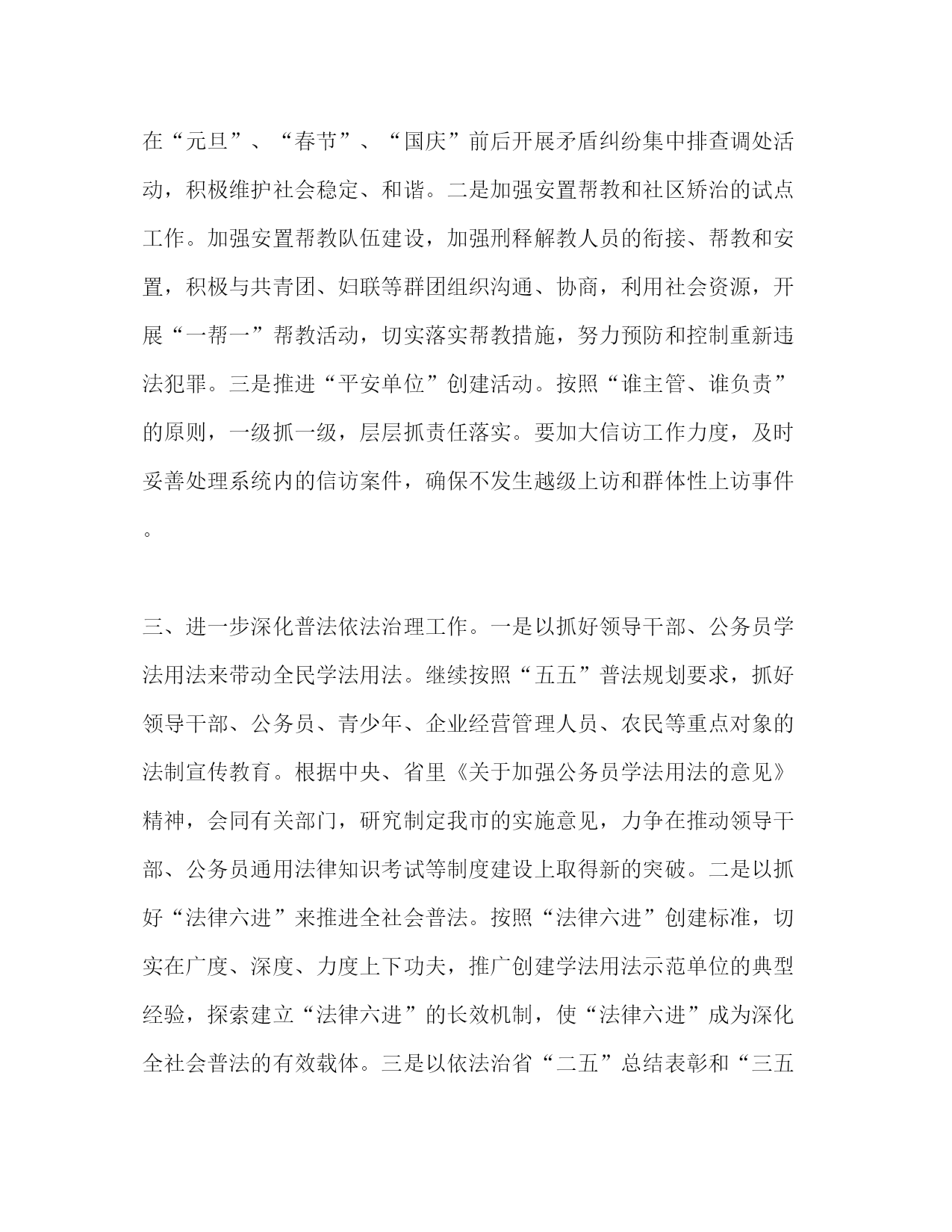 PAGE此资料由网络收集而来,如有侵权请告知上传者立即删除。资料共分享,我们负责传递知识。2020年市司法局工作思路一、进一步加强法律服务工作一是服务好经济建设。要坚持围绕中心、服务大局,进一步拓展法律服务领域,提高服务水平。引导律师积极介入金融风险防范、企业破产重组、公司投资融资、劳动争议等领域。切实做好政府法律顾问工作和企业顾问工作,为政府、企业发展提供优质法律服务。要积极拓展基层法律服务所法律顾问工作,为乡镇、村居担任法律顾问,推进基层依法治理进程。要努力拓展公证服务领域,切实在重大工程建设、重要民商事活动和征地拆迁安置、企业经营和农村改革中充分发挥公证证明作用。二是服务好农村改革发展。要紧紧围绕农村改革发展,继续开展“法律服务进乡村”法律志愿团活动,深入基层、深入群众,开展法制宣传、法律服务,推动法律服务进乡村,切实维护群众合法权益,推动村(居)提高自治管理能力和水平,推进农村民主法治建设,促进农村和谐稳定。三是服务好民生。要认真履职,提高办理诉讼和非诉讼法律事务的质量,促进社会公平正义;要继续开展法律服务“六进”活动,积极办理涉及群众就业、就学、就医、社会保障等民生问题的案件;同时要建立健全法律援助工作制度和工作网络,简化审批手续;要积极主动推出便民措施,不断提高服务效率,提高服务水平和服务质量。四是加强律师队伍建设。认真贯彻落实《律师法》和《公证法》加强我市律师事务所和公证处规范化建设。严格依据国家法律法规,加大律师公证法律服务市场的监管力度,继续强化律师、公证队伍的职业道德和执业纪律教育,全面提高其综合素质,推动我市法律服务业的健康发展。五是强化律师维稳责任。积极引导律师参与信访接访、参与政府处置涉法涉诉信访问题,健全落实律师代理重大敏感案件、群体性事件和黑恶势力犯罪案件的报告制度,强化对律师办理这类案件的指导监督,确保社会效果与法律效果的统一。组织律师参与巡回调解和联调联动活动,发挥律师专业优势和作用。二、进一步做好维护社会和谐稳定的各项工作一是加大人民调解工作力度。组织举办调解业务培训班,提高调委会主任业务水平和工作能力。要进一步深化“十百千万”人民调解示范创建活动,认真完善和落实矛盾纠纷排查调处工作机制,进一步夯实矛盾纠纷排查例会、巡回调解和调解衔接等工作平台,特别是要巩固和发展人民调解与行政调解联动工作,着力化解劳动争议、医患纠纷、征地拆迁等事关民生的社会热点和难点纠纷,进一步增强人民调解与行政调解联调联动的社会效果。坚持开展民间纠纷常规排查调处活动,使各类纠纷在萌芽状态被消灭,在基层被化解,维护社会稳定。在“元旦”、“春节”、“国庆”前后开展矛盾纠纷集中排查调处活动,积极维护社会稳定、和谐。二是加强安置帮教和社区矫治的试点工作。加强安置帮教队伍建设,加强刑释解教人员的衔接、帮教和安置,积极与共青团、妇联等群团组织沟通、协商,利用社会资源,开展“一帮一”帮教活动,切实落实帮教措施,努力预防和控制重新违法犯罪。三是推进“平安单位”创建活动。按照“谁主管、谁负责”的原则,一级抓一级,层层抓责任落实。要加大信访工作力度,及时妥善处理系统内的信访案件,确保不发生越级上访和群体性上访事件。三、进一步深化普法依法治理工作。一是以抓好领导干部、公务员学法用法来带动全民学法用法。继续按照“五五”普法规划要求,抓好领导干部、公务员、青少年、企业经营管理人员、农民等重点对象的法制宣传教育。根据中央、省里《关于加强公务员学法用法的意见》精神,会同有关部门,研究制定我市的实施意见,力争在推动领导干部、公务员通用法律知识考试等制度建设上取得新的突破。二是以抓好“法律六进”来推进全社会普法。按照“法律六进”创建标准,切实在广度、深度、力度上下功夫,推广创建学法用法示范单位的典型经验,探索建立“法律六进”的长效机制,使“法律六进”成为深化全社会普法的有效载体。三是以依法治省“二五”总结表彰和“三五”动员部署为契机,扎实推进依法治理进程。要认真总结依法治市十年的经验成效,认真谋划部署依法治市第三个五年规划工作。要认真贯彻中央、省里《关于开展创建法治城市、法治县(市、区)活动的意见》,结合平安建设、和谐建设,以开展各层面的法治示范创建活动来推进依法治理“三大工程”。四是做好迎接“五五”普法检查验收工作。
