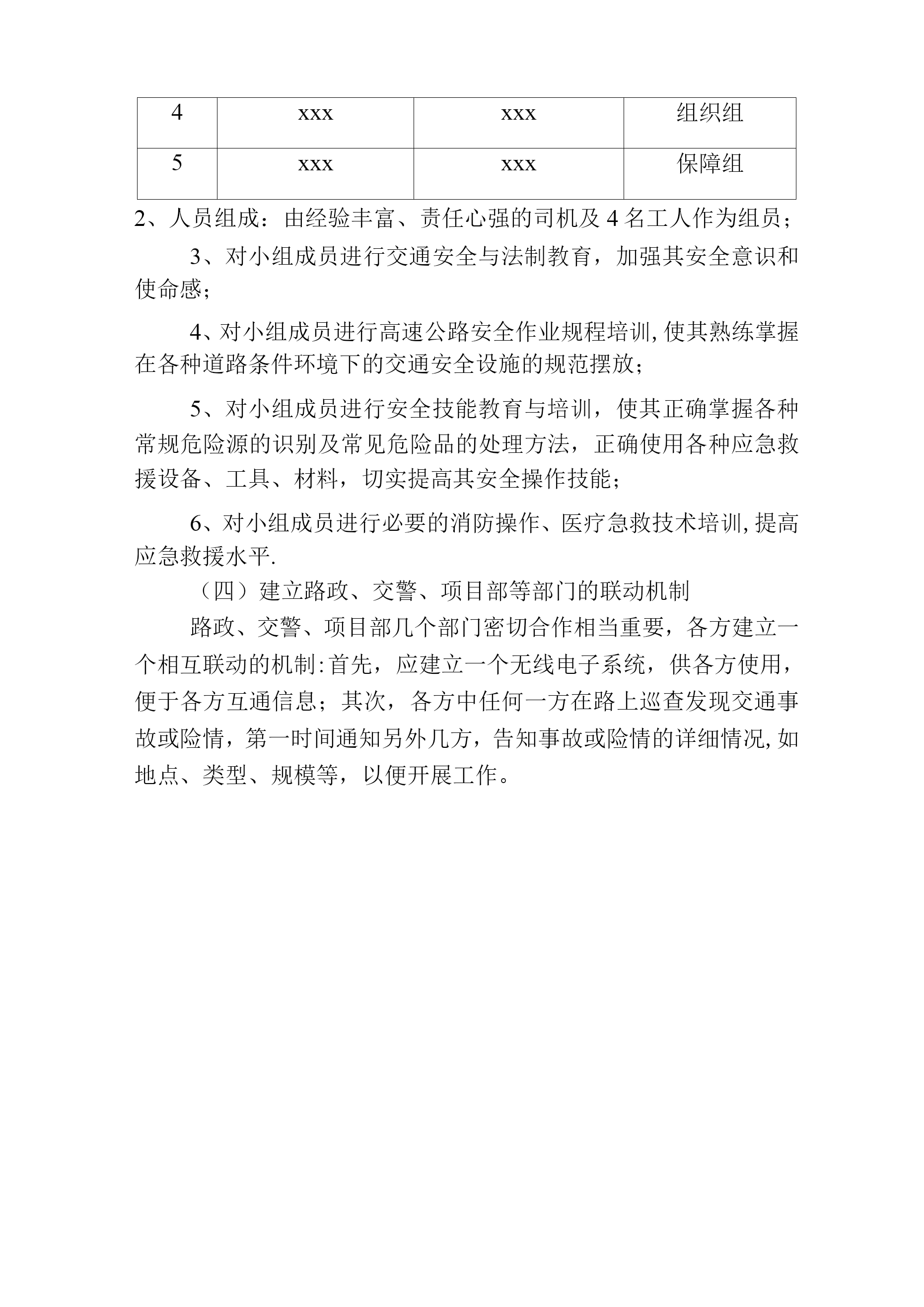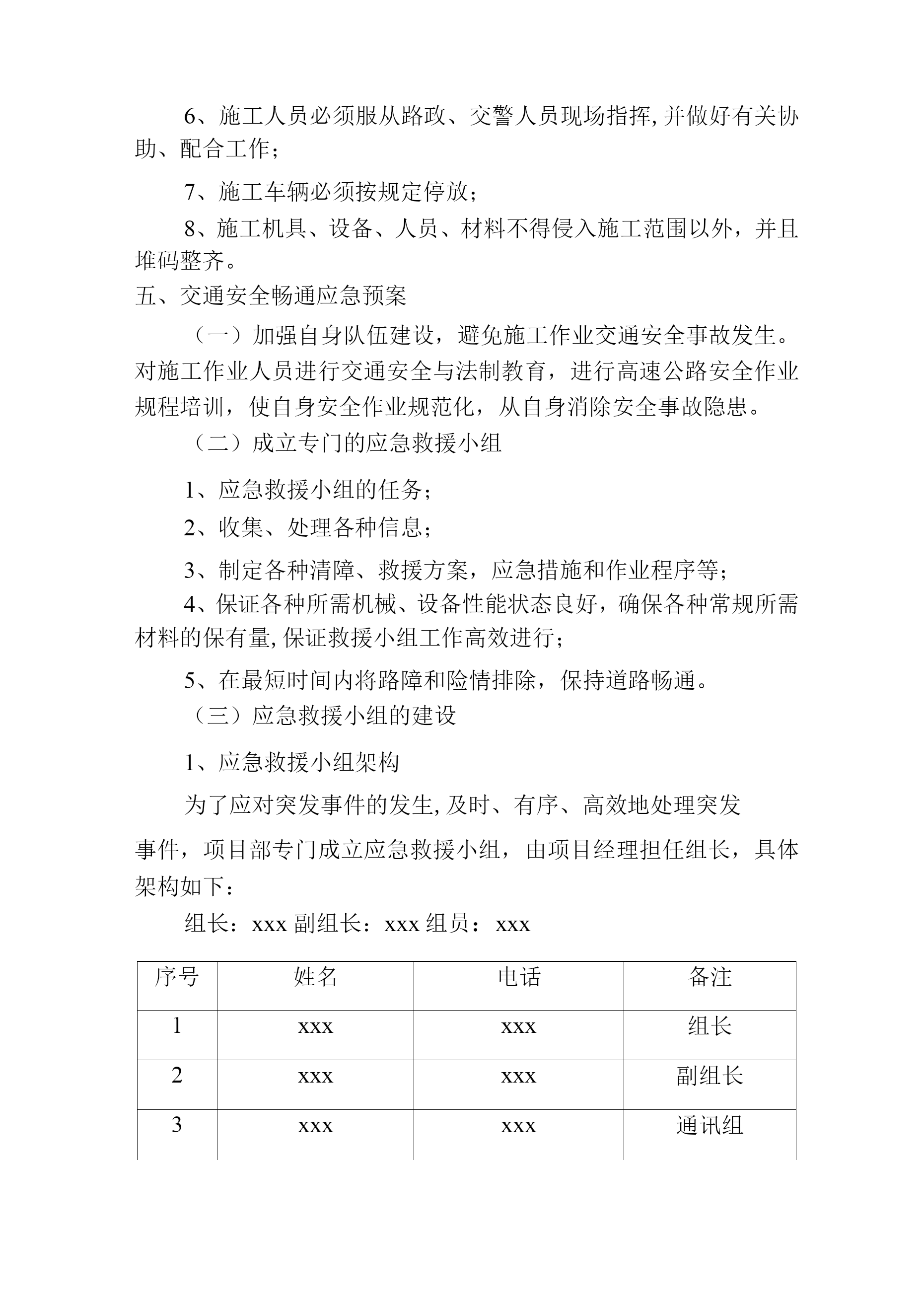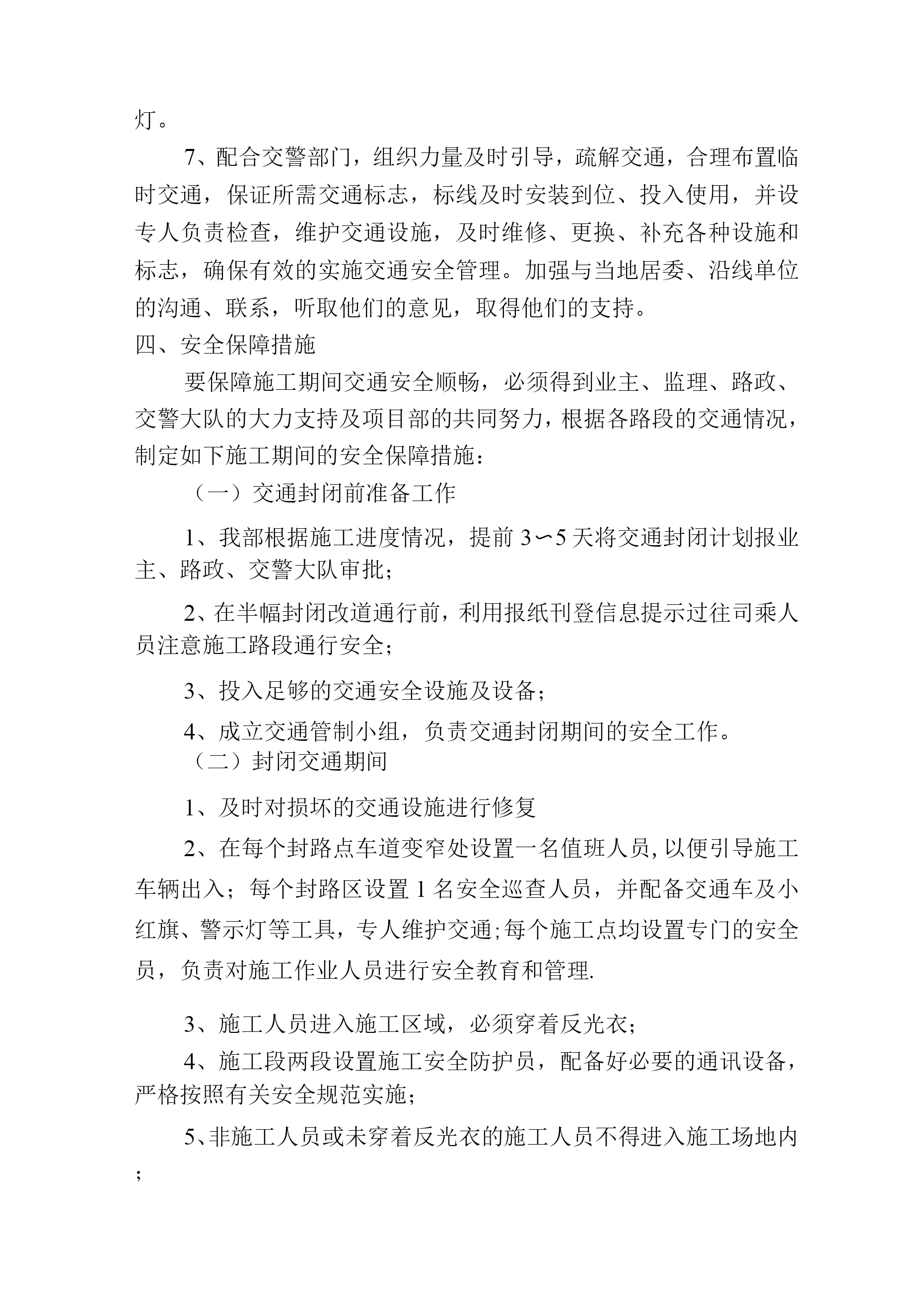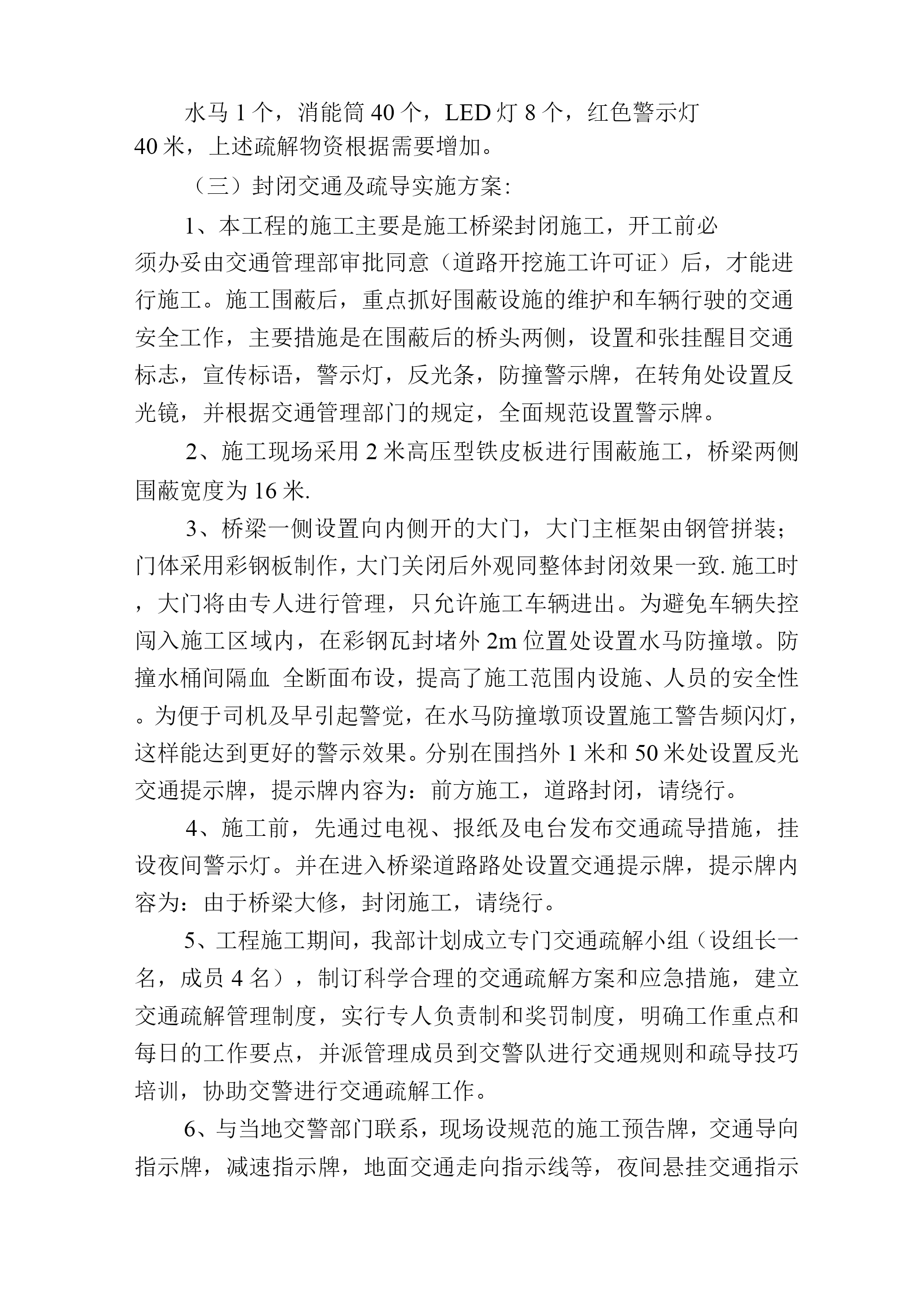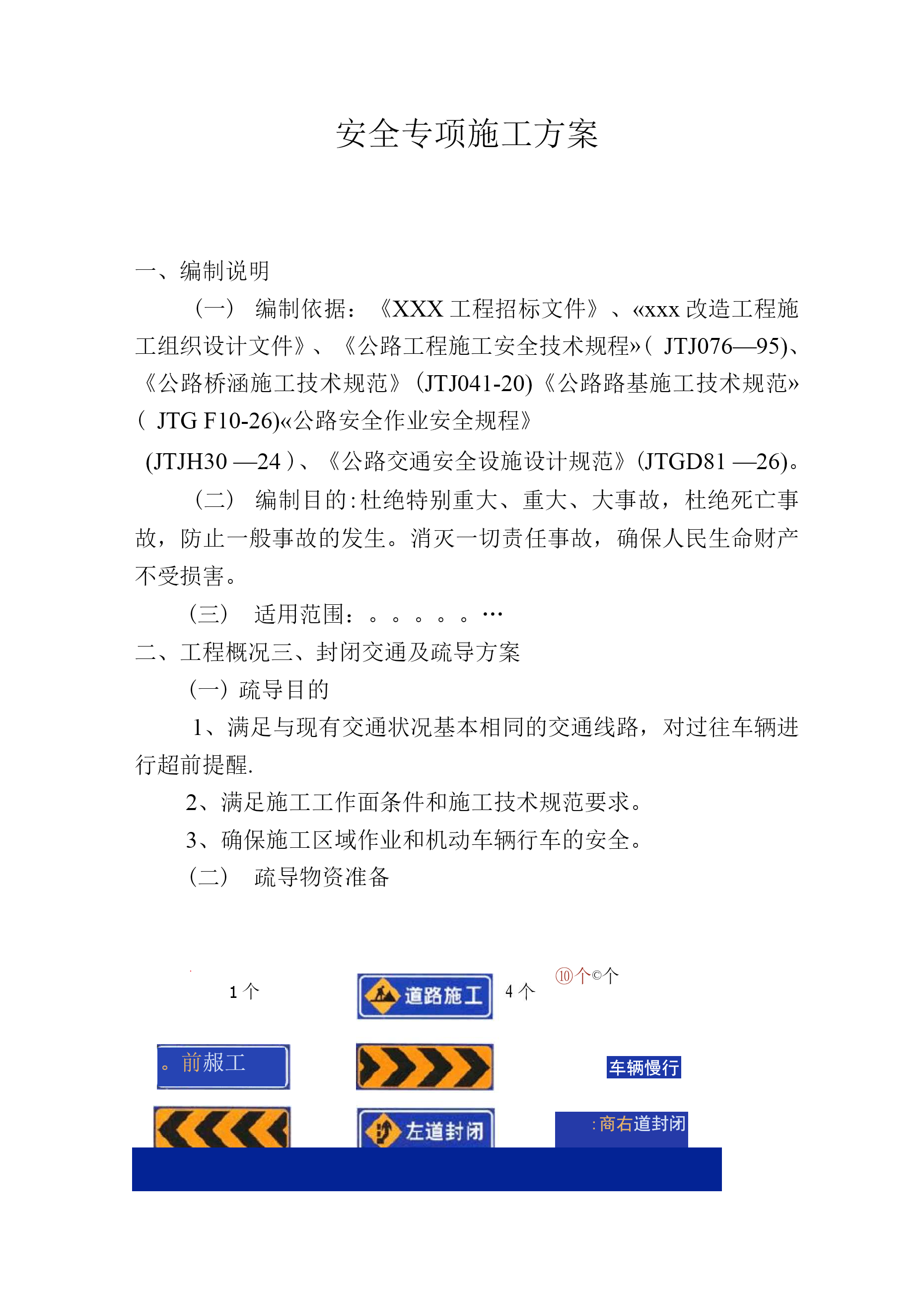 安全专项施工方案一、编制说明编制依据:《XXX工程招标文件》、«xxx改造工程施工组织设计文件》、《公路工程施工安全技术规程»(JTJ076—95)、《公路桥涵施工技术规范》(JTJ041-20)《公路路基施工技术规范»(JTGF10-26)«公路安全作业安全规程》(JTJH30—24)、《公路交通安全设施设计规范》(JTGD81—26)。编制目的:杜绝特别重大、重大、大事故,杜绝死亡事故,防止一般事故的发生。消灭一切责任事故,确保人民生命财产不受损害。适用范围:。。。。。…二、工程概况三、封闭交通及疏导方案疏导目的1、满足与现有交通状况基本相同的交通线路,对过往车辆进行超前提醒.2、满足施工工作面条件和施工技术规范要求。3、确保施工区域作业和机动车辆行车的安全。疏导物资准备.1个。前赧工:商右道封闭⑩个©个车辆慢行水马1个,消能筒40个,LED灯8个,红色警示灯40米,上述疏解物资根据需要增加。(三)封闭交通及疏导实施方案:1、本工程的施工主要是施工桥梁封闭施工,开工前必须办妥由交通管理部审批同意(道路开挖施工许可证)后,才能进行施工。施工围蔽后,重点抓好围蔽设施的维护和车辆行驶的交通安全工作,主要措施是在围蔽后的桥头两侧,设置和张挂醒目交通标志,宣传标语,警示灯,反光条,防撞警示牌,在转角处设置反光镜,并根据交通管理部门的规定,全面规范设置警示牌。2、施工现场采用2米高压型铁皮板进行围蔽施工,桥梁两侧围蔽宽度为16米.3、桥梁一侧设置向内侧开的大门,大门主框架由钢管拼装;门体采用彩钢板制作,大门关闭后外观同整体封闭效果一致.施工时,大门将由专人进行管理,只允许施工车辆进出。为避免车辆失控闯入施工区域内,在彩钢瓦封堵外2m位置处设置水马防撞墩。防撞水桶间隔血全断面布设,提高了施工范围内设施、人员的安全性。为便于司机及早引起警觉,在水马防撞墩顶设置施工警告频闪灯,这样能达到更好的警示效果。分别在围挡外1米和50米处设置反光交通提示牌,提示牌内容为:前方施工,道路封闭,请绕行。4、施工前,先通过电视、报纸及电台发布交通疏导措施,挂设夜间警示灯。并在进入桥梁道路路处设置交通提示牌,提示牌内容为:由于桥梁大修,封闭施工,请绕行。5、工程施工期间,我部计划成立专门交通疏解小组(设组长一名,成员4名),制订科学合理的交通疏解方案和应急措施,建立交通疏解管理制度,实行专人负责制和奖罚制度,明确工作重点和每日的工作要点,并派管理成员到交警队进行交通规则和疏导技巧培训,协助交警进行交通疏解工作。6、与当地交警部门联系,现场设规范的施工预告牌,交通导向指示牌,减速指示牌,地面交通走向指示线等,夜间悬挂交通指示灯。7、配合交警部门,组织力量及时引导,疏解交通,合理布置临时交通,保证所需交通标志,标线及时安装到位、投入使用,并设专人负责检查,维护交通设施,及时维修、更换、补充各种设施和标志,确保有效的实施交通安全管理。加强与当地居委、沿线单位的沟通、联系,听取他们的意见,取得他们的支持。四、安全保障措施要保障施工期间交通安全顺畅,必须得到业主、监理、路政、交警大队的大力支持及项目部的共同努力,根据各路段的交通情况,制定如下施工期间的安全保障措施:(一)交通封闭前准备工作1、我部根据施工进度情况,提前3〜5天将交通封闭计划报业主、路政、交警大队审批;2、在半幅封闭改道通行前,利用报纸刊登信息提示过往司乘人员注意施工路段通行安全;3、投入足够的交通安全设施及设备;4、成立交通管制小组,负责交通封闭期间的安全工作。(二)封闭交通期间1、及时对损坏的交通设施进行修复2、在每个封路点车道变窄处设置一名值班人员,以便引导施工车辆出入;每个封路区设置1名安全巡查人员,并配备交通车及小红旗、警示灯等工具,专人维护交通;每个施工点均设置专门的安全员,负责对施工作业人员进行安全教育和管理.3、施工人员进入施工区域,必须穿着反光衣;4、施工段两段设置施工安全防护员,配备好必要的通讯设备,严格按照有关安全规范实施;5、非施工人员或未穿着反光衣的施工人员不得进入施工场地内;6、施工人员必须服从路政、交警人员现场指挥,并做好有关协助、配合工作;7、施工车辆必须按规定停放;8、施工机具、设备、人员、材料不得侵入施工范围以外,并且堆码整齐。五、交通安全畅通应急预案(一)加强自身队伍建设,避免施工作业交通安全事故发生。对施工作业人员进行交通安全与法制教育,进行高速公路安全作业规程培训,使自身安全作业规范化,从自身消除安全事故隐患。(二)成立专门的应急救援小组1、应急救援小组的任务;2、收集、处理各种信息;3、制定各种清障、救援方案,应急措施和作业程序等;4、保证各种所需机械、设