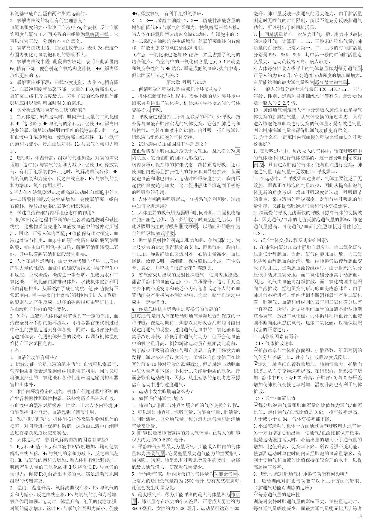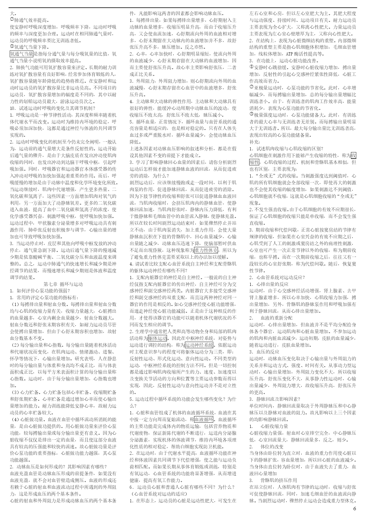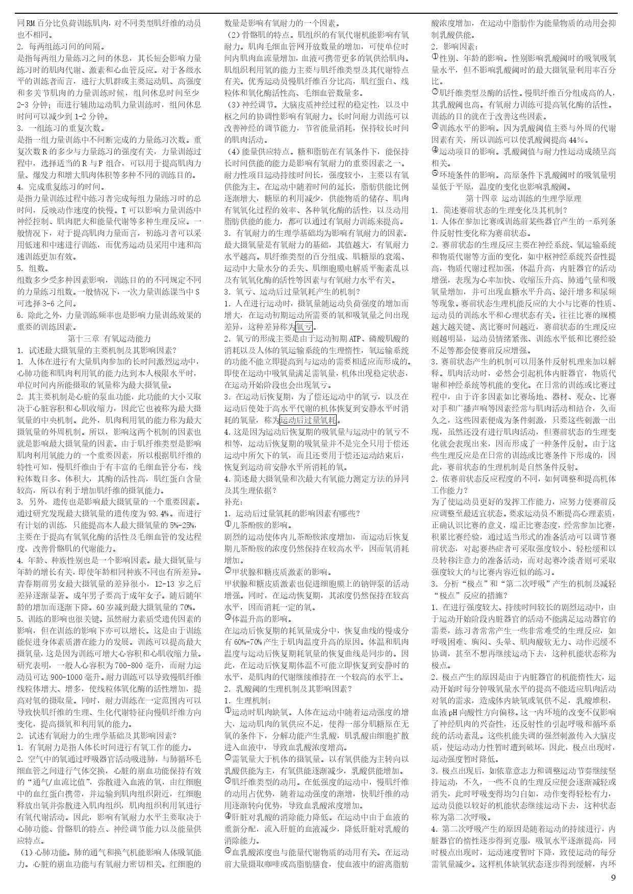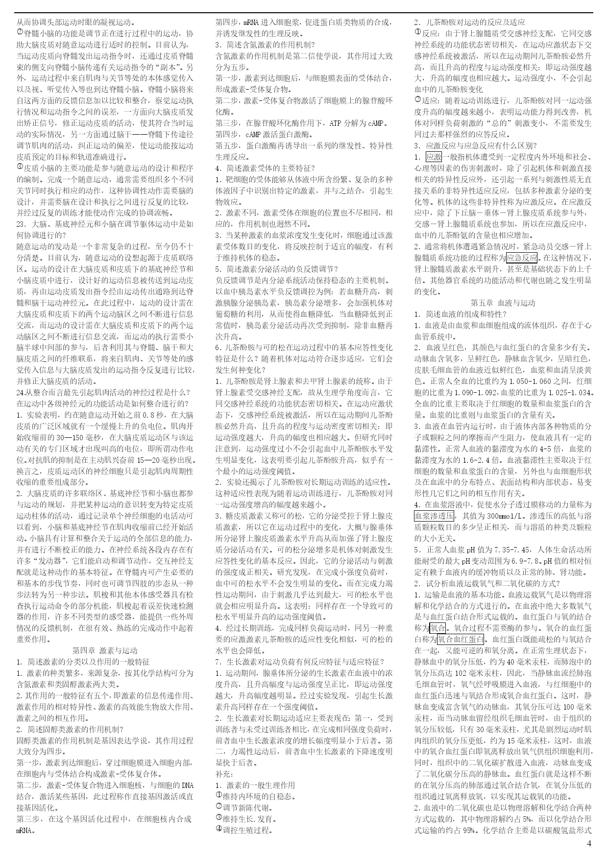 PAGEPAGE13肌肉活动的能量供应1.能量与生命的关系如何,是怎样实现的?人体生命活动是一个消耗能量的过程,而肌肉活动又是消耗能量最多的一种活动形式。运动时,人体不能直接利用太阳能、电能等各种物理形式的能量,只能直接利用储存在高能化合物三磷酸腺苷分子中蕴藏的化学能,与此同时糖、脂肪、蛋白质则可通过各自的分解代谢,将储存在分子内部的化学能逐渐释放出来,并使部分能量转移和储存到ATP分子之中,以保证ATP供能的持续性。2.不同运动中ATP供能与间接能源的动用关系?1.ATP是人体内一切生命活动能量的直接来源,而能量的间接来源是指糖、脂肪和蛋白质。2.糖是机体最主要,来源最经济,供能又快速的能源物质,一克糖在体内彻底氧化可产生4.1千卡的热量,机体正常情况下有60%的热量由糖来提供。3.在进行剧烈运动时,糖进行无氧分解供能,1分子的糖原或葡萄糖可产生3-2分子的ATP,可利用的热量不到糖分子结构中重热量的5%,能量利用率很低,但产能速率很高。4.在进行强度不是太大的运动时,糖进行有氧分解供能,此时1分子的糖原或葡萄糖可生成39-38分子的ATP,糖分子结构中的热量几乎全部可以被利用,但产能速率较低。5.脂肪是一种含热量最多的营养物质,1克脂肪在体内彻底氧化可产生9.3千卡的热量,他是长时间肌肉运动的重要能源。6.体内脂肪首先通过脂肪动员,分解为甘油和脂肪酸。甘油经系列反应步骤,可循糖代谢途径氧化,由于肌肉内缺乏磷酸甘油激酶,故甘油直接为肌肉供能的意义不大。脂肪酸进入细胞后,在线粒体外膜活化,经肉碱转运至内膜,再经ß氧化逐步生成乙酰辅酶,之后经三羧酸循环逐步释放出大量能量供ADP再合成ATP,此过程是脂肪氧化分解供能的主要途径。蛋白质分解供能是由氨基酸代谢实现的,但蛋白质分解供能很不经济,故一般情况不作为主要供能物质。3.三种能源系统为什么能满足不同强度的运动需要?这是由他们各自的供能特点所决定的。1.磷酸原系统的供能特点:供能总量少,持续时间短,功率输出最快,不需要氧,不产生乳酸类等中间产物。所以磷酸原系统是一切高功率输出运动项目的物质基础,数秒钟内要发挥最大能量输出,只能依靠ATP-CP系统。如短跑、投掷、跳跃、举重等运动项目。此外,测定磷酸原系统的功率输出还是评定高功率运动项目训练效果和训练方法的一个重要指标。2.乳酸能系统的供能特点:供能总量较磷酸原系统多,持续时间短,功率输出次之,不需要氧,终产物是导致疲劳的物质乳酸。乳酸能系统供能的意义在于,保证磷酸原系统最大供能后仍能维持数十秒快速供能,以应付机体短时间内的快速需要。如400米跑、100米跑等,血乳酸水平是衡量乳酸能系统供能能力的最常用的指标。3.有氧氧化系统供能特点:ATP生成量很大,但速率很低,持续的时间很长,需要氧的参与,终产物是水和二氧化碳,不产生乳酸类的副产品。有氧氧化系统是进行长时间活动的物质基础。如3000米跑、马拉松等。最大摄氧量和无氧阈等是评定有氧工作能力的主要生理指标。4.糖作为能源物质为什么要优于脂肪,蛋白质为何不是主要能源?1.糖作为能源物质优于脂肪和蛋白质是由其特点决定的。2.在满足不同强度运动时,既可以有氧分解供能,也可以无氧分解供能,在参与供能时动员快、消耗的氧量少、能量产生的效率高。因此,糖是肌肉活动时最重要的能源物质,而且机体正常情况下有60%的热量由糖来提供。蛋白质的分解供能是由氨基酸代谢实现的,体内不是所有氨基酸都能参与分解供能,由于肌肉内含有丰富的转氨酶,通过脱氨基和氧化等复杂过程,转变成丙酮酸等,这些物质再通过不同途径参与三羧酸循环的氧化分解供能。蛋白质分解供能很不经济,所以一般情况不作为主要供能物质。5.简述能量统一体理论及在体育实践中的应用意义?1.运动生理学把完全不同的运动项目所需要的能量之间,以及各能量系统供应的途径之间相互联系所形成的整体叫能量统一体。2.表现为把三个能量系统按能量输出方式的比例或按每个能量系统最大输出所能持续的时间等可分为两种表现形式,一种是以有氧和无氧供能百分比的表现形式;另一种是以运动时间为区分标准的表现形式。3.能量统一体在体育实践中的应用:人体运动能力在很大程度上取决于能量输出的供应能力。eq\o\ac(○,1)着重发展起主要作用的供能系统。能量统一体理论提示,不同的运动项目其主要的供能系统是不同的,在制定教学、训练时,应着重发展在该项活动中其主导作用的供能系统,如:短跑重点发展无氧供能系统能力,长跑应重点发展有氧供能能力。eq\o\ac(○,2)制定合理的训练计划。当确定应着重发展的供能系统之后,关键是选择有效的训练方法。若要训练一名3000米跑的运动员,应先了解该项目起主导作用的有氧系统,其次是乳酸能系统