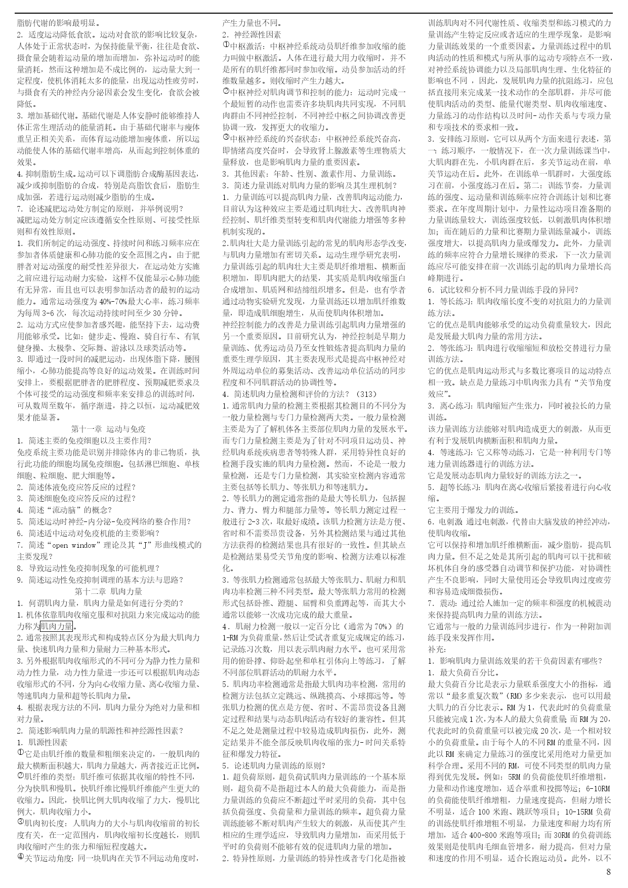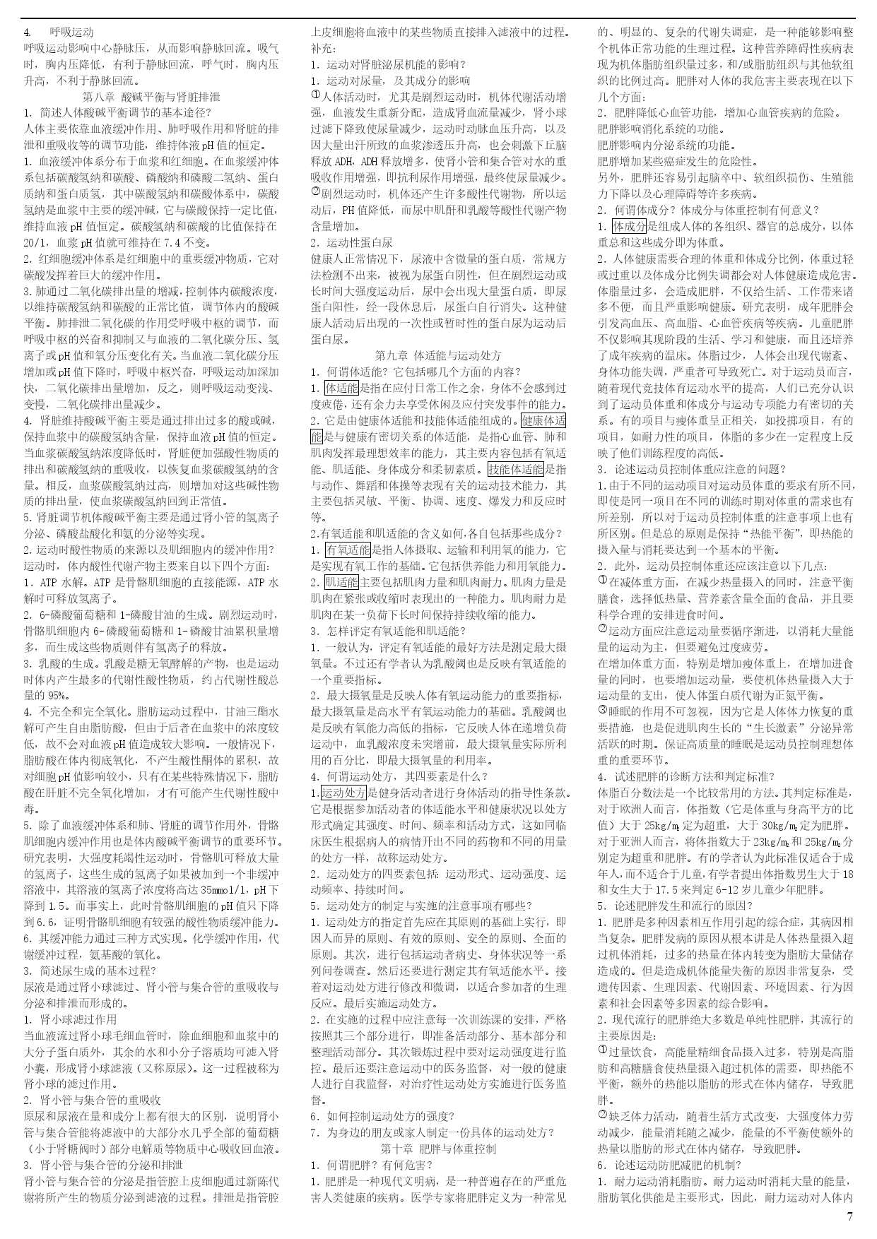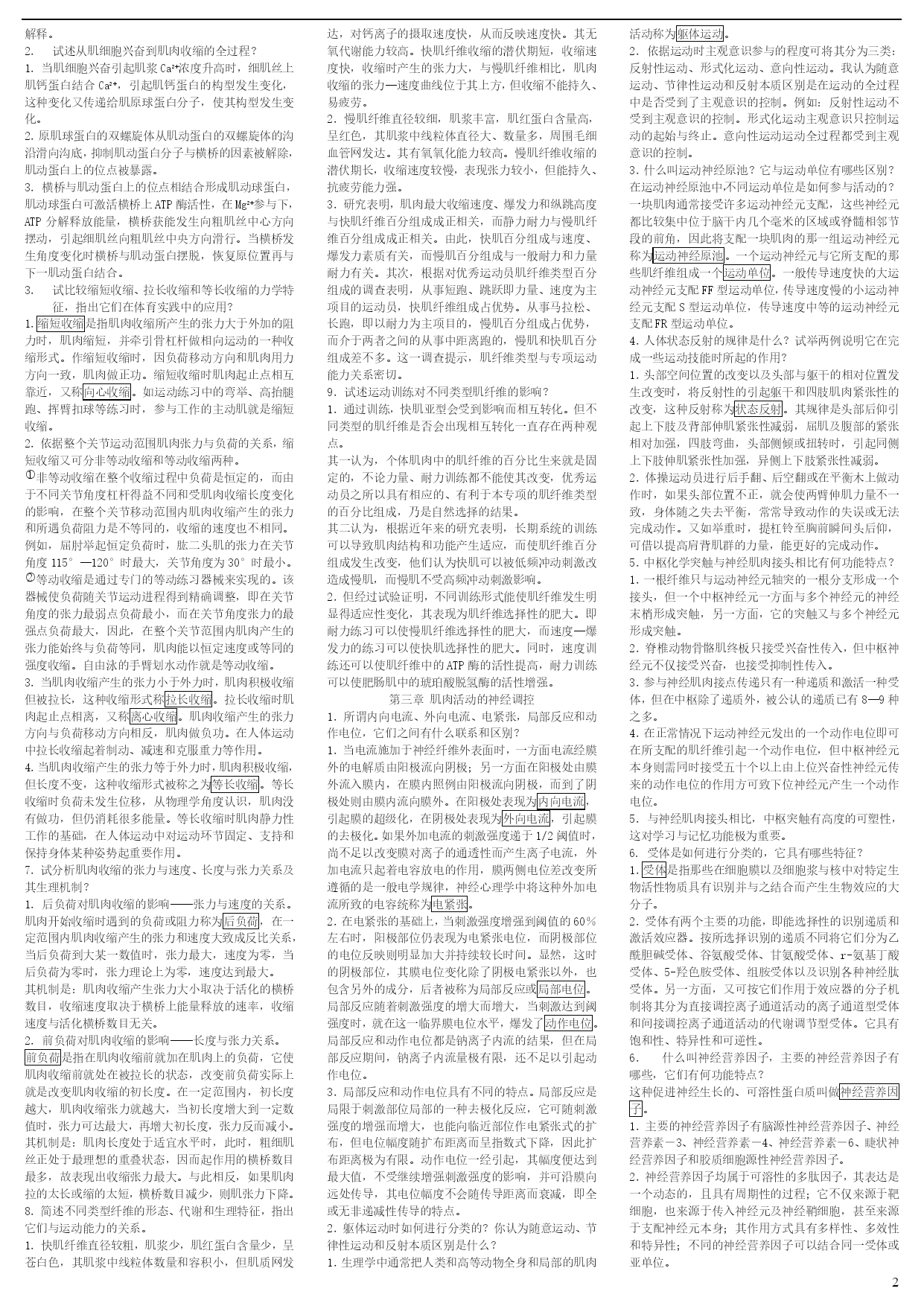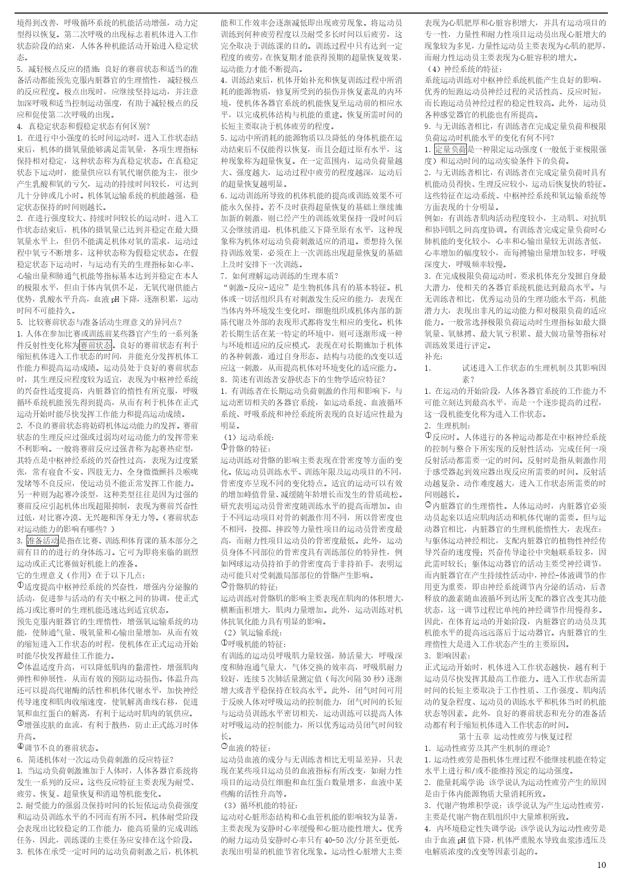 PAGEPAGE13肌肉活动的能量供应1.能量与生命的关系如何,是怎样实现的?人体生命活动是一个消耗能量的过程,而肌肉活动又是消耗能量最多的一种活动形式。运动时,人体不能直接利用太阳能、电能等各种物理形式的能量,只能直接利用储存在高能化合物三磷酸腺苷分子中蕴藏的化学能,与此同时糖、脂肪、蛋白质则可通过各自的分解代谢,将储存在分子内部的化学能逐渐释放出来,并使部分能量转移和储存到ATP分子之中,以保证ATP供能的持续性。2.不同运动中ATP供能与间接能源的动用关系?1.ATP是人体内一切生命活动能量的直接来源,而能量的间接来源是指糖、脂肪和蛋白质。2.糖是机体最主要,来源最经济,供能又快速的能源物质,一克糖在体内彻底氧化可产生4.1千卡的热量,机体正常情况下有60%的热量由糖来提供。3.在进行剧烈运动时,糖进行无氧分解供能,1分子的糖原或葡萄糖可产生3-2分子的ATP,可利用的热量不到糖分子结构中重热量的5%,能量利用率很低,但产能速率很高。4.在进行强度不是太大的运动时,糖进行有氧分解供能,此时1分子的糖原或葡萄糖可生成39-38分子的ATP,糖分子结构中的热量几乎全部可以被利用,但产能速率较低。5.脂肪是一种含热量最多的营养物质,1克脂肪在体内彻底氧化可产生9.3千卡的热量,他是长时间肌肉运动的重要能源。6.体内脂肪首先通过脂肪动员,分解为甘油和脂肪酸。甘油经系列反应步骤,可循糖代谢途径氧化,由于肌肉内缺乏磷酸甘油激酶,故甘油直接为肌肉供能的意义不大。脂肪酸进入细胞后,在线粒体外膜活化,经肉碱转运至内膜,再经ß氧化逐步生成乙酰辅酶,之后经三羧酸循环逐步释放出大量能量供ADP再合成ATP,此过程是脂肪氧化分解供能的主要途径。蛋白质分解供能是由氨基酸代谢实现的,但蛋白质分解供能很不经济,故一般情况不作为主要供能物质。3.三种能源系统为什么能满足不同强度的运动需要?这是由他们各自的供能特点所决定的。1.磷酸原系统的供能特点:供能总量少,持续时间短,功率输出最快,不需要氧,不产生乳酸类等中间产物。所以磷酸原系统是一切高功率输出运动项目的物质基础,数秒钟内要发挥最大能量输出,只能依靠ATP-CP系统。如短跑、投掷、跳跃、举重等运动项目。此外,测定磷酸原系统的功率输出还是评定高功率运动项目训练效果和训练方法的一个重要指标。2.乳酸能系统的供能特点:供能总量较磷酸原系统多,持续时间短,功率输出次之,不需要氧,终产物是导致疲劳的物质乳酸。乳酸能系统供能的意义在于,保证磷酸原系统最大供能后仍能维持数十秒快速供能,以应付机体短时间内的快速需要。如400米跑、100米跑等,血乳酸水平是衡量乳酸能系统供能能力的最常用的指标。3.有氧氧化系统供能特点:ATP生成量很大,但速率很低,持续的时间很长,需要氧的参与,终产物是水和二氧化碳,不产生乳酸类的副产品。有氧氧化系统是进行长时间活动的物质基础。如3000米跑、马拉松等。最大摄氧量和无氧阈等是评定有氧工作能力的主要生理指标。4.糖作为能源物质为什么要优于脂肪,蛋白质为何不是主要能源?1.糖作为能源物质优于脂肪和蛋白质是由其特点决定的。2.在满足不同强度运动时,既可以有氧分解供能,也可以无氧分解供能,在参与供能时动员快、消耗的氧量少、能量产生的效率高。因此,糖是肌肉活动时最重要的能源物质,而且机体正常情况下有60%的热量由糖来提供。蛋白质的分解供能是由氨基酸代谢实现的,体内不是所有氨基酸都能参与分解供能,由于肌肉内含有丰富的转氨酶,通过脱氨基和氧化等复杂过程,转变成丙酮酸等,这些物质再通过不同途径参与三羧酸循环的氧化分解供能。蛋白质分解供能很不经济,所以一般情况不作为主要供能物质。5.简述能量统一体理论及在体育实践中的应用意义?1.运动生理学把完全不同的运动项目所需要的能量之间,以及各能量系统供应的途径之间相互联系所形成的整体叫能量统一体。2.表现为把三个能量系统按能量输出方式的比例或按每个能量系统最大输出所能持续的时间等可分为两种表现形式,一种是以有氧和无氧供能百分比的表现形式;另一种是以运动时间为区分标准的表现形式。3.能量统一体在体育实践中的应用:人体运动能力在很大程度上取决于能量输出的供应能力。eq\o\ac(○,1)着重发展起主要作用的供能系统。能量统一体理论提示,不同的运动项目其主要的供能系统是不同的,在制定教学、训练时,应着重发展在该项活动中其主导作用的供能系统,如:短跑重点发展无氧供能系统能力,长跑应重点发展有氧供能能力。eq\o\ac(○,2)制定合理的训练计划。当确定应着重发展的供能系统之后,关键是选择有效的训练方法。若要训练一名3000米跑的运动员,应先了解该项目起主导作用的有氧系统,其次是乳酸能系统
