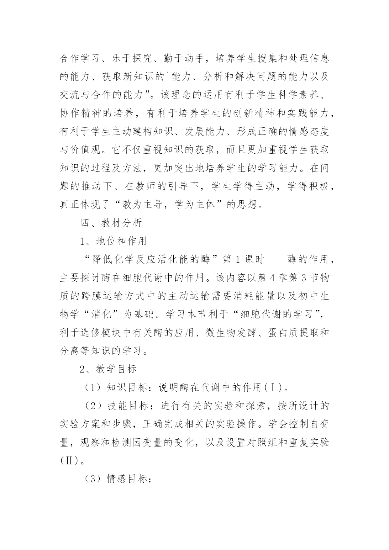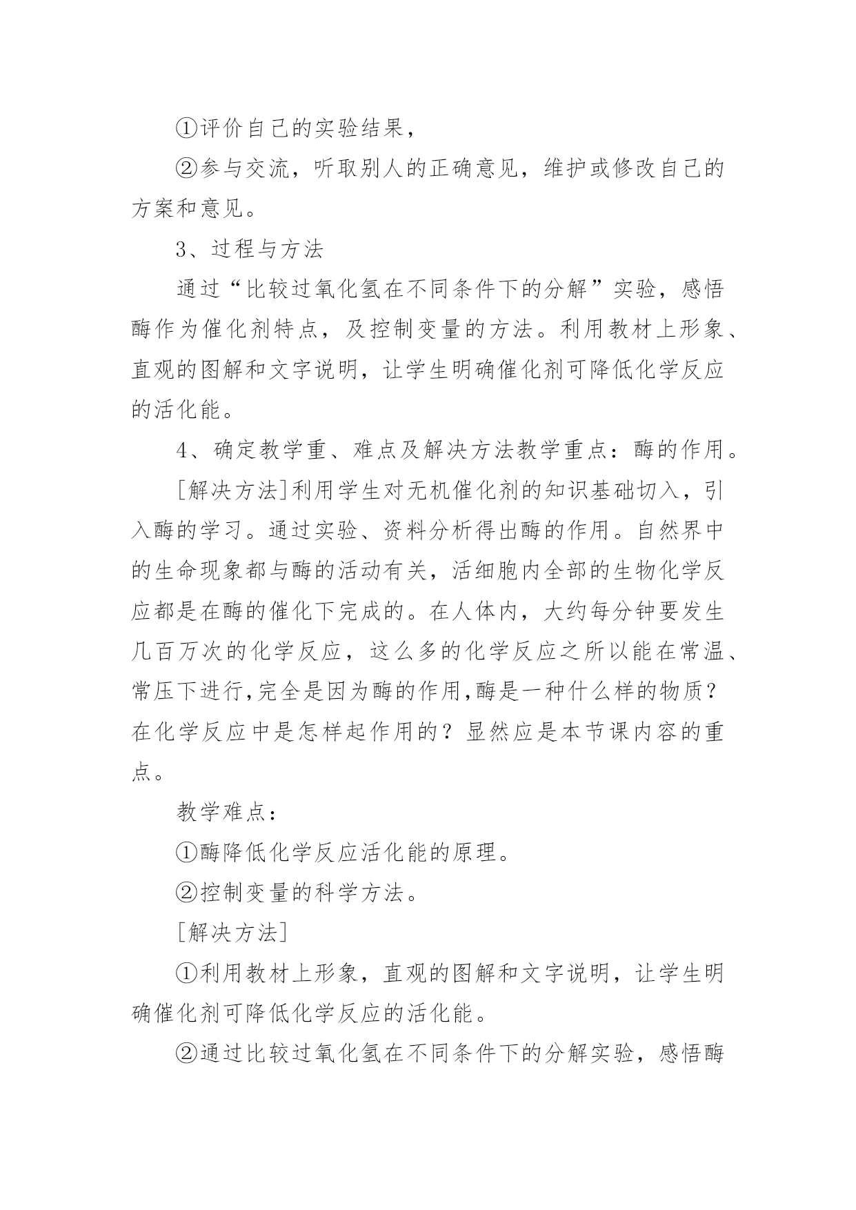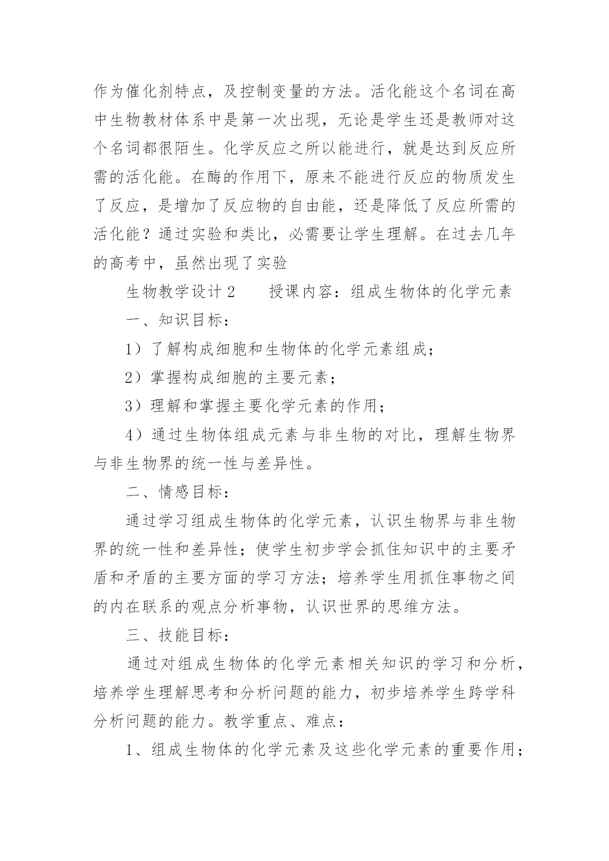 生物教学设计生物教学设计范文作为一名专为他人授业解惑的人民教师,编写教学设计是必不可少的,借助教学设计可以更好地组织教学活动。我们该怎么去写教学设计呢?下面是小编收集整理的生物教学设计范文,欢迎阅读与收藏。生物教学设计1降低化学反应活化能的酶——酶的作用一、版本:人教版高中生物必修1二、设计内容:第5章细胞的能量供应和利用第1节降低化学反应活化能的酶(第1课时——酶的作用)三、设计理念在实施新课程中,需要构建与新课程理念相适应的教学策略。根据新课程理念,高中生物重在培养学生的科学思维、科学方法、科学精神等生物科学素养。使学生由以前的“学会”到“想学”再到“会学”,“引导──探究”发现式教学法就是在这种理念下应运而生的,该教学法以问题解决为中心的学习方式。本节课以“引导──探究”科学发现的过程来学习科学研究的方法为设计理念。符合《基础教育课程改革纲要(试行)》的要求:“改变课程实施过于强调接受学习、死记硬背、机械训练的现状,倡导学生主动参与、合作学习、乐于探究、勤于动手,培养学生搜集和处理信息的能力、获取新知识的`能力、分析和解决问题的能力以及交流与合作的能力”。该理念的运用有利于学生科学素养、协作精神的培养,有利于培养学生的创新精神和实践能力,有利于学生主动建构知识、发展能力、形成正确的情感态度与价值观。它不仅重视知识的获取,而且更加重视学生获取知识的过程及方法,更加突出地培养学生的学习能力。在问题的推动下、在教师的引导下,学生学得主动,学得积极,真正体现了“教为主导,学为主体”的思想。四、教材分析1、地位和作用“降低化学反应活化能的酶”第1课时——酶的作用,主要探讨酶在细胞代谢中的作用。该内容以第4章第3节物质的跨膜运输方式中的主动运输需要消耗能量以及初中生物学“消化”为基础。学习本节利于“细胞代谢的学习”,利于选修模块中有关酶的应用、微生物发酵、蛋白质提取和分离等知识的学习。2、教学目标(1)知识目标:说明酶在代谢中的作用(Ⅰ)。(2)技能目标:进行有关的实验和探索,按所设计的实验方案和步骤,正确完成相关的实验操作。学会控制自变量,观察和检测因变量的变化,以及设置对照组和重复实验(Ⅱ)。(3)情感目标:①评价自己的实验结果,②参与交流,听取别人的正确意见,维护或修改自己的方案和意见。3、过程与方法通过“比较过氧化氢在不同条件下的分解”实验,感悟酶作为催化剂特点,及控制变量的方法。利用教材上形象、直观的图解和文字说明,让学生明确催化剂可降低化学反应的活化能。4、确定教学重、难点及解决方法教学重点:酶的作用。[解决方法]利用学生对无机催化剂的知识基础切入,引入酶的学习。通过实验、资料分析得出酶的作用。自然界中的生命现象都与酶的活动有关,活细胞内全部的生物化学反应都是在酶的催化下完成的。在人体内,大约每分钟要发生几百万次的化学反应,这么多的化学反应之所以能在常温、常压下进行,完全是因为酶的作用,酶是一种什么样的物质?在化学反应中是怎样起作用的?显然应是本节课内容的重点。教学难点:①酶降低化学反应活化能的原理。②控制变量的科学方法。[解决方法]①利用教材上形象,直观的图解和文字说明,让学生明确催化剂可降低化学反应的活化能。②通过比较过氧化氢在不同条件下的分解实验,感悟酶作为催化剂特点,及控制变量的方法。活化能这个名词在高中生物教材体系中是第一次出现,无论是学生还是教师对这个名词都很陌生。化学反应之所以能进行,就是达到反应所需的活化能。在酶的作用下,原来不能进行反应的物质发生了反应,是增加了反应物的自由能,还是降低了反应所需的活化能?通过实验和类比,必需要让学生理解。在过去几年的高考中,虽然出现了实验生物教学设计2授课内容:组成生物体的化学元素一、知识目标:1)了解构成细胞和生物体的化学元素组成;2)掌握构成细胞的主要元素;3)理解和掌握主要化学元素的作用;4)通过生物体组成元素与非生物的对比,理解生物界与非生物界的统一性与差异性。二、情感目标:通过学习组成生物体的化学元素,认识生物界与非生物界的统一性和差异性;使学生初步学会抓住知识中的主要矛盾和矛盾的主要方面的学习方法;培养学生用抓住事物之间的内在联系的观点分析事物,认识世界的思维方法。三、技能目标:通过对组成生物体的化学元素相关知识的学习和分析,培养学生理解思考和分析问题的能力,初步培养学生跨学科分析问题的能力。教学重点、难点:1、组成生物体的化学元素及这些化学元素的重要作用;2、2、组成生物体最基本的元素是碳;3、生物界和非生物界的统一性和差异性。核心概念:大量元素,微量元素地球上的生物,现在已知的大约200万种。不同种类的生物体,在个体大小、形态结构和生理功能等方面都不相同。但是,组成生物体的化学元素和化合物是大体相同的,也就是说,生物体的生命活动都有共同的物质基础。物