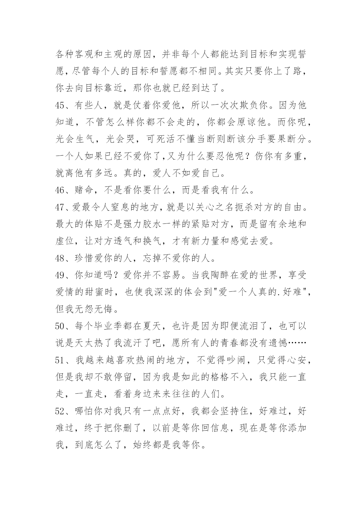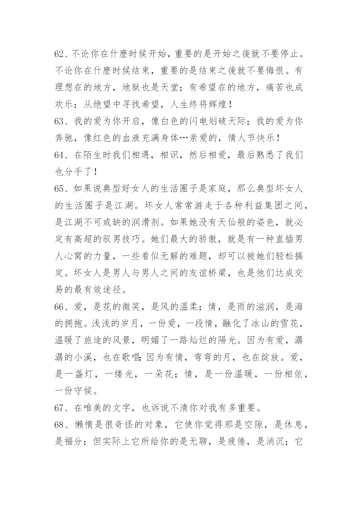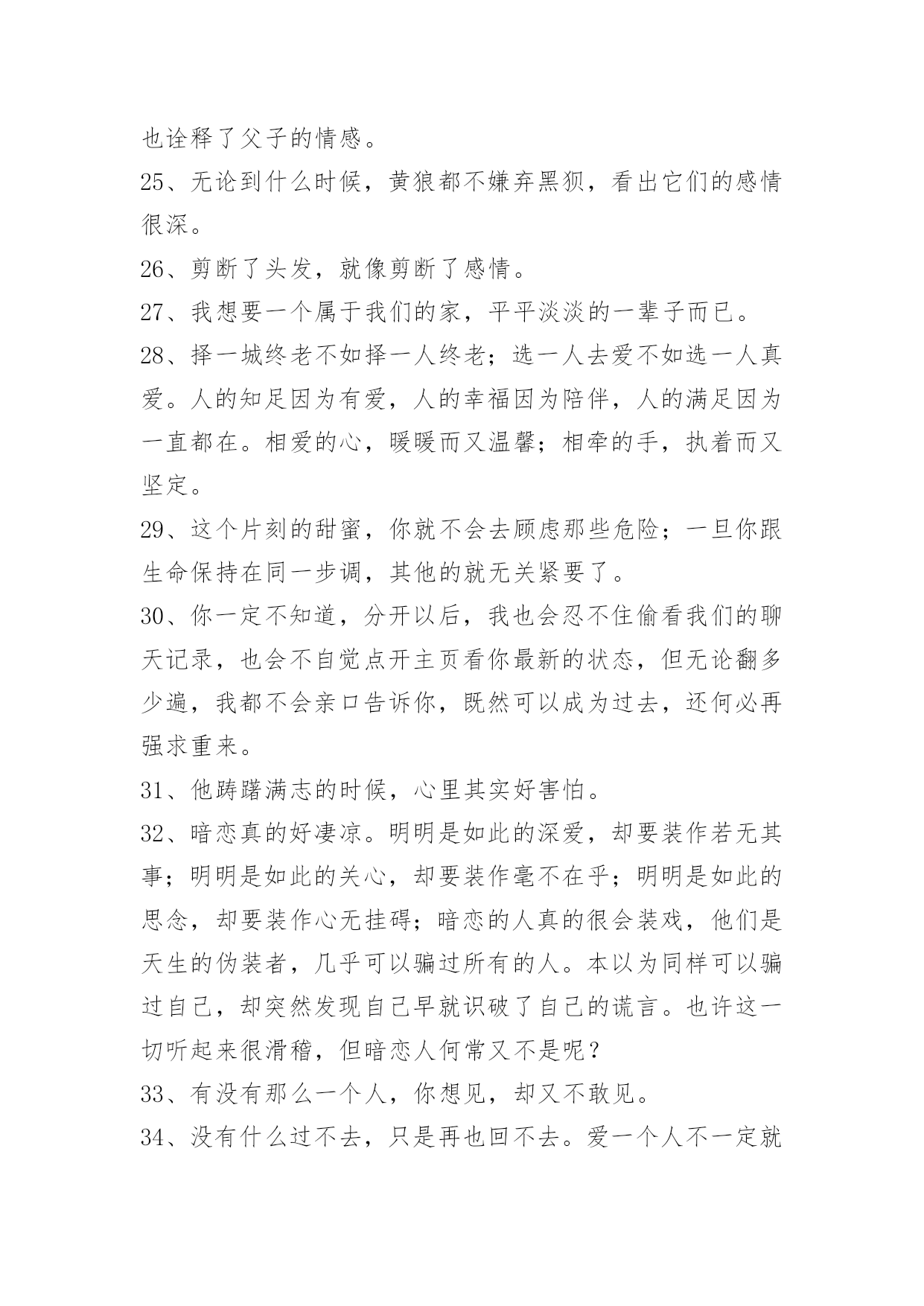 感人的情感语录69条通用感人的情感语录集合69条当叶子随风飘落的时候,心中引一丝爱恋;当柳条随风舞动的时候,心里勾勒出一缕爱愁;当细雨随风流逝的时候,心间涌出一句我爱你。我的情人,你是我的唯一。以下是小编收集整理的感人的情感语录69条,欢迎大家分享。1、你曾经拥有的一切,有可能你从来都没有拥有过。2、曾呼天抢叫像疯子,那回忆的往事仍只得你在心。3、回来行么?亲爱的,我知道我错了,对不起,我不能失去你。4、人生就像火车,过去了一辆好的,总感觉还有更好的,却永远都没有目标。5、咖啡就是咖啡,不管放了多少糖,依然会有淡淡的苦。6、我以为我百毒不侵,却唯独对你上了瘾。7、风依旧,花增寂寞人增瘦。人增瘦,夜深梦醒,被衾凉透。相逢相见何时又?归来归去思不够。思不够,心增酸楚,泪添愁厚。8、我们每个人,都有着对幸福不同的定义,重点在于,幸福就好。9、我可以优雅的转身离开,不带有任何一丝感情。10、别再欺骗我,不爱我可以明说,不必掩饰什么了。11、对一个人的好感最多存在4个月,一旦超过了,那可能就是爱了,真正的爱情并不是一时好感,而是我知道遇到你不容易,错过了会很可惜。12、我讨厌被放在可有可无的位置,是不是没人陪你了,你才想起我。13、有的时候,爱是诉说,而有的时候,爱是不说,一个人想想就好一不打扰,也是爱的一种方式。14、这季节犹如一把钥匙,开启了这些日子里的想念,祝福的云朵,正细细说起,我们曾有的期盼——祝你新岁如意。15、记忆里那朵永不凋谢的玫瑰,葬在了那个萧瑟的秋天,谁染红了玫瑰,只留一地相思?16、通向不同的对象,路径一定不同,你须潜心体验,小心分辨,才能找到那条特殊的路。17、唯有人的心灵才是真实的。严格说来,相貌不过是一种面具,真正的人在人的内部。18、做人潇洒一点我昭告世界幸福只要面对。19、只要能和你在一起,我会狠幸福。20、最幸福的事是做梦都和你在一起。21、如果这个社会是不安全的,所以每个人都不高兴。安全是生命的保障,没有安全,就没有幸福和一切。22、前世的几百次回眸,才换来今生你我的相遇。今生无数次的神情凝望,只为下辈子能与你相守。默默关心你,静静守护你,我要你这辈子与下辈子都幸福。23、用最普通的文字,写出我们的幸福。24、爱由心生,恨由爱成。这句话不仅诠释了相爱的恋人,也诠释了父子的情感。25、无论到什么时候,黄狼都不嫌弃黑狈,看出它们的感情很深。26、剪断了头发,就像剪断了感情。27、我想要一个属于我们的家,平平淡淡的一辈子而已。28、择一城终老不如择一人终老;选一人去爱不如选一人真爱。人的知足因为有爱,人的幸福因为陪伴,人的满足因为一直都在。相爱的心,暖暖而又温馨;相牵的手,执着而又坚定。29、这个片刻的甜蜜,你就不会去顾虑那些危险;一旦你跟生命保持在同一步调,其他的就无关紧要了。30、你一定不知道,分开以后,我也会忍不住偷看我们的聊天记录,也会不自觉点开主页看你最新的状态,但无论翻多少遍,我都不会亲口告诉你,既然可以成为过去,还何必再强求重来。31、他踌躇满志的时候,心里其实好害怕。32、暗恋真的好凄凉。明明是如此的深爱,却要装作若无其事;明明是如此的关心,却要装作毫不在乎;明明是如此的思念,却要装作心无挂碍;暗恋的人真的很会装戏,他们是天生的伪装者,几乎可以骗过所有的人。本以为同样可以骗过自己,却突然发现自己早就识破了自己的谎言。也许这一切听起来很滑稽,但暗恋人何常又不是呢?33、有没有那么一个人,你想见,却又不敢见。34、没有什么过不去,只是再也回不去。爱一个人不一定就要拥有,但拥有了一个人就应该好好的爱她呵护她。不管从什么时候开始,重要的是开始以后不要停止;不管在什么时候结束,重要的是结束以后不要后悔。35、爱你的人,你随口的一句话,他竟然真的这么做了;不爱你的人,你一句结束吧,他就再也没回来。36、薄凉的我,注定不会去寻找幸福,顺其自然。37、"爱"的基本的要求是关心和体贴,是为对方的命运和前途负责。如果男方只为满足自己的私欲而要求对方去冒牺牲健康的危险,去承受不该承受的压力,这怎么能叫爱呢?38、总是会有人问你,有对象没?呵呵,没有呢。不会吧,不可能吧……不想像别人那样轻易的爱了,轻易的让自己不孤单了,当结束一段又一段情时不会有任何伤感,因为那样的人是没有用过情。39、我还爱你,没有那么多为什么,就如你说你不再爱我一样。40、年少无知的我们,曾经错过了的那么多的快乐和幸福,却再也回不去了。41、真正的朋友,你生病时,他们会惦记你,让你宽心,好好养病,调理你的心情。当你人生挫折抑郁时,他们给了你坚强与温暖,让你有足够的自信,有了重生的希望和继续打拼的勇气。42、多少人秀过恩爱,却没撑到现在。43、要下雨了我再等一等,等这支烟抽完我就回家。44、其实每个人都是朝圣者,都有自己的目标和誓愿,由于各种