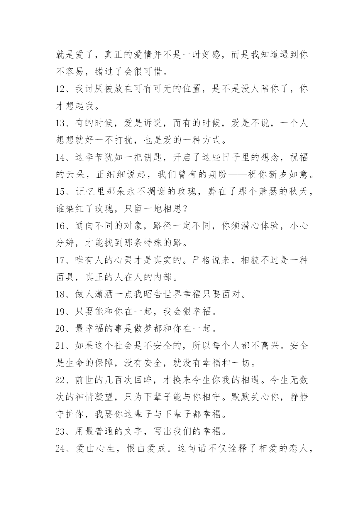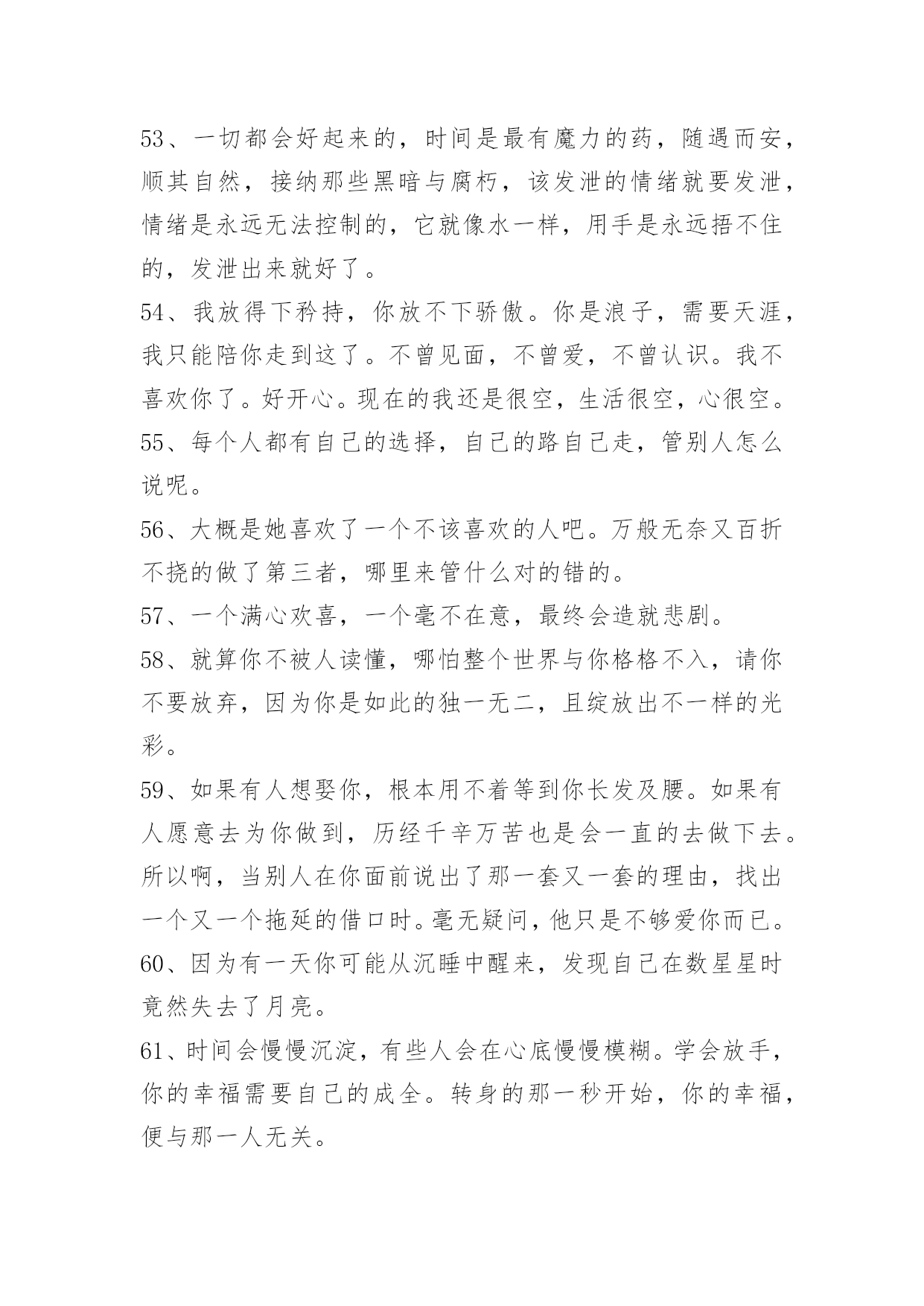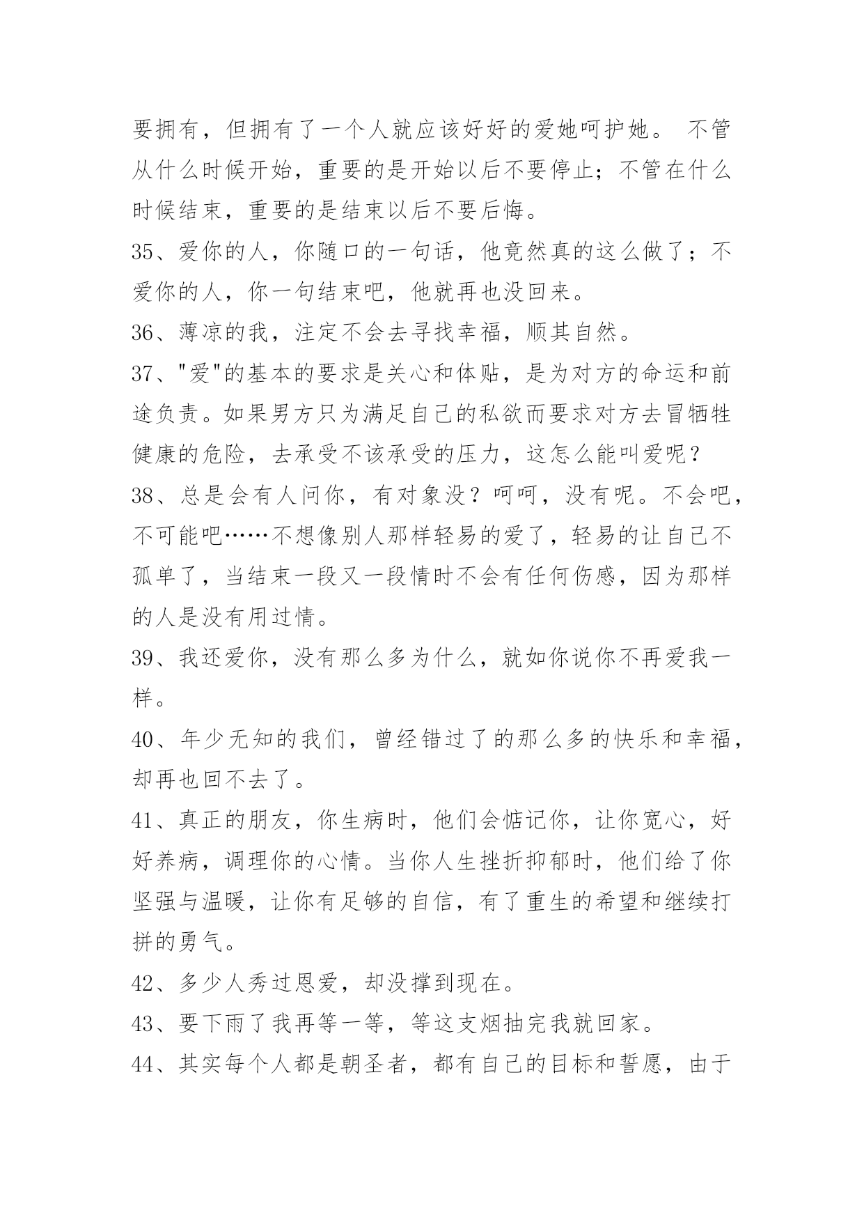 感人的情感语录69条通用感人的情感语录集合69条当叶子随风飘落的时候,心中引一丝爱恋;当柳条随风舞动的时候,心里勾勒出一缕爱愁;当细雨随风流逝的时候,心间涌出一句我爱你。我的情人,你是我的唯一。以下是小编收集整理的感人的情感语录69条,欢迎大家分享。1、你曾经拥有的一切,有可能你从来都没有拥有过。2、曾呼天抢叫像疯子,那回忆的往事仍只得你在心。3、回来行么?亲爱的,我知道我错了,对不起,我不能失去你。4、人生就像火车,过去了一辆好的,总感觉还有更好的,却永远都没有目标。5、咖啡就是咖啡,不管放了多少糖,依然会有淡淡的苦。6、我以为我百毒不侵,却唯独对你上了瘾。7、风依旧,花增寂寞人增瘦。人增瘦,夜深梦醒,被衾凉透。相逢相见何时又?归来归去思不够。思不够,心增酸楚,泪添愁厚。8、我们每个人,都有着对幸福不同的定义,重点在于,幸福就好。9、我可以优雅的转身离开,不带有任何一丝感情。10、别再欺骗我,不爱我可以明说,不必掩饰什么了。11、对一个人的好感最多存在4个月,一旦超过了,那可能就是爱了,真正的爱情并不是一时好感,而是我知道遇到你不容易,错过了会很可惜。12、我讨厌被放在可有可无的位置,是不是没人陪你了,你才想起我。13、有的时候,爱是诉说,而有的时候,爱是不说,一个人想想就好一不打扰,也是爱的一种方式。14、这季节犹如一把钥匙,开启了这些日子里的想念,祝福的云朵,正细细说起,我们曾有的期盼——祝你新岁如意。15、记忆里那朵永不凋谢的玫瑰,葬在了那个萧瑟的秋天,谁染红了玫瑰,只留一地相思?16、通向不同的对象,路径一定不同,你须潜心体验,小心分辨,才能找到那条特殊的路。17、唯有人的心灵才是真实的。严格说来,相貌不过是一种面具,真正的人在人的内部。18、做人潇洒一点我昭告世界幸福只要面对。19、只要能和你在一起,我会狠幸福。20、最幸福的事是做梦都和你在一起。21、如果这个社会是不安全的,所以每个人都不高兴。安全是生命的保障,没有安全,就没有幸福和一切。22、前世的几百次回眸,才换来今生你我的相遇。今生无数次的神情凝望,只为下辈子能与你相守。默默关心你,静静守护你,我要你这辈子与下辈子都幸福。23、用最普通的文字,写出我们的幸福。24、爱由心生,恨由爱成。这句话不仅诠释了相爱的恋人,也诠释了父子的情感。25、无论到什么时候,黄狼都不嫌弃黑狈,看出它们的感情很深。26、剪断了头发,就像剪断了感情。27、我想要一个属于我们的家,平平淡淡的一辈子而已。28、择一城终老不如择一人终老;选一人去爱不如选一人真爱。人的知足因为有爱,人的幸福因为陪伴,人的满足因为一直都在。相爱的心,暖暖而又温馨;相牵的手,执着而又坚定。29、这个片刻的甜蜜,你就不会去顾虑那些危险;一旦你跟生命保持在同一步调,其他的就无关紧要了。30、你一定不知道,分开以后,我也会忍不住偷看我们的聊天记录,也会不自觉点开主页看你最新的状态,但无论翻多少遍,我都不会亲口告诉你,既然可以成为过去,还何必再强求重来。31、他踌躇满志的时候,心里其实好害怕。32、暗恋真的好凄凉。明明是如此的深爱,却要装作若无其事;明明是如此的关心,却要装作毫不在乎;明明是如此的思念,却要装作心无挂碍;暗恋的人真的很会装戏,他们是天生的伪装者,几乎可以骗过所有的人。本以为同样可以骗过自己,却突然发现自己早就识破了自己的谎言。也许这一切听起来很滑稽,但暗恋人何常又不是呢?33、有没有那么一个人,你想见,却又不敢见。34、没有什么过不去,只是再也回不去。爱一个人不一定就要拥有,但拥有了一个人就应该好好的爱她呵护她。不管从什么时候开始,重要的是开始以后不要停止;不管在什么时候结束,重要的是结束以后不要后悔。35、爱你的人,你随口的一句话,他竟然真的这么做了;不爱你的人,你一句结束吧,他就再也没回来。36、薄凉的我,注定不会去寻找幸福,顺其自然。37、"爱"的基本的要求是关心和体贴,是为对方的命运和前途负责。如果男方只为满足自己的私欲而要求对方去冒牺牲健康的危险,去承受不该承受的压力,这怎么能叫爱呢?38、总是会有人问你,有对象没?呵呵,没有呢。不会吧,不可能吧……不想像别人那样轻易的爱了,轻易的让自己不孤单了,当结束一段又一段情时不会有任何伤感,因为那样的人是没有用过情。39、我还爱你,没有那么多为什么,就如你说你不再爱我一样。40、年少无知的我们,曾经错过了的那么多的快乐和幸福,却再也回不去了。41、真正的朋友,你生病时,他们会惦记你,让你宽心,好好养病,调理你的心情。当你人生挫折抑郁时,他们给了你坚强与温暖,让你有足够的自信,有了重生的希望和继续打拼的勇气。42、多少人秀过恩爱,却没撑到现在。43、要下雨了我再等一等,等这支烟抽完我就回家。44、其实每个人都是朝圣者,都有自己的目标和誓愿,由于各种