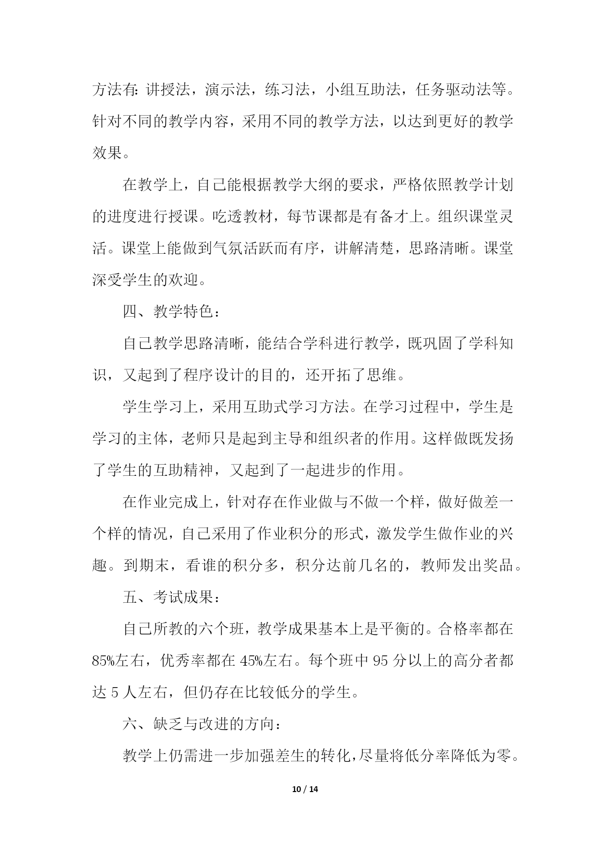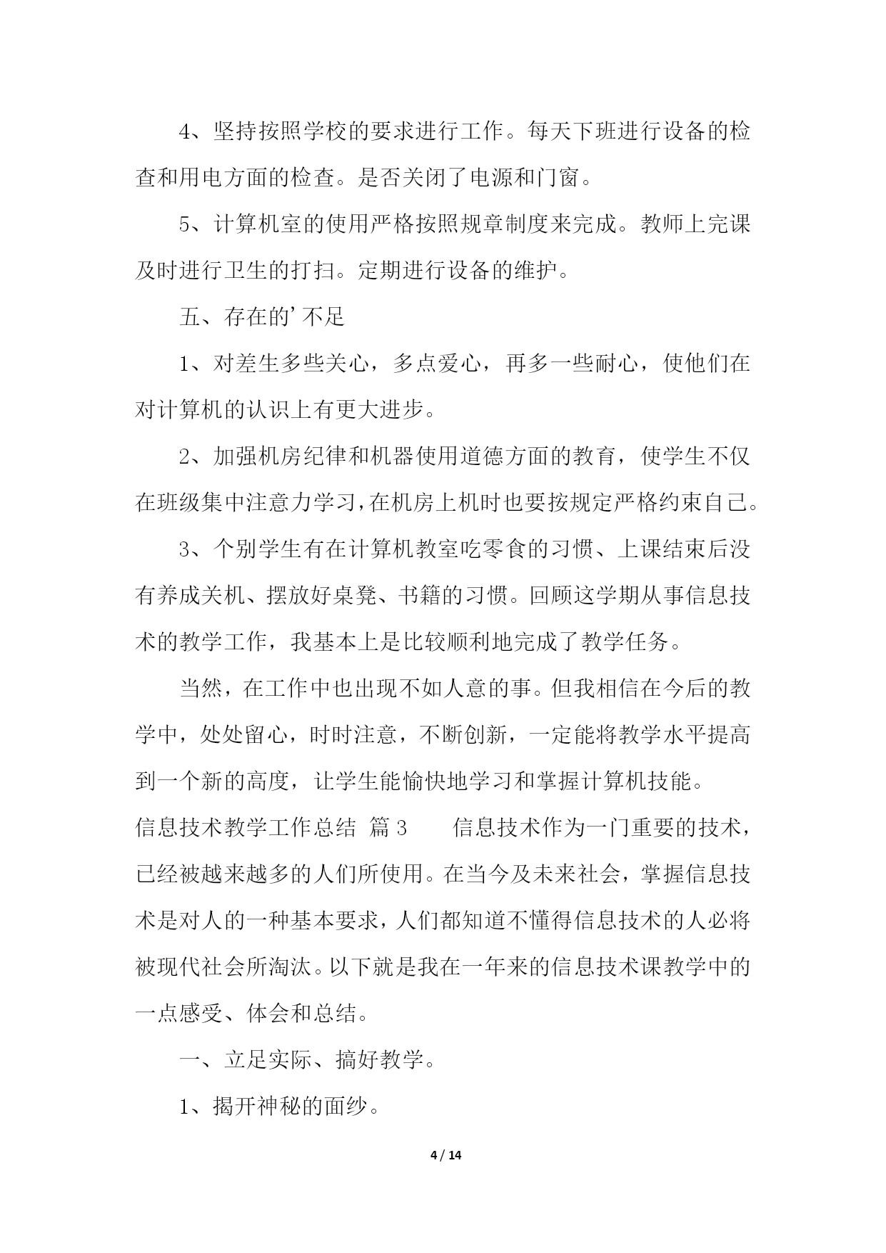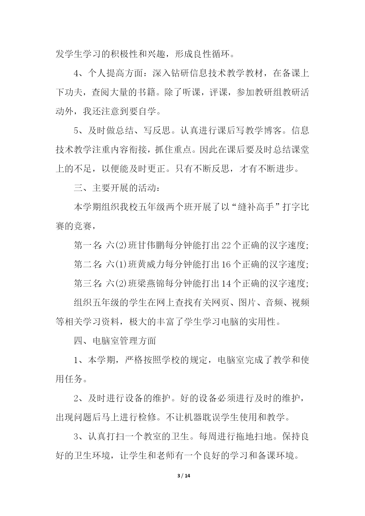 PAGE14/NUMPAGES14信息技术教学工作总结模板汇总六篇信息技术教学工作总结篇1忙碌的工作,总是让人觉得时间过得特别的快。转眼这个学期期末已经来临。在这学期将要结束的时候,我总是要总结一下,这个学期发生的主要事情。在教学方面,这个学期主要担任高三通用技术、高一信息技术。面对高考、会考的压力,我认真的进行备课、讲课,力求做到让每个学生都听的懂,让每位学生在每堂课都是有所收获。此外,我还积极的找跟高考会考相关的练习题给学生练习或者考试,及时的检测学生的掌握情况,并做出及时的补救。在师生的共同努力下,我们的高考、会考成绩还是让人满意的。除了教学外,我还积极的提高自己的业务水平,积极的参与学校或者县里组织的各类比赛,并也获得了一定的成绩。我还经常阅读跟教学有关的课外书籍,以增加自身的内涵,修养。承蒙学校领导的信任,担任通用技术学科备课组长。在本学期,不负众望,完成学校教研组交代的任务。积极的组织集体备课,展开公开课,以及听课活动。并将相关资料上传到博客中。总之,这个学期,我感觉是充实的,积极的。信息技术教学工作总结篇2本学期,我担任三、五、六年级十个班级的信息技术教学工作。每班都超过50个学生,学习基础较好,取得了一定的成绩,总结如下:一、主要完成的教学任务:1、学会正确使用鼠标。2、学会正确使用键盘指法。3、实现键盘输入字母的盲打。二、教学方面主要采取的措施1、做到期初有计划,有教学进度,使教学工作能有条不紊地顺利进行下去;每节课都对学校的电脑进行检查安排,根据学生学习情况进行调整教学。2、按照学校工作管理规定,认真备好课,写好教案,努力上好每一节课。电脑课校安排的课时比较少(一周每班1节)这对于学生来讲的很重要的1节课;对老师来讲是比较难上的1节课。所以才能上好每1节课对老师对学生都是很关键的。除了备好课、写好教案外,我还要查阅各种资料,能上因特网时还上网寻找好的教学材料,教学课件,把它们和我所从事的工作结合起来,为我所用。3、学生方面:(1)采用学生竞赛的方法。相互学习,相互促进,看谁的表现操作、完成任务等最好。充分利用课堂时间,学习新知识,掌握新技能。(2)采用边学边用的方法。学一点就让学生应用起来,不仅要满足学生的好奇心,还要在应用过程中,充分肯定学生自身的能力,增强学生的自信心,保持和促进学生的积极性,进一步激发学生学习的积极性和兴趣,形成良性循环。4、个人提高方面:深入钻研信息技术教学教材,在备课上下功夫,查阅大量的书籍。除了听课,评课,参加教研组教研活动外,我还注意到要自学。5、及时做总结、写反思。认真进行课后写教学博客。信息技术教学注重内容衔接,抓住重点。因此在课后要及时总结课堂上的不足,以便能及时更正。只有不断反思,才有不断进步。三、主要开展的活动:本学期组织我校五年级两个班开展了以“缝补高手”打字比赛的竞赛,第一名:六(2)班甘伟鹏每分钟能打出22个正确的汉字速度;第二名:六(1)班黄威力每分钟能打出16个正确的汉字速度;第三名:六(2)班梁燕锦每分钟能打出14个正确的汉字速度;组织五年级的学生在网上查找有关网页、图片、音频、视频等相关学习资料,极大的丰富了学生学习电脑的实用性。四、电脑室管理方面1、本学期,严格按照学校的规定,电脑室完成了教学和使用任务。2、及时进行设备的维护。好的设备必须进行及时的维护,出现问题后马上进行检修。不让机器耽误学生使用和教学。3、认真打扫一个教室的卫生。每周进行拖地扫地。保持良好的卫生环境,让学生和老师有一个良好的学习和备课环境。4、坚持按照学校的要求进行工作。每天下班进行设备的检查和用电方面的检查。是否关闭了电源和门窗。5、计算机室的使用严格按照规章制度来完成。教师上完课及时进行卫生的打扫。定期进行设备的维护。五、存在的'不足1、对差生多些关心,多点爱心,再多一些耐心,使他们在对计算机的认识上有更大进步。2、加强机房纪律和机器使用道德方面的教育,使学生不仅在班级集中注意力学习,在机房上机时也要按规定严格约束自己。3、个别学生有在计算机教室吃零食的习惯、上课结束后没有养成关机、摆放好桌凳、书籍的习惯。回顾这学期从事信息技术的教学工作,我基本上是比较顺利地完成了教学任务。当然,在工作中也出现不如人意的事。但我相信在今后的教学中,处处留心,时时注意,不断创新,一定能将教学水平提高到一个新的高度,让学生能愉快地学习和掌握计算机技能。信息技术教学工作总结篇3信息技术作为一门重要的技术,已经被越来越多的人们所使用。在当今及未来社会,掌握信息技术是对人的一种基本要求,人们都知道不懂得信息技术的人必将被现代社会所淘汰。以下就是我在一年来的信息技术课教学中的一点感受、体会和总结。一、立足实际、搞好教学。1、揭开神秘的面纱。对学生来说,信息技术课是一个陌生学科,大多学生
