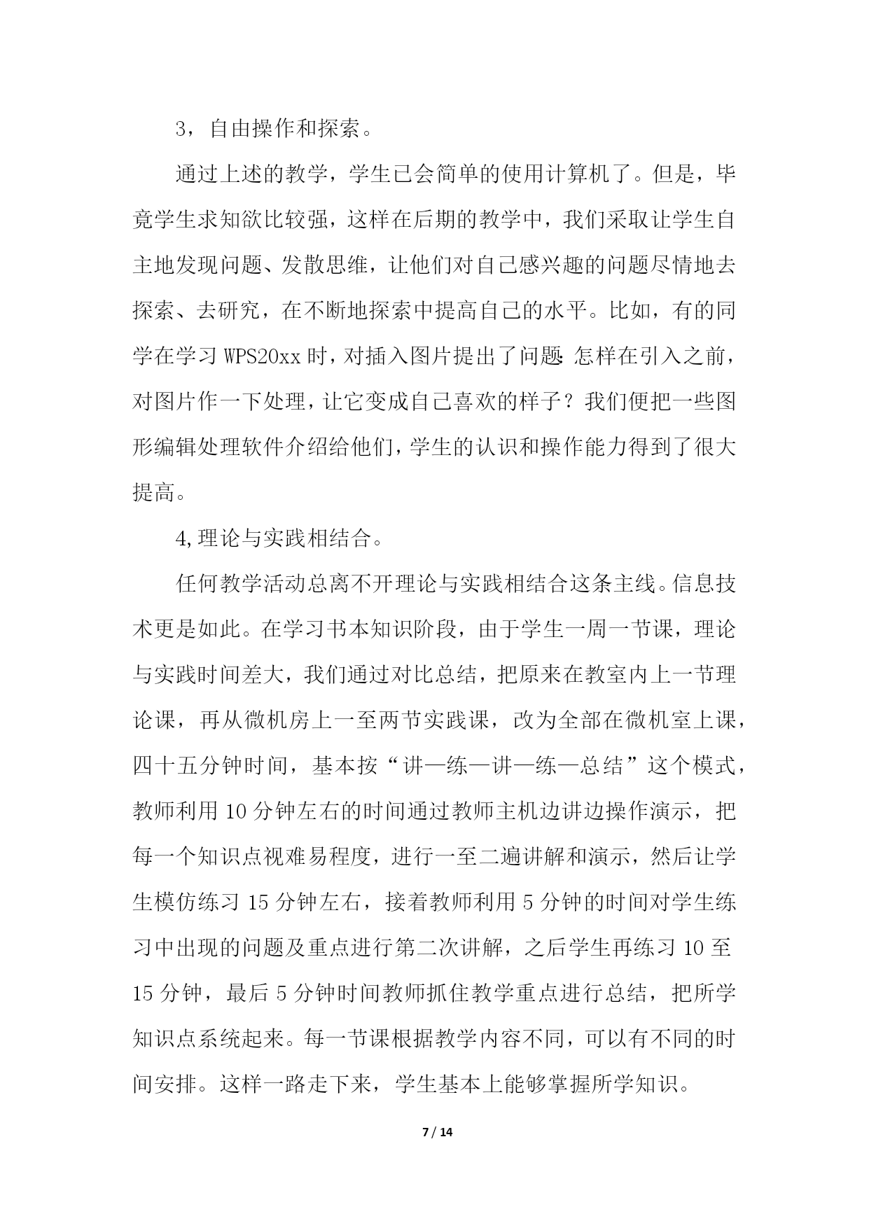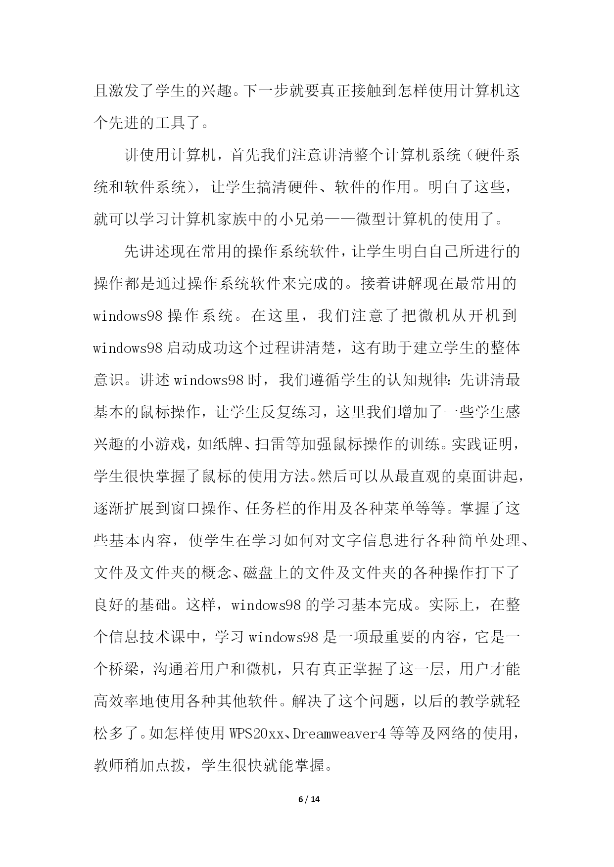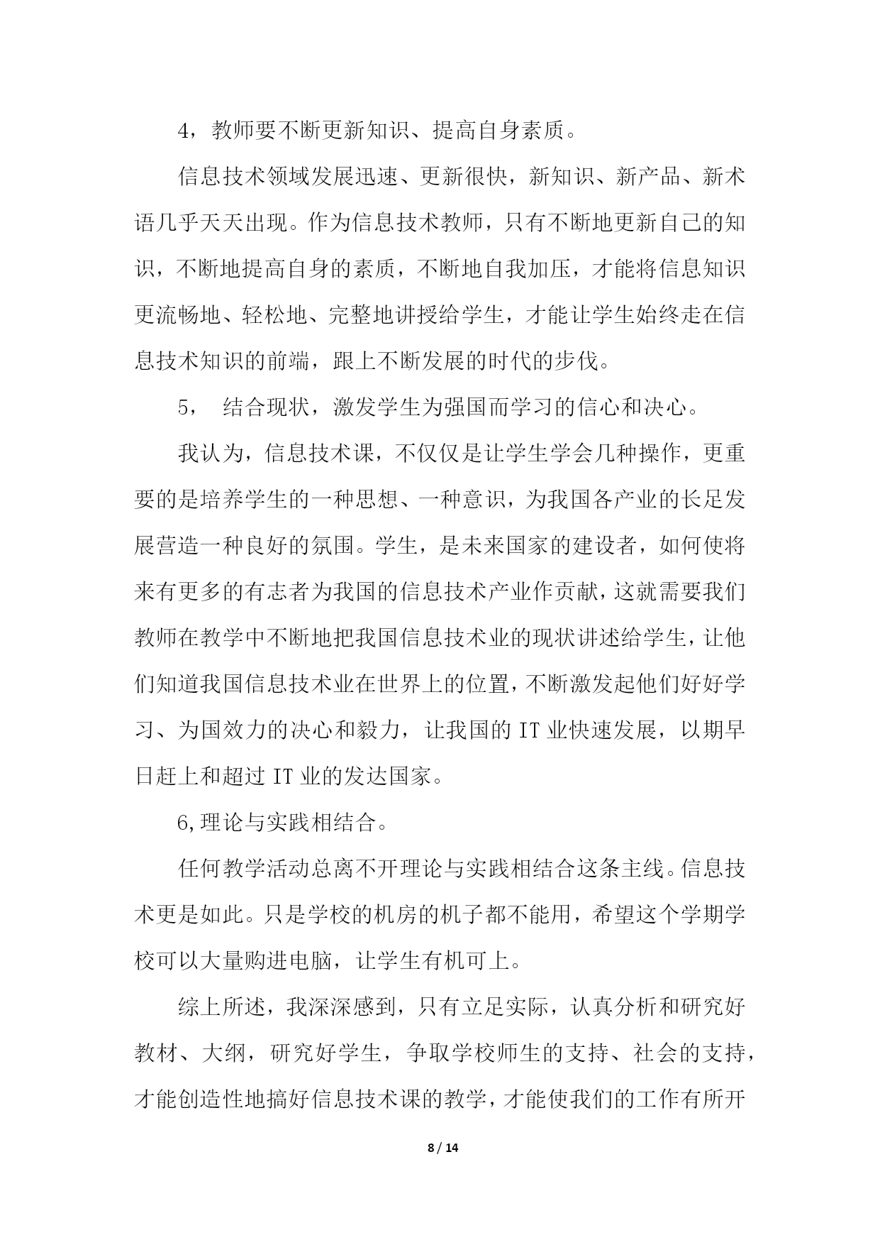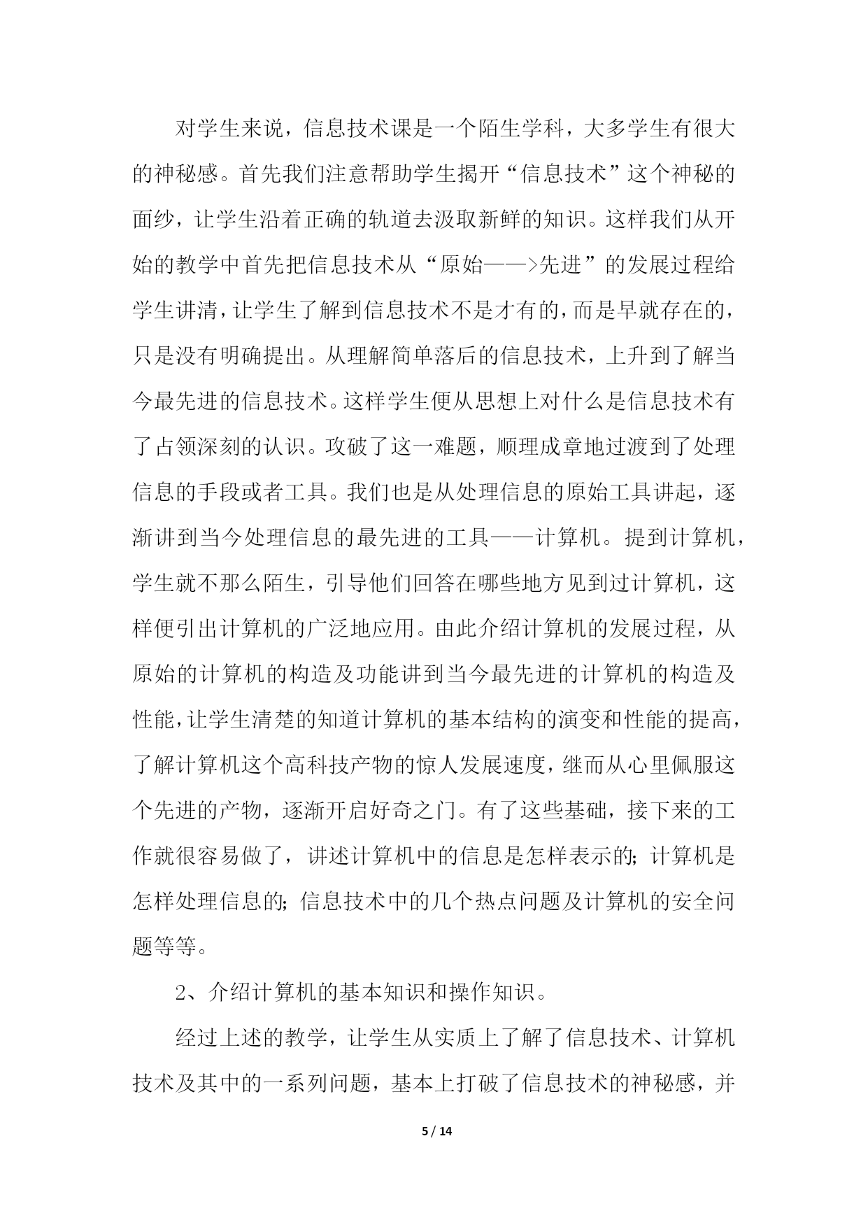 PAGE14/NUMPAGES14信息技术教学工作总结模板汇总六篇信息技术教学工作总结篇1忙碌的工作,总是让人觉得时间过得特别的快。转眼这个学期期末已经来临。在这学期将要结束的时候,我总是要总结一下,这个学期发生的主要事情。在教学方面,这个学期主要担任高三通用技术、高一信息技术。面对高考、会考的压力,我认真的进行备课、讲课,力求做到让每个学生都听的懂,让每位学生在每堂课都是有所收获。此外,我还积极的找跟高考会考相关的练习题给学生练习或者考试,及时的检测学生的掌握情况,并做出及时的补救。在师生的共同努力下,我们的高考、会考成绩还是让人满意的。除了教学外,我还积极的提高自己的业务水平,积极的参与学校或者县里组织的各类比赛,并也获得了一定的成绩。我还经常阅读跟教学有关的课外书籍,以增加自身的内涵,修养。承蒙学校领导的信任,担任通用技术学科备课组长。在本学期,不负众望,完成学校教研组交代的任务。积极的组织集体备课,展开公开课,以及听课活动。并将相关资料上传到博客中。总之,这个学期,我感觉是充实的,积极的。信息技术教学工作总结篇2本学期,我担任三、五、六年级十个班级的信息技术教学工作。每班都超过50个学生,学习基础较好,取得了一定的成绩,总结如下:一、主要完成的教学任务:1、学会正确使用鼠标。2、学会正确使用键盘指法。3、实现键盘输入字母的盲打。二、教学方面主要采取的措施1、做到期初有计划,有教学进度,使教学工作能有条不紊地顺利进行下去;每节课都对学校的电脑进行检查安排,根据学生学习情况进行调整教学。2、按照学校工作管理规定,认真备好课,写好教案,努力上好每一节课。电脑课校安排的课时比较少(一周每班1节)这对于学生来讲的很重要的1节课;对老师来讲是比较难上的1节课。所以才能上好每1节课对老师对学生都是很关键的。除了备好课、写好教案外,我还要查阅各种资料,能上因特网时还上网寻找好的教学材料,教学课件,把它们和我所从事的工作结合起来,为我所用。3、学生方面:(1)采用学生竞赛的方法。相互学习,相互促进,看谁的表现操作、完成任务等最好。充分利用课堂时间,学习新知识,掌握新技能。(2)采用边学边用的方法。学一点就让学生应用起来,不仅要满足学生的好奇心,还要在应用过程中,充分肯定学生自身的能力,增强学生的自信心,保持和促进学生的积极性,进一步激发学生学习的积极性和兴趣,形成良性循环。4、个人提高方面:深入钻研信息技术教学教材,在备课上下功夫,查阅大量的书籍。除了听课,评课,参加教研组教研活动外,我还注意到要自学。5、及时做总结、写反思。认真进行课后写教学博客。信息技术教学注重内容衔接,抓住重点。因此在课后要及时总结课堂上的不足,以便能及时更正。只有不断反思,才有不断进步。三、主要开展的活动:本学期组织我校五年级两个班开展了以“缝补高手”打字比赛的竞赛,第一名:六(2)班甘伟鹏每分钟能打出22个正确的汉字速度;第二名:六(1)班黄威力每分钟能打出16个正确的汉字速度;第三名:六(2)班梁燕锦每分钟能打出14个正确的汉字速度;组织五年级的学生在网上查找有关网页、图片、音频、视频等相关学习资料,极大的丰富了学生学习电脑的实用性。四、电脑室管理方面1、本学期,严格按照学校的规定,电脑室完成了教学和使用任务。2、及时进行设备的维护。好的设备必须进行及时的维护,出现问题后马上进行检修。不让机器耽误学生使用和教学。3、认真打扫一个教室的卫生。每周进行拖地扫地。保持良好的卫生环境,让学生和老师有一个良好的学习和备课环境。4、坚持按照学校的要求进行工作。每天下班进行设备的检查和用电方面的检查。是否关闭了电源和门窗。5、计算机室的使用严格按照规章制度来完成。教师上完课及时进行卫生的打扫。定期进行设备的维护。五、存在的'不足1、对差生多些关心,多点爱心,再多一些耐心,使他们在对计算机的认识上有更大进步。2、加强机房纪律和机器使用道德方面的教育,使学生不仅在班级集中注意力学习,在机房上机时也要按规定严格约束自己。3、个别学生有在计算机教室吃零食的习惯、上课结束后没有养成关机、摆放好桌凳、书籍的习惯。回顾这学期从事信息技术的教学工作,我基本上是比较顺利地完成了教学任务。当然,在工作中也出现不如人意的事。但我相信在今后的教学中,处处留心,时时注意,不断创新,一定能将教学水平提高到一个新的高度,让学生能愉快地学习和掌握计算机技能。信息技术教学工作总结篇3信息技术作为一门重要的技术,已经被越来越多的人们所使用。在当今及未来社会,掌握信息技术是对人的一种基本要求,人们都知道不懂得信息技术的人必将被现代社会所淘汰。以下就是我在一年来的信息技术课教学中的一点感受、体会和总结。一、立足实际、搞好教学。1、揭开神秘的面纱。对学生来说,信息技术课是一个陌生学科,大多学生