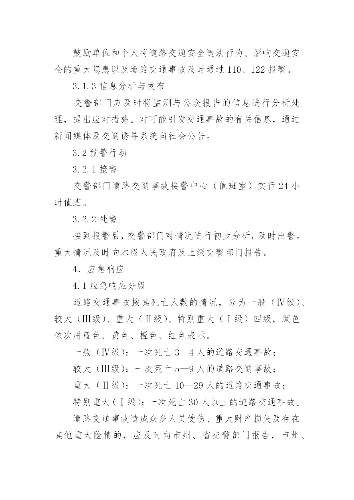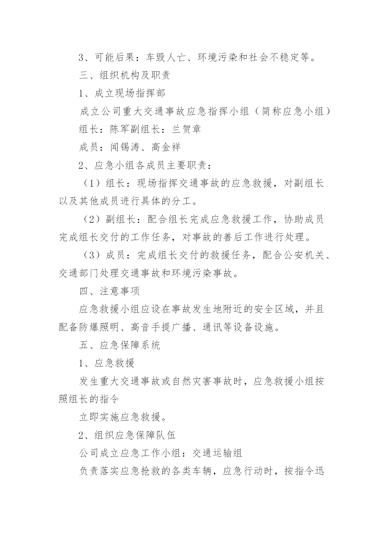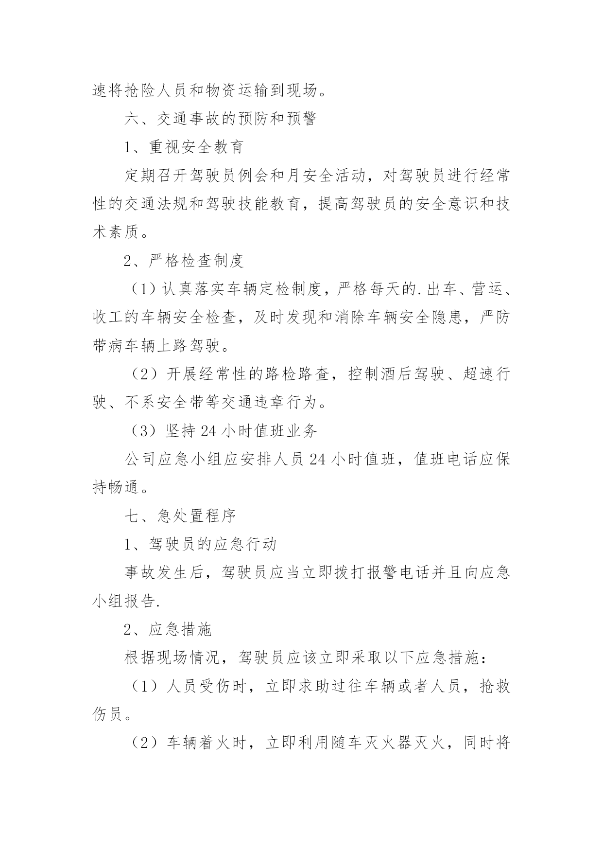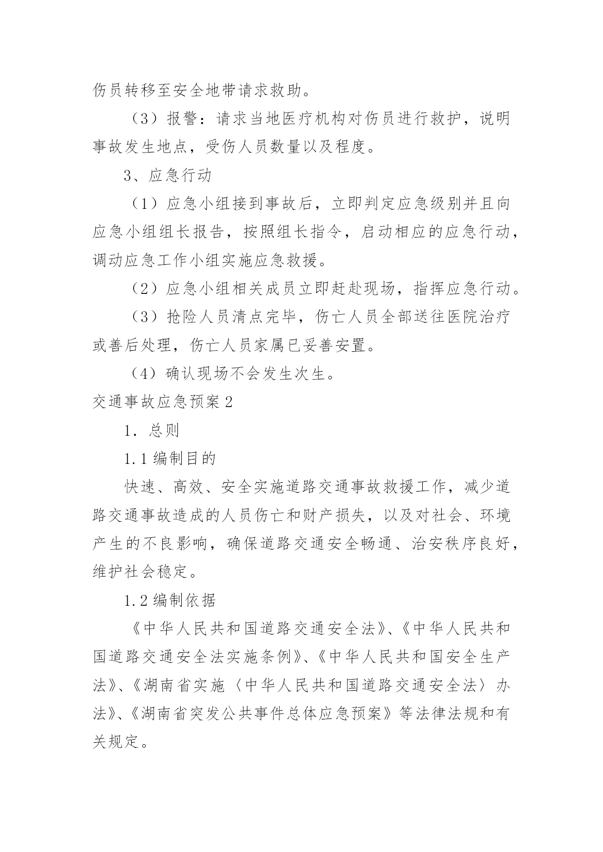 交通事故应急预案交通事故应急预案在日常学习、工作和生活中,保不准会发生突发事件,为了避免造成更严重的后果,就有可能需要事先制定应急预案。怎样写应急预案才更能起到其作用呢?下面是小编为大家整理的交通事故应急预案,希望对大家有所帮助。交通事故应急预案1为快速有效地实施救援,最大限度地降低人员伤亡和损失,依据《安全生产法》、《道路交通安全法》,制定本预案。一、适用范围适用于本公司所有货物运输车辆、所有驾驶员及所有从业人员。二、可能发生的事故类型、原因及后果1、类型:交通伤亡事故、火灾和自然灾害事故。2、事故原因:(1)驾驶员安全意识淡薄,超速行驶、酒后驾驶、强超强会等违章行为。(2)车辆的制动系统、转向系统突然失灵、车胎突然爆裂等造成车辆失控。(3)道路状况差、视线不良。(4)环境因素的影响:雨,雾、台风等恶劣气候。(5)其他因素:行人、骑车人违章和其他车辆违章等。3、可能后果:车毁人亡、环境污染和社会不稳定等。三、组织机构及职责1、成立现场指挥部成立公司重大交通事故应急指挥小组(简称应急小组)组长:陈军副组长:兰贺章成员:闻锡涛、高金祥2、应急小组各成员主要职责:(1)组长:现场指挥交通事故的应急救援,对副组长以及其他成员进行具体的分工。(2)副组长:配合组长完成应急救援工作,协助成员完成组长交付的工作任务,对事故的善后工作进行处理。(3)成员:完成组长交付的救援任务,配合公安机关、交通部门处理交通事故和环境污染事故。四、注意事项应急救援小组应设在事故发生地附近的安全区域,并且配备防爆照明、高音手提广播、通讯等设备设施。五、应急保障系统1、应急救援发生重大交通事故或自然灾害事故时,应急救援小组按照组长的指令立即实施应急救援。2、组织应急保障队伍公司成立应急工作小组:交通运输组负责落实应急抢救的各类车辆,应急行动时,按指令迅速将抢险人员和物资运输到现场。六、交通事故的预防和预警1、重视安全教育定期召开驾驶员例会和月安全活动,对驾驶员进行经常性的交通法规和驾驶技能教育,提高驾驶员的安全意识和技术素质。2、严格检查制度(1)认真落实车辆定检制度,严格每天的.出车、营运、收工的车辆安全检查,及时发现和消除车辆安全隐患,严防带病车辆上路驾驶。(2)开展经常性的路检路查,控制酒后驾驶、超速行驶、不系安全带等交通违章行为。(3)坚持24小时值班业务公司应急小组应安排人员24小时值班,值班电话应保持畅通。七、急处置程序1、驾驶员的应急行动事故发生后,驾驶员应当立即拨打报警电话并且向应急小组报告.2、应急措施根据现场情况,驾驶员应该立即采取以下应急措施:(1)人员受伤时,立即求助过往车辆或者人员,抢救伤员。(2)车辆着火时,立即利用随车灭火器灭火,同时将伤员转移至安全地带请求救助。(3)报警:请求当地医疗机构对伤员进行救护,说明事故发生地点,受伤人员数量以及程度。3、应急行动(1)应急小组接到事故后,立即判定应急级别并且向应急小组组长报告,按照组长指令,启动相应的应急行动,调动应急工作小组实施应急救援。(2)应急小组相关成员立即赶赴现场,指挥应急行动。(3)抢险人员清点完毕,伤亡人员全部送往医院治疗或善后处理,伤亡人员家属已妥善安置。(4)确认现场不会发生次生。交通事故应急预案21.总则1.1编制目的快速、高效、安全实施道路交通事故救援工作,减少道路交通事故造成的人员伤亡和财产损失,以及对社会、环境产生的不良影响,确保道路交通安全畅通、治安秩序良好,维护社会稳定。1.2编制依据《中华人民共和国道路交通安全法》、《中华人民共和国道路交通安全法实施条例》、《中华人民共和国安全生产法》、《湖南省实施〈中华人民共和国道路交通安全法〉办法》、《湖南省突发公共事件总体应急预案》等法律法规和有关规定。1.3适用范围本预案适用于本省行政区域道路交通事故的防范和应急处置工作。1.4工作原则(1)防治结合,预防为主。任何单位和个人都有维护交通安全设施、遵守道路交通安全法律法规和提高交通安全意识的义务,努力预防道路交通事故。要将道路交通事故应急处置和预防工作相结合,做好预防、预测、预警和预报工作。(2)条块结合,以块为主。道路交通事故现场应急处置领导和指挥以当地人民政府为主,实行各级人民政府行政首长负责制。有关部门(单位)应与当地人民政府密切配合,充分发挥指导和协调作用。(3)整合资源、信息共享。充分利用现有资源,对人员、资金、设备、物资等进行有效整合,保障道路交通事故应急处置工作的正常进行。建立信息服务平台,实现信息资源共享,为科学决策提供准确依据。(4)快速反应、密切协作。一旦发生道路交通事故,各有关部门(单位)要在应急指挥机构的统一领导下,分工负责,互相支持,协调联动,整体作战,在最短时间内控制势态。2.应急指挥体系及职责省、市州、县市区人民政府设立道路交通事