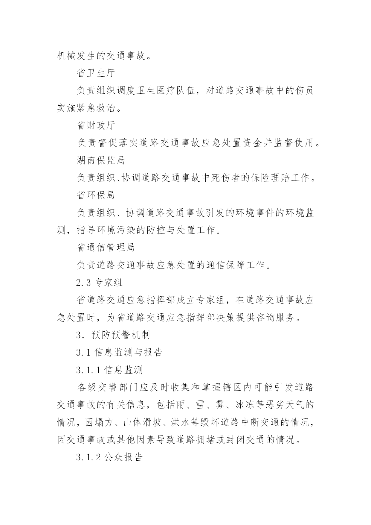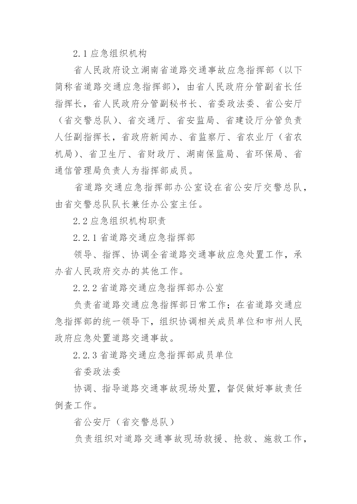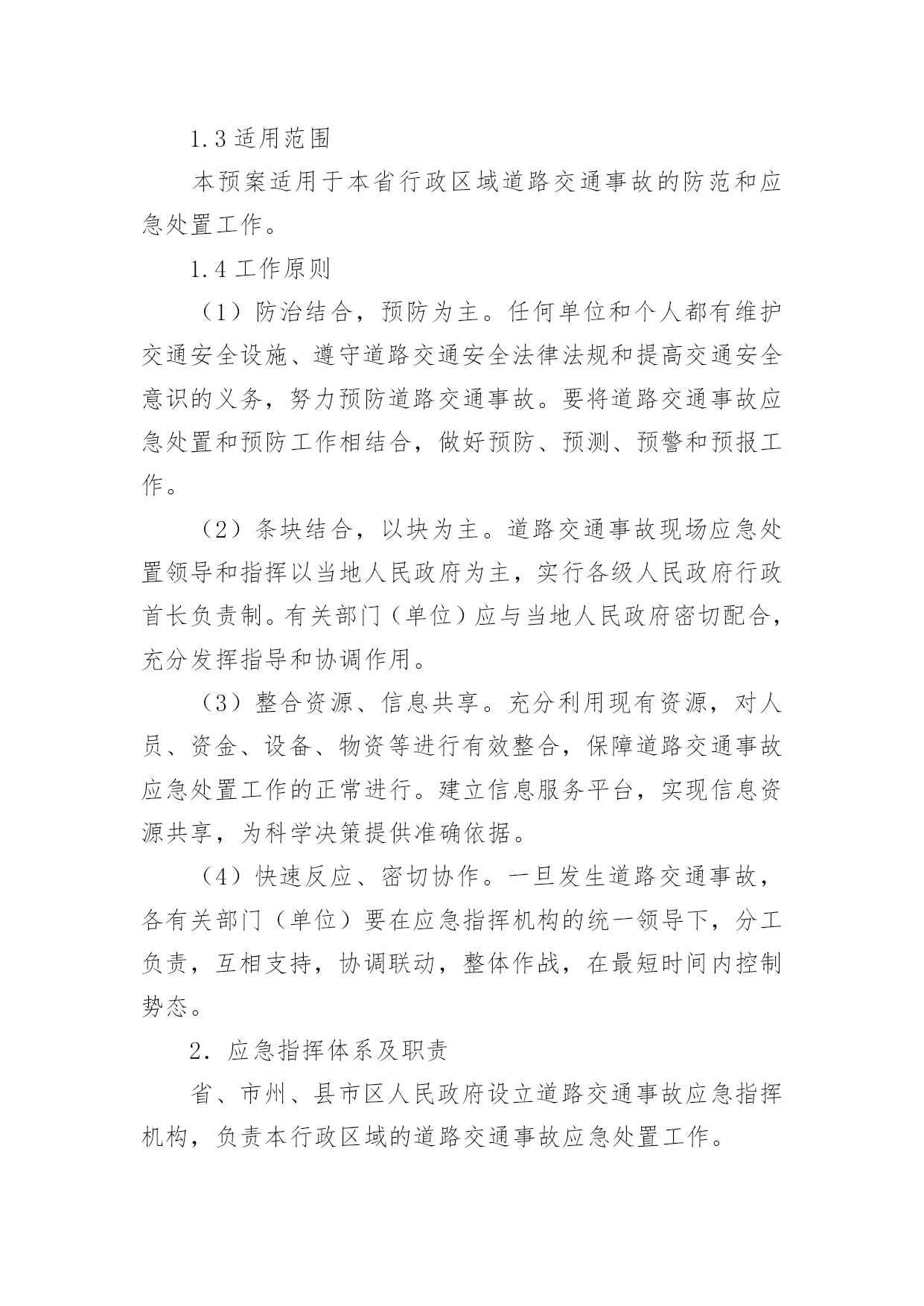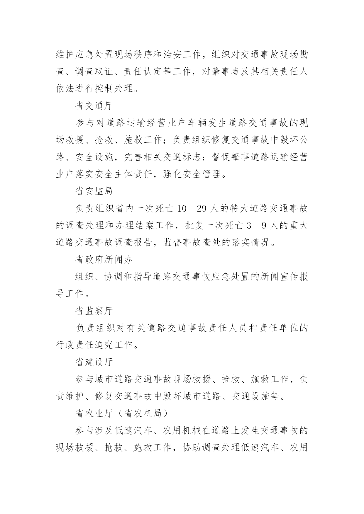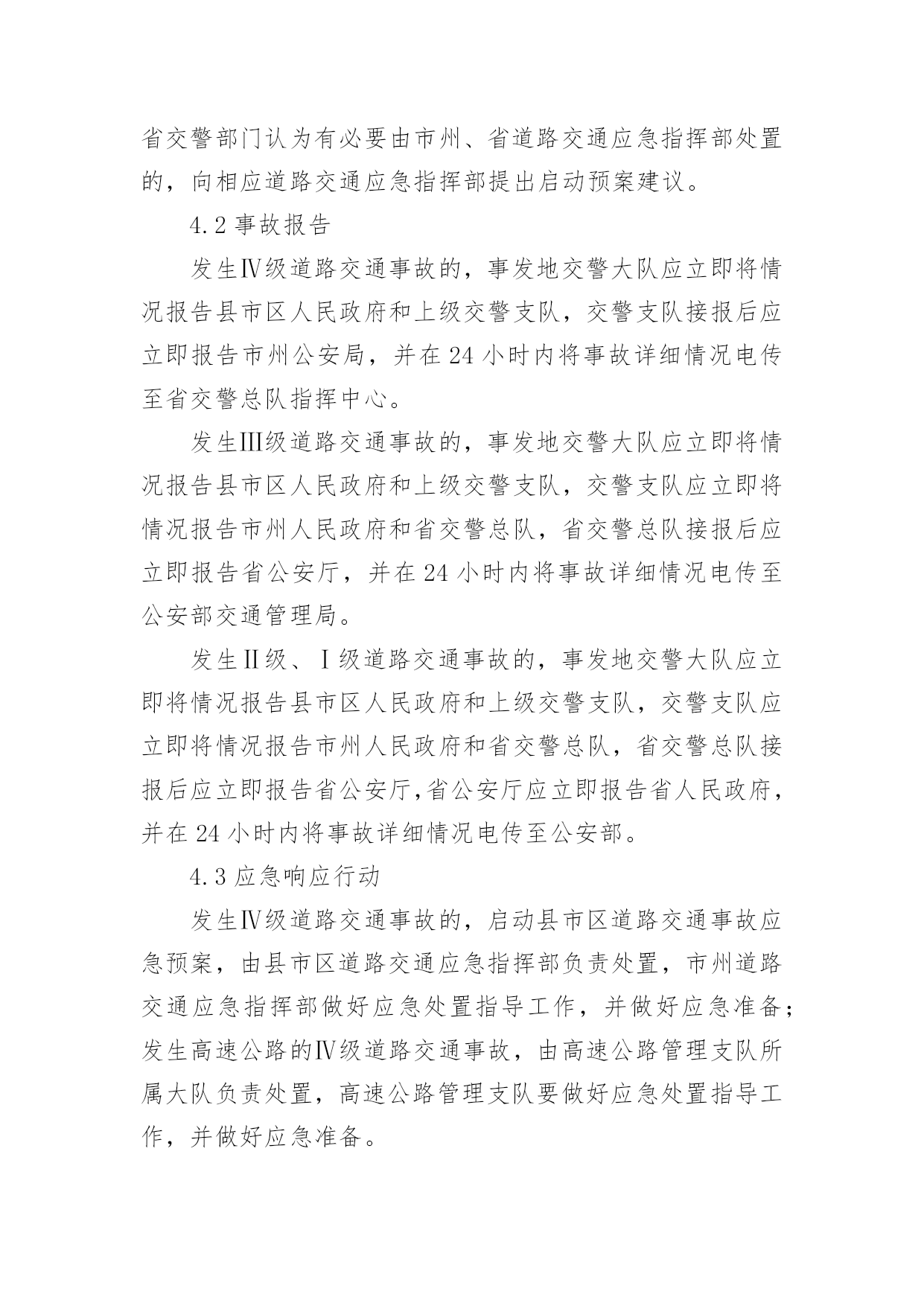 交通事故应急预案交通事故应急预案在日常学习、工作和生活中,保不准会发生突发事件,为了避免造成更严重的后果,就有可能需要事先制定应急预案。怎样写应急预案才更能起到其作用呢?下面是小编为大家整理的交通事故应急预案,希望对大家有所帮助。交通事故应急预案1为快速有效地实施救援,最大限度地降低人员伤亡和损失,依据《安全生产法》、《道路交通安全法》,制定本预案。一、适用范围适用于本公司所有货物运输车辆、所有驾驶员及所有从业人员。二、可能发生的事故类型、原因及后果1、类型:交通伤亡事故、火灾和自然灾害事故。2、事故原因:(1)驾驶员安全意识淡薄,超速行驶、酒后驾驶、强超强会等违章行为。(2)车辆的制动系统、转向系统突然失灵、车胎突然爆裂等造成车辆失控。(3)道路状况差、视线不良。(4)环境因素的影响:雨,雾、台风等恶劣气候。(5)其他因素:行人、骑车人违章和其他车辆违章等。3、可能后果:车毁人亡、环境污染和社会不稳定等。三、组织机构及职责1、成立现场指挥部成立公司重大交通事故应急指挥小组(简称应急小组)组长:陈军副组长:兰贺章成员:闻锡涛、高金祥2、应急小组各成员主要职责:(1)组长:现场指挥交通事故的应急救援,对副组长以及其他成员进行具体的分工。(2)副组长:配合组长完成应急救援工作,协助成员完成组长交付的工作任务,对事故的善后工作进行处理。(3)成员:完成组长交付的救援任务,配合公安机关、交通部门处理交通事故和环境污染事故。四、注意事项应急救援小组应设在事故发生地附近的安全区域,并且配备防爆照明、高音手提广播、通讯等设备设施。五、应急保障系统1、应急救援发生重大交通事故或自然灾害事故时,应急救援小组按照组长的指令立即实施应急救援。2、组织应急保障队伍公司成立应急工作小组:交通运输组负责落实应急抢救的各类车辆,应急行动时,按指令迅速将抢险人员和物资运输到现场。六、交通事故的预防和预警1、重视安全教育定期召开驾驶员例会和月安全活动,对驾驶员进行经常性的交通法规和驾驶技能教育,提高驾驶员的安全意识和技术素质。2、严格检查制度(1)认真落实车辆定检制度,严格每天的.出车、营运、收工的车辆安全检查,及时发现和消除车辆安全隐患,严防带病车辆上路驾驶。(2)开展经常性的路检路查,控制酒后驾驶、超速行驶、不系安全带等交通违章行为。(3)坚持24小时值班业务公司应急小组应安排人员24小时值班,值班电话应保持畅通。七、急处置程序1、驾驶员的应急行动事故发生后,驾驶员应当立即拨打报警电话并且向应急小组报告.2、应急措施根据现场情况,驾驶员应该立即采取以下应急措施:(1)人员受伤时,立即求助过往车辆或者人员,抢救伤员。(2)车辆着火时,立即利用随车灭火器灭火,同时将伤员转移至安全地带请求救助。(3)报警:请求当地医疗机构对伤员进行救护,说明事故发生地点,受伤人员数量以及程度。3、应急行动(1)应急小组接到事故后,立即判定应急级别并且向应急小组组长报告,按照组长指令,启动相应的应急行动,调动应急工作小组实施应急救援。(2)应急小组相关成员立即赶赴现场,指挥应急行动。(3)抢险人员清点完毕,伤亡人员全部送往医院治疗或善后处理,伤亡人员家属已妥善安置。(4)确认现场不会发生次生。交通事故应急预案21.总则1.1编制目的快速、高效、安全实施道路交通事故救援工作,减少道路交通事故造成的人员伤亡和财产损失,以及对社会、环境产生的不良影响,确保道路交通安全畅通、治安秩序良好,维护社会稳定。1.2编制依据《中华人民共和国道路交通安全法》、《中华人民共和国道路交通安全法实施条例》、《中华人民共和国安全生产法》、《湖南省实施〈中华人民共和国道路交通安全法〉办法》、《湖南省突发公共事件总体应急预案》等法律法规和有关规定。1.3适用范围本预案适用于本省行政区域道路交通事故的防范和应急处置工作。1.4工作原则(1)防治结合,预防为主。任何单位和个人都有维护交通安全设施、遵守道路交通安全法律法规和提高交通安全意识的义务,努力预防道路交通事故。要将道路交通事故应急处置和预防工作相结合,做好预防、预测、预警和预报工作。(2)条块结合,以块为主。道路交通事故现场应急处置领导和指挥以当地人民政府为主,实行各级人民政府行政首长负责制。有关部门(单位)应与当地人民政府密切配合,充分发挥指导和协调作用。(3)整合资源、信息共享。充分利用现有资源,对人员、资金、设备、物资等进行有效整合,保障道路交通事故应急处置工作的正常进行。建立信息服务平台,实现信息资源共享,为科学决策提供准确依据。(4)快速反应、密切协作。一旦发生道路交通事故,各有关部门(单位)要在应急指挥机构的统一领导下,分工负责,互相支持,协调联动,整体作战,在最短时间内控制势态。2.应急指挥体系及职责省、市州、县市区人民政府设立道路交通事