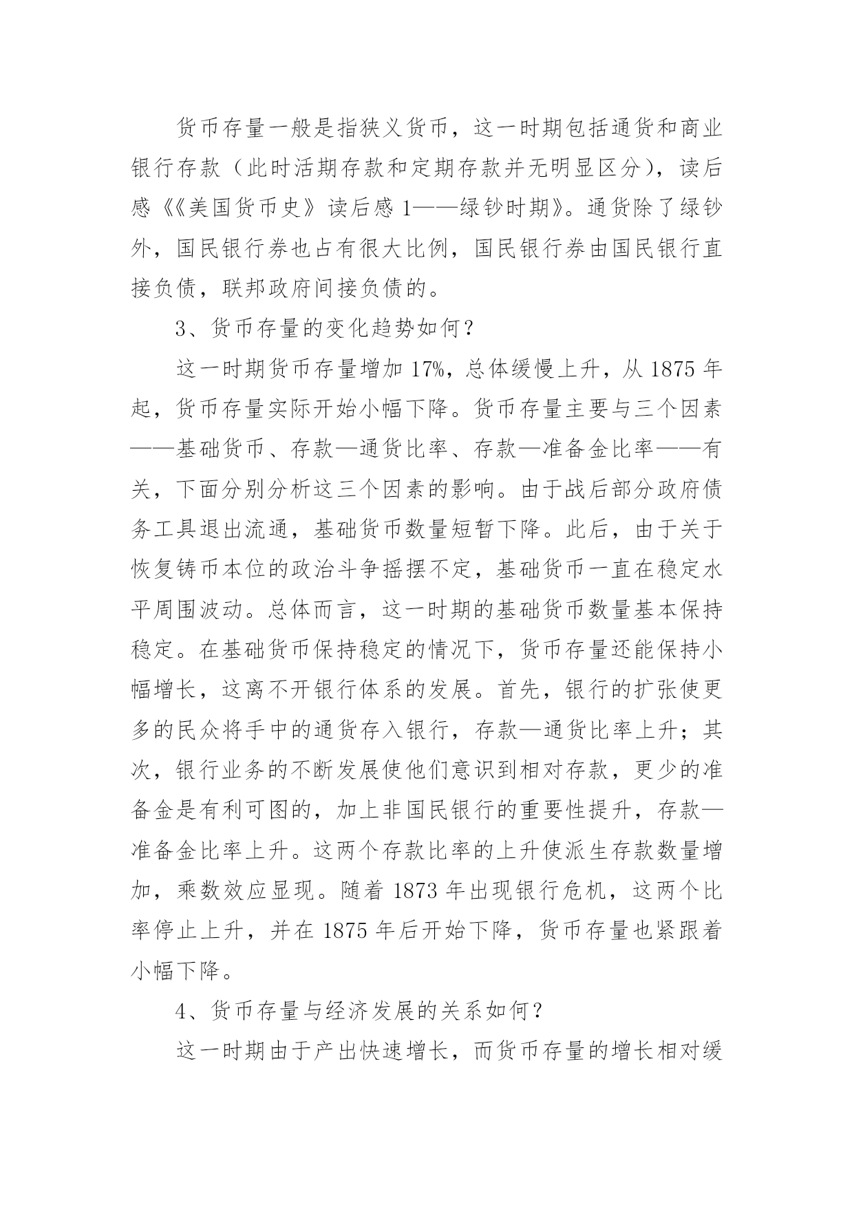 《美国货币史》读后感作文《美国货币史》读后感作文《美国货币史》是著名经济学家,1976年诺奖得主米尔顿·弗里德曼的传世之作,绿钞时期。该作对美国1867——1960年将近一个世纪的货币历史进行了翔实的分析,特别是对上世纪30年代的大萧条从货币制度方面进行了深刻的反思。话说研究大萧条30多年的美联储主席伯南克在应对此次金融危机的货币政策上也是尽得弗里德曼的.真传。此前也听说过这本书不好啃,毕竟时间跨度很长。这两天迅速读完了第一章绪论部分和第二章绿钞时期,大量的专业术语和数据轰炸让人有些招架不住,一边看一边查试着慢慢消化。不管怎样,绪论里明确指出本书的主线是货币存量,万变不离其宗,先把这事儿搞明白。趁热打铁,先把第二章绿钞时期梳理梳理:1、为什么叫绿钞时期,何为绿钞?1861——1865年,美国爆发南北战争,北方联邦政府为增加支出而进行筹资,暂停了铸币本位制,发行了大量证劵与票据,以此作为主要通货,也就是信用货币本位制。在这其中,最主要的一种叫做美国流通券,也就是绿钞。因此,从1867年美国货币存量估计值形成连续序列的最早点,到1879年恢复铸币本位,绿钞基本退出流通,就是本书所研究的绿钞时期。2、这一时期货币存量的构成?货币存量一般是指狭义货币,这一时期包括通货和商业银行存款(此时活期存款和定期存款并无明显区分),读后感《《美国货币史》读后感1——绿钞时期》。通货除了绿钞外,国民银行券也占有很大比例,国民银行券由国民银行直接负债,联邦政府间接负债的。3、货币存量的变化趋势如何?这一时期货币存量增加17%,总体缓慢上升,从1875年起,货币存量实际开始小幅下降。货币存量主要与三个因素——基础货币、存款—通货比率、存款—准备金比率——有关,下面分别分析这三个因素的影响。由于战后部分政府债务工具退出流通,基础货币数量短暂下降。此后,由于关于恢复铸币本位的政治斗争摇摆不定,基础货币一直在稳定水平周围波动。总体而言,这一时期的基础货币数量基本保持稳定。在基础货币保持稳定的情况下,货币存量还能保持小幅增长,这离不开银行体系的发展。首先,银行的扩张使更多的民众将手中的通货存入银行,存款—通货比率上升;其次,银行业务的不断发展使他们意识到相对存款,更少的准备金是有利可图的,加上非国民银行的重要性提升,存款—准备金比率上升。这两个存款比率的上升使派生存款数量增加,乘数效应显现。随着1873年出现银行危机,这两个比率停止上升,并在1875年后开始下降,货币存量也紧跟着小幅下降。4、货币存量与经济发展的关系如何?这一时期由于产出快速增长,而货币存量的增长相对缓慢,造成了一定的紧缩,物价下降了一半,恢复到了战前的平价水平(战时由于发行大量债券融资,物价上涨一倍)。这也颠覆了人们长期以来深信不疑的价格急剧下降与产出迅速增长不相容的观点。南北战争不仅给美国带来了政治上的统一,还由于融资的需要使银行体系逐渐发展壮大,对此后美国的经济腾飞意义重大。