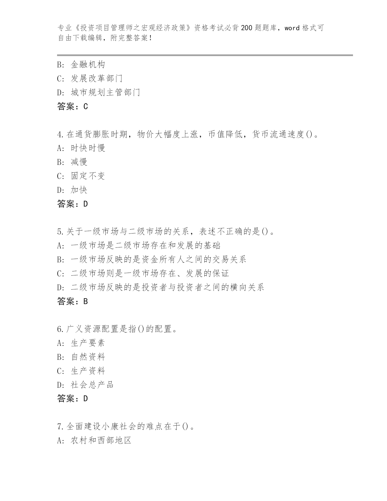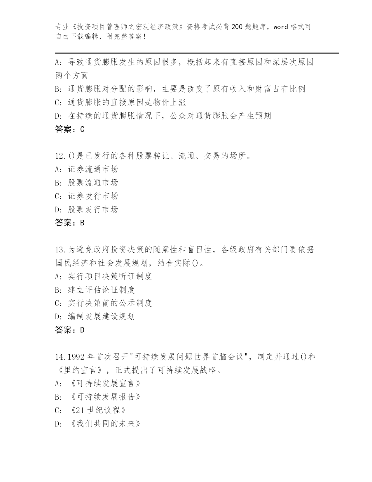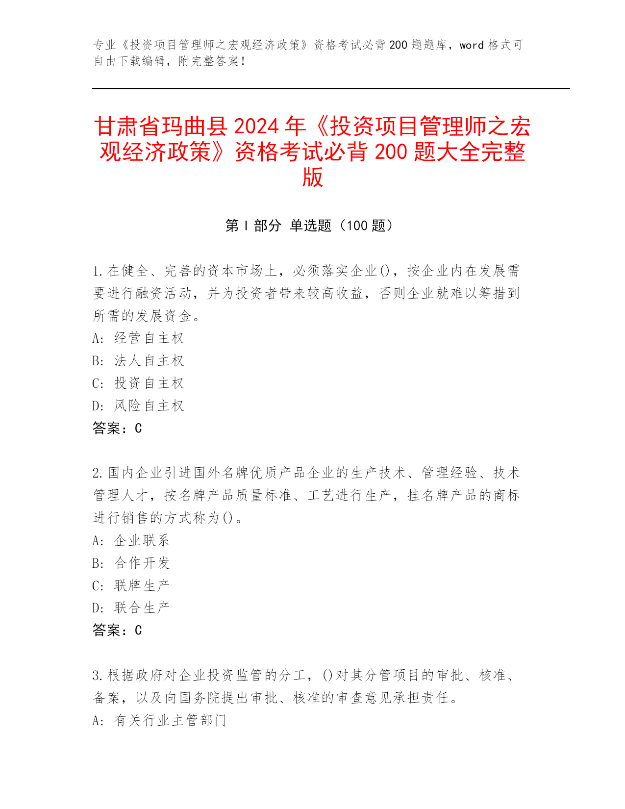 2024甘肃省玛曲县《投资项目管理师之宏观经济政策》资格考试必背200题完整题库答案下载