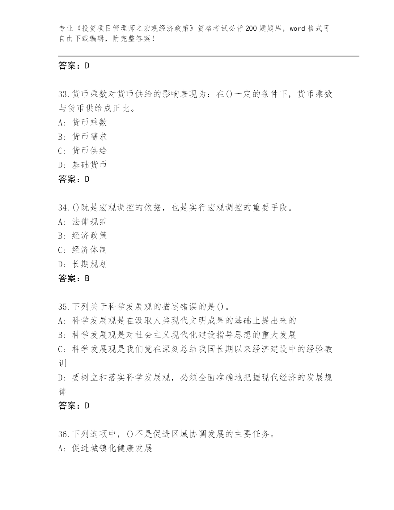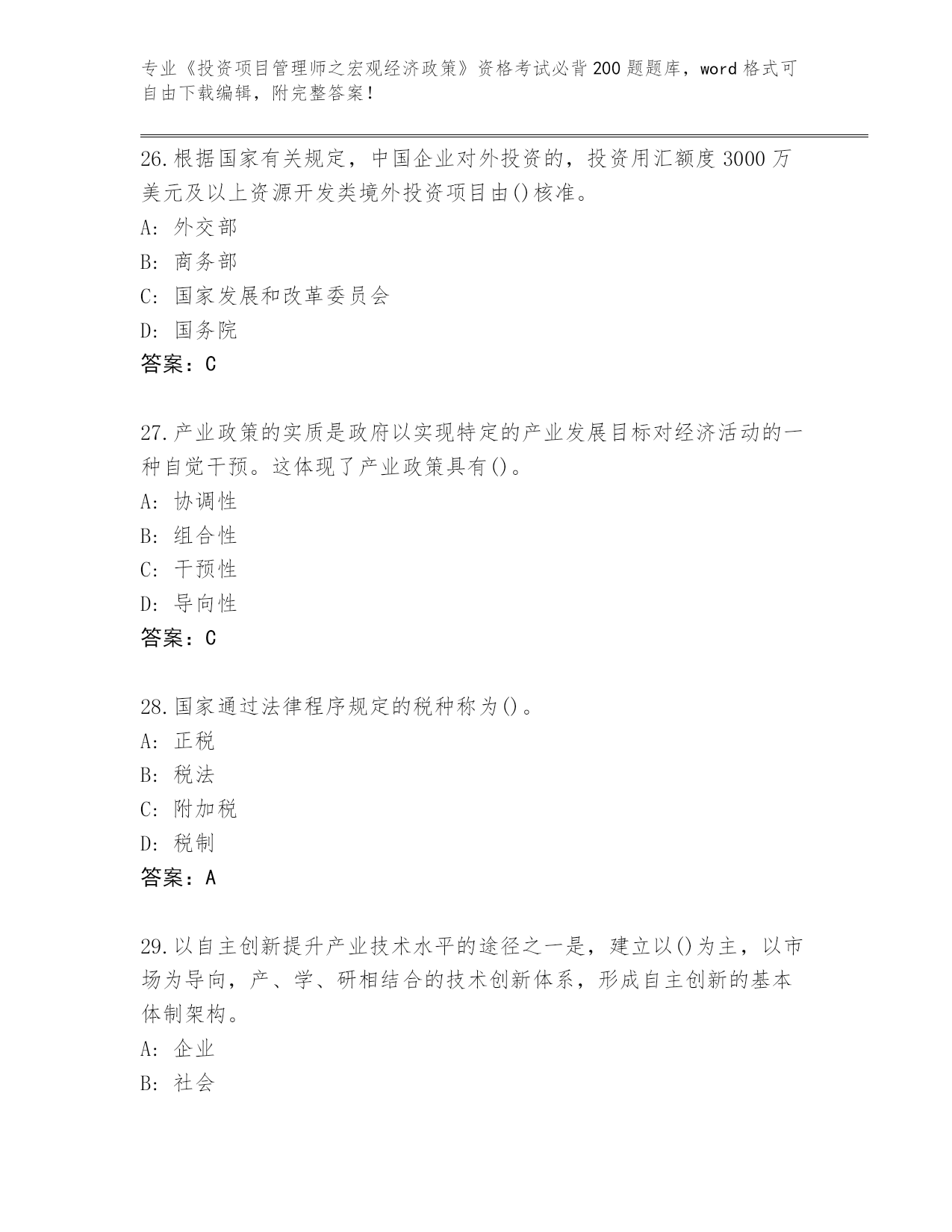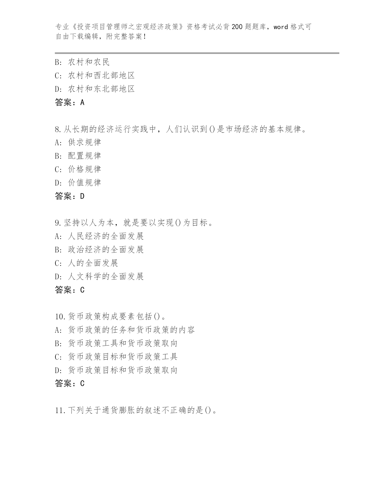 甘肃省《投资项目管理师之宏观经济政策》资格考试必背200题大全【考点提分】