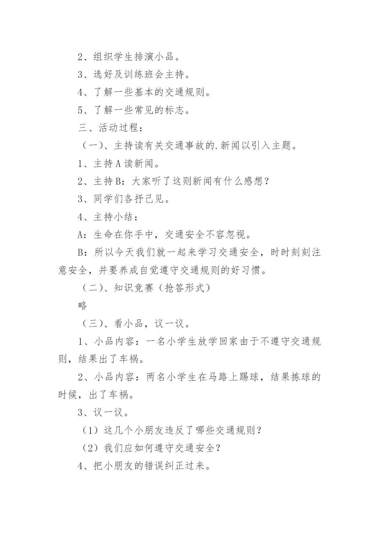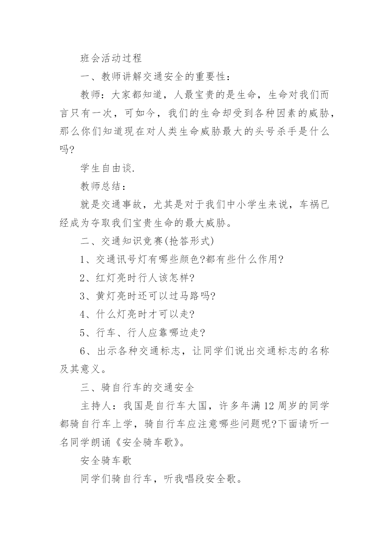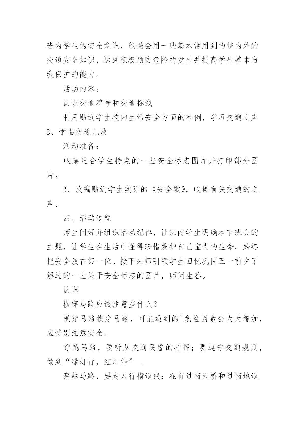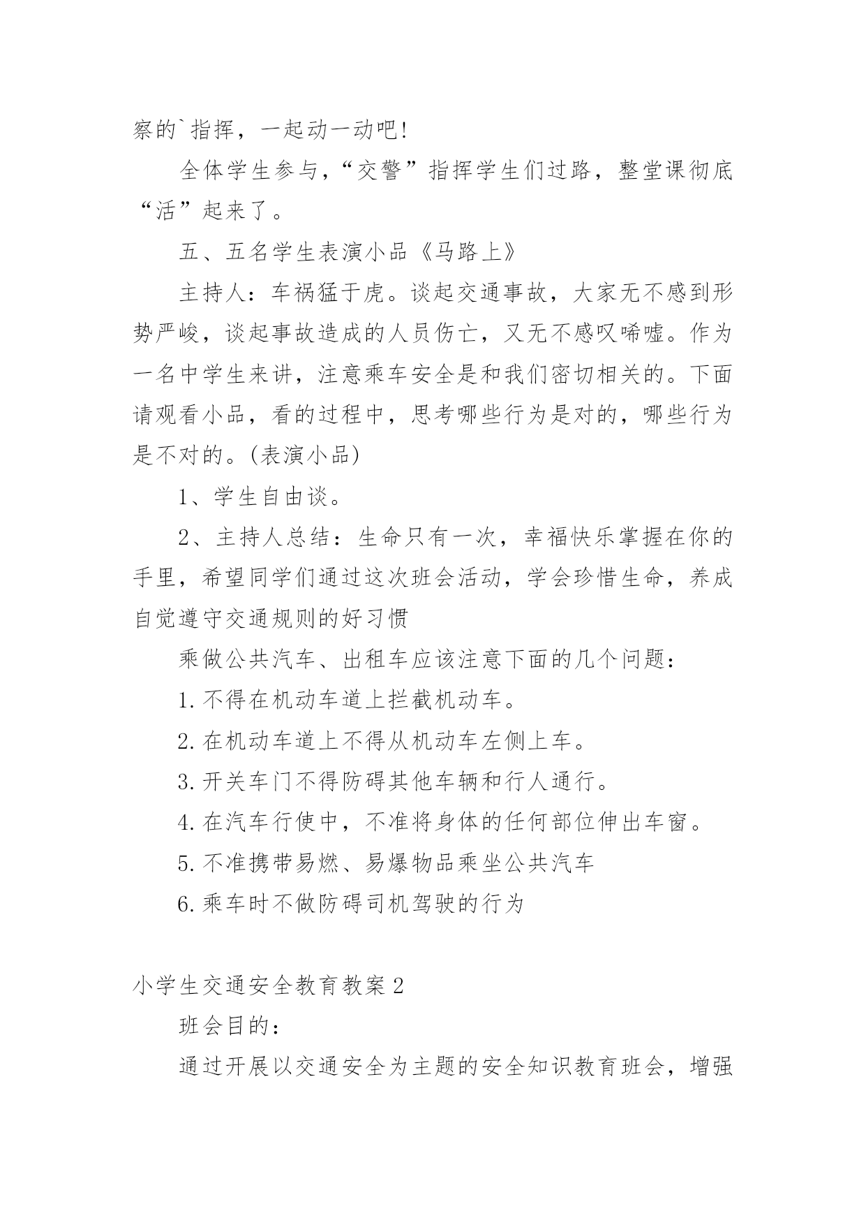 小学生交通安全教育教案作为一名无私奉献的老师,时常需要用到教案,教案是保证教学取得成功、提高教学质量的基本条件。我们应该怎么写教案呢?下面是小编收集整理的小学生交通安全教育教案,希望对大家有所帮助。小学生交通安全教育教案1人流、物流、车流的快速增长,是伟大祖国经济发展、市场繁荣、人民生活水平提高的必然趋势。光明总也甩不掉阴影,没有阴影也显示不出光明的辉煌。事物的另一面向世人昭示:我国已经进入道路交通事故的高发期。日前我国道路交通安全形势十分严峻:事故持续上升,伤亡惨重,损失巨大,为了贯彻落实公安部、教育部《关于加强中小学校交通安全工作的通知》精神,继续进一步搞好我校的交通安全教育,减少交通违章,杜绝交通事故,所以上一节关于交通安全的主题班会。班会活动目标1、让学生在交流活动中认识一些常见的交通标志。2、让学生在活动中体验交通规则的重要性,从而自觉地遵守交通规则。3、让学生在合作学习中学得一些基本的学习方法。4、通过这节班会,有意识地培养学生的认识能力和初步运用交通安全知识解决实际问题的能力。班会活动过程一、教师讲解交通安全的重要性:教师:大家都知道,人最宝贵的是生命,生命对我们而言只有一次,可如今,我们的生命却受到各种因素的威胁,那么你们知道现在对人类生命威胁最大的头号杀手是什么吗?学生自由谈.教师总结:就是交通事故,尤其是对于我们中小学生来说,车祸已经成为夺取我们宝贵生命的最大威胁。二、交通知识竞赛(抢答形式)1、交通讯号灯有哪些颜色?都有些什么作用?2、红灯亮时行人该怎样?3、黄灯亮时还可以过马路吗?4、什么灯亮时才可以走?5、行车、行人应靠哪边走?6、出示各种交通标志,让同学们说出交通标志的名称及其意义。三、骑自行车的交通安全主持人:我国是自行车大国,许多年满12周岁的同学都骑自行车上学,骑自行车应注意哪些问题呢?下面请听一名同学朗诵《安全骑车歌》。安全骑车歌同学们骑自行车,听我唱段安全歌。车铃好使闸要灵,有了情况车能停。上街注意看信号,千万不要冒险行。信号就是指挥员,骑车第一讲安全。看见红灯快刹闸,该等多久等多久。绿灯亮了才能行,安全通行不争抢。十字路口人车多,左右观察听八方。骑车带人危险大,攀扶车辆更可怕。中速骑车靠右侧,分道行驶路畅通。骑车拐弯要示意,不能猛拐一溜风。手拉手儿把肩摸,十有八九要撞车。双手离把更不行,撞上汽车命归西。骑车不走一条线,东摇西摆像醉汉。不定哪天出事故,头破血流住医院。驮载东西别超宽,超高超长也危险。骑车让让讲安全,事情虽小不平凡。四、由一名学生扮演警察现场演示指挥动作。主持人:我们认识的交通标志对维护交通安全起着重要的作用。车辆的顺畅,人们的生命安全,更离不开交通警察。下面请这位“交警”做指挥动作,大家分别猜意思:学生1:这是叫车子往前走。学生2:这是叫车子停下来。学生3:这是叫左边来的车子向右边开去。学生4:这是叫车子到路边停下来。主持人:同学们,现在让我们站在这个十字路口,听警察的`指挥,一起动一动吧!全体学生参与,“交警”指挥学生们过路,整堂课彻底“活”起来了。五、五名学生表演小品《马路上》主持人:车祸猛于虎。谈起交通事故,大家无不感到形势严峻,谈起事故造成的人员伤亡,又无不感叹唏嘘。作为一名中学生来讲,注意乘车安全是和我们密切相关的。下面请观看小品,看的过程中,思考哪些行为是对的,哪些行为是不对的。(表演小品)1、学生自由谈。2、主持人总结:生命只有一次,幸福快乐掌握在你的手里,希望同学们通过这次班会活动,学会珍惜生命,养成自觉遵守交通规则的好习惯乘做公共汽车、出租车应该注意下面的几个问题:1.不得在机动车道上拦截机动车。2.在机动车道上不得从机动车左侧上车。3.开关车门不得防碍其他车辆和行人通行。4.在汽车行使中,不准将身体的任何部位伸出车窗。5.不准携带易燃、易爆物品乘坐公共汽车6.乘车时不做防碍司机驾驶的行为小学生交通安全教育教案2班会目的:通过开展以交通安全为主题的安全知识教育班会,增强班内学生的安全意识,能懂会用一些基本常用到的校内外的交通安全知识,达到积极预防危险的发生并提高学生基本自我保护的能力。活动内容:认识交通符号和交通标线利用贴近学生校内生活安全方面的事例,学习交通之声3、学唱交通儿歌活动准备:收集适合学生特点的一些安全标志图片并打印部分图片。2、改编贴近学生实际的《安全歌》,收集有关交通的之声。四、活动过程师生问好并组织活动纪律,让班内学生明确本节班会的主题,让学生在生活中懂得珍惜爱护自己宝贵的生命,始终把安全放在第一位。接下来师引领学生回忆巩固五一前夕了解过的一些关于安全标志的图片,师问生答。认识横穿马路应该注意些什么?横穿马路横穿马路,可能遇到的`危险因素会大大增加,应特别注意安全。穿越马路,要听从交通民警的指挥;要遵守交通规则,做到“绿灯行,红灯停”