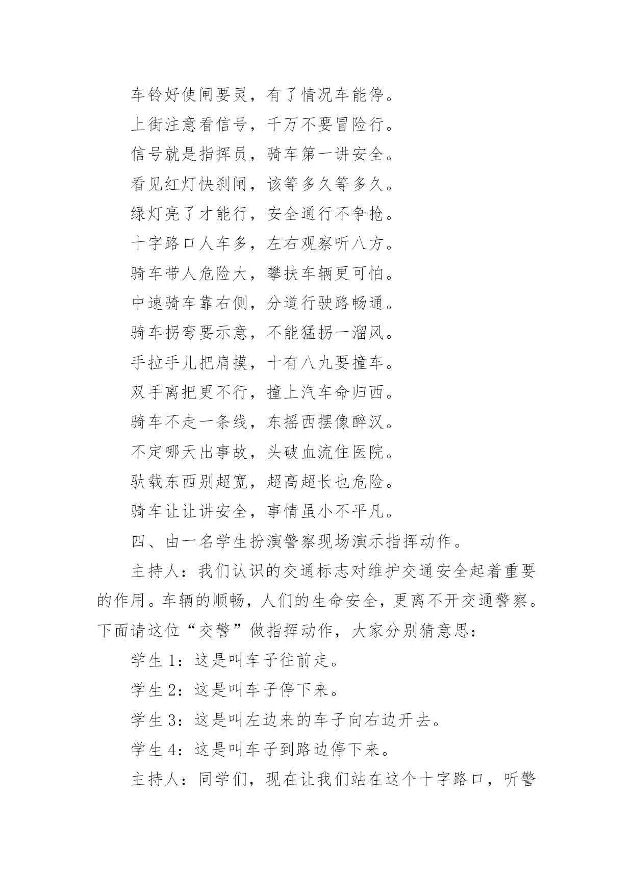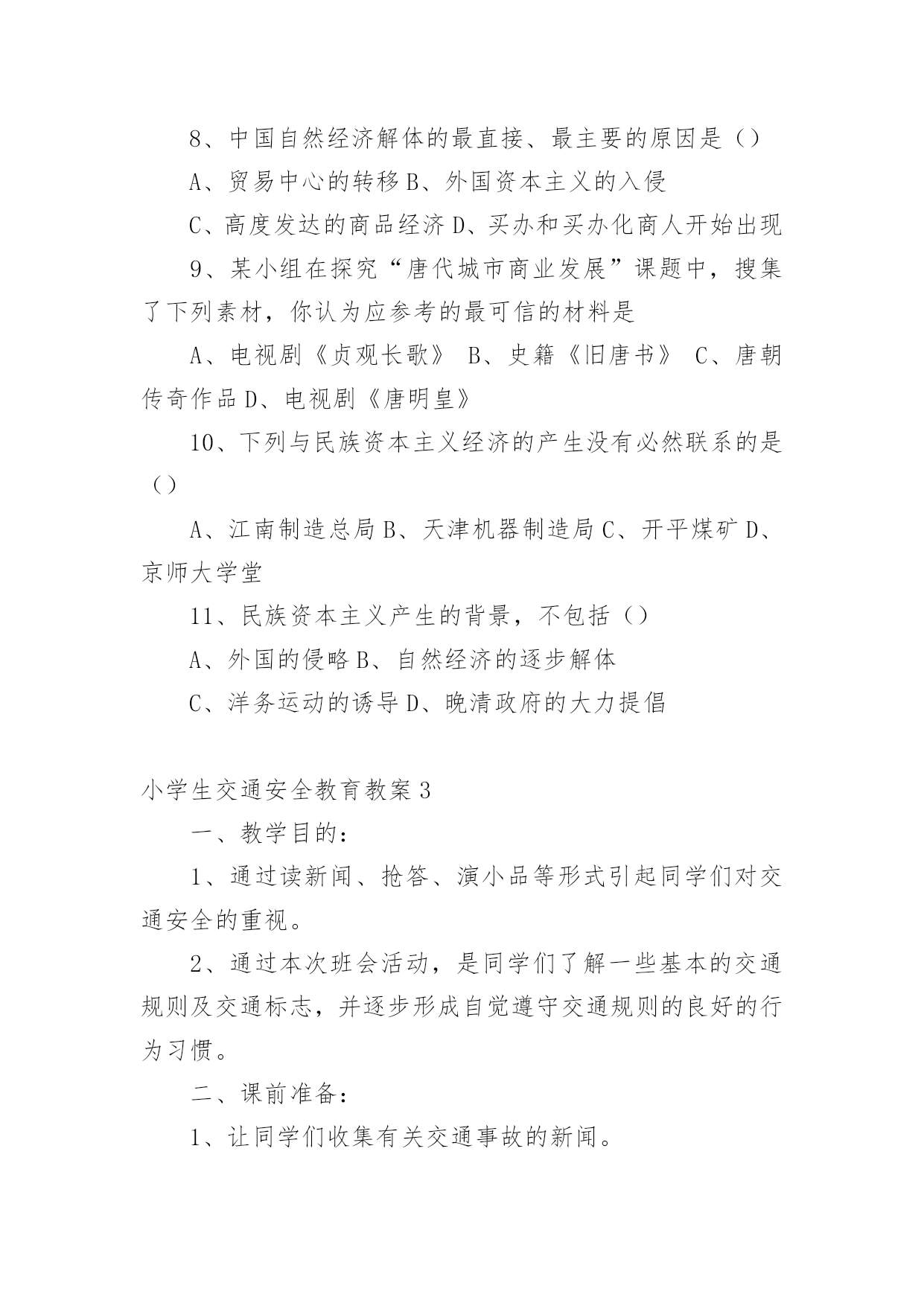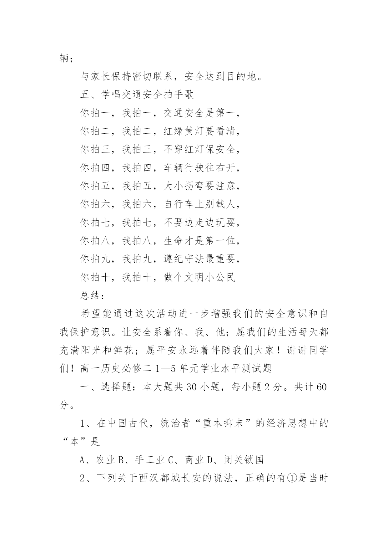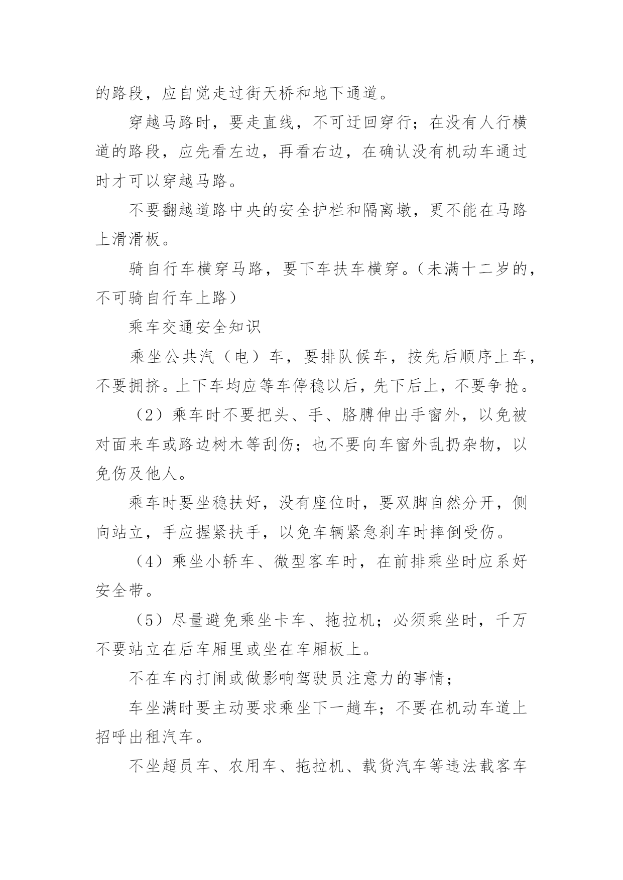 小学生交通安全教育教案作为一名无私奉献的老师,时常需要用到教案,教案是保证教学取得成功、提高教学质量的基本条件。我们应该怎么写教案呢?下面是小编收集整理的小学生交通安全教育教案,希望对大家有所帮助。小学生交通安全教育教案1人流、物流、车流的快速增长,是伟大祖国经济发展、市场繁荣、人民生活水平提高的必然趋势。光明总也甩不掉阴影,没有阴影也显示不出光明的辉煌。事物的另一面向世人昭示:我国已经进入道路交通事故的高发期。日前我国道路交通安全形势十分严峻:事故持续上升,伤亡惨重,损失巨大,为了贯彻落实公安部、教育部《关于加强中小学校交通安全工作的通知》精神,继续进一步搞好我校的交通安全教育,减少交通违章,杜绝交通事故,所以上一节关于交通安全的主题班会。班会活动目标1、让学生在交流活动中认识一些常见的交通标志。2、让学生在活动中体验交通规则的重要性,从而自觉地遵守交通规则。3、让学生在合作学习中学得一些基本的学习方法。4、通过这节班会,有意识地培养学生的认识能力和初步运用交通安全知识解决实际问题的能力。班会活动过程一、教师讲解交通安全的重要性:教师:大家都知道,人最宝贵的是生命,生命对我们而言只有一次,可如今,我们的生命却受到各种因素的威胁,那么你们知道现在对人类生命威胁最大的头号杀手是什么吗?学生自由谈.教师总结:就是交通事故,尤其是对于我们中小学生来说,车祸已经成为夺取我们宝贵生命的最大威胁。二、交通知识竞赛(抢答形式)1、交通讯号灯有哪些颜色?都有些什么作用?2、红灯亮时行人该怎样?3、黄灯亮时还可以过马路吗?4、什么灯亮时才可以走?5、行车、行人应靠哪边走?6、出示各种交通标志,让同学们说出交通标志的名称及其意义。三、骑自行车的交通安全主持人:我国是自行车大国,许多年满12周岁的同学都骑自行车上学,骑自行车应注意哪些问题呢?下面请听一名同学朗诵《安全骑车歌》。安全骑车歌同学们骑自行车,听我唱段安全歌。车铃好使闸要灵,有了情况车能停。上街注意看信号,千万不要冒险行。信号就是指挥员,骑车第一讲安全。看见红灯快刹闸,该等多久等多久。绿灯亮了才能行,安全通行不争抢。十字路口人车多,左右观察听八方。骑车带人危险大,攀扶车辆更可怕。中速骑车靠右侧,分道行驶路畅通。骑车拐弯要示意,不能猛拐一溜风。手拉手儿把肩摸,十有八九要撞车。双手离把更不行,撞上汽车命归西。骑车不走一条线,东摇西摆像醉汉。不定哪天出事故,头破血流住医院。驮载东西别超宽,超高超长也危险。骑车让让讲安全,事情虽小不平凡。四、由一名学生扮演警察现场演示指挥动作。主持人:我们认识的交通标志对维护交通安全起着重要的作用。车辆的顺畅,人们的生命安全,更离不开交通警察。下面请这位“交警”做指挥动作,大家分别猜意思:学生1:这是叫车子往前走。学生2:这是叫车子停下来。学生3:这是叫左边来的车子向右边开去。学生4:这是叫车子到路边停下来。主持人:同学们,现在让我们站在这个十字路口,听警察的`指挥,一起动一动吧!全体学生参与,“交警”指挥学生们过路,整堂课彻底“活”起来了。五、五名学生表演小品《马路上》主持人:车祸猛于虎。谈起交通事故,大家无不感到形势严峻,谈起事故造成的人员伤亡,又无不感叹唏嘘。作为一名中学生来讲,注意乘车安全是和我们密切相关的。下面请观看小品,看的过程中,思考哪些行为是对的,哪些行为是不对的。(表演小品)1、学生自由谈。2、主持人总结:生命只有一次,幸福快乐掌握在你的手里,希望同学们通过这次班会活动,学会珍惜生命,养成自觉遵守交通规则的好习惯乘做公共汽车、出租车应该注意下面的几个问题:1.不得在机动车道上拦截机动车。2.在机动车道上不得从机动车左侧上车。3.开关车门不得防碍其他车辆和行人通行。4.在汽车行使中,不准将身体的任何部位伸出车窗。5.不准携带易燃、易爆物品乘坐公共汽车6.乘车时不做防碍司机驾驶的行为小学生交通安全教育教案2班会目的:通过开展以交通安全为主题的安全知识教育班会,增强班内学生的安全意识,能懂会用一些基本常用到的校内外的交通安全知识,达到积极预防危险的发生并提高学生基本自我保护的能力。活动内容:认识交通符号和交通标线利用贴近学生校内生活安全方面的事例,学习交通之声3、学唱交通儿歌活动准备:收集适合学生特点的一些安全标志图片并打印部分图片。2、改编贴近学生实际的《安全歌》,收集有关交通的之声。四、活动过程师生问好并组织活动纪律,让班内学生明确本节班会的主题,让学生在生活中懂得珍惜爱护自己宝贵的生命,始终把安全放在第一位。接下来师引领学生回忆巩固五一前夕了解过的一些关于安全标志的图片,师问生答。认识横穿马路应该注意些什么?横穿马路横穿马路,可能遇到的`危险因素会大大增加,应特别注意安全。穿越马路,要听从交通民警的指挥;要遵守交通规则,做到“绿灯行,红灯停”